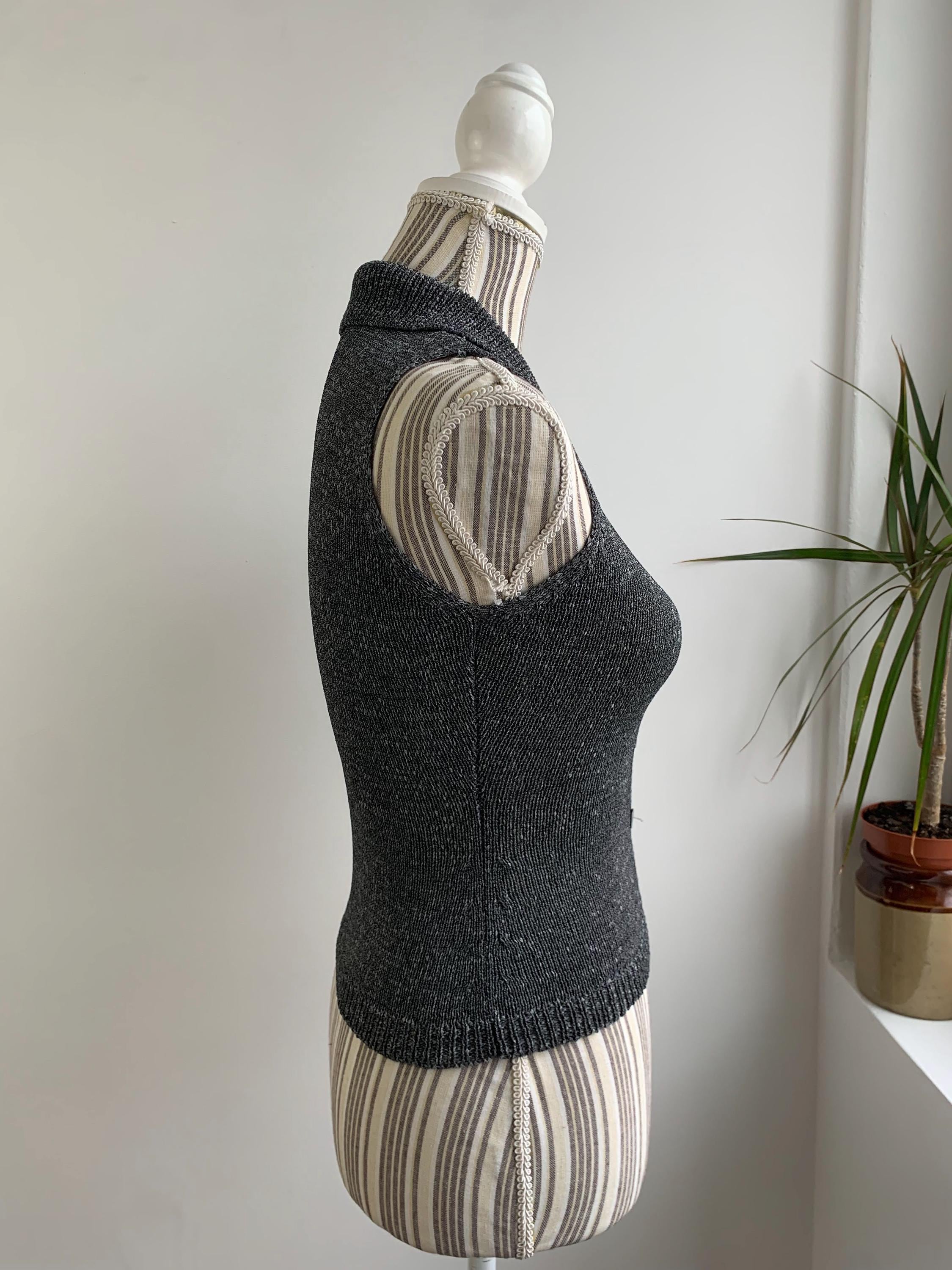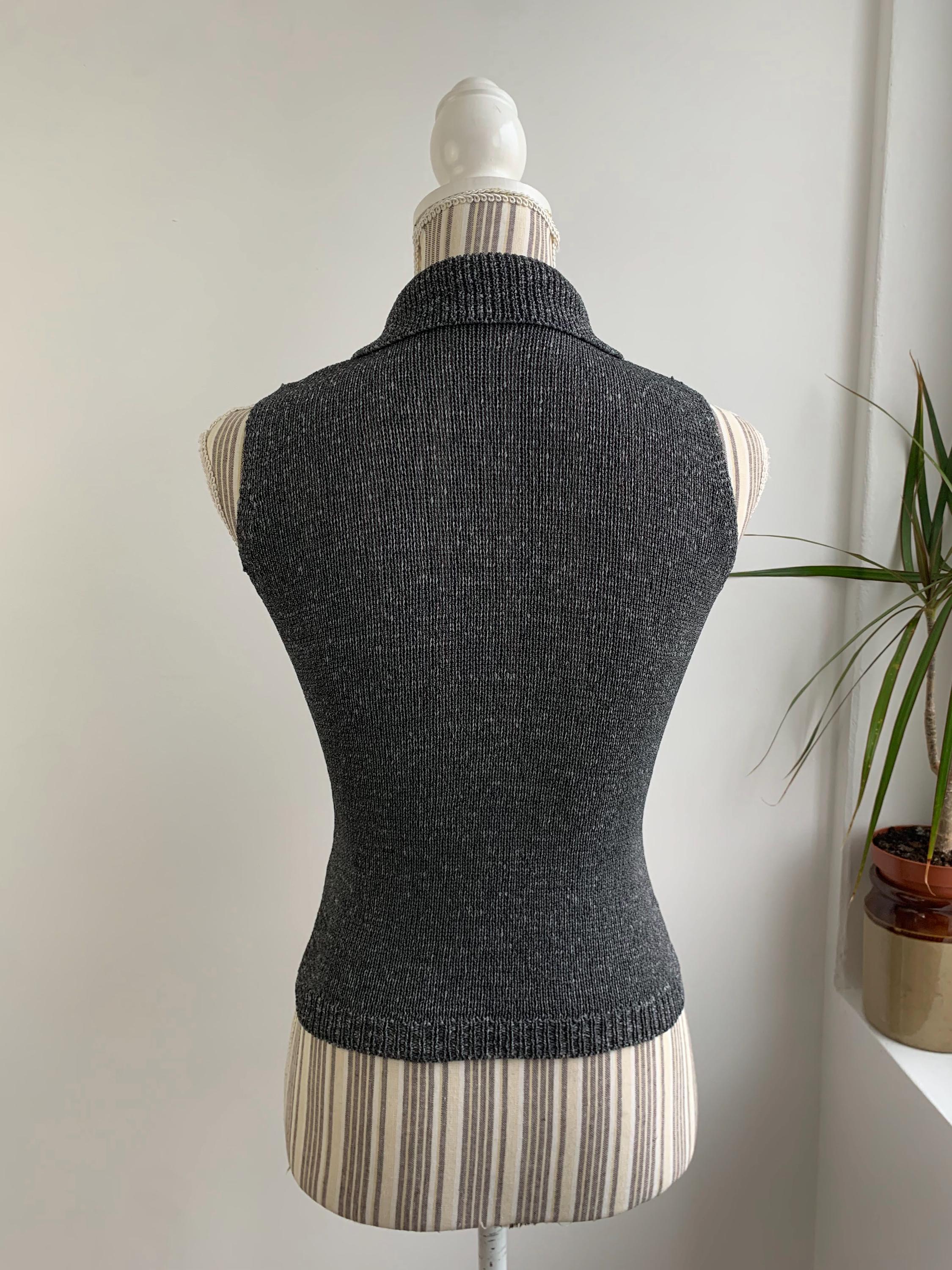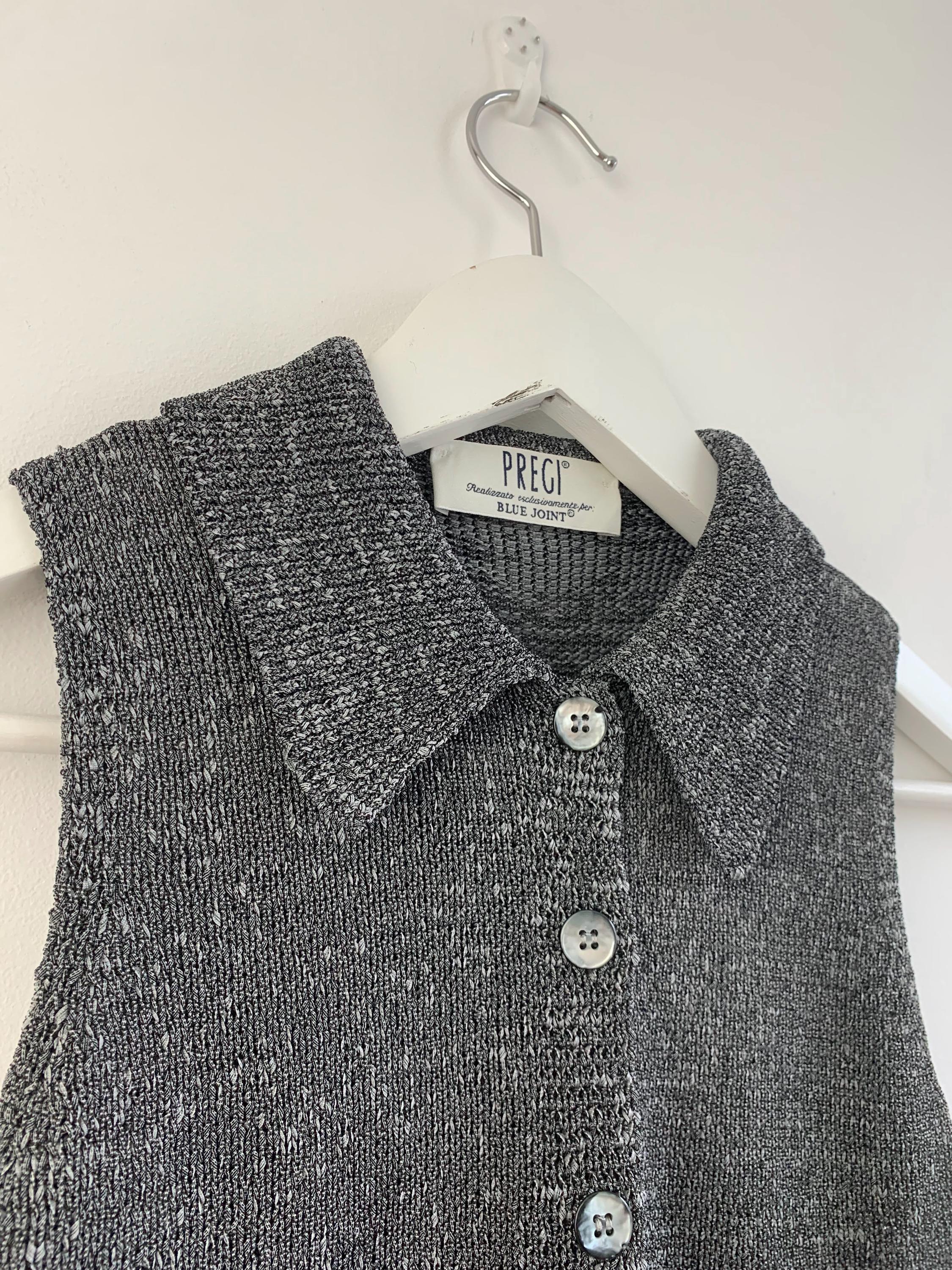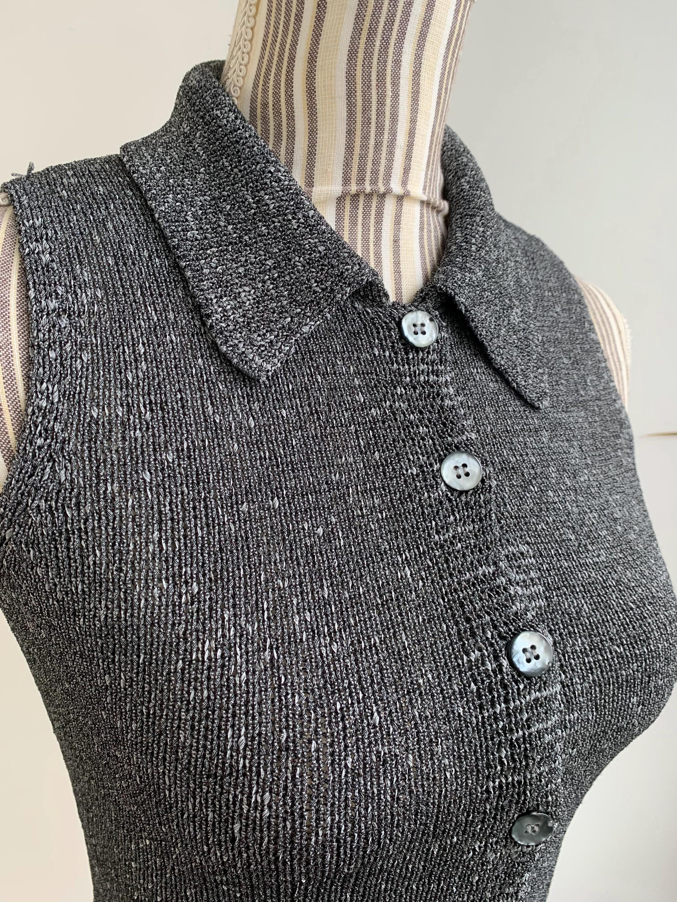 This is a lovely vintage 90s knitted stretchy collared tank top button front closure. This slim fit elastic vest top fits like size XXS. This collared neck vest top has a good bit of stretch. The fabric feels like stretchy viscose, cotton blend.