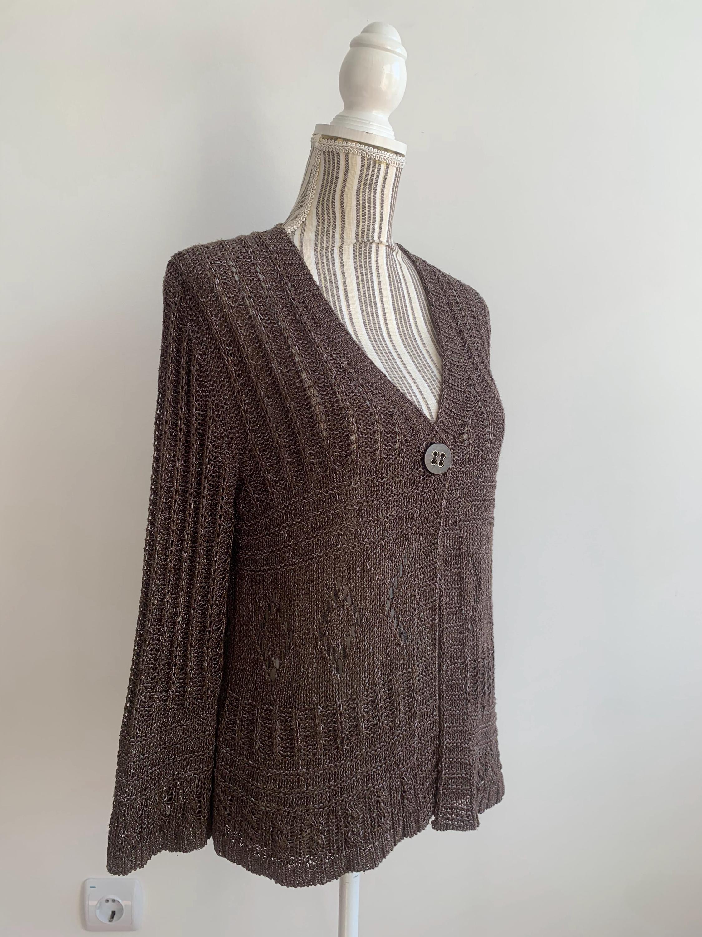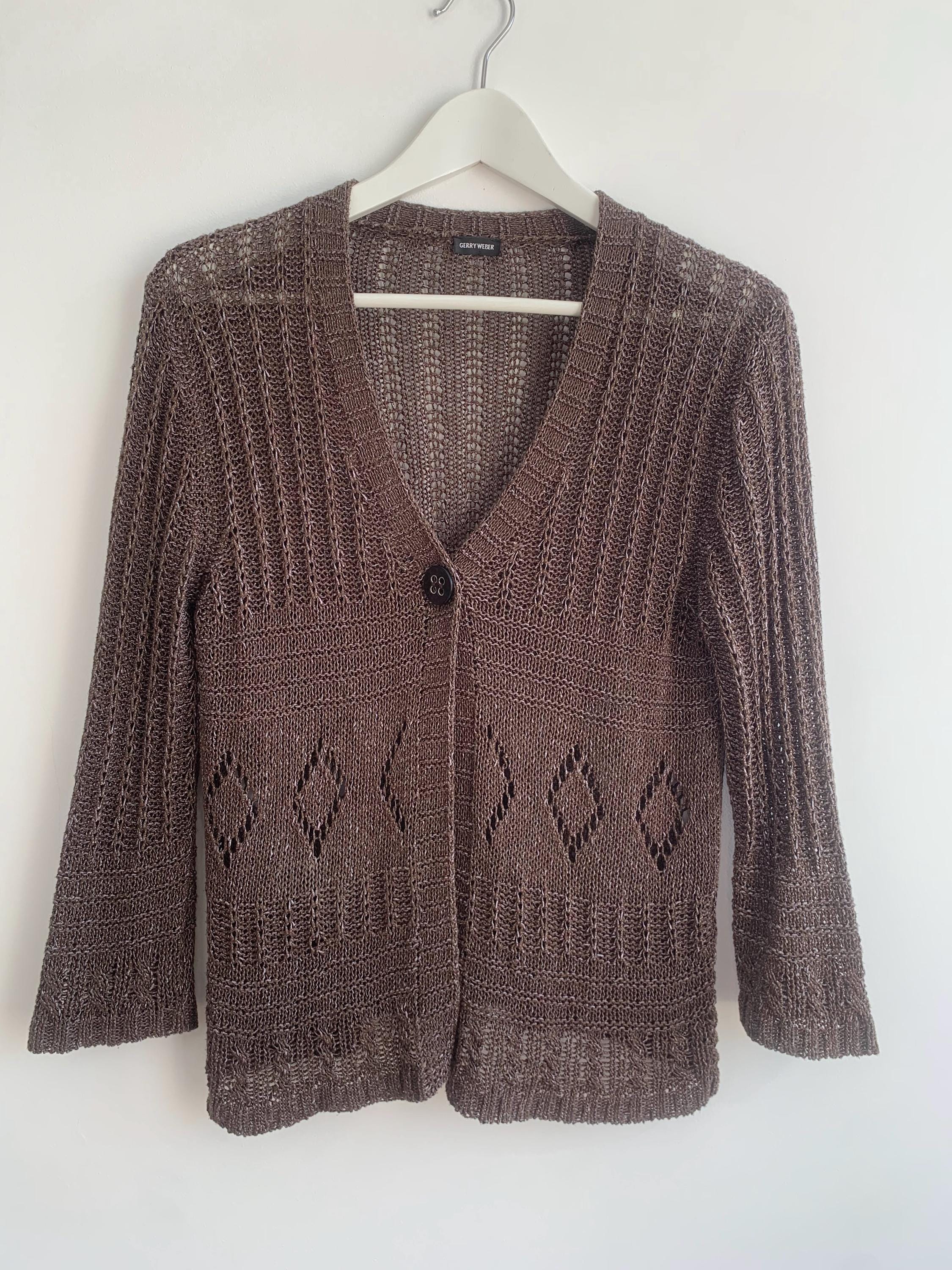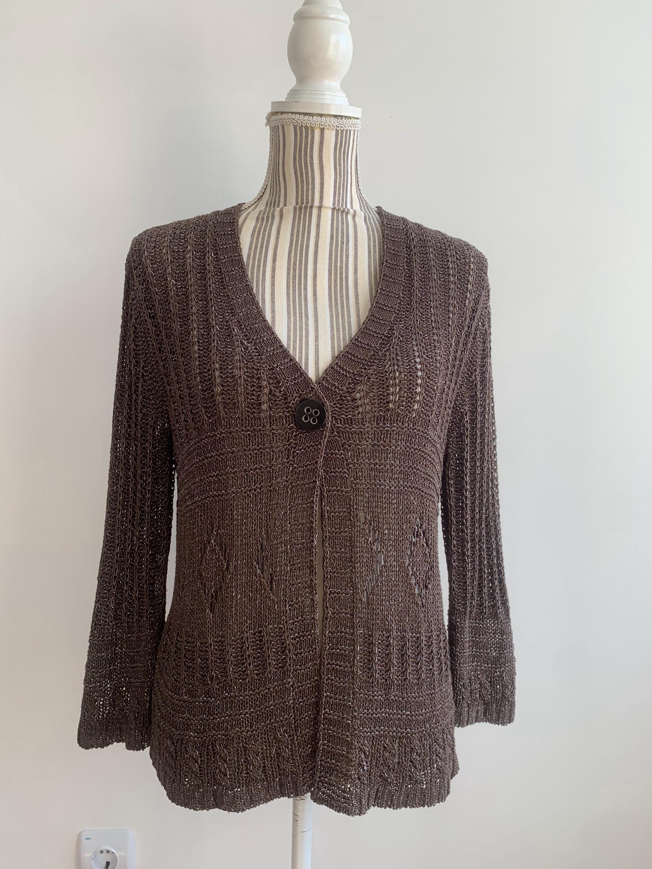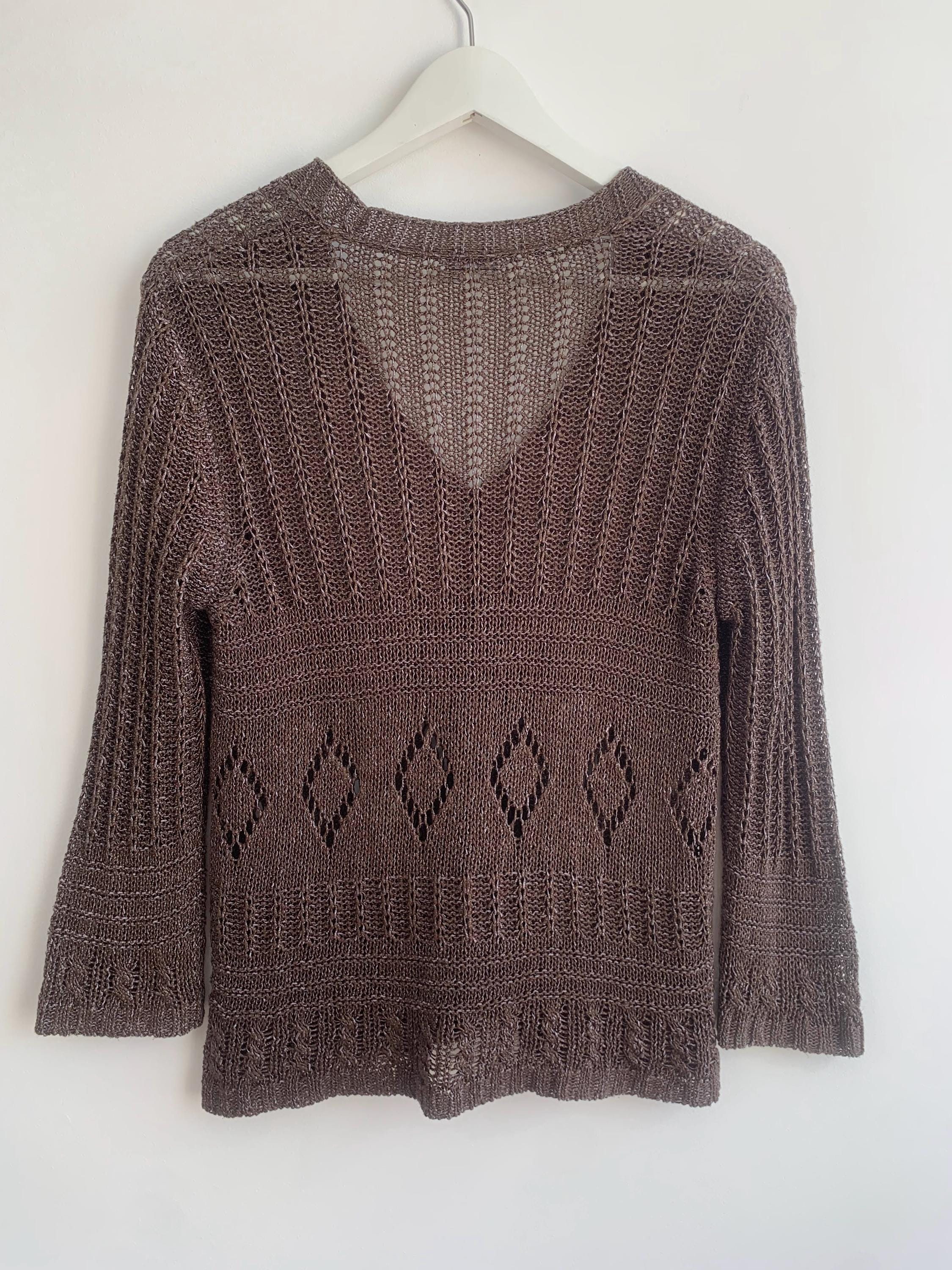 Check out this gorgeous vintage Y2K taupe brown openwork knitted cardigan with single button closure and bracelet sleeves. This v neck sweater is made of shiny yarn in taupe brown color with rhombus geometric pattern and mesh lace design. There is no size marked, it fits like size M. Wonderful vintage Y2K gift for her.