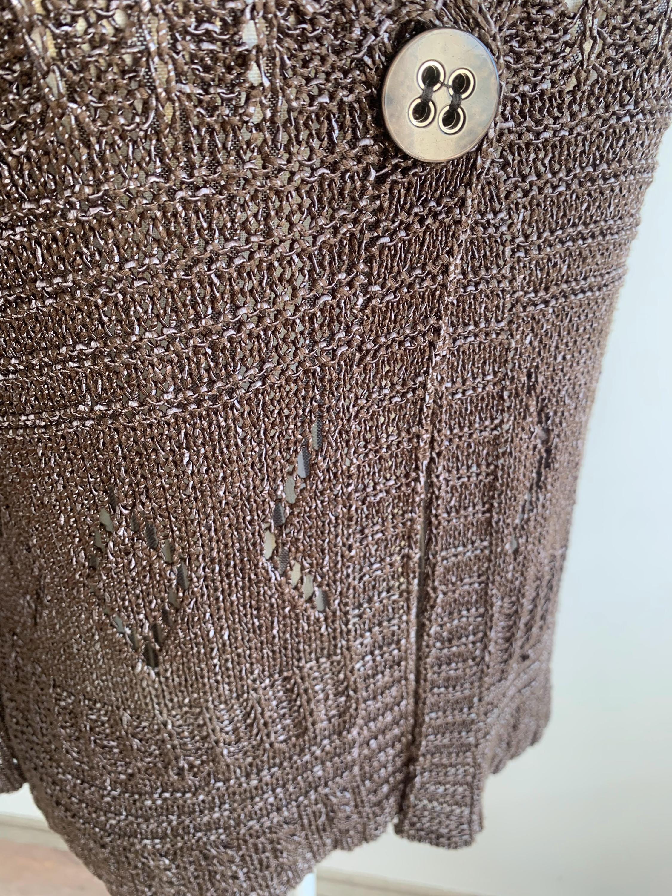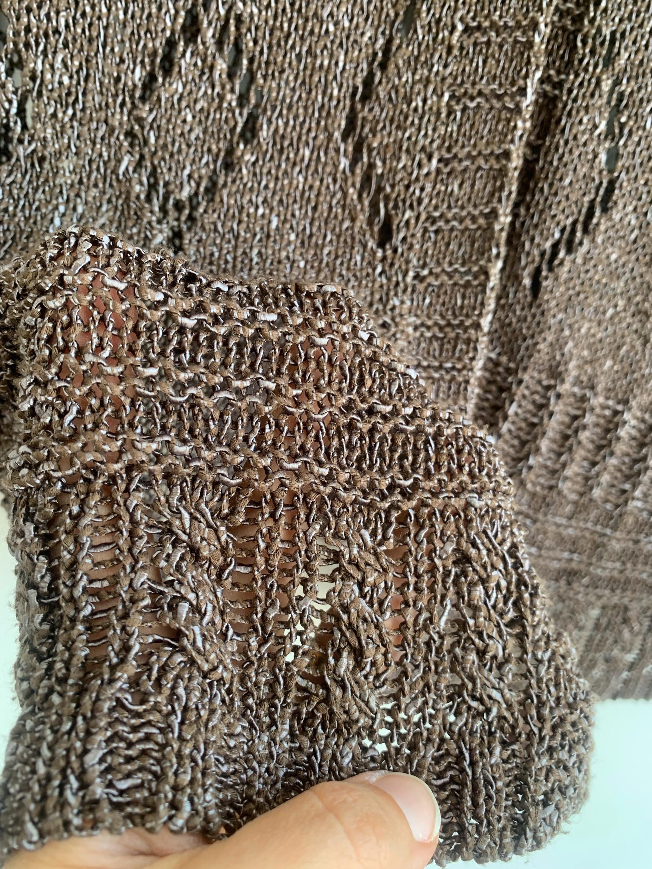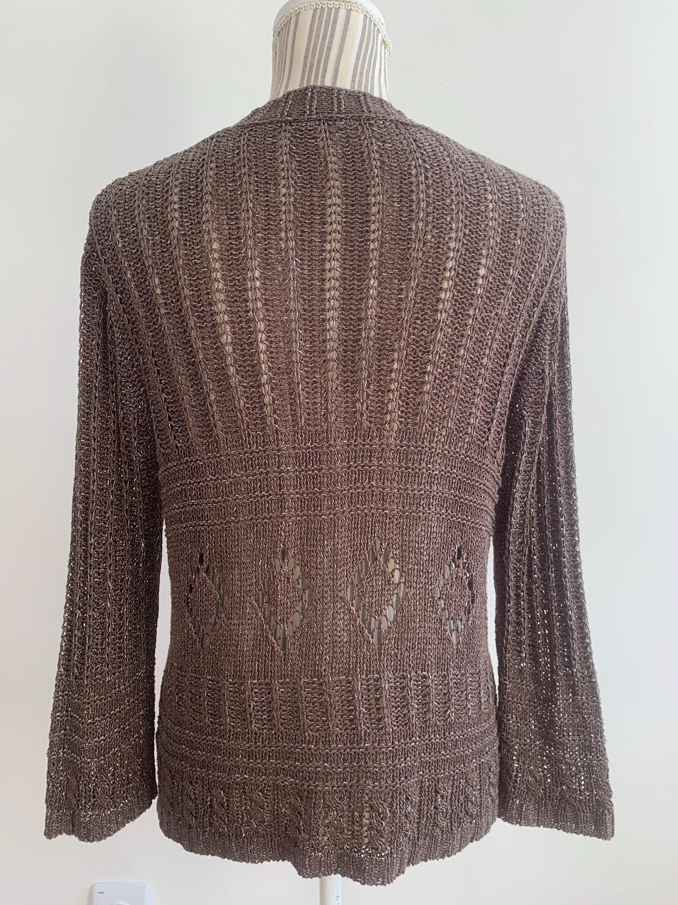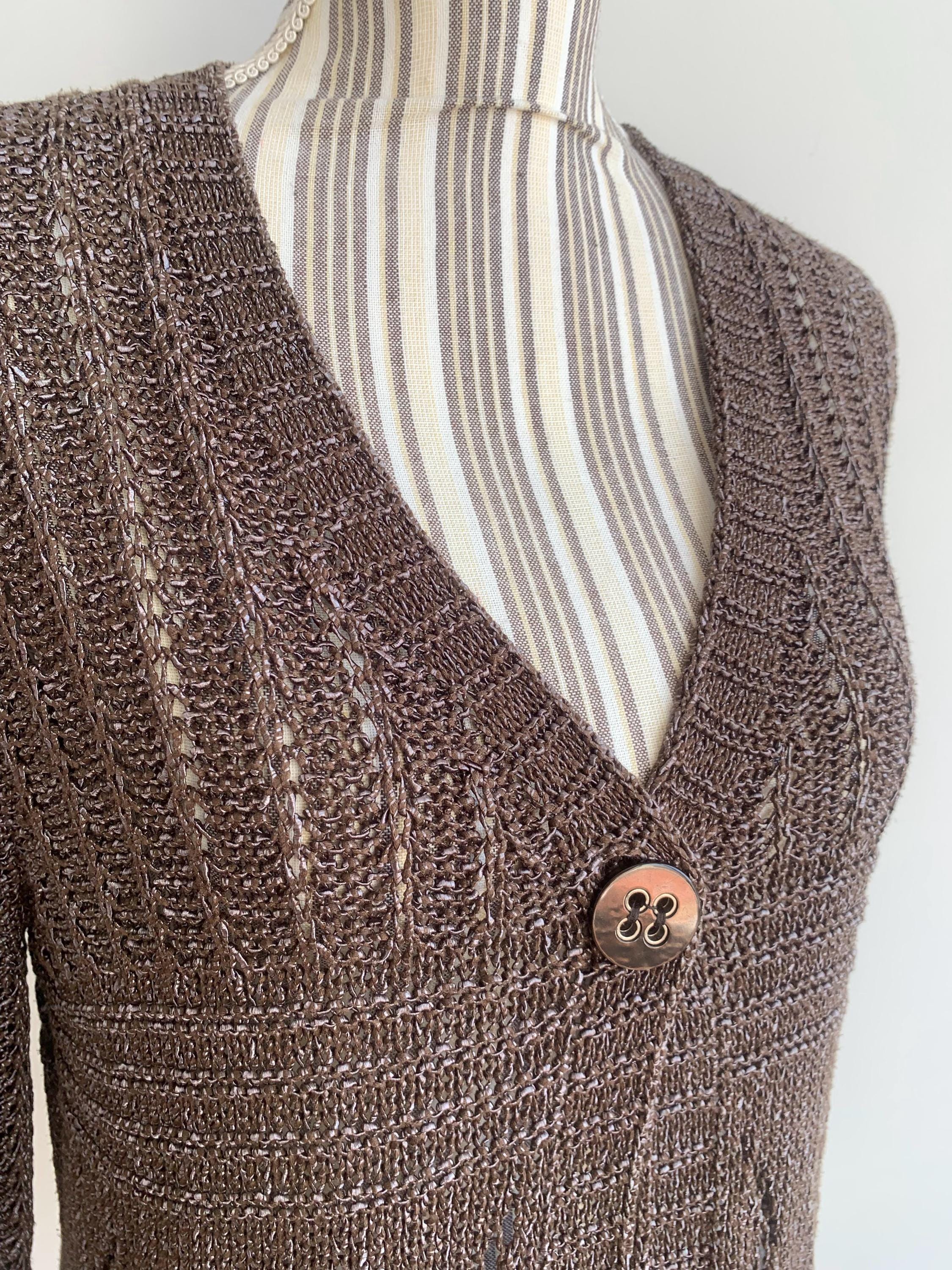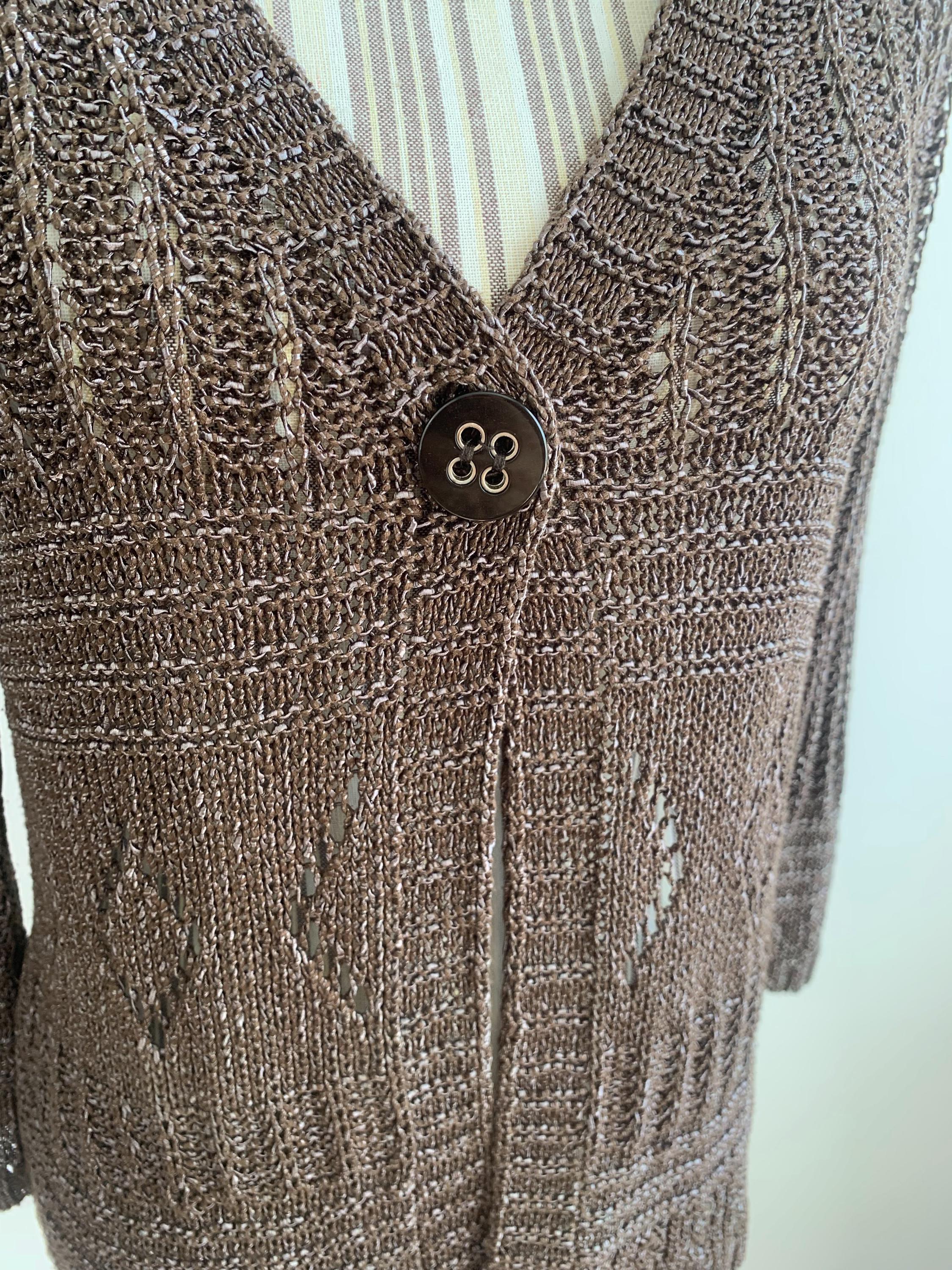 Check out this gorgeous vintage Y2K taupe brown openwork knitted cardigan with single button closure and bracelet sleeves. This v neck sweater is made of shiny yarn in taupe brown color with rhombus geometric pattern and mesh lace design. There is no size marked, it fits like size M. Wonderful vintage Y2K gift for her.