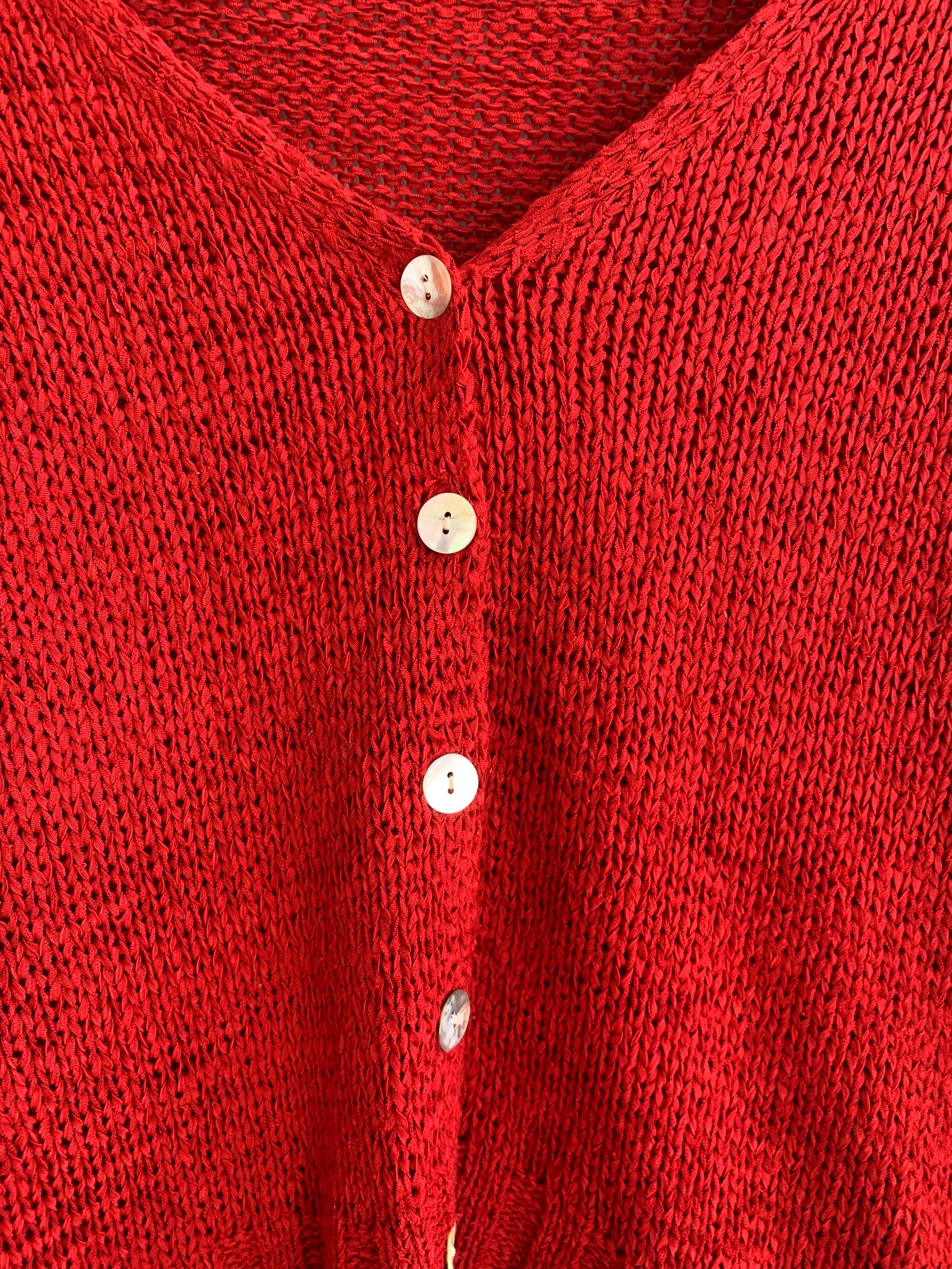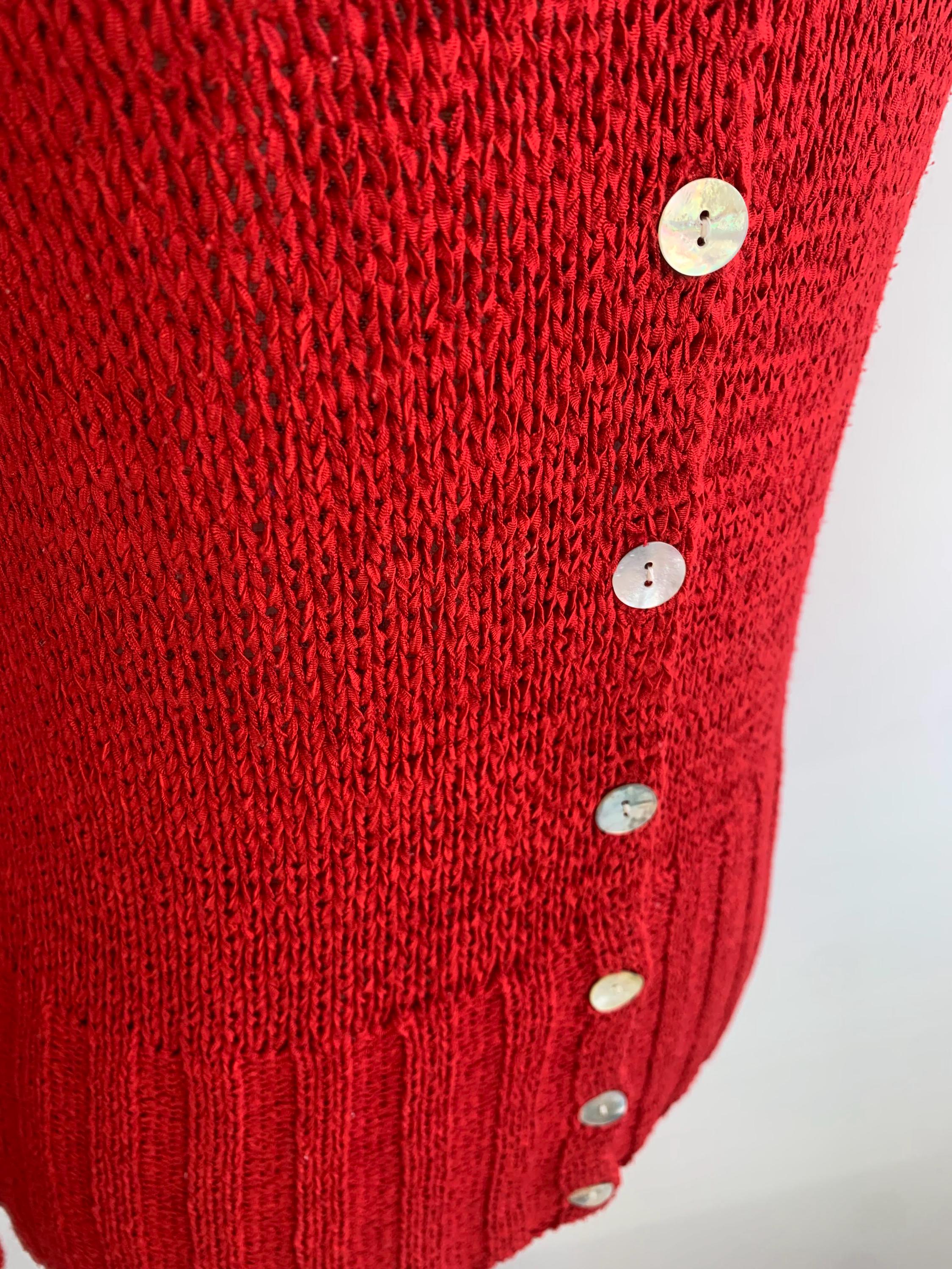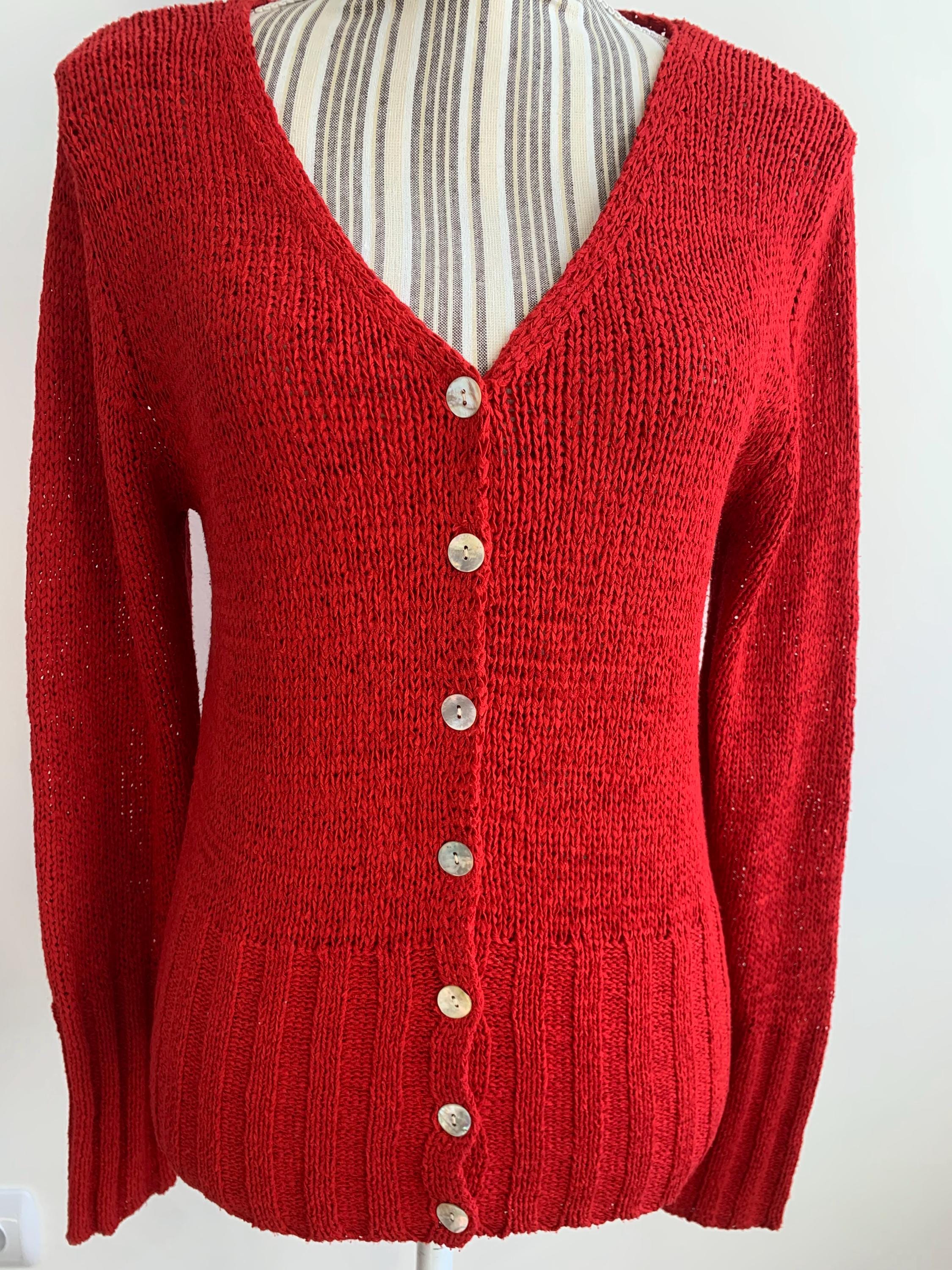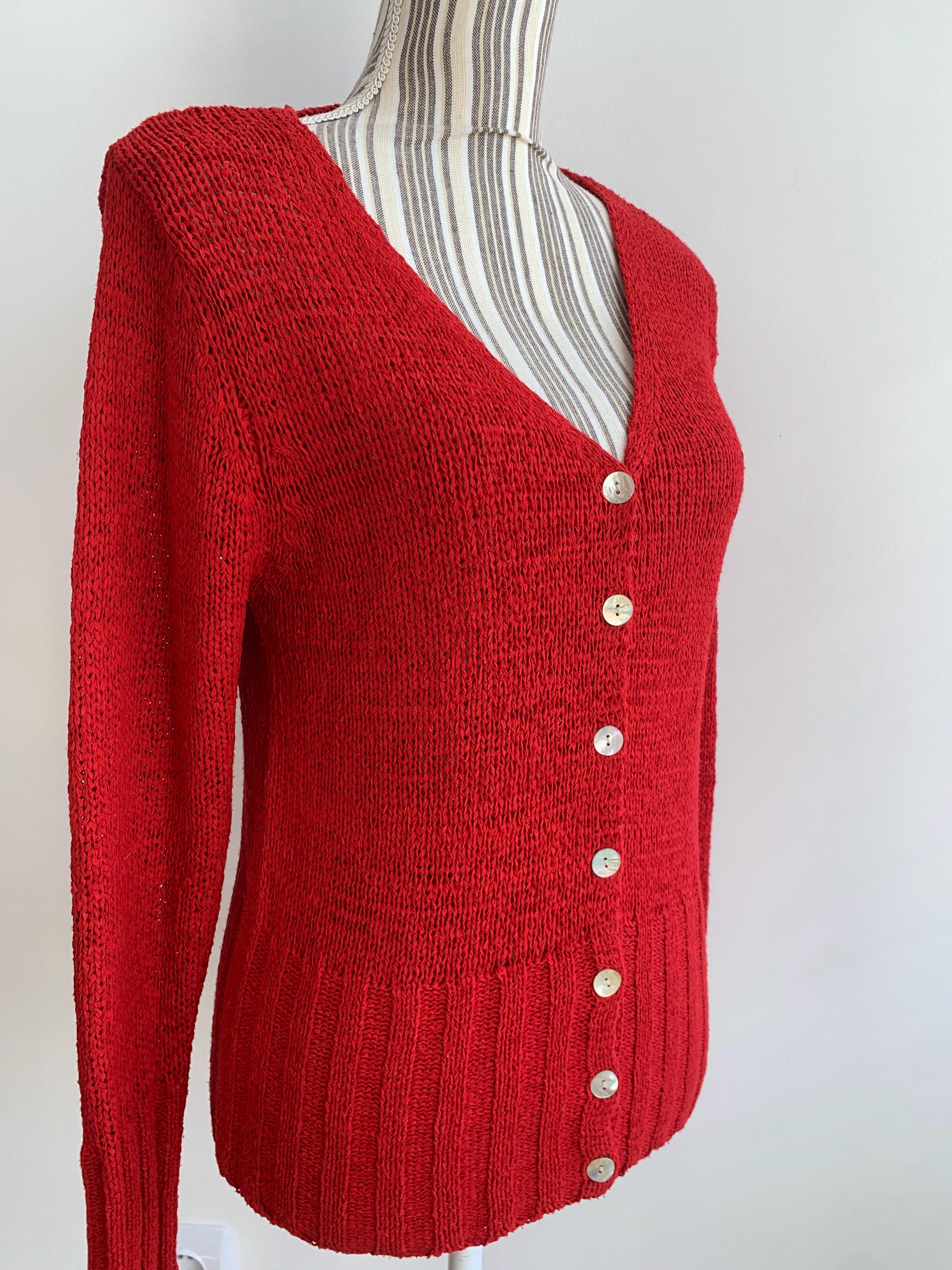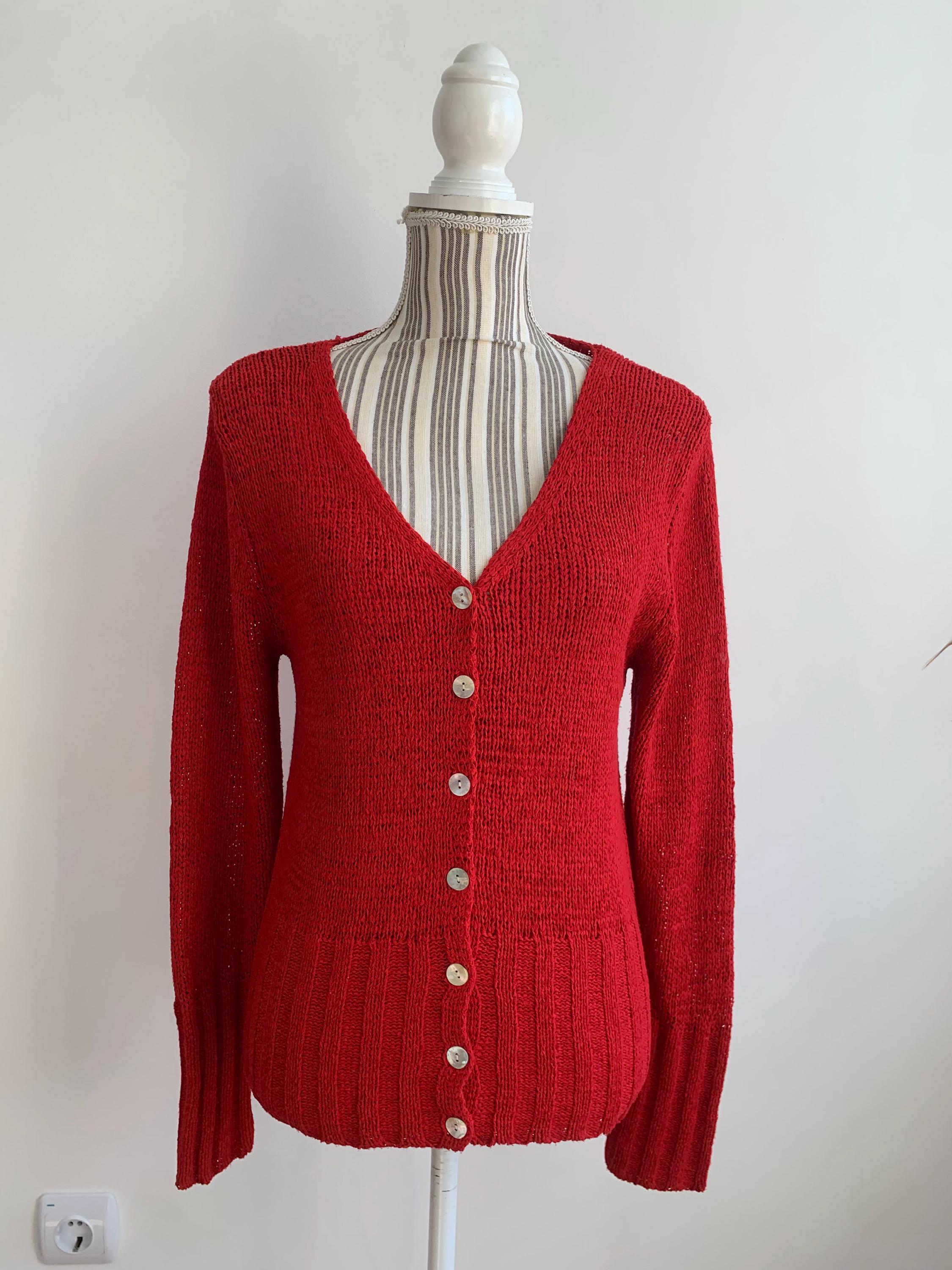 This is a beautiful red knitted cardigan with long sleeves, V neck, button front closure and long sleeves. This red knit cardigan has a fitted silhouette and mother of pearl buttons. It is size S M . Please check the measurements below.
