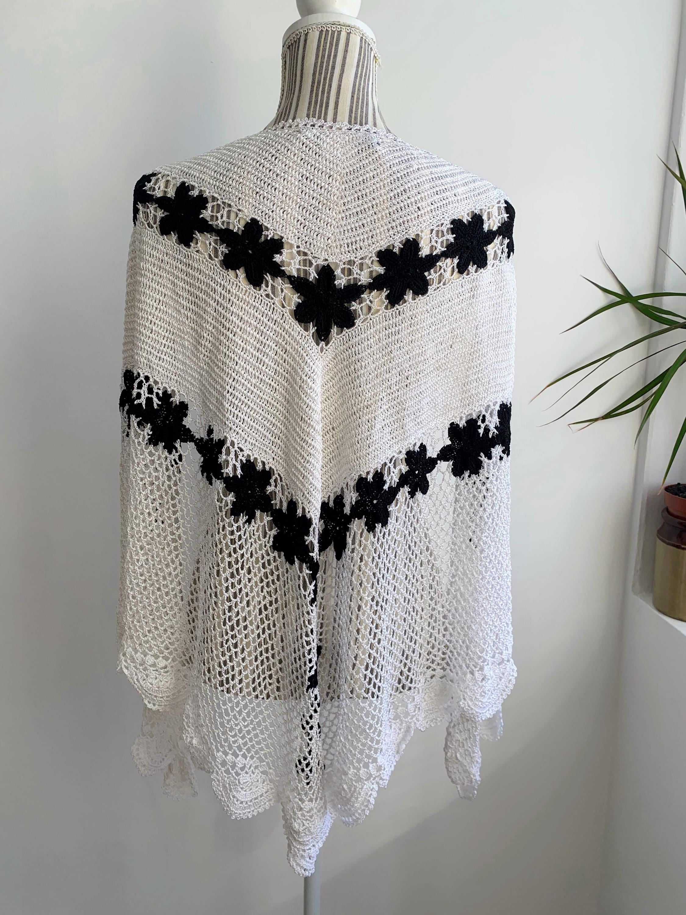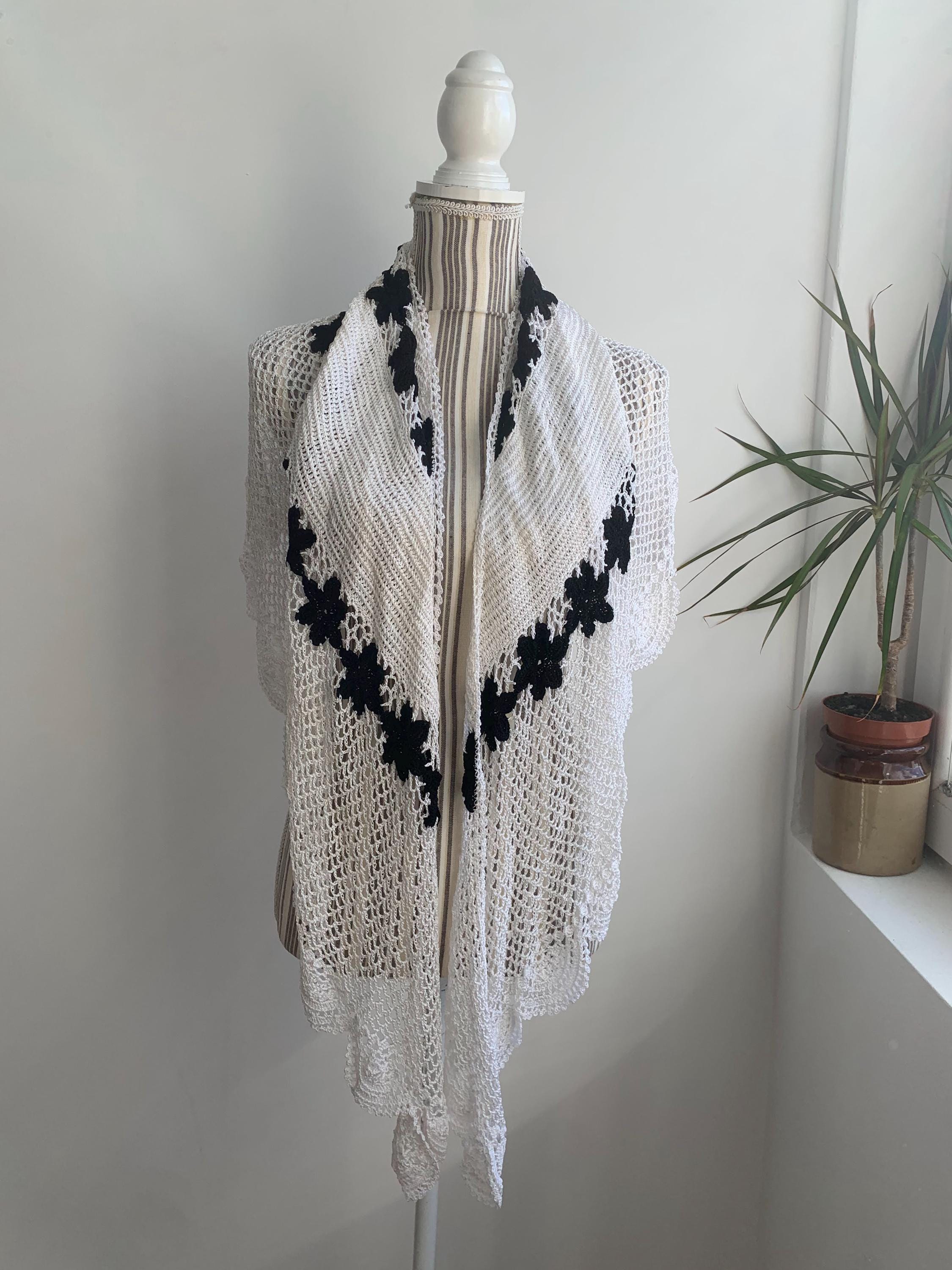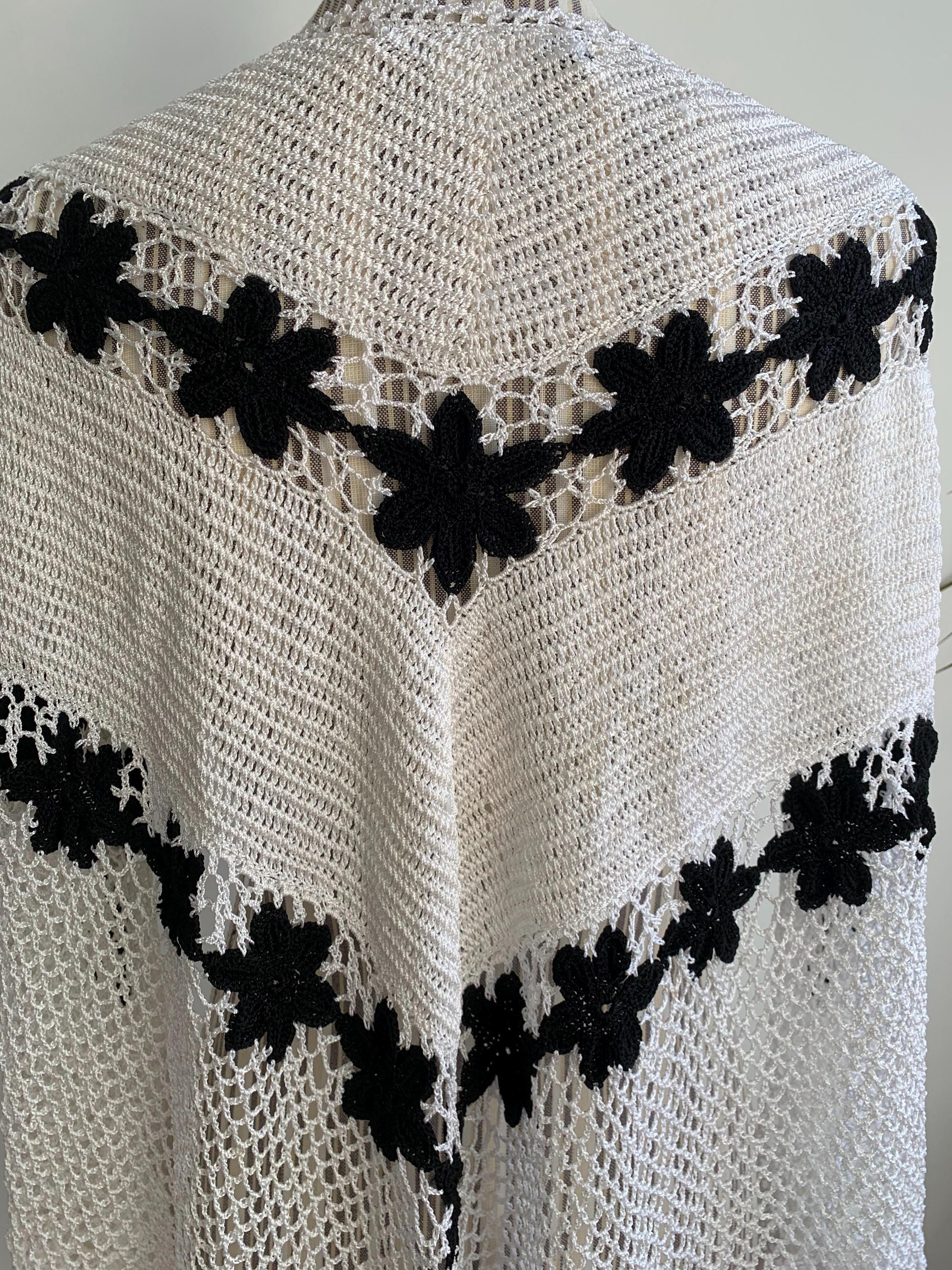 This is a pretty vintage crochet bohemian snow white shawl with scalloped edges and black flowers. This shiny triangle shawl is made of shiny viscose thread which shimmers beautifully when exposed to light. This mesh fringed shawl has a delicate shine. Perfect elegant shawl wrap for evening parties, weddings and special occasions.