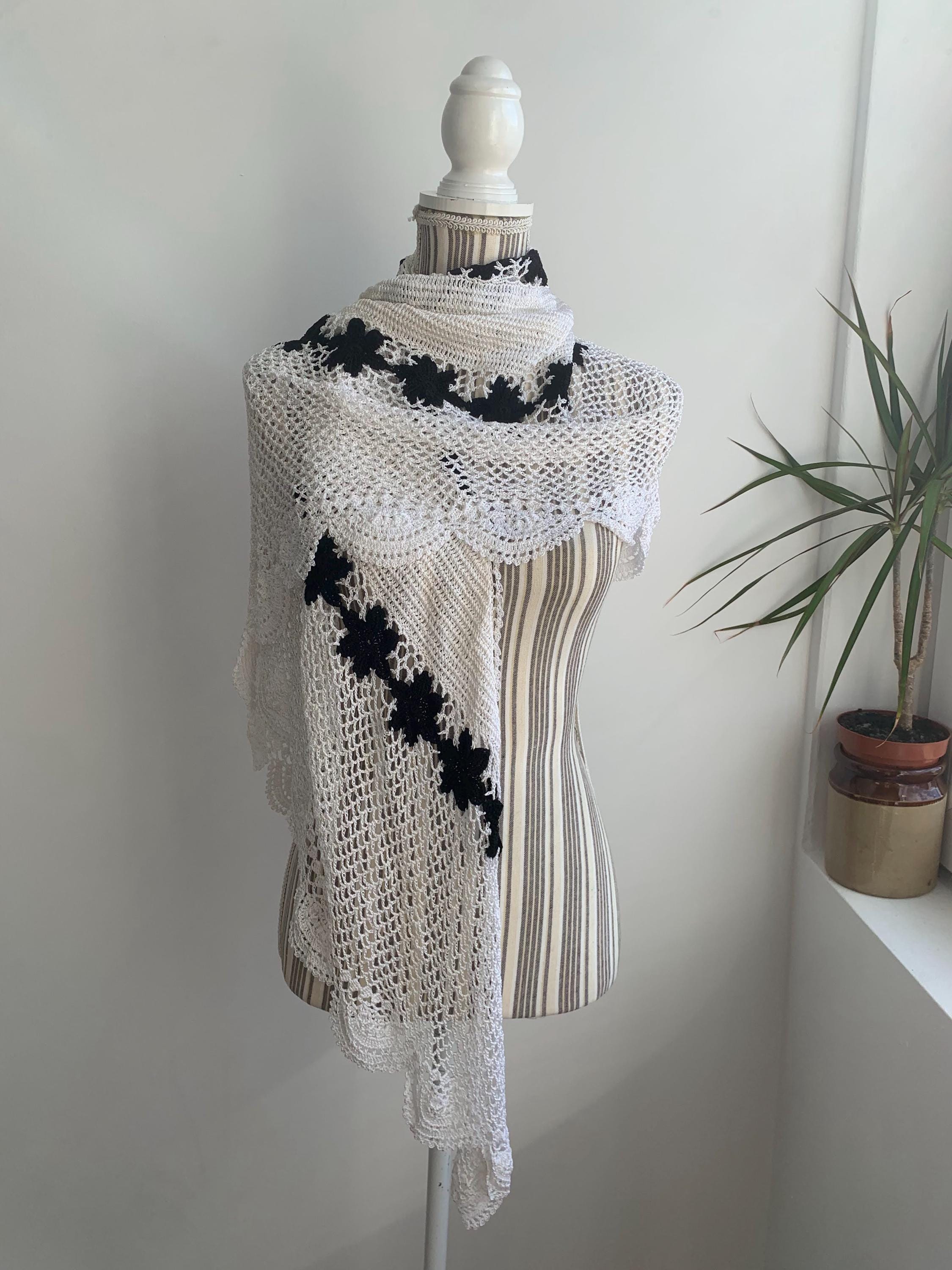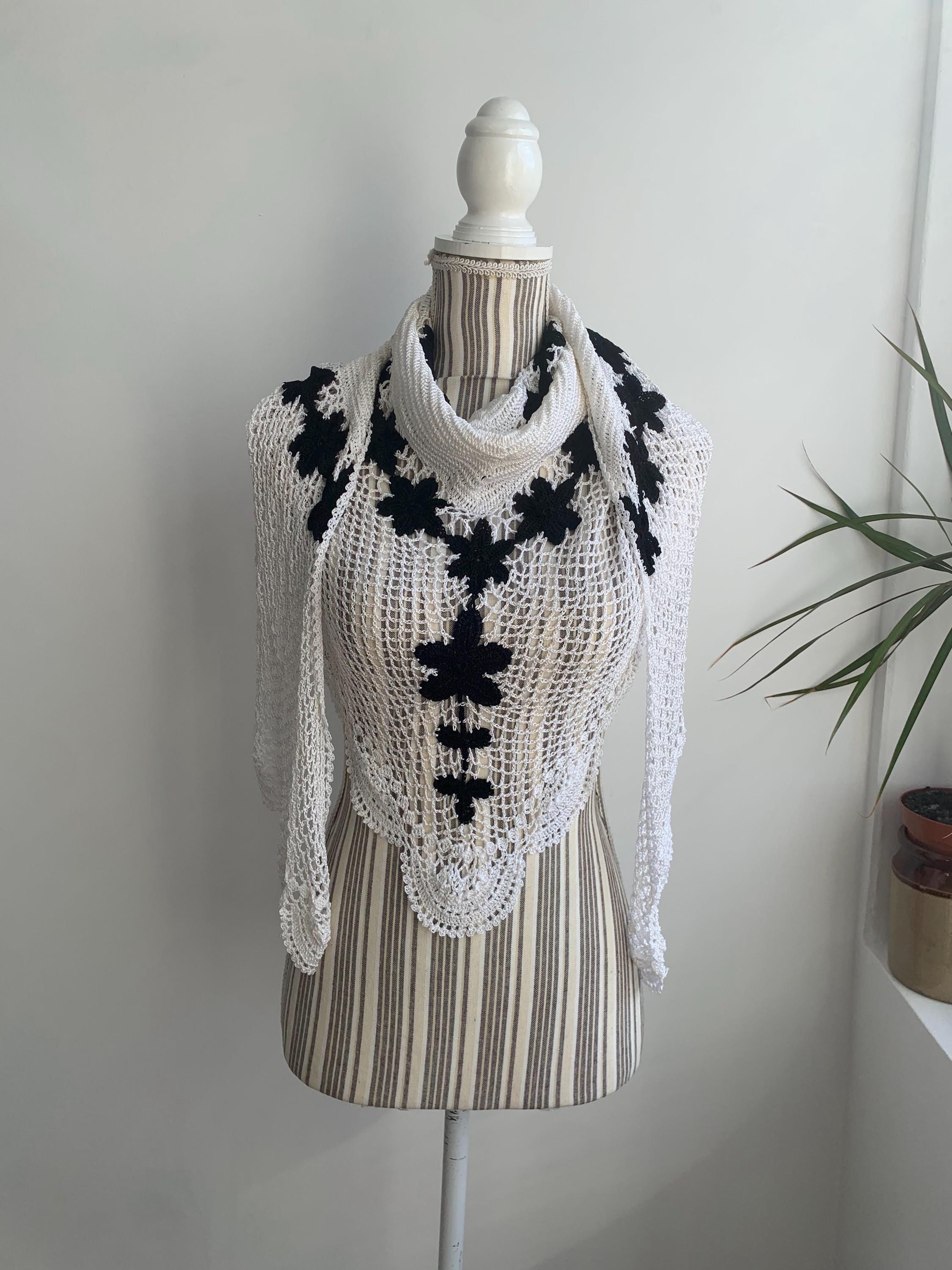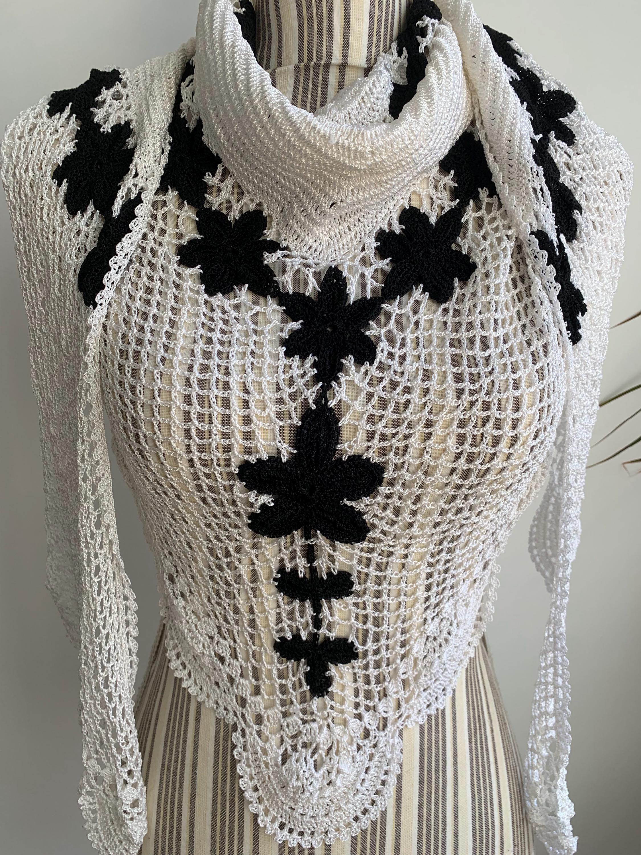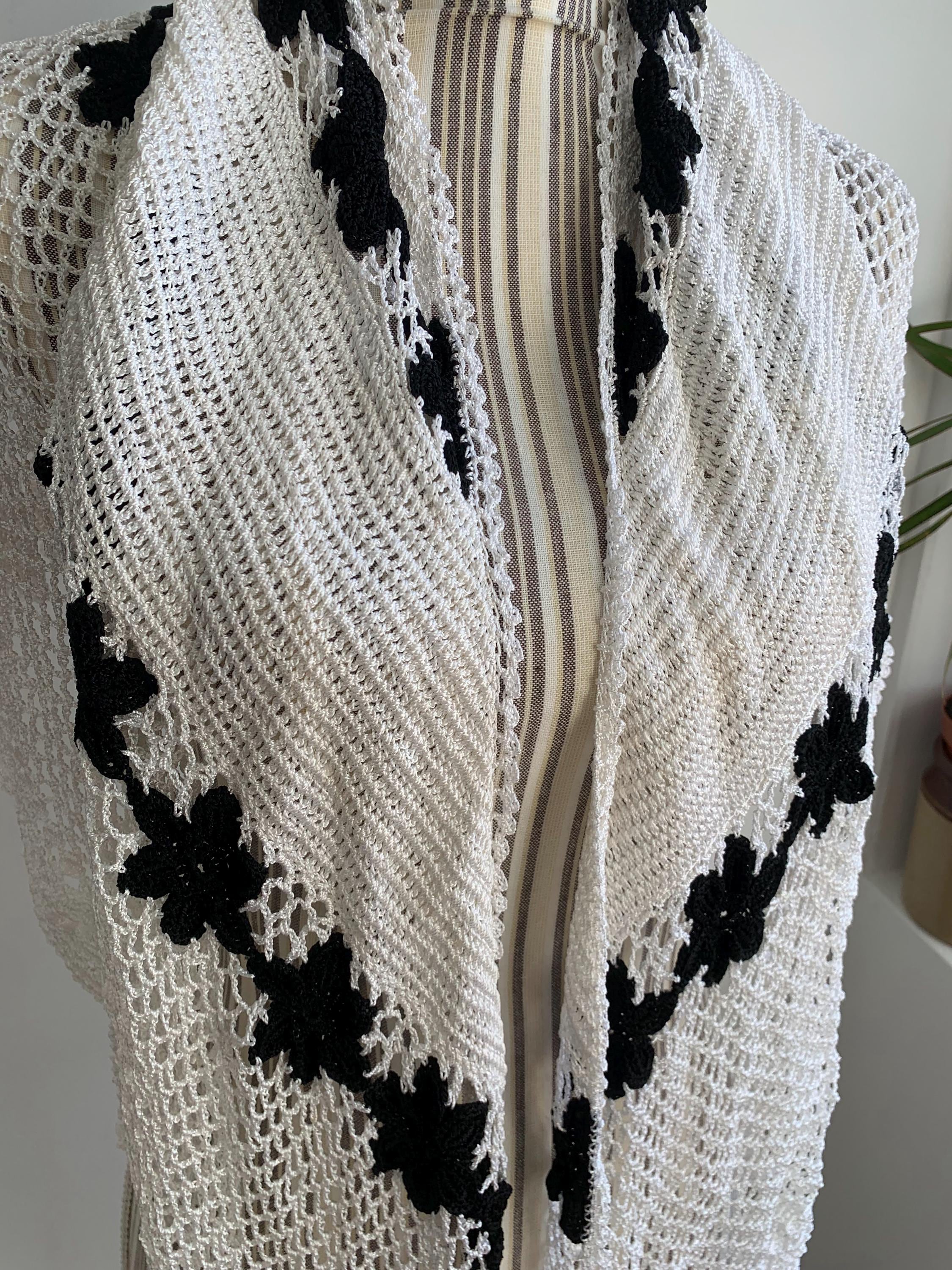 This is a pretty vintage crochet bohemian snow white shawl with scalloped edges and black flowers. This shiny triangle shawl is made of shiny viscose thread which shimmers beautifully when exposed to light. This mesh fringed shawl has a delicate shine. Perfect elegant shawl wrap for evening parties, weddings and special occasions.