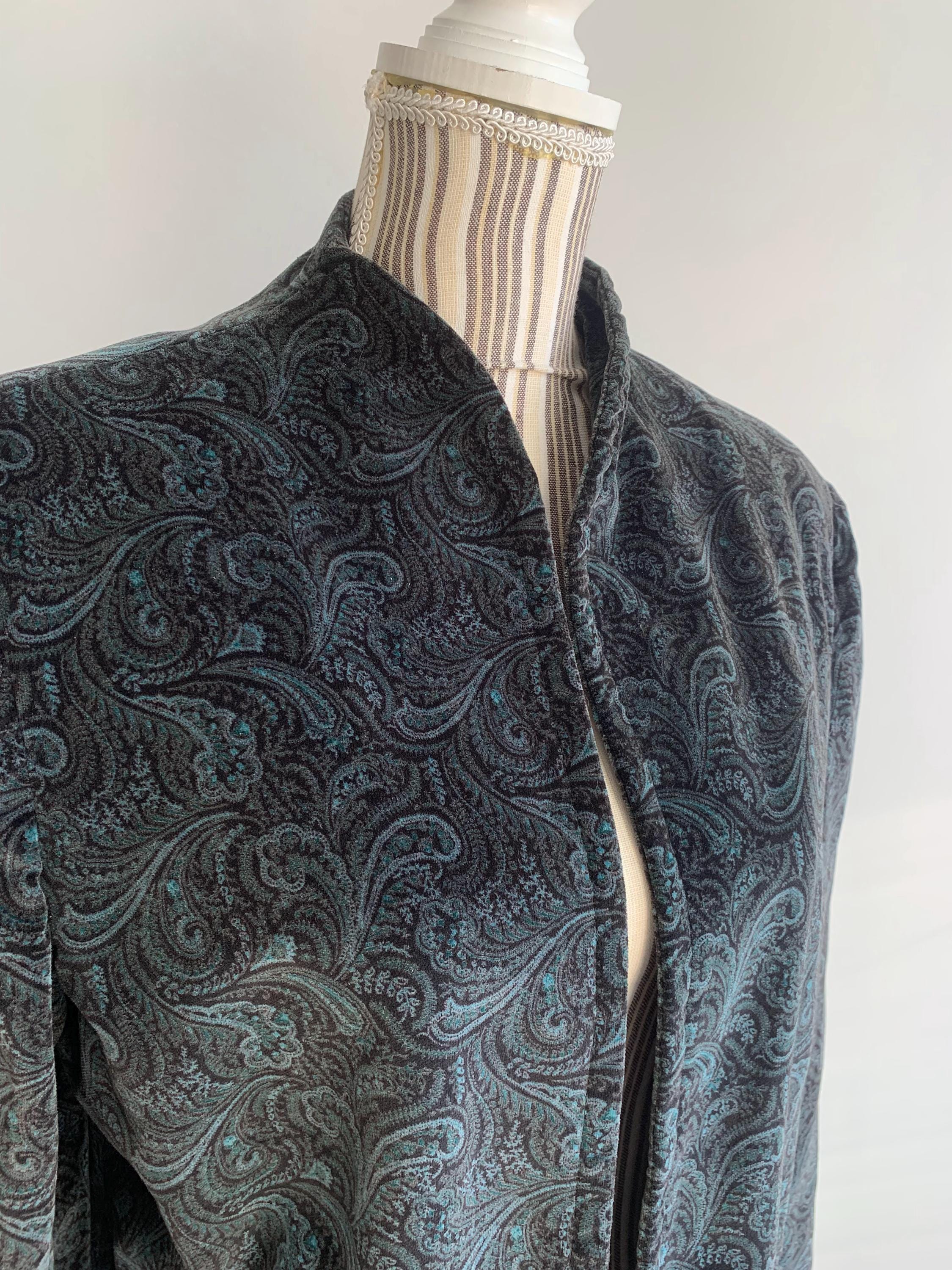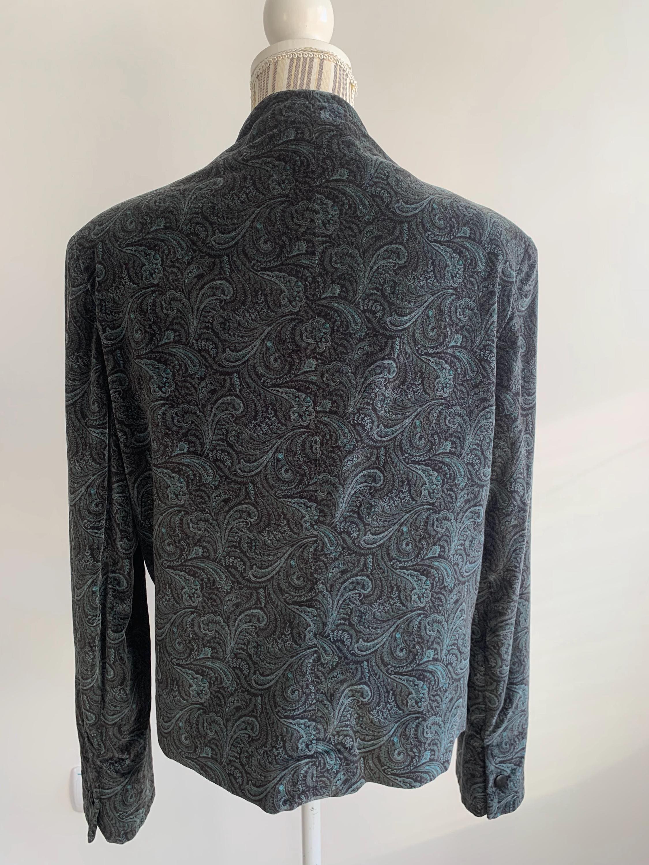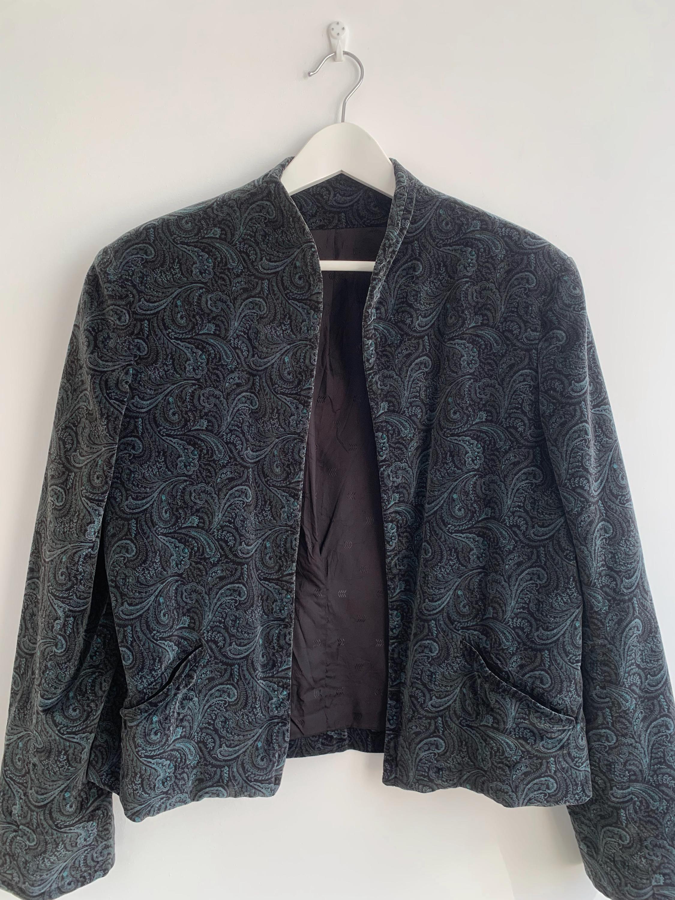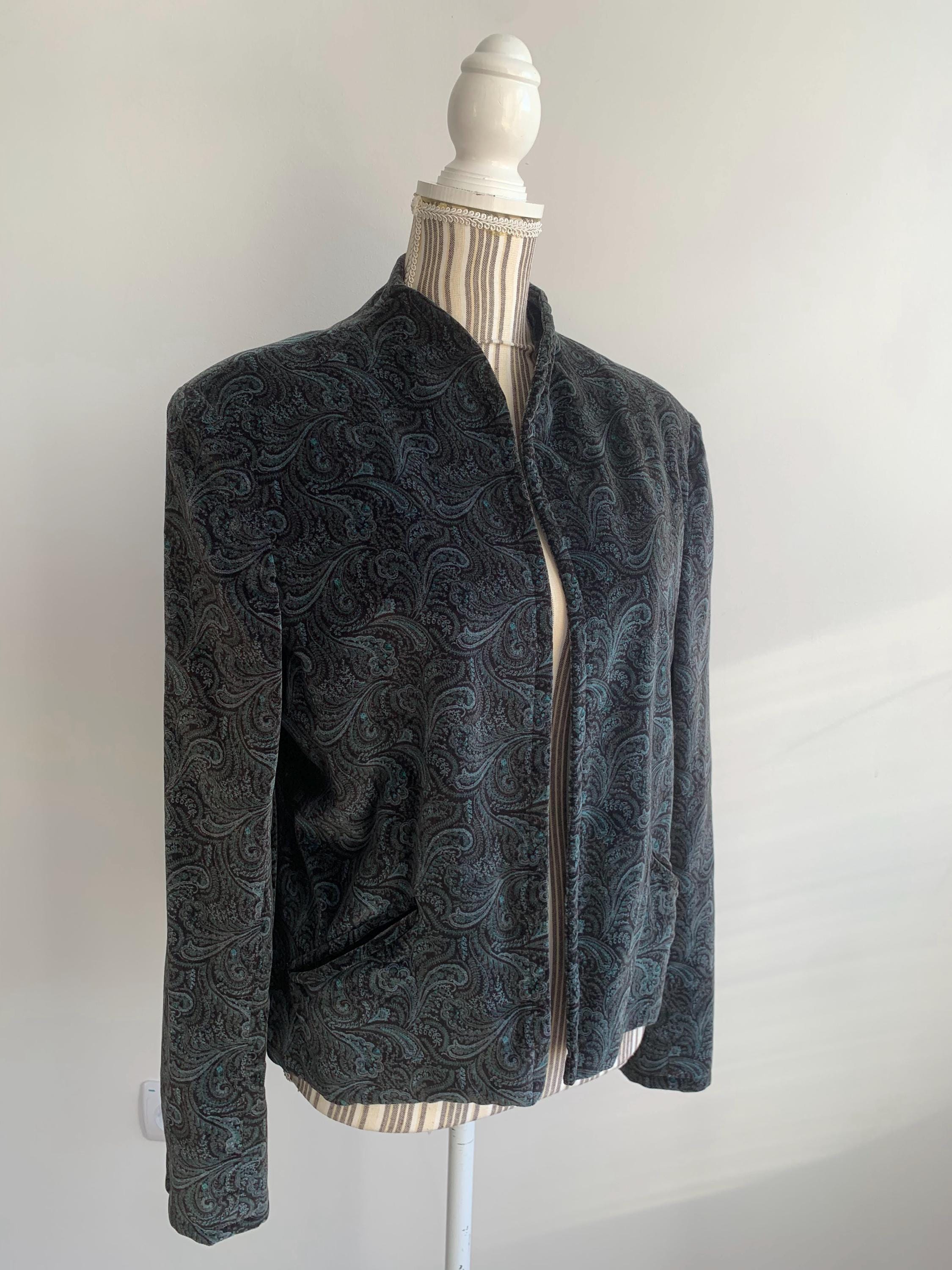 This is s vintage 90s turquoise teal blue cotton velvet blazer for women with pockets and open front closure. This soft velveteen blazer is made of super soft cotton fabric. This velvet cropped coat is a beautiful spring / fall blazer that you can wear daily. You can also wear it in the winter under your winter coat for extra warmth. This floral velvet blazer has no tag or label, it fits like size L. Please check the measurements below.