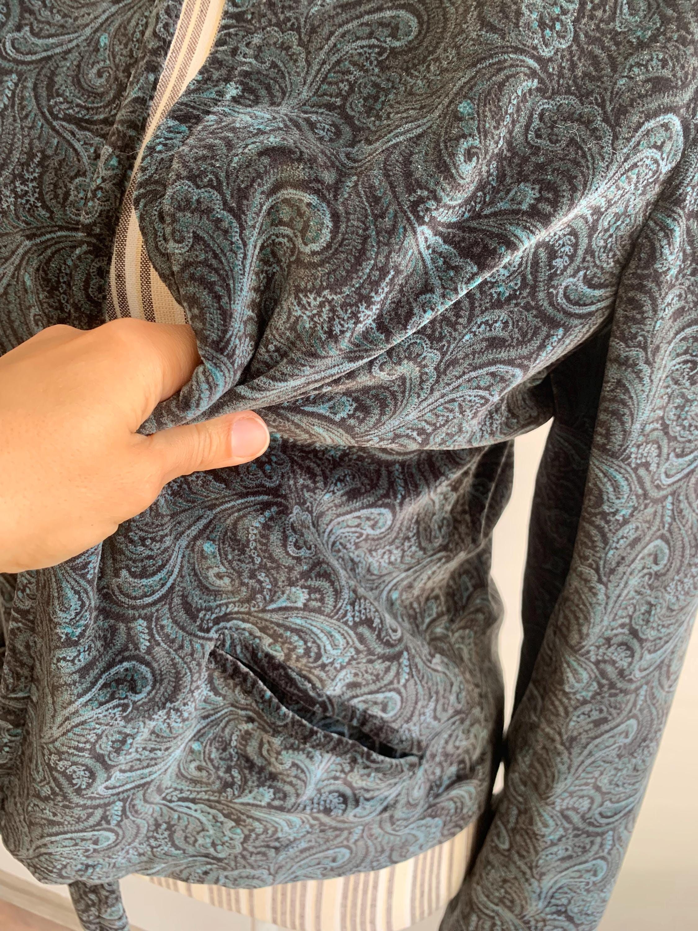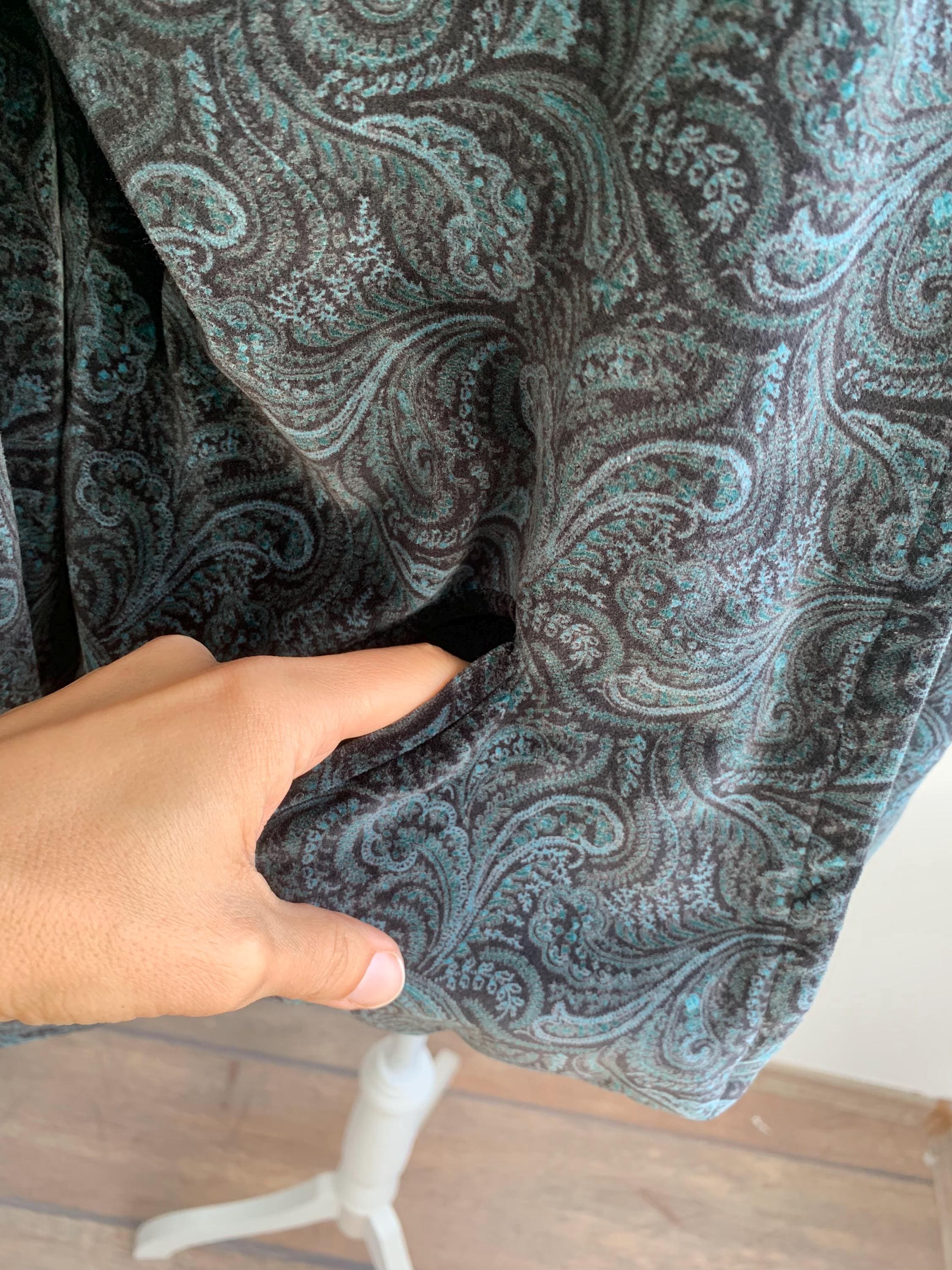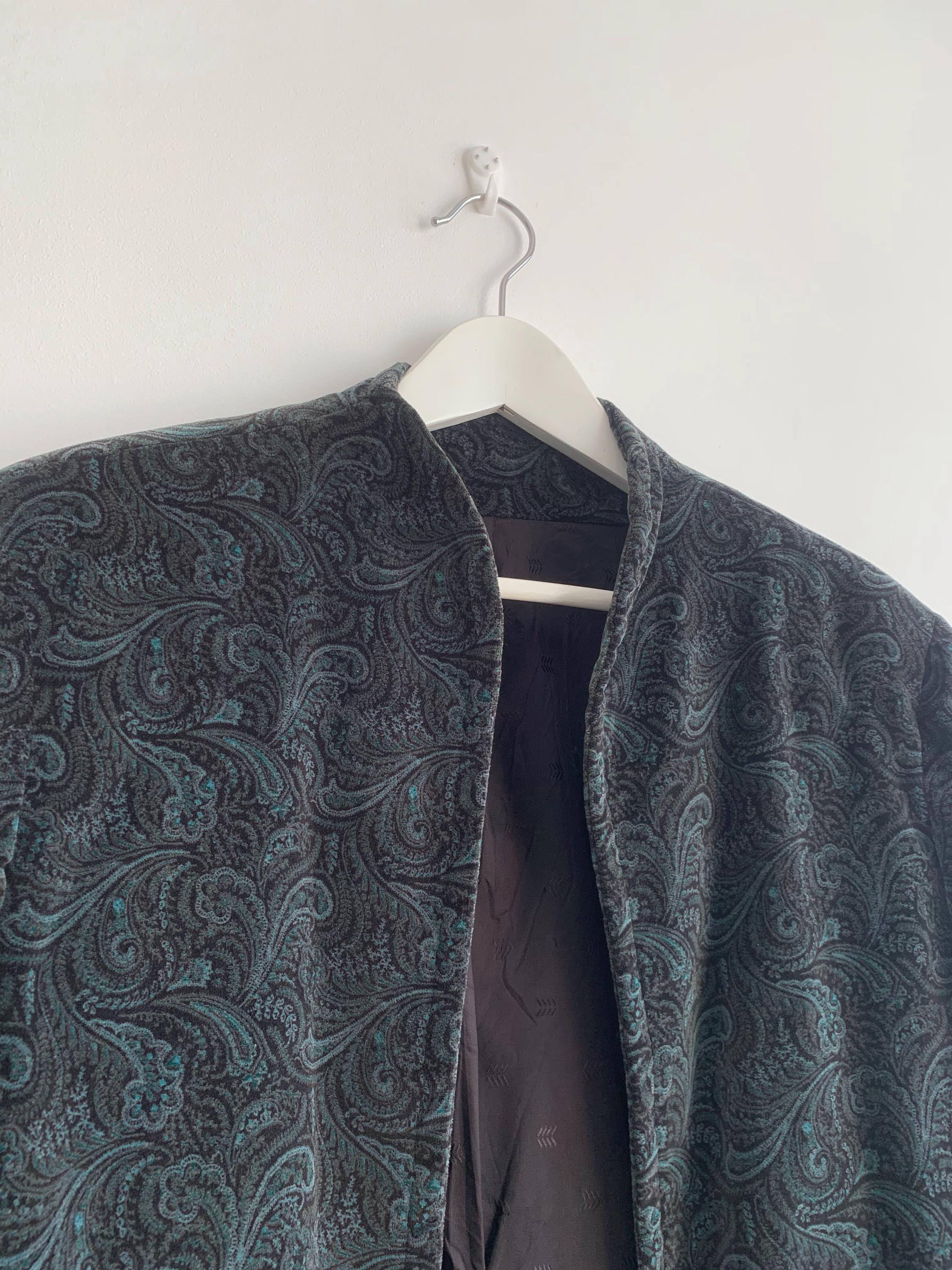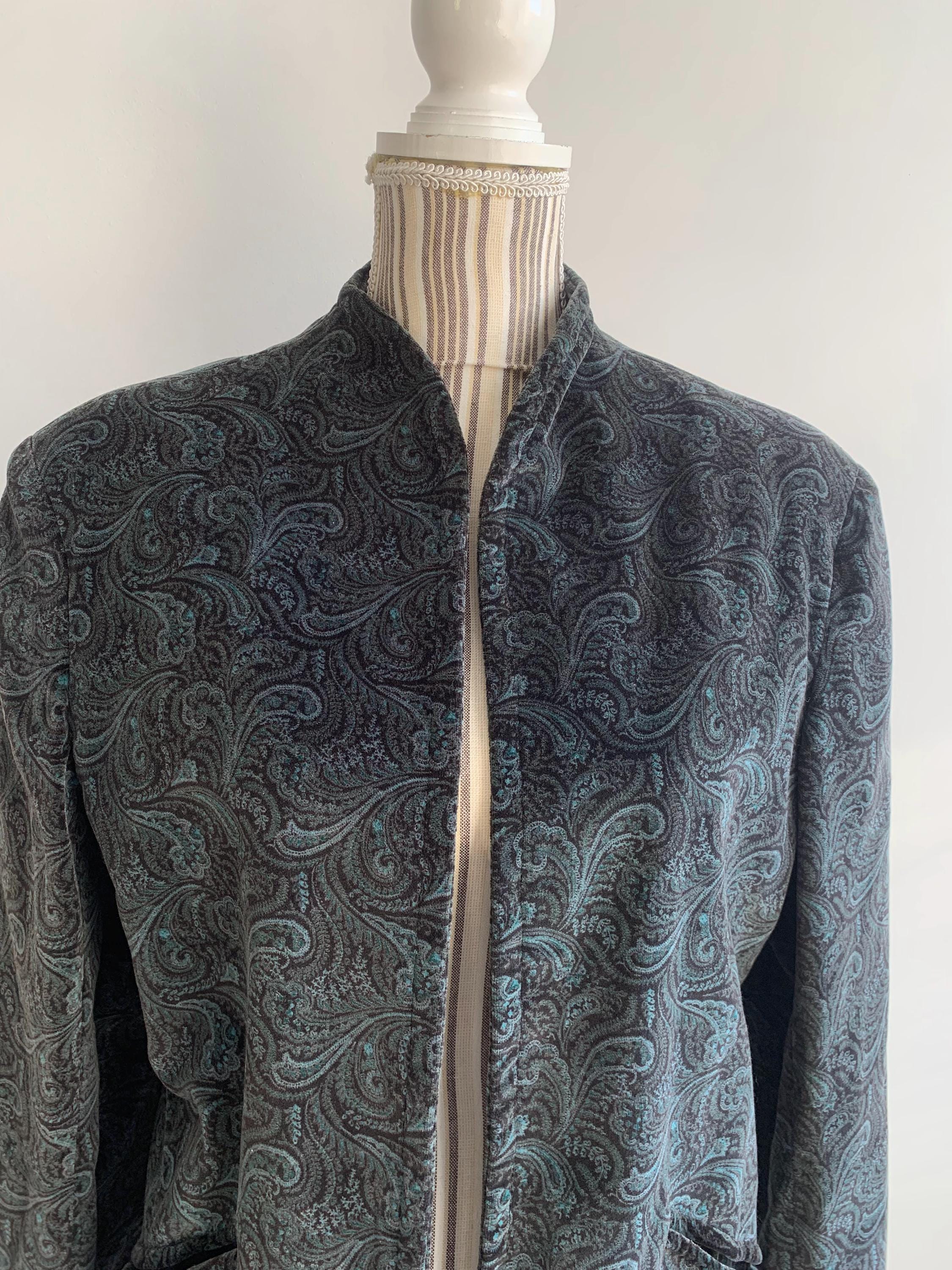 This is s vintage 90s turquoise teal blue cotton velvet blazer for women with pockets and open front closure. This soft velveteen blazer is made of super soft cotton fabric. This velvet cropped coat is a beautiful spring / fall blazer that you can wear daily. You can also wear it in the winter under your winter coat for extra warmth. This floral velvet blazer has no tag or label, it fits like size L. Please check the measurements below.
