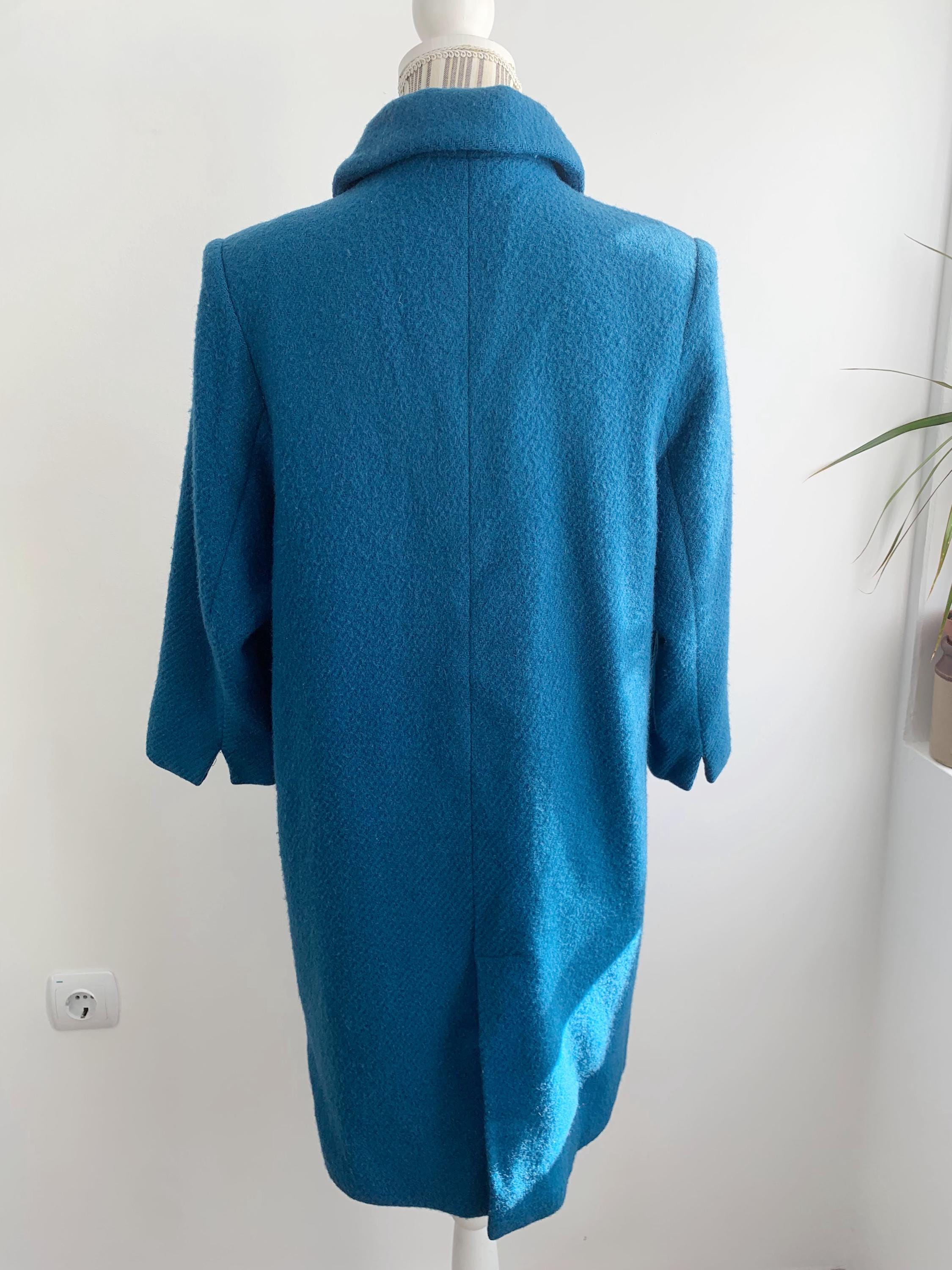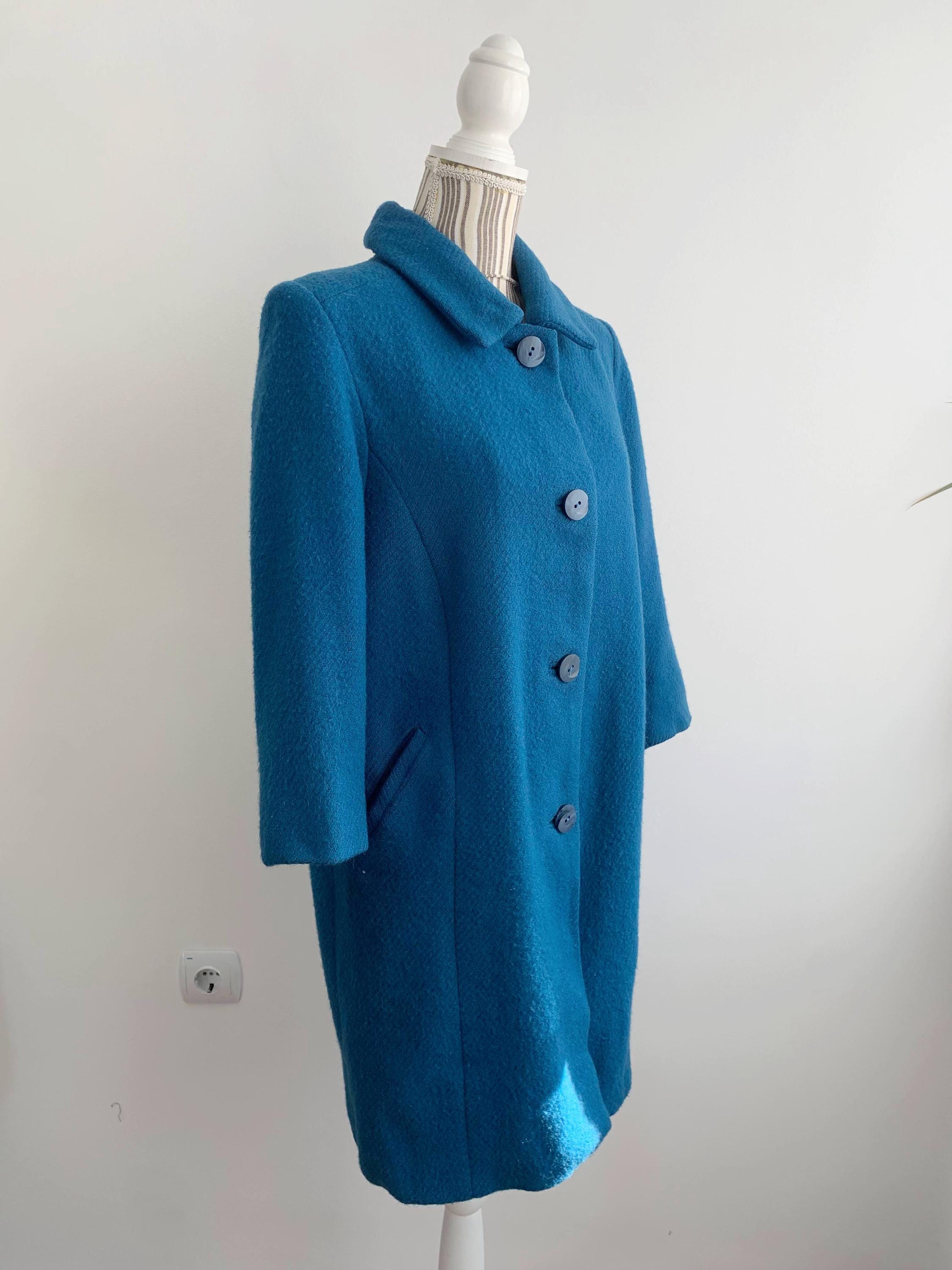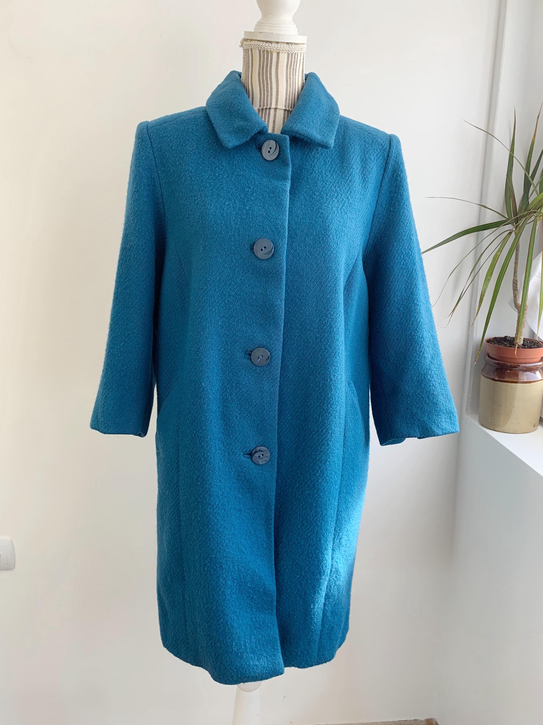 This is s beautiful vintage 60s 70s wool midi coat in turquoise blue color, button front closure and 3/4 length sleeves with slits. This winter wool coat is made of soft textured wool fabric whihc has become fluffier with the wear. There is no tag or label to show the materials or size. The fabric feels like wool with polyester lining. This wool coat fits like size S or M. Please check the measurements below.