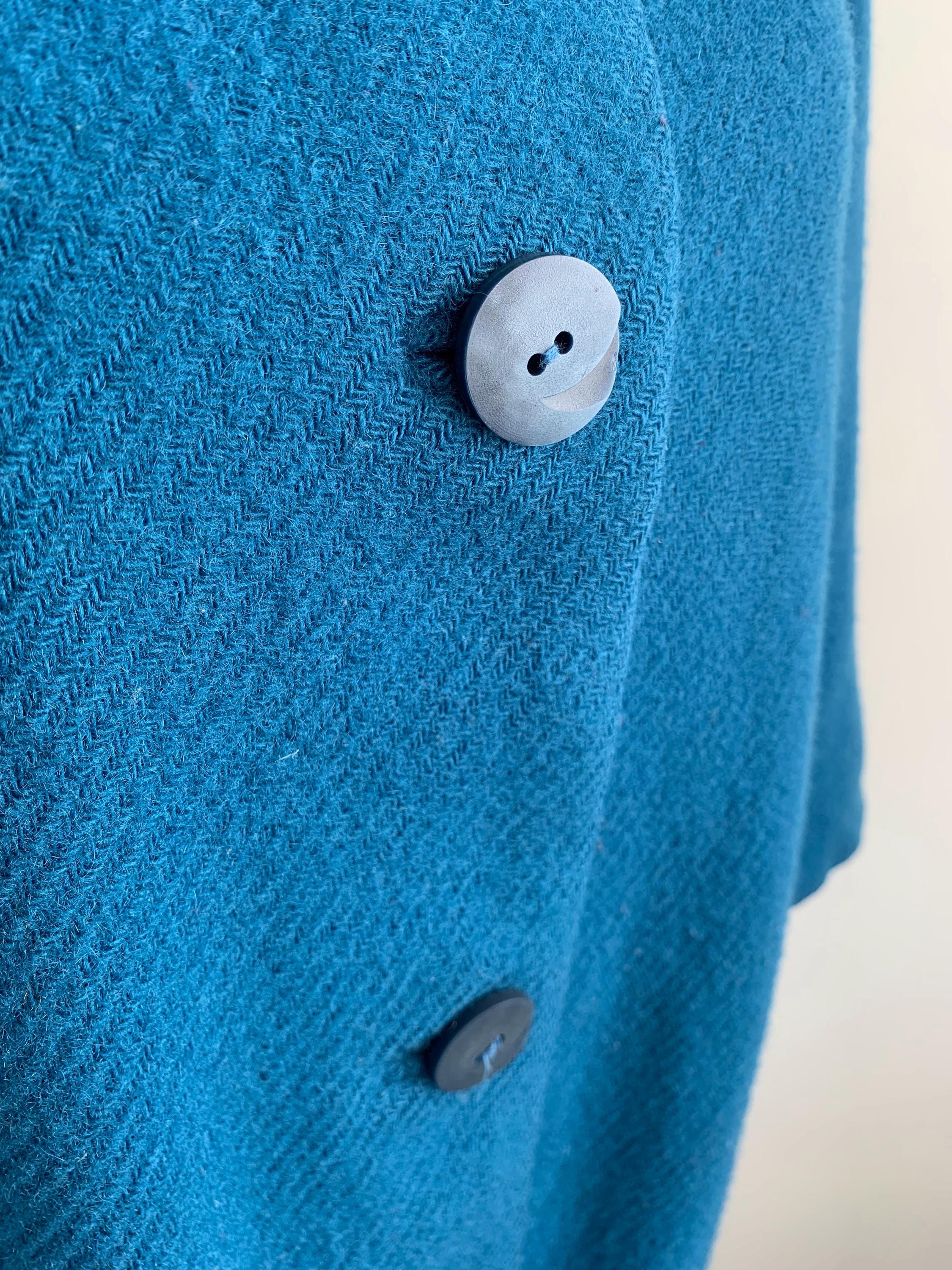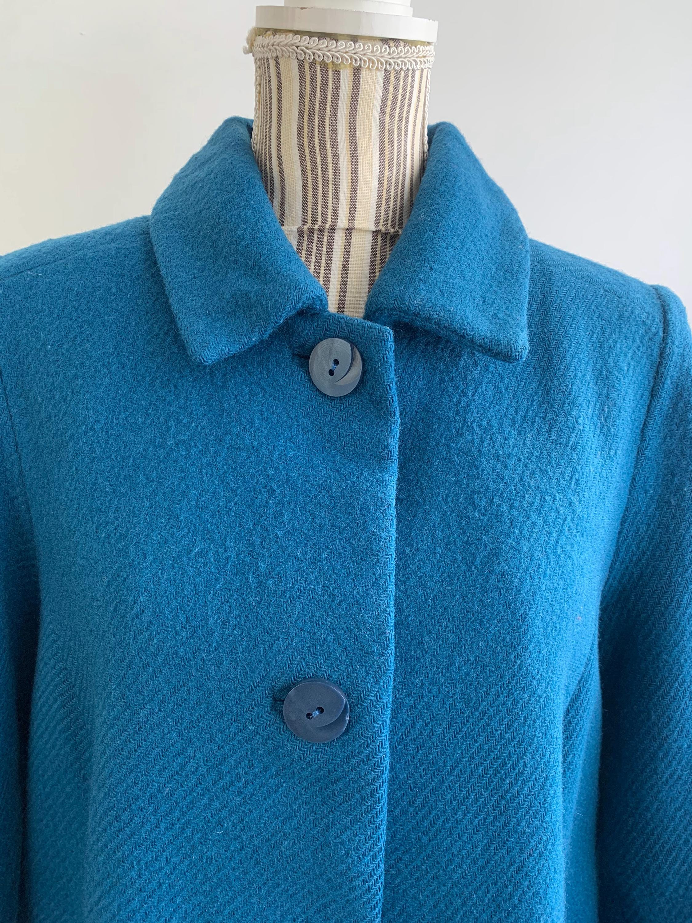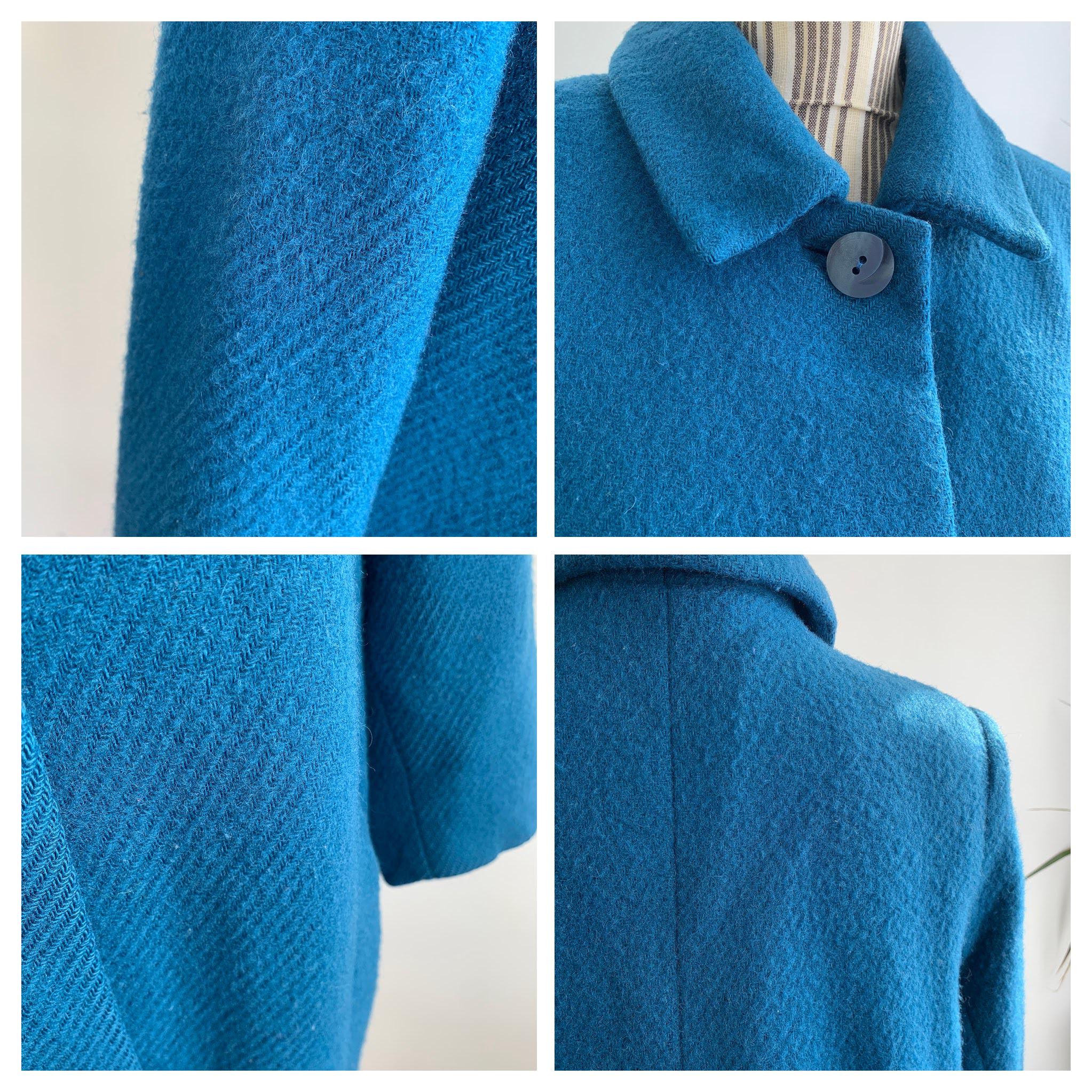 This is s beautiful vintage 60s 70s wool midi coat in turquoise blue color, button front closure and 3/4 length sleeves with slits. This winter wool coat is made of soft textured wool fabric whihc has become fluffier with the wear. There is no tag or label to show the materials or size. The fabric feels like wool with polyester lining. This wool coat fits like size S or M. Please check the measurements below.