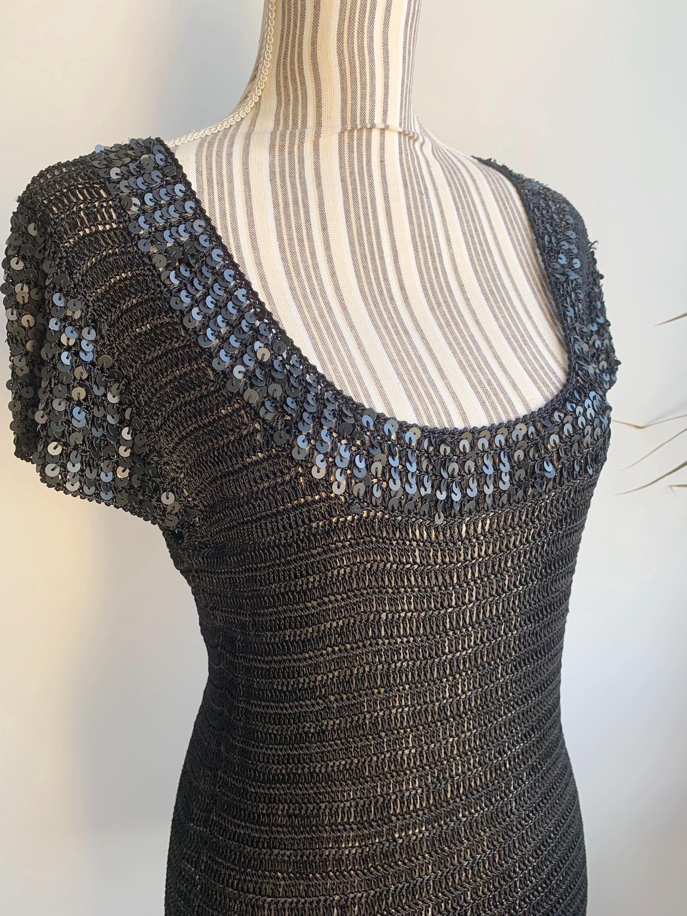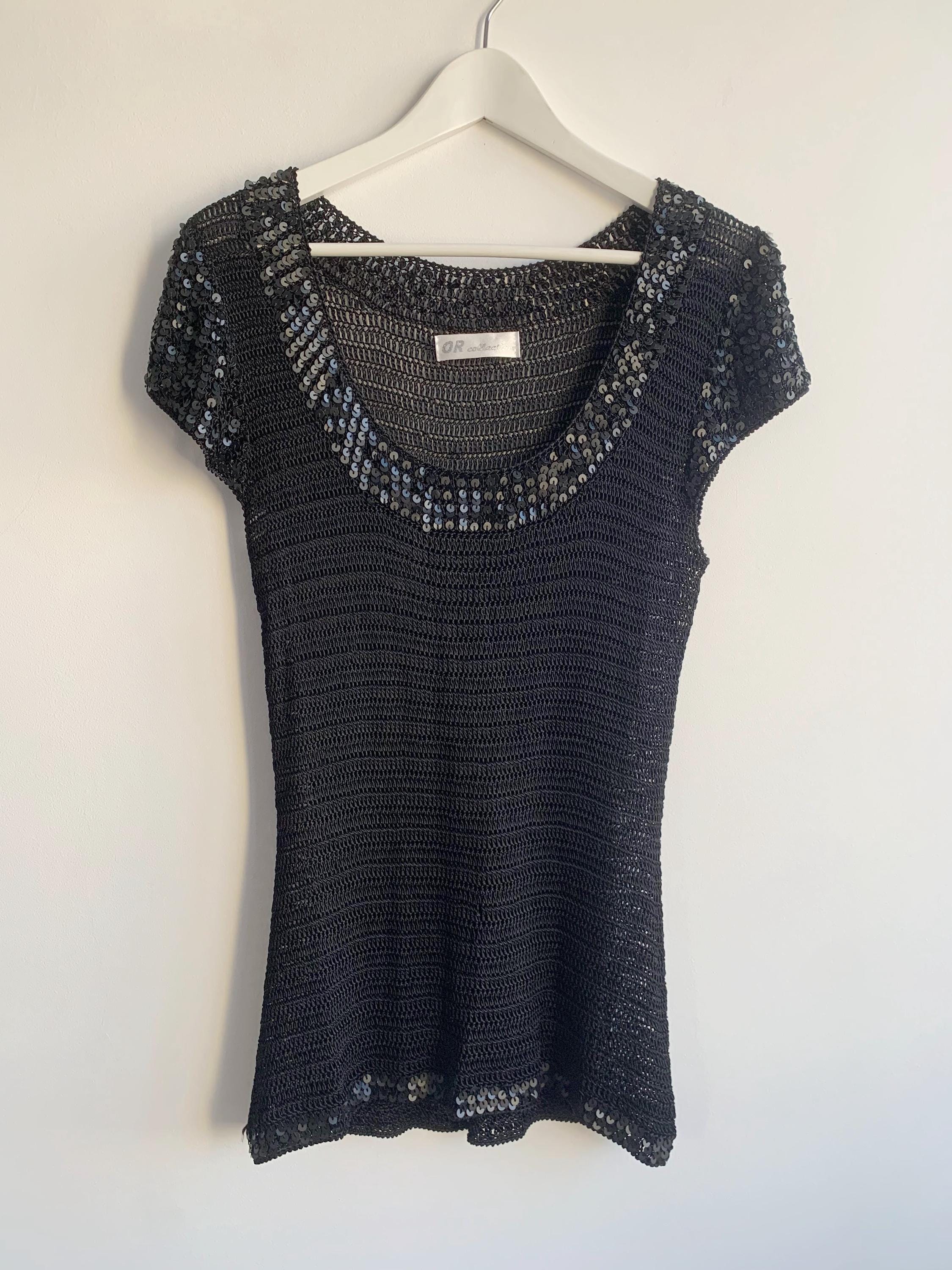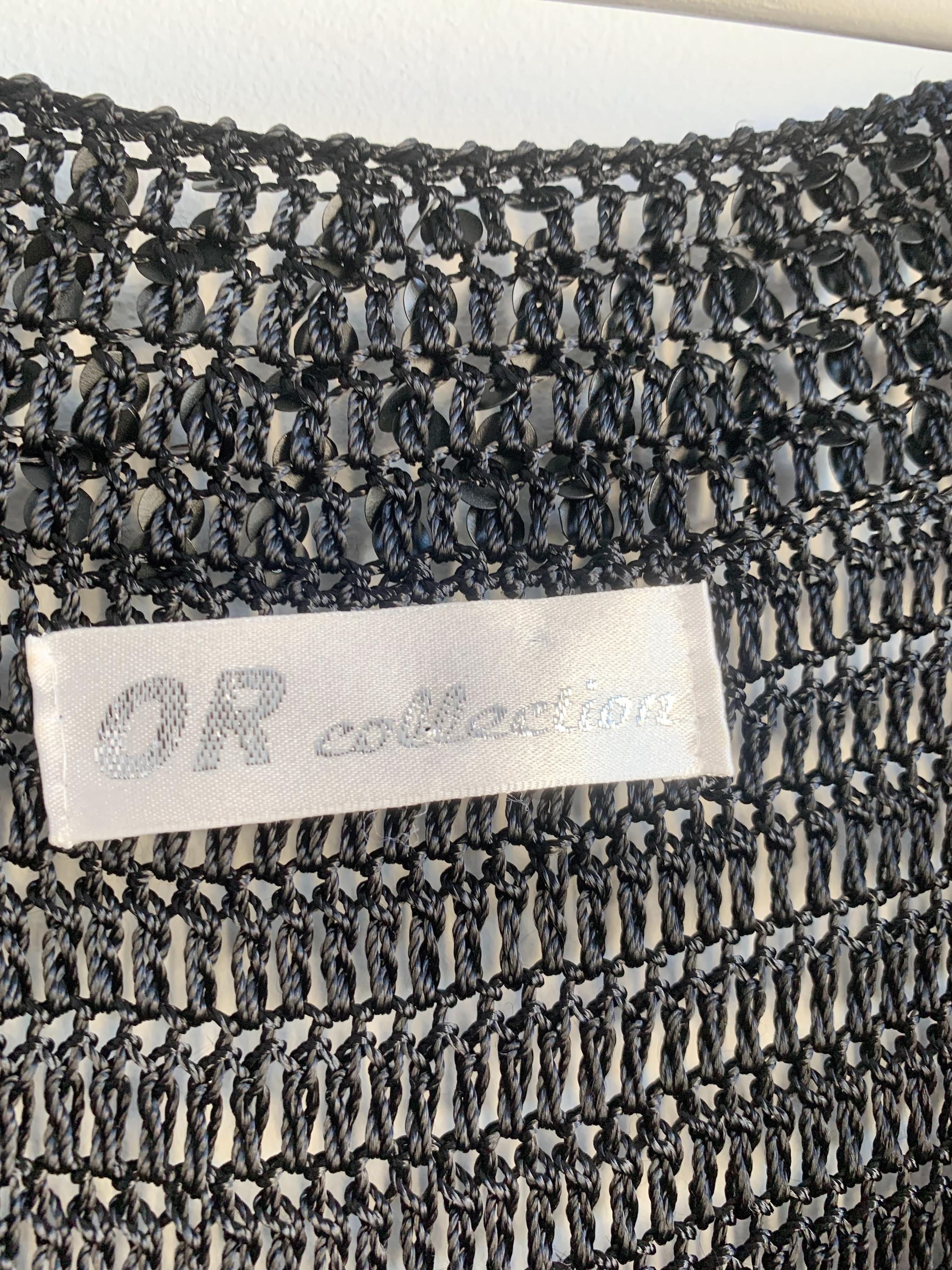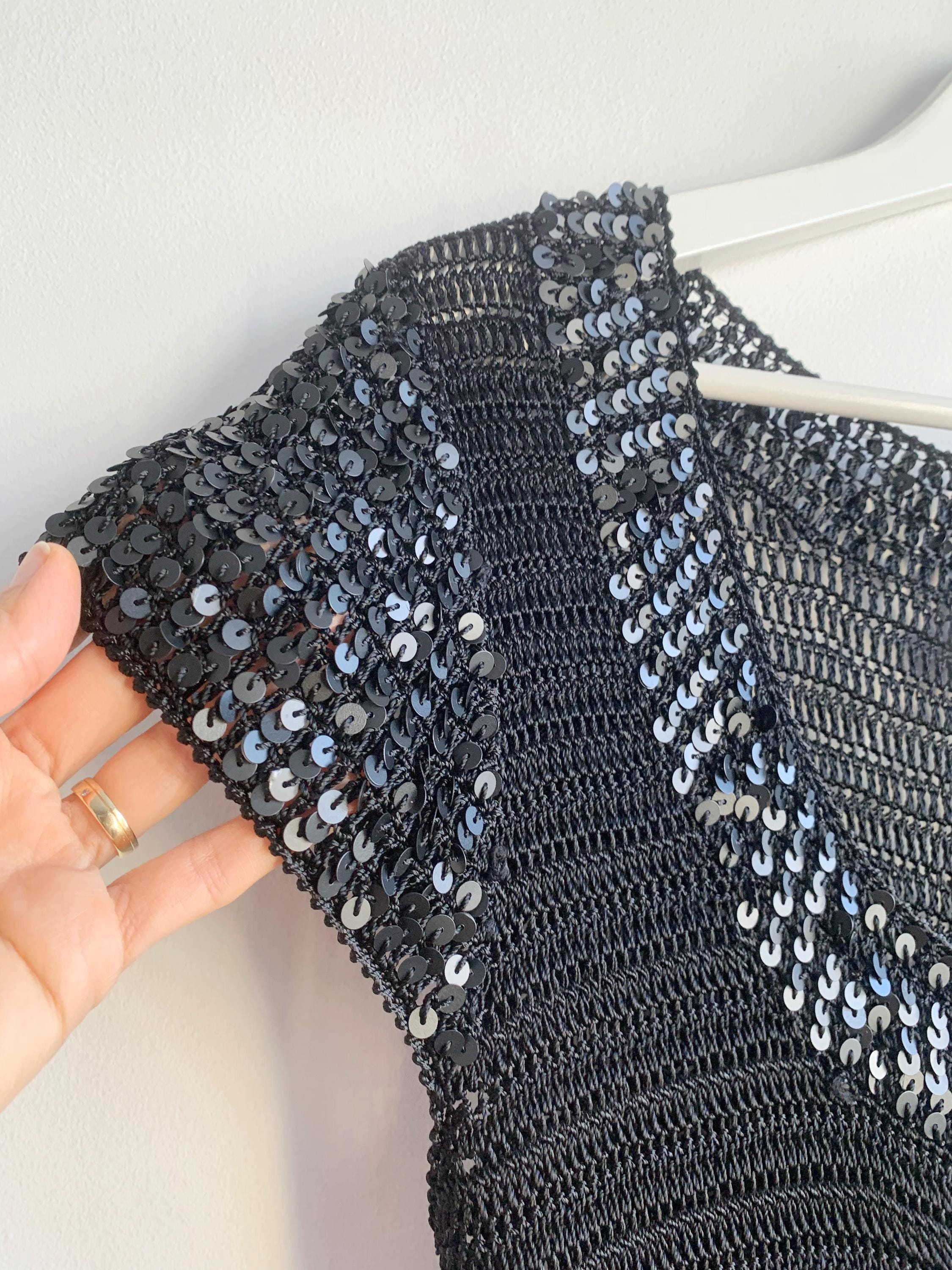 This is a pretty vintage black sequin top made of silky shiny viscose thread and black sequins, which shimmer beautifully when exposed to light. This crochet art deco blouse is semi sheer. The black sequin beads of this knitted tunic top which reflect the light. This short sleeve crochet pullover fits like size M. Please check the measurements below.