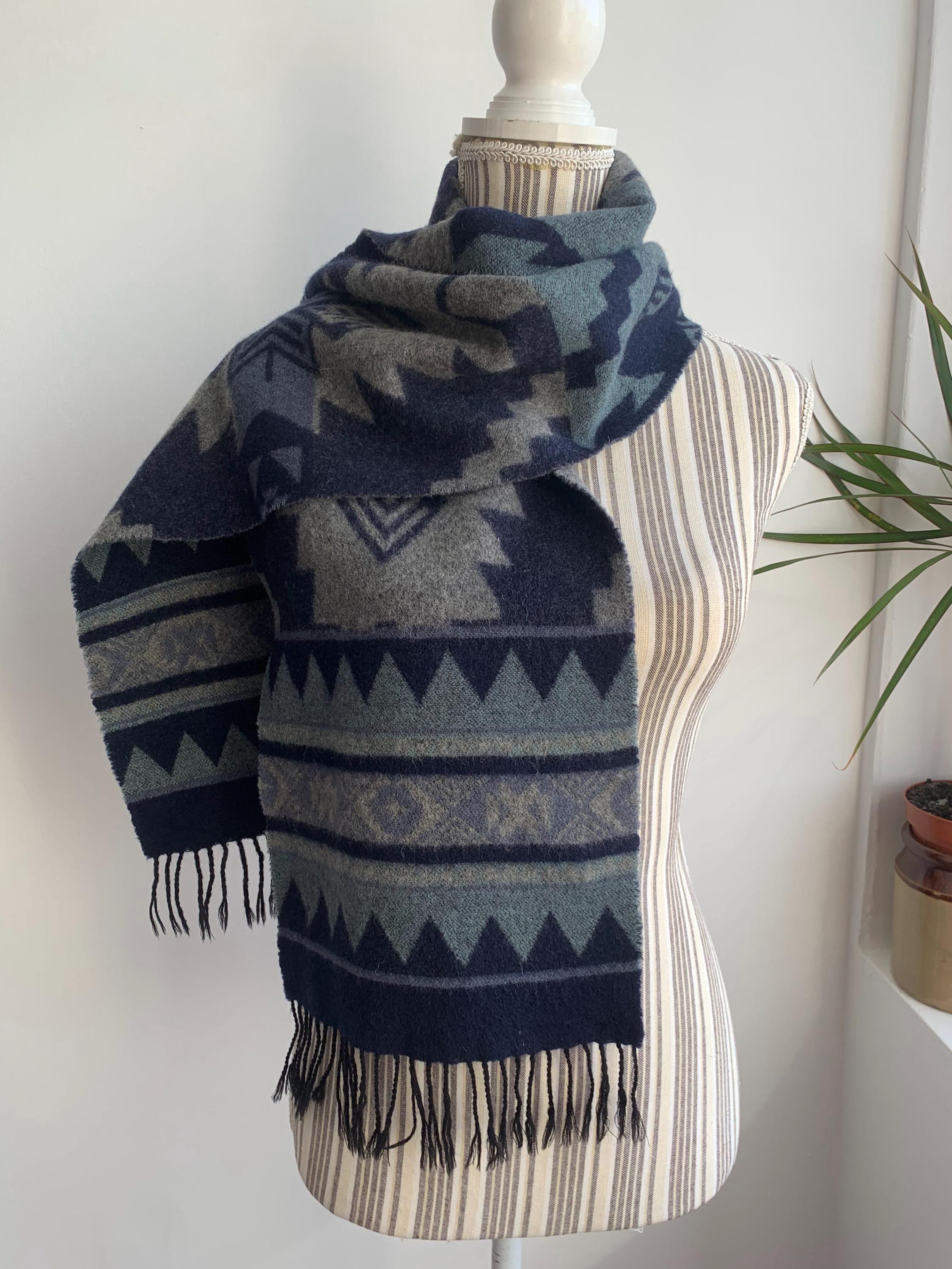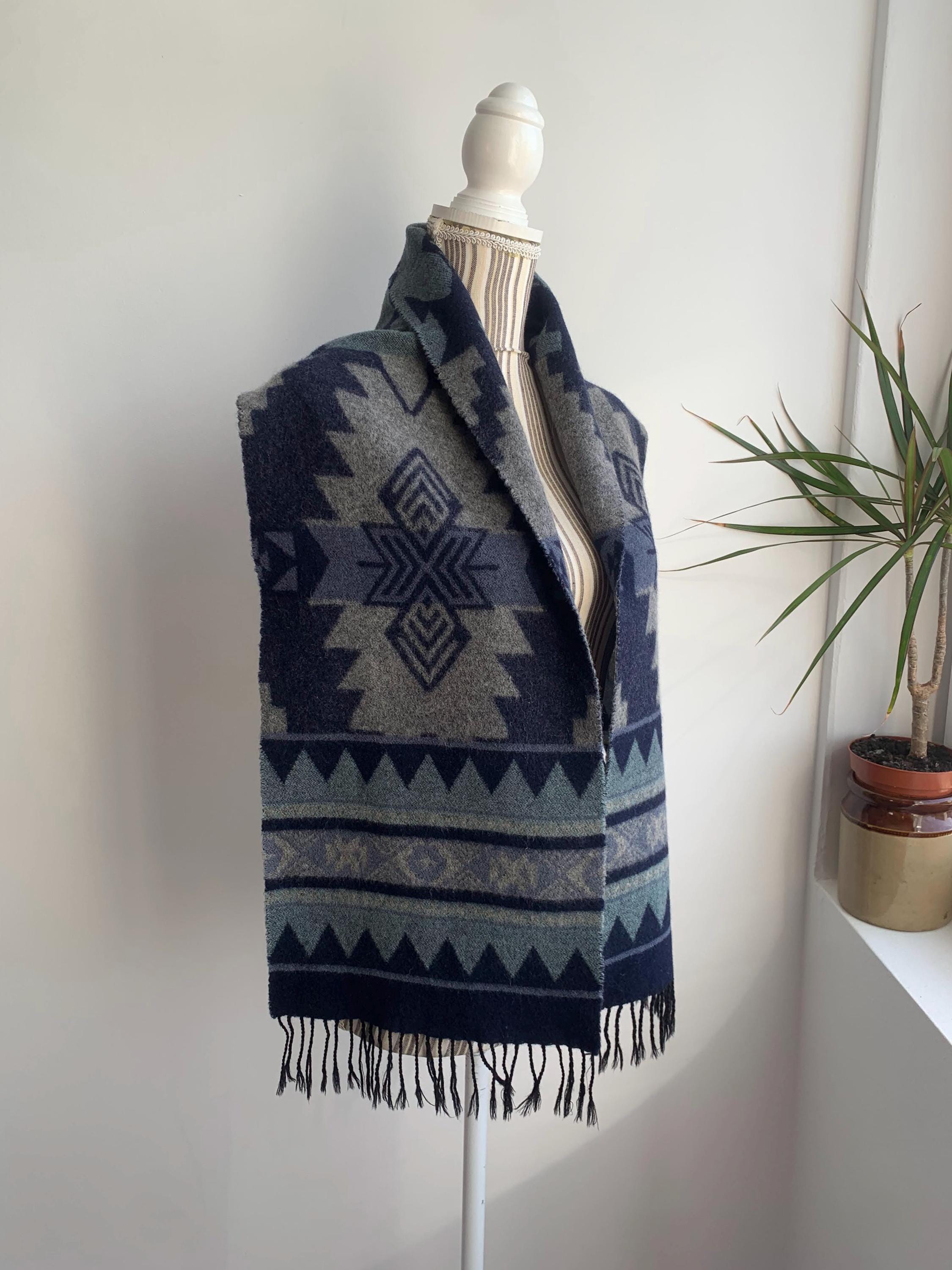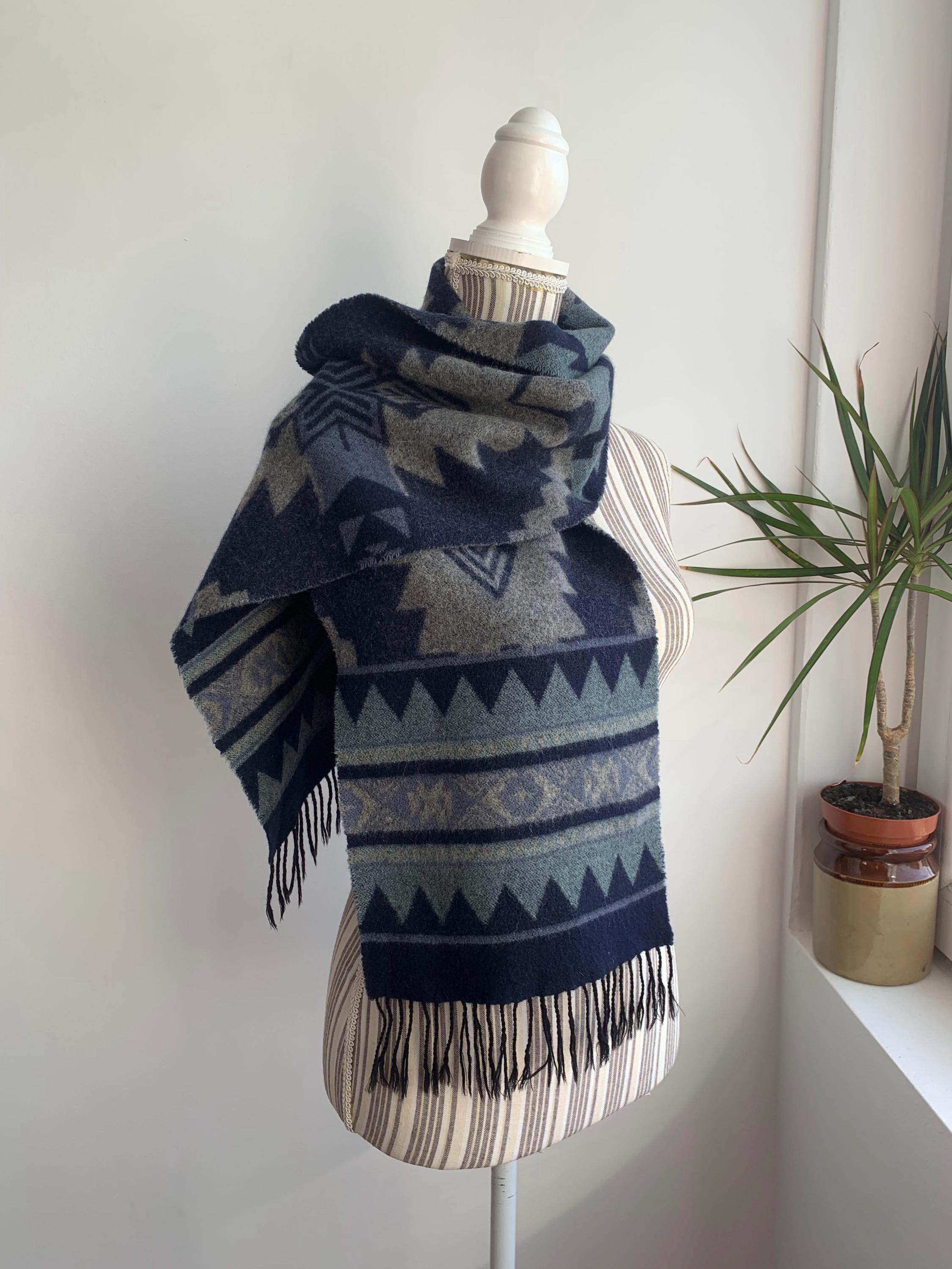 This is a beautiful vintage 90s soft and cozy warm fluffy wool winter scarf with fringe. This chunky rectangular shape wool scarf is made of soft fabric which feels like acrylic wool blend. This fluffy aztec scarf has tribal geometric print navy blue, mint and grey. Perfect sustainable vintage fashion gift for both men and women.