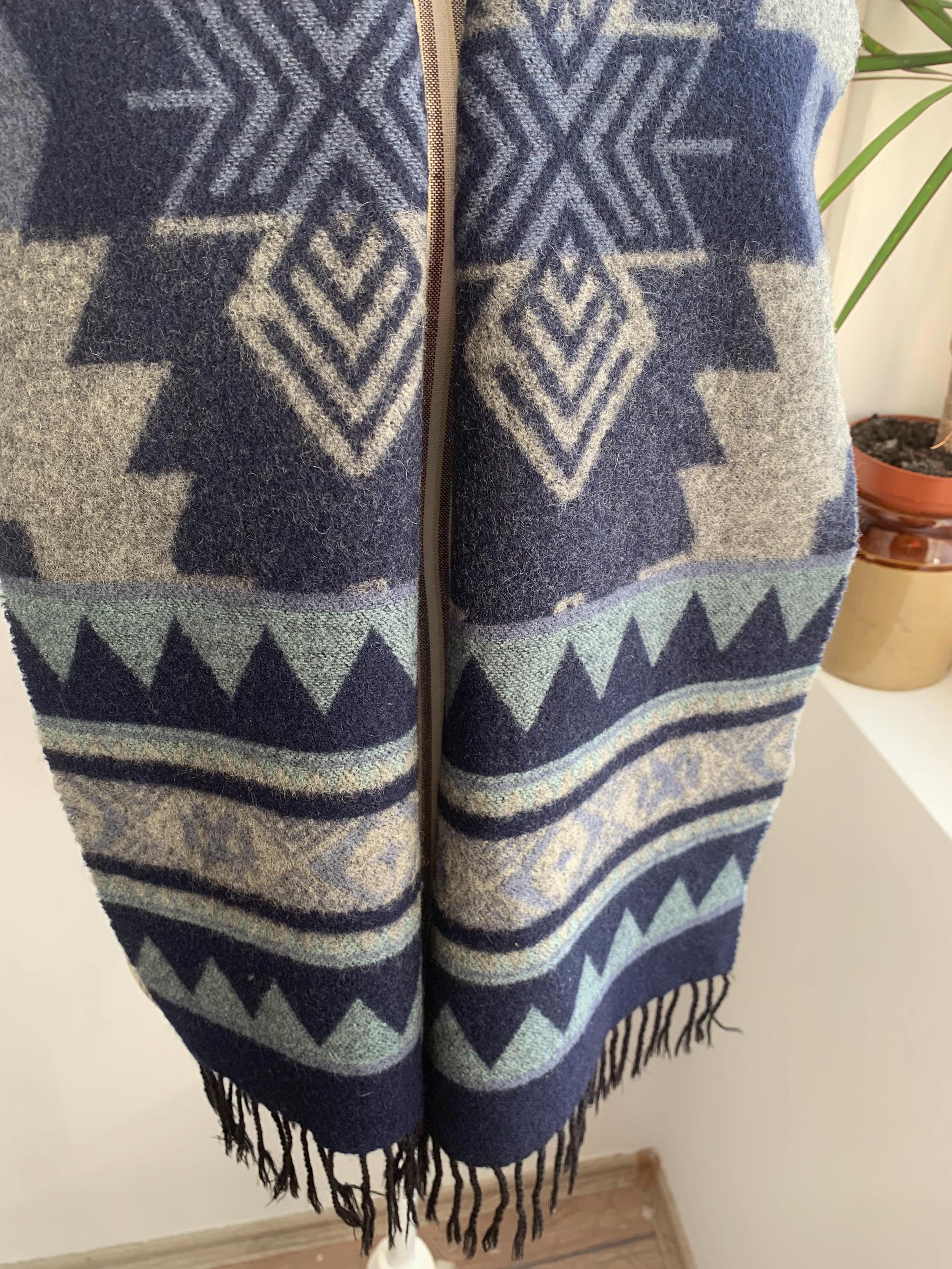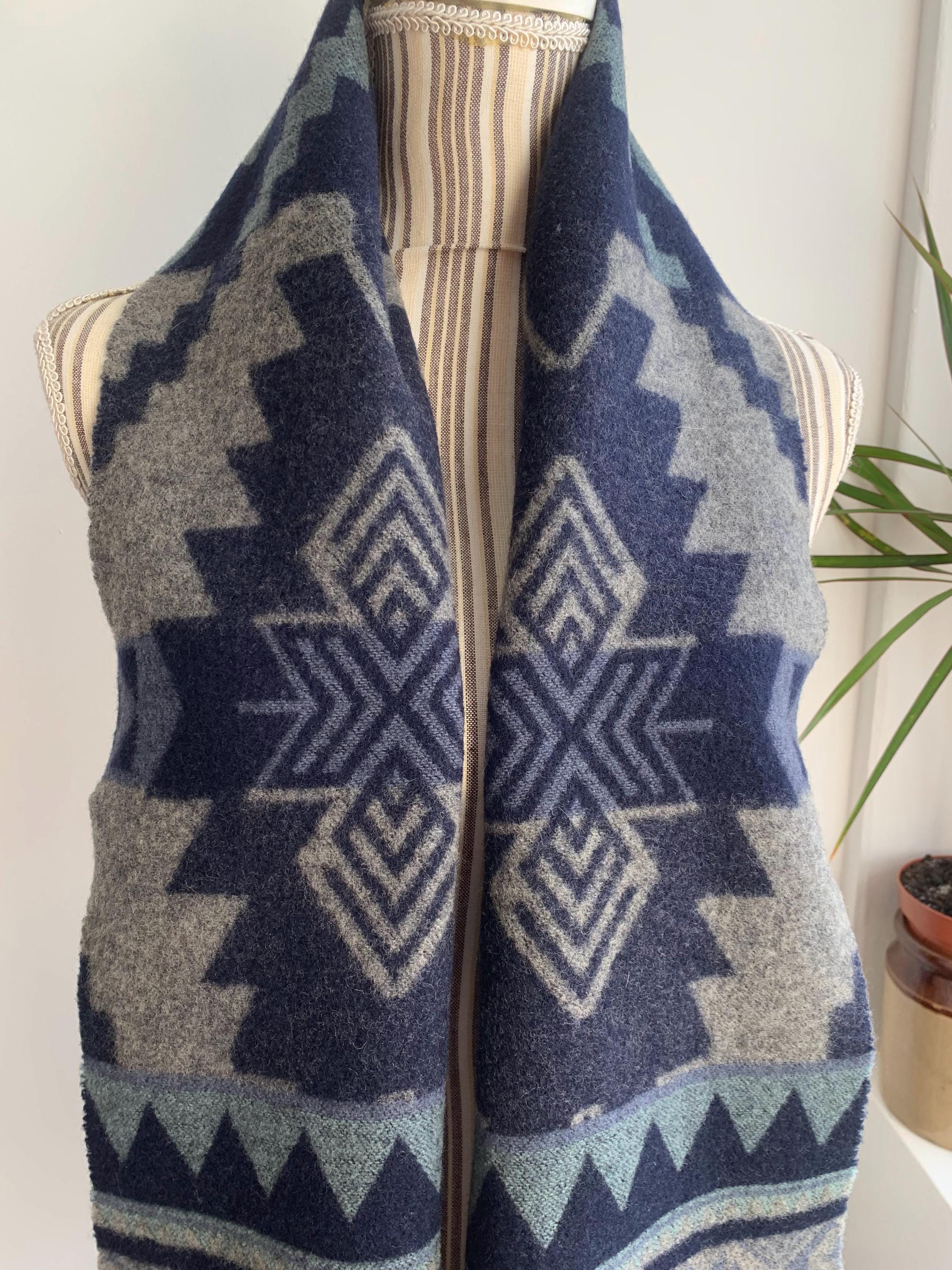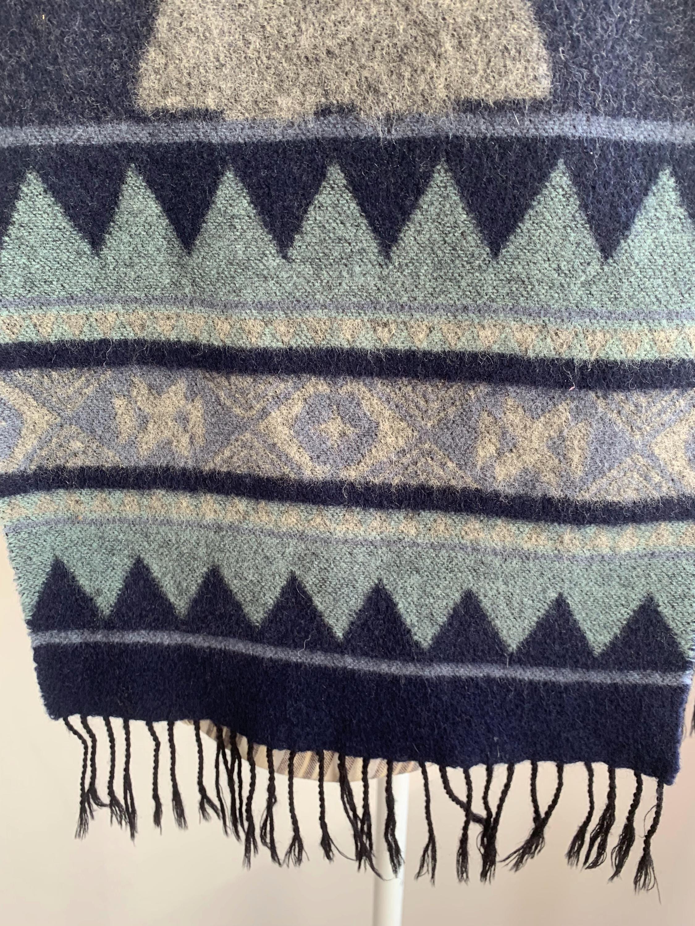 This is a beautiful vintage 90s soft and cozy warm fluffy wool winter scarf with fringe. This chunky rectangular shape wool scarf is made of soft fabric which feels like acrylic wool blend. This fluffy aztec scarf has tribal geometric print navy blue, mint and grey. Perfect sustainable vintage fashion gift for both men and women.
