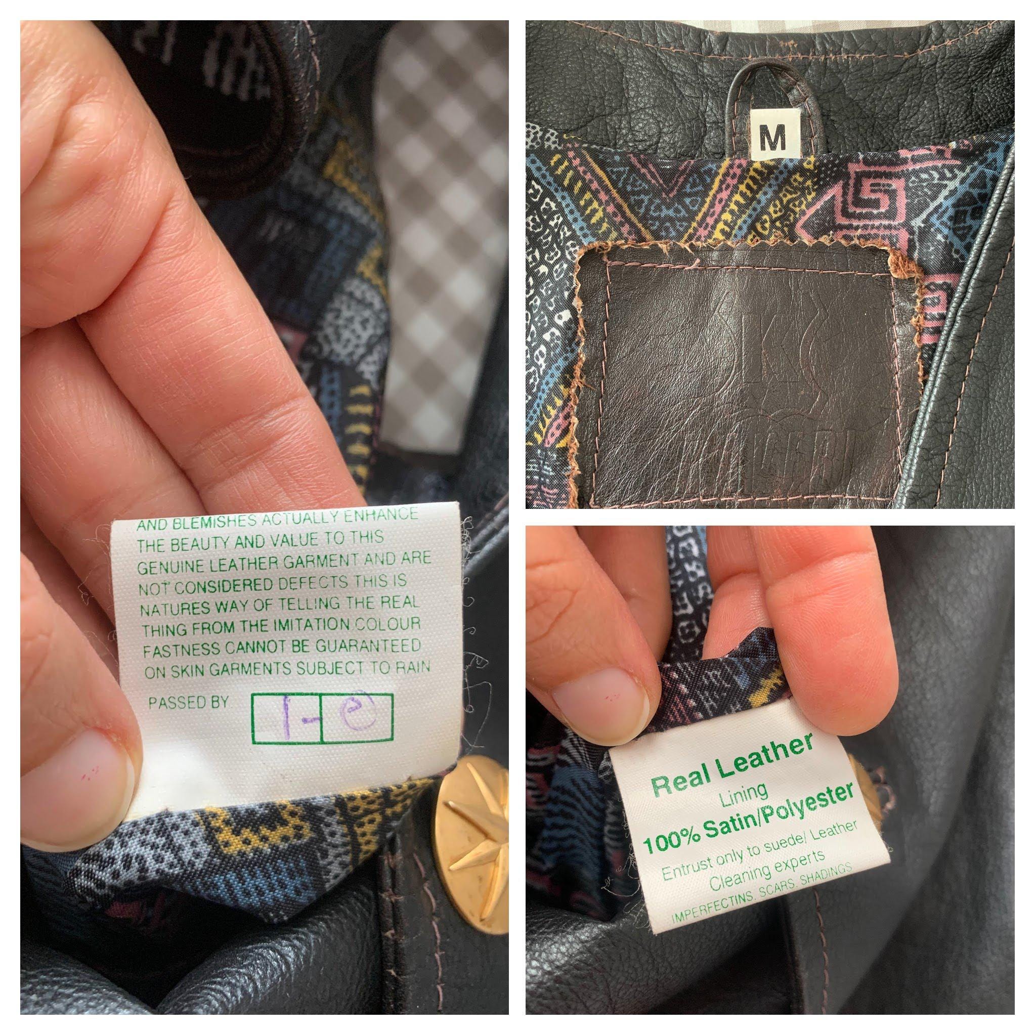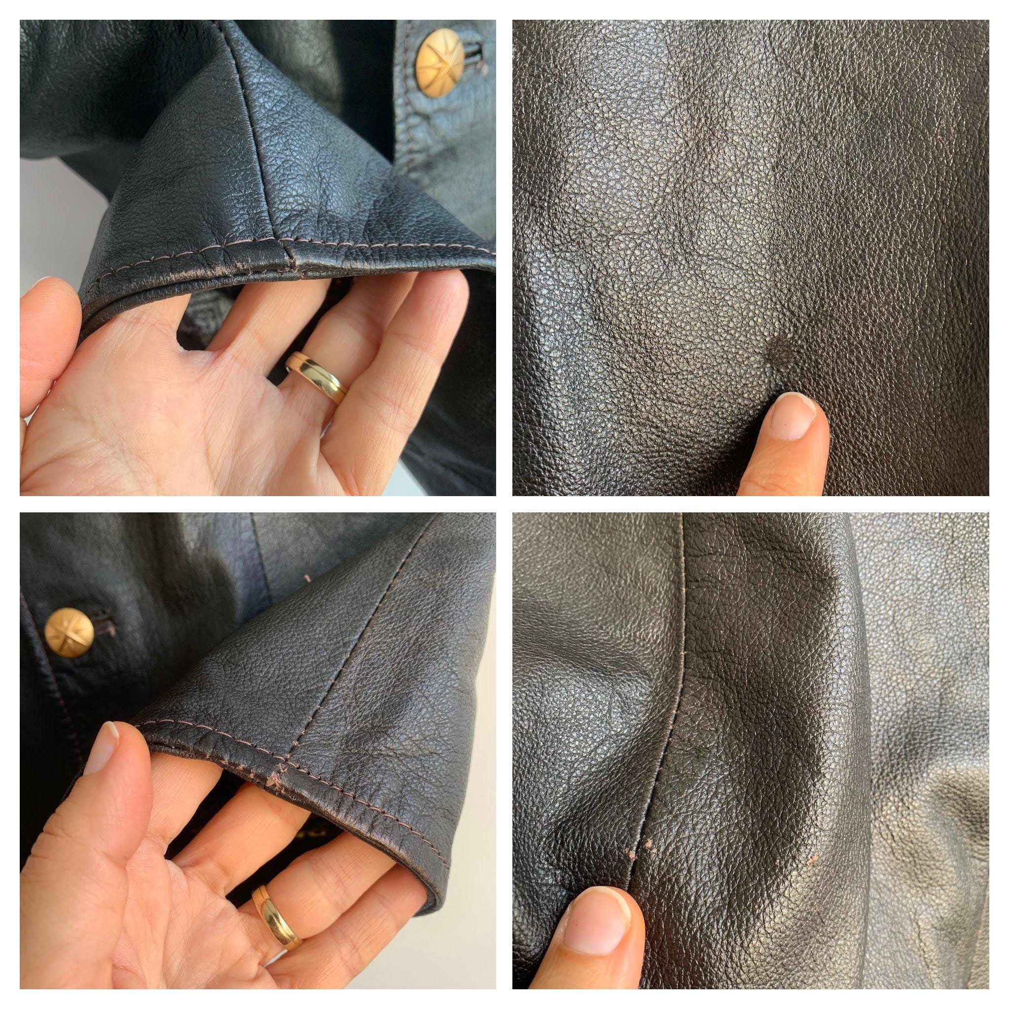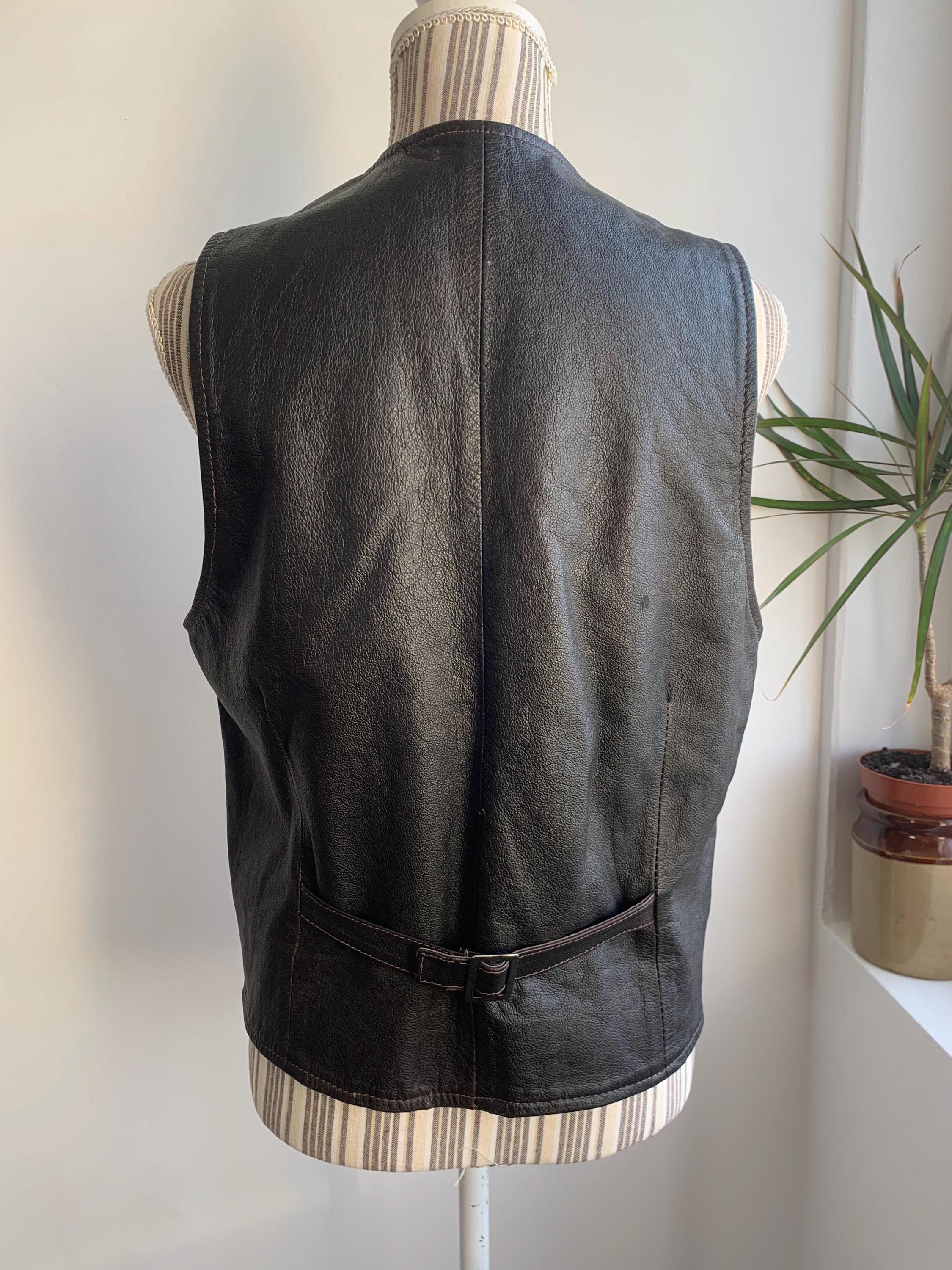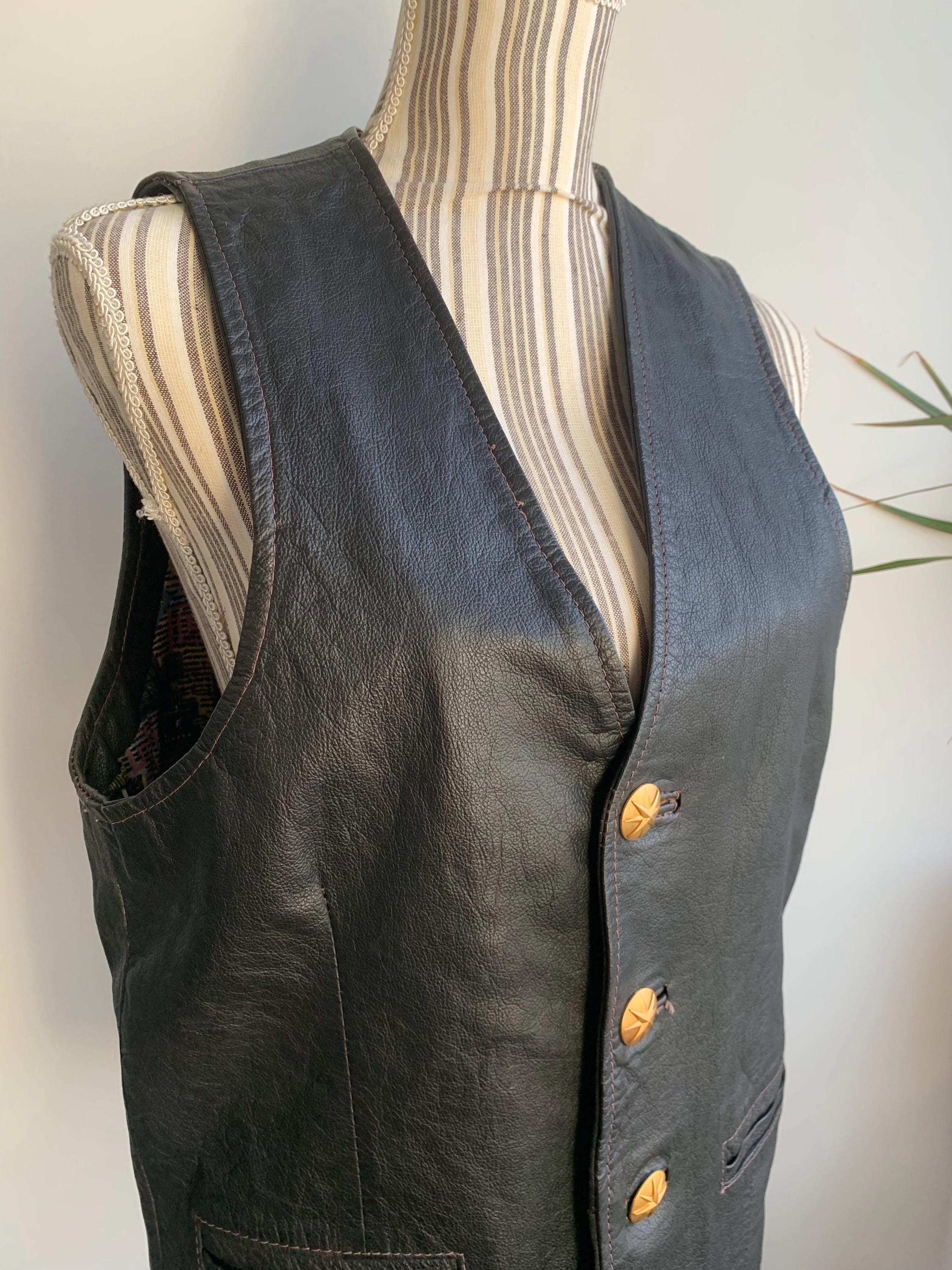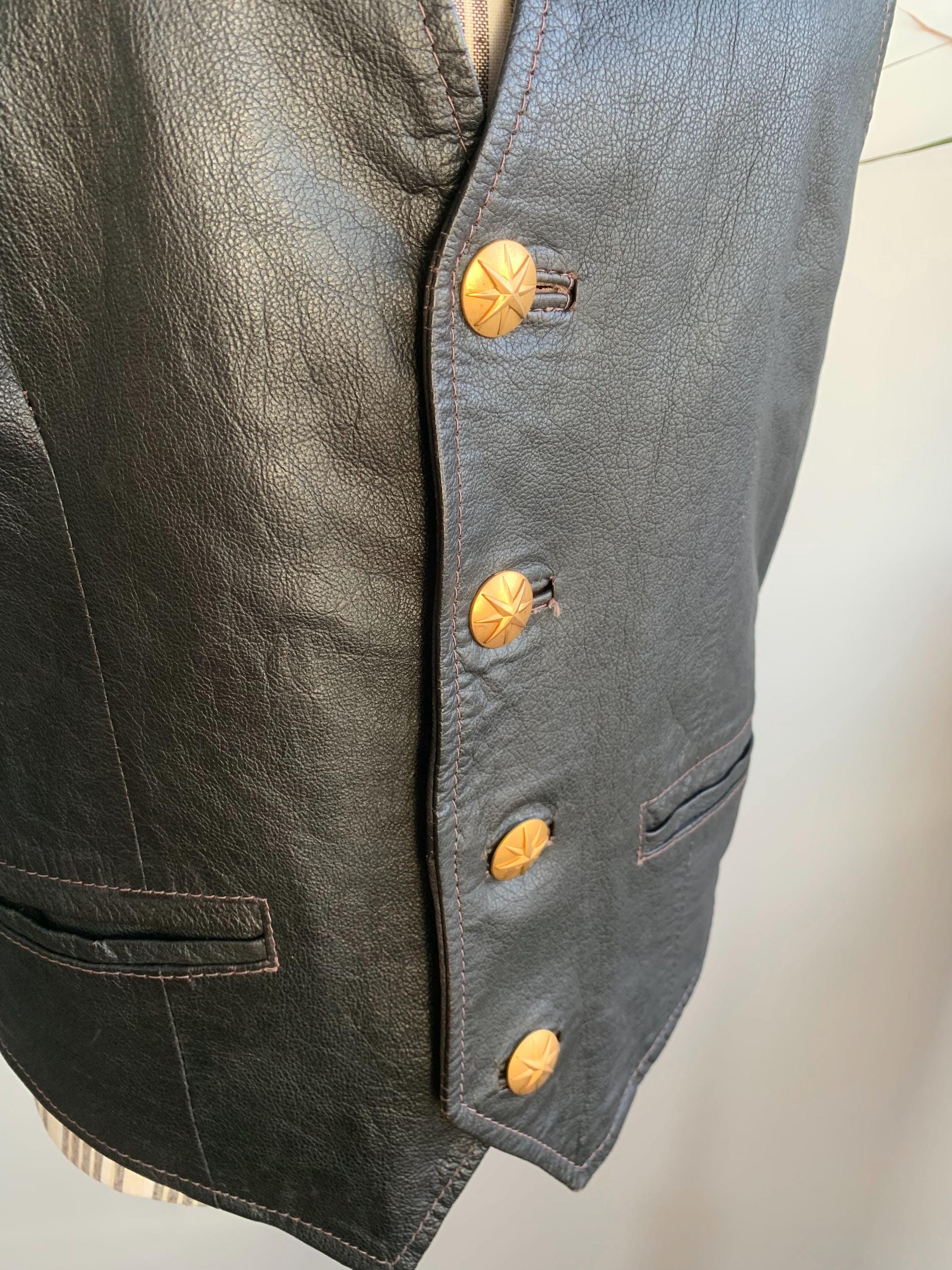 This is a vintage deep dark brown almost black leather vest for men with button front closure size M. This biker motorcycle vest is made of very dark brown genuine leather. This leather button up vest is made of soft leather with two pockets. It has a button-up front closure with gold star buttons. Perfect leather waistcoat for wearing on the road or at a motorcycle event. This vest will add a stylish touch to any outfit. This rocker leather vest is so versatile, you can wear it in so many different ways. Wear it over a basic tshirt for a more casual look or pair with a collared button up shirt for a western cowboy look. This brown leather vest is size M. Please check the measurements below.