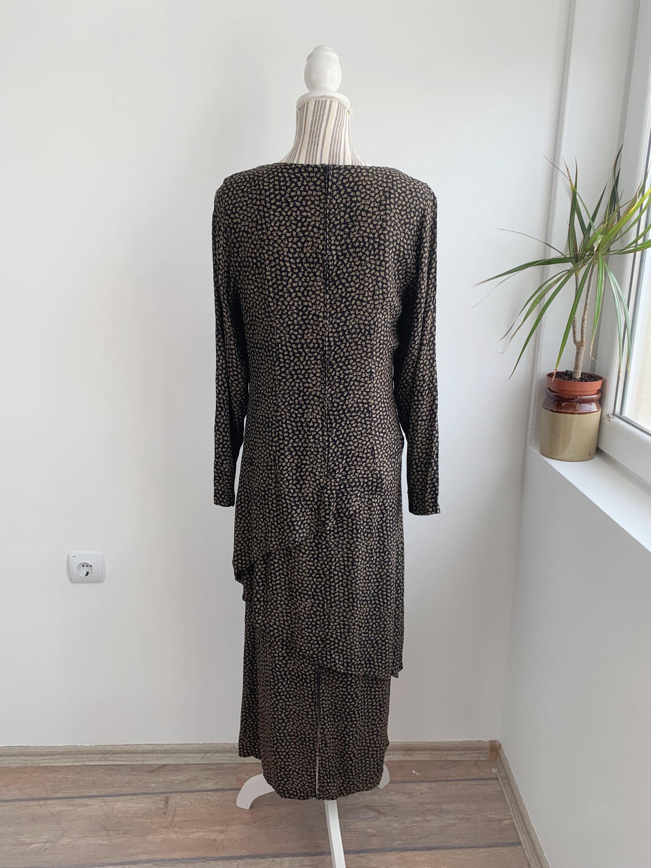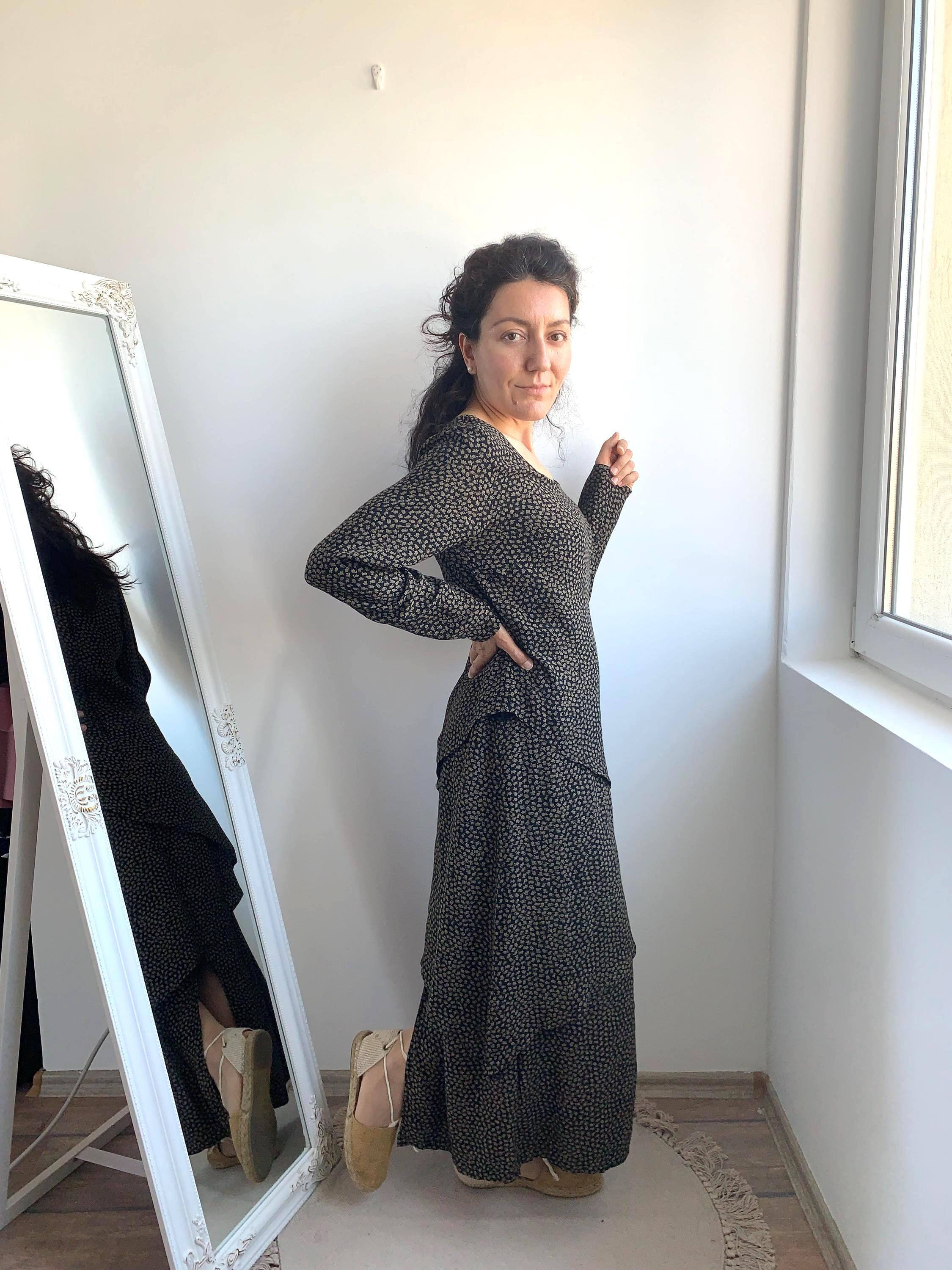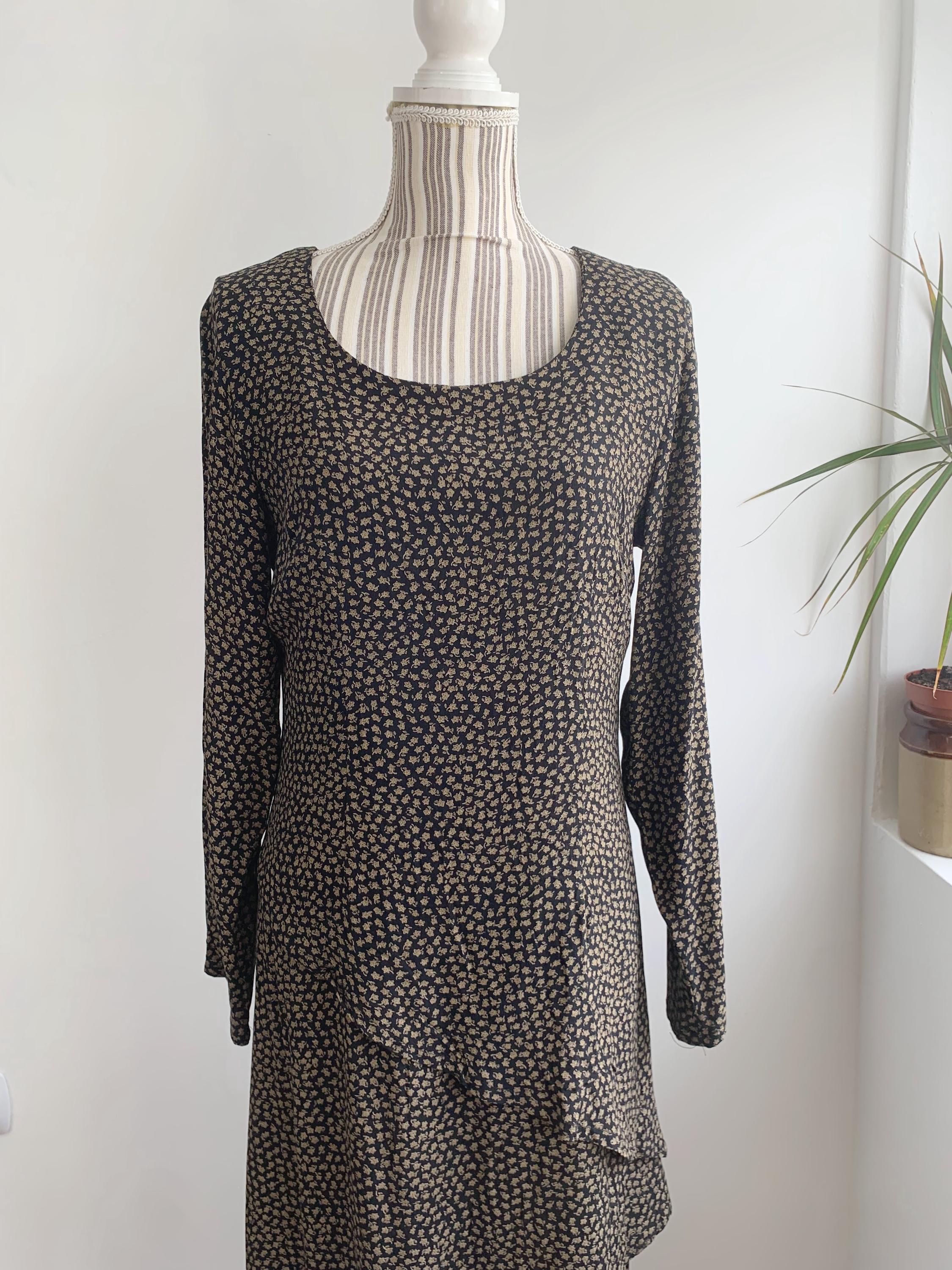 This is a vintage 90s ankle long maxi dress with asymmetrical layering and front and back slit. This long sleeve maxi dress has ditsy floral print - camel flowers on black background. This grunge maxi dress is size 38, which fits like S.