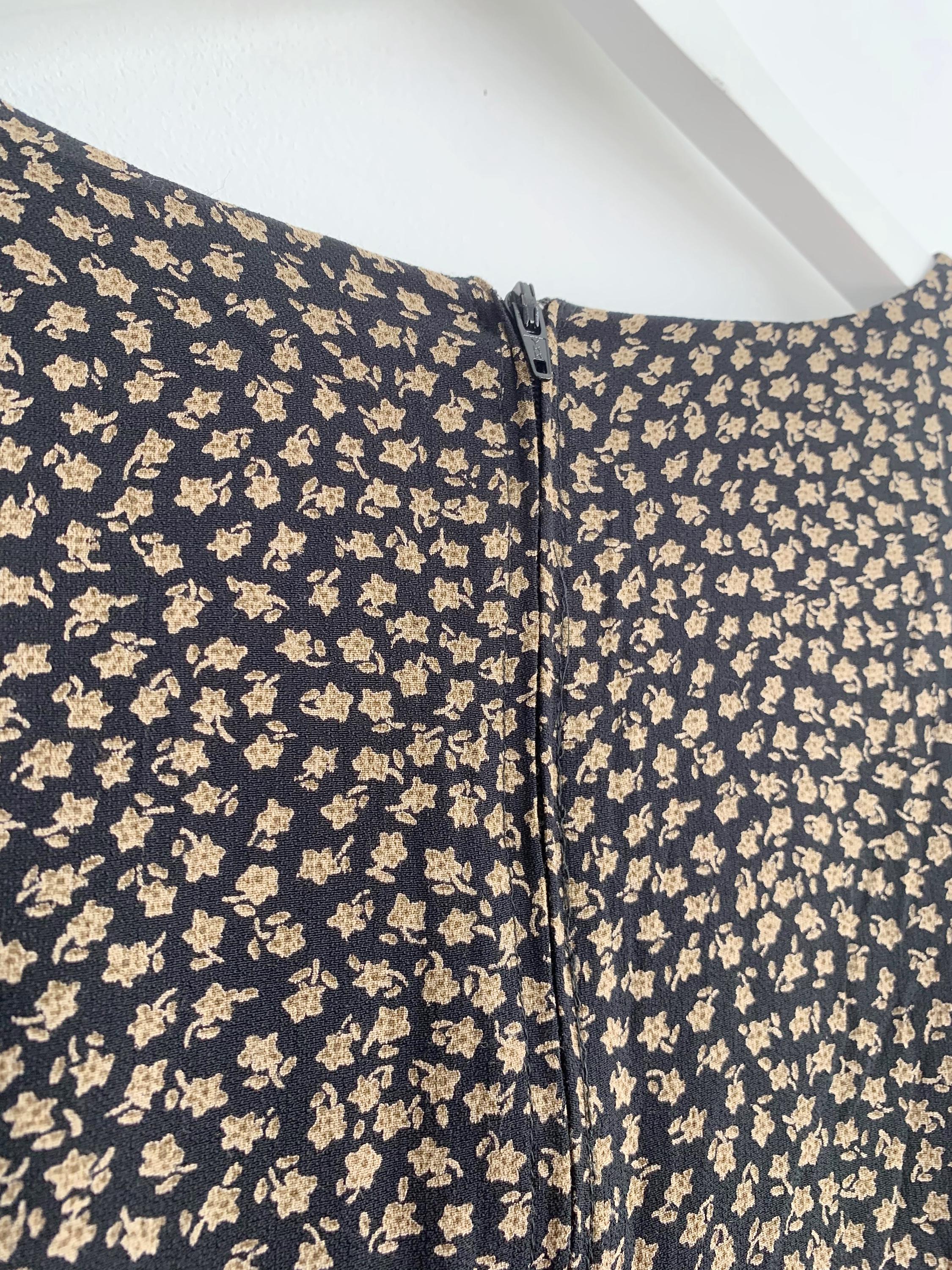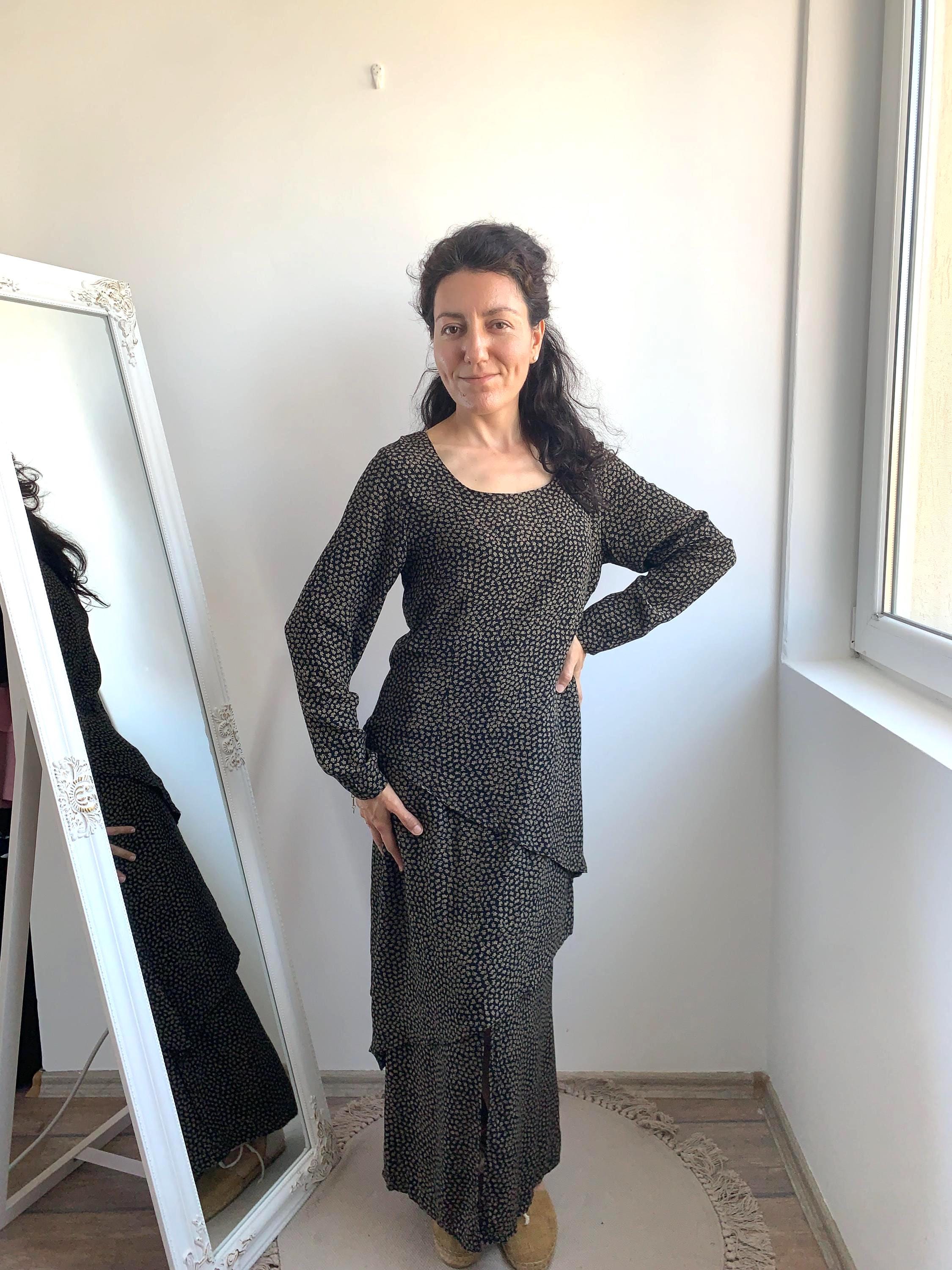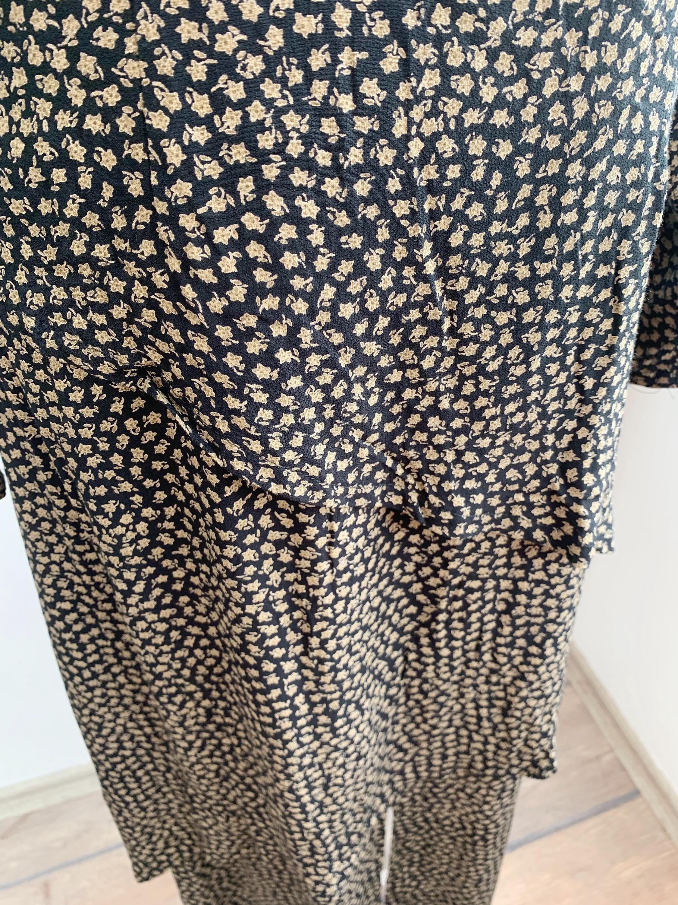 This is a vintage 90s ankle long maxi dress with asymmetrical layering and front and back slit. This long sleeve maxi dress has ditsy floral print - camel flowers on black background. This grunge maxi dress is size 38, which fits like S.