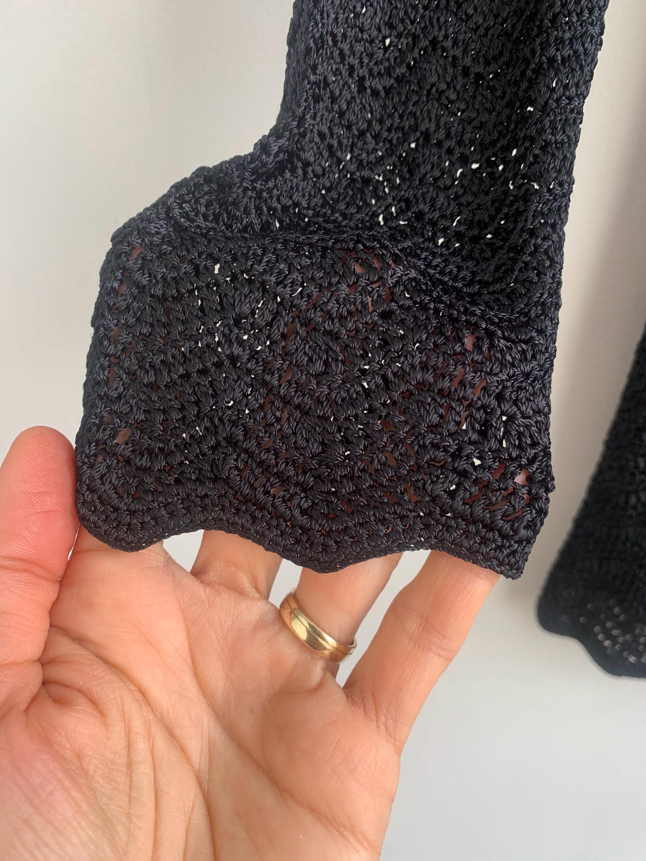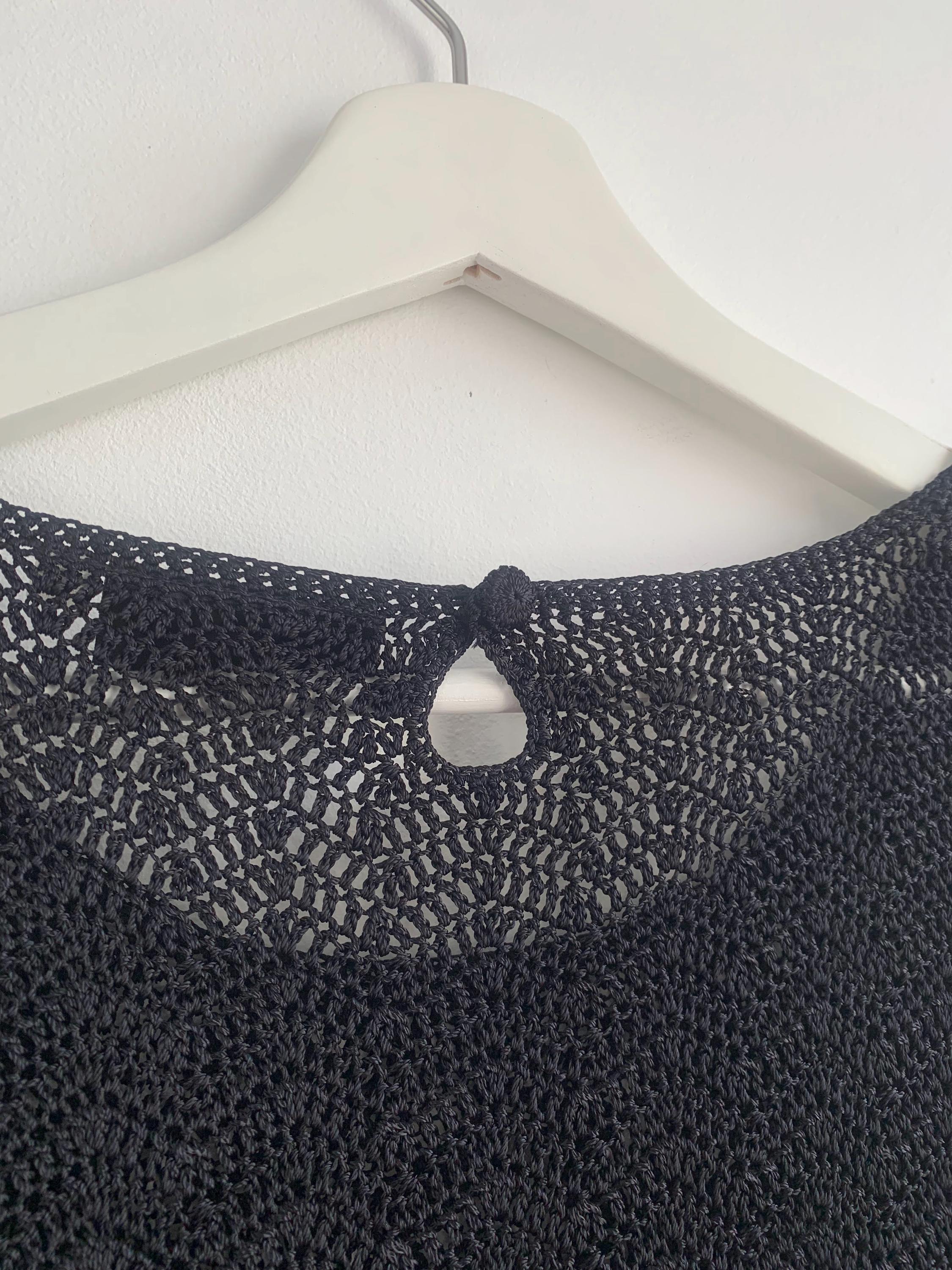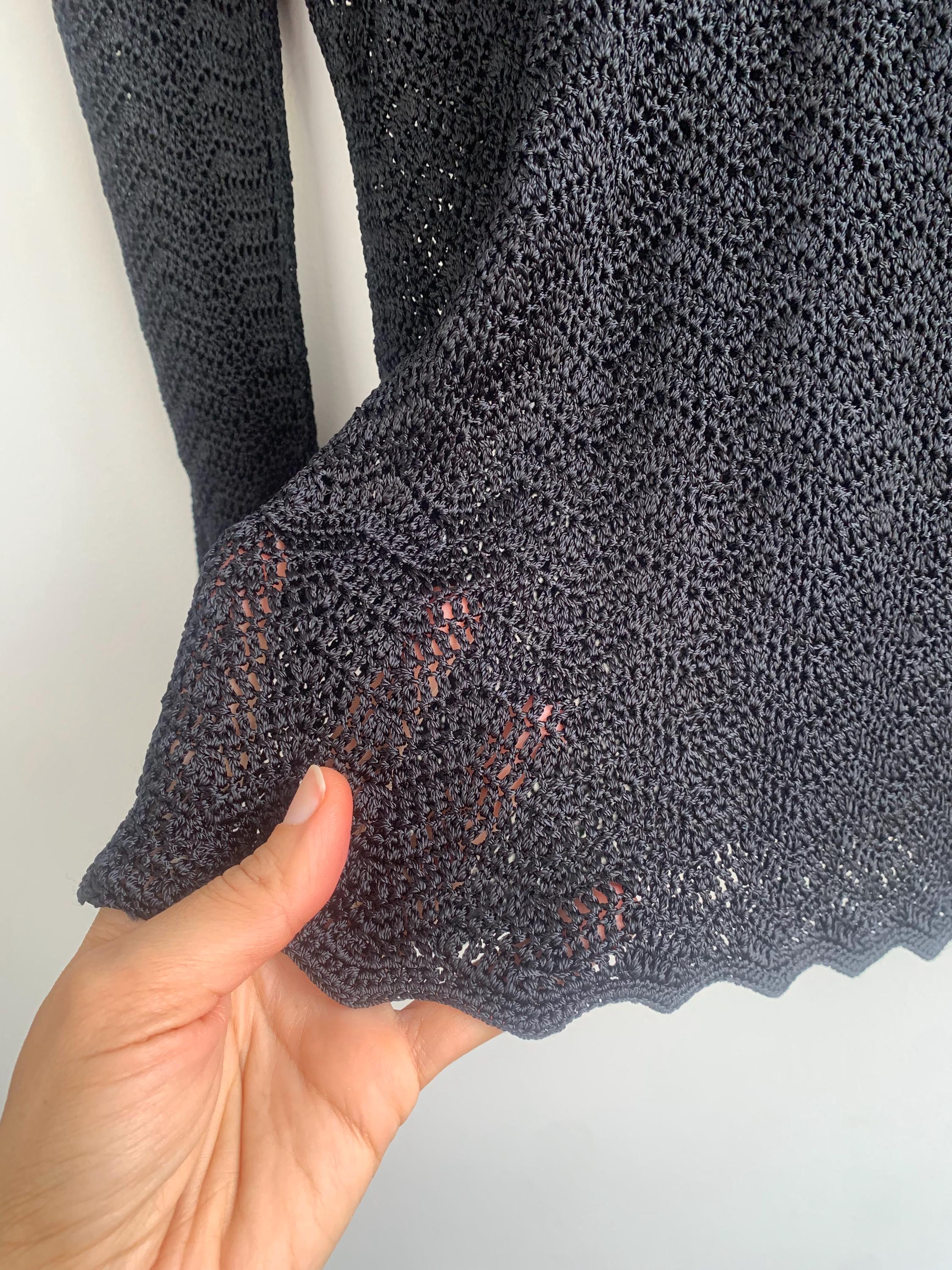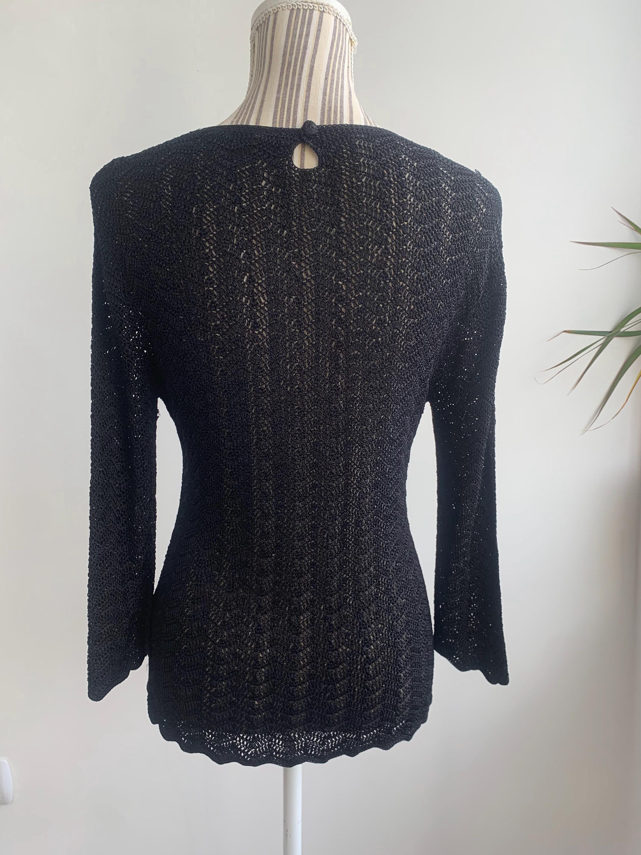 This is a pretty black lace pullover sweater with chevron pattern, scoop neck and button back. This mesh sweater top is made of shiny silky viscose thread in black color. This gorgeous mesh crochet sweater has 3/4 sleeves with scalloped edges. It would best fit size M or L. Please check the measurements below.