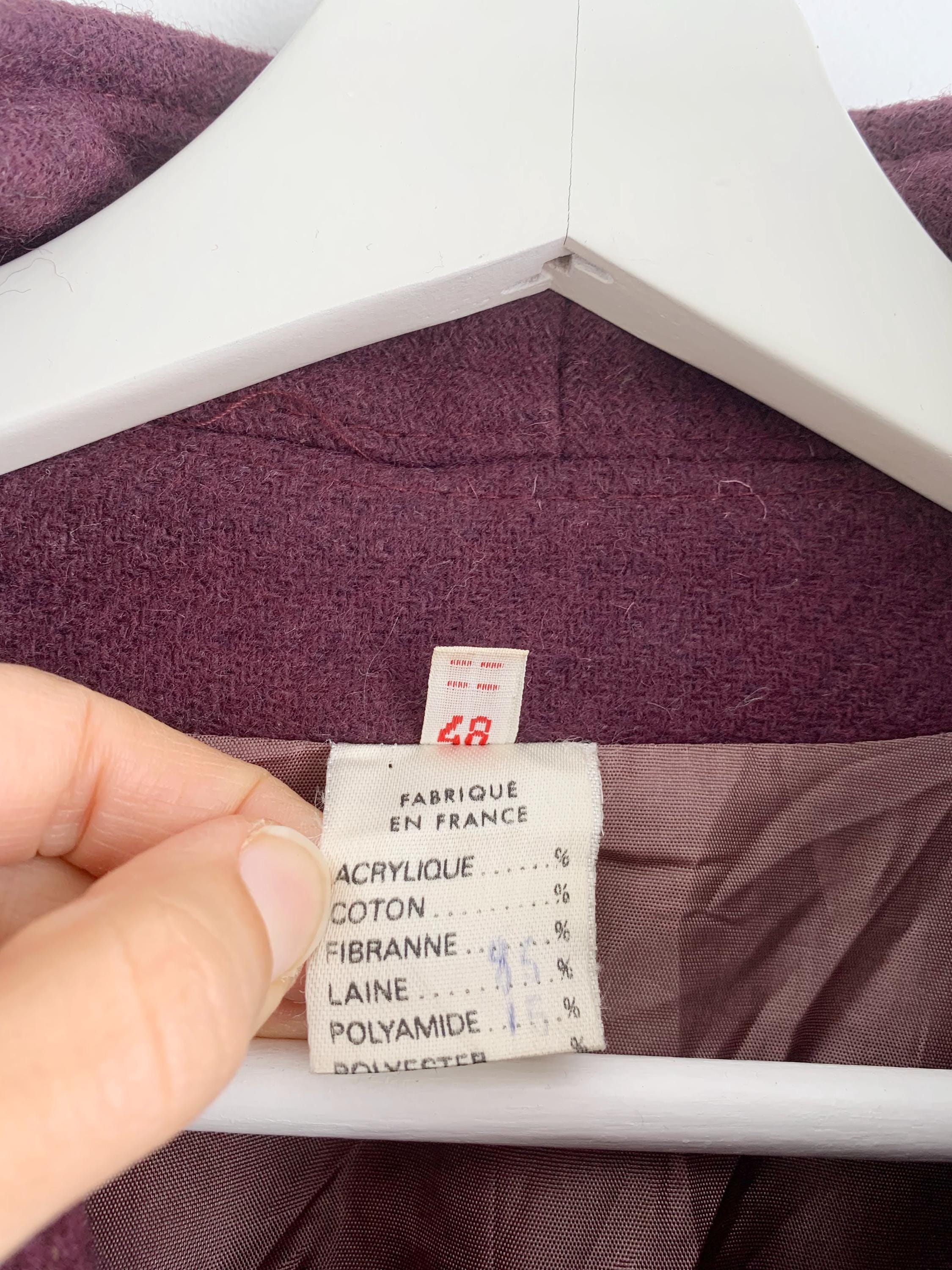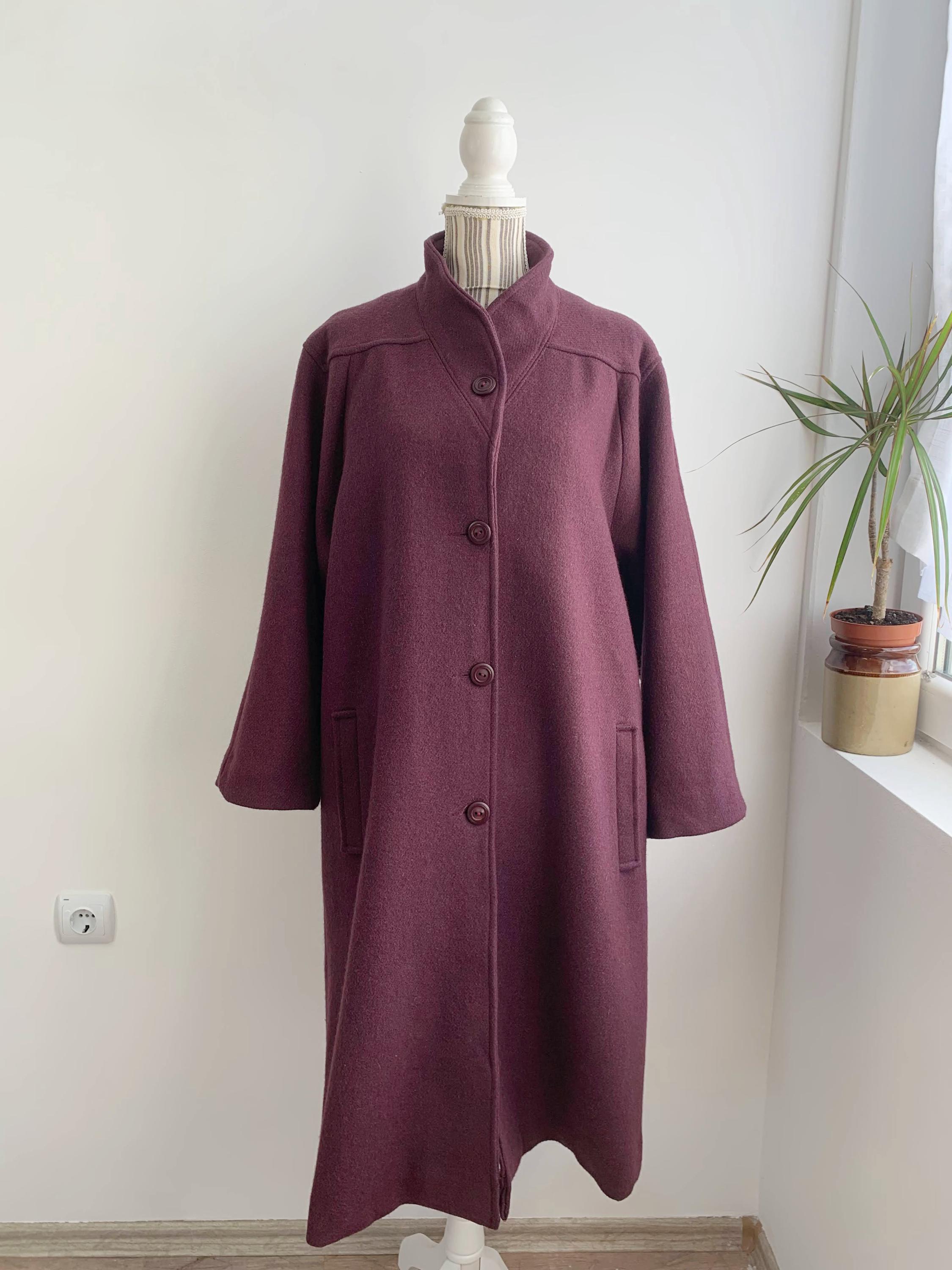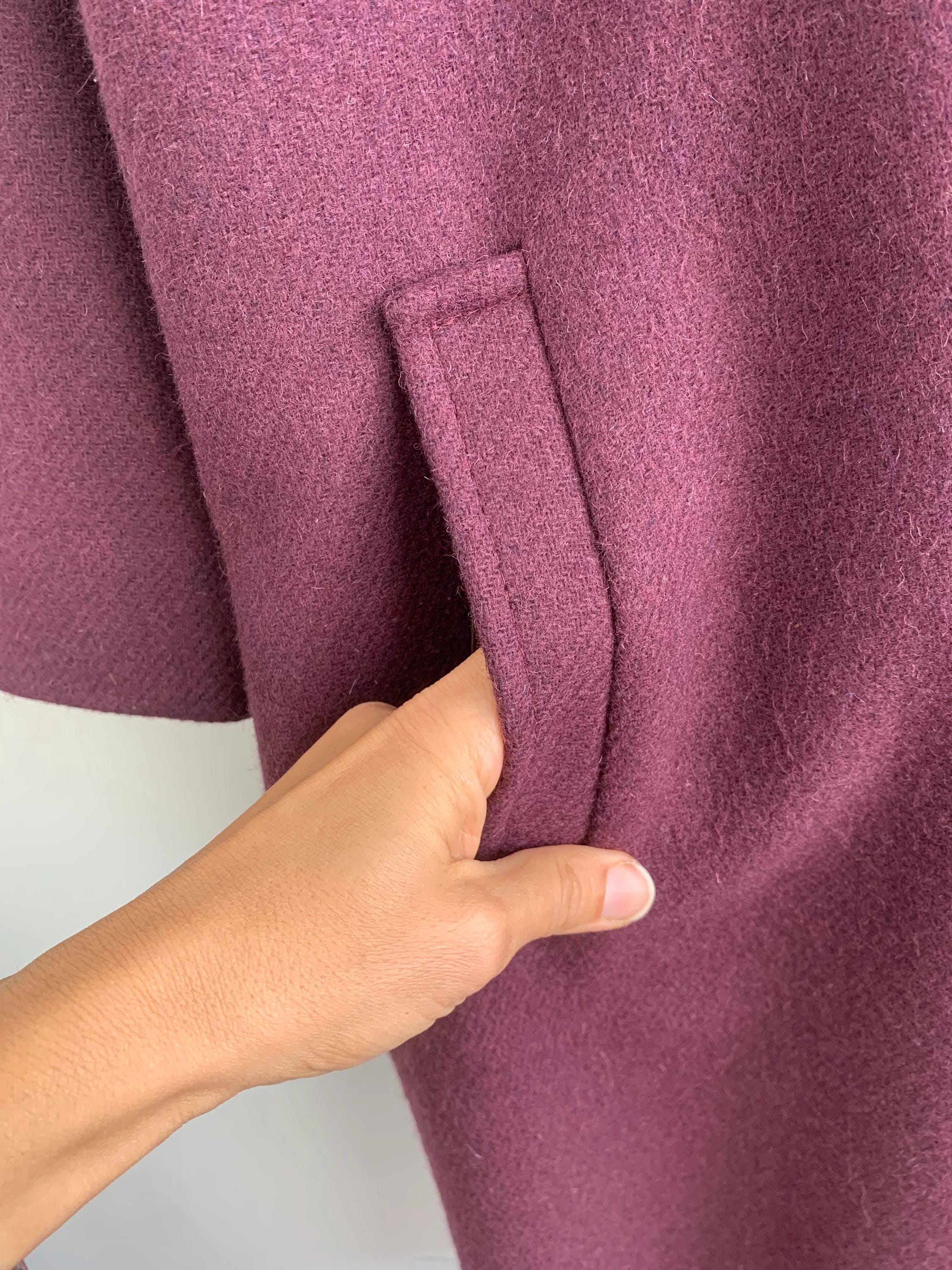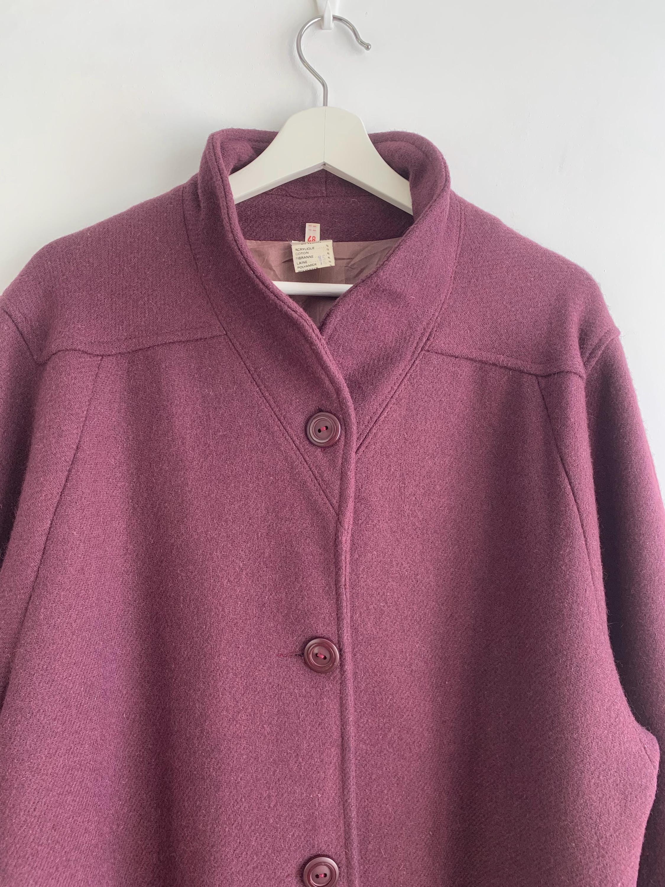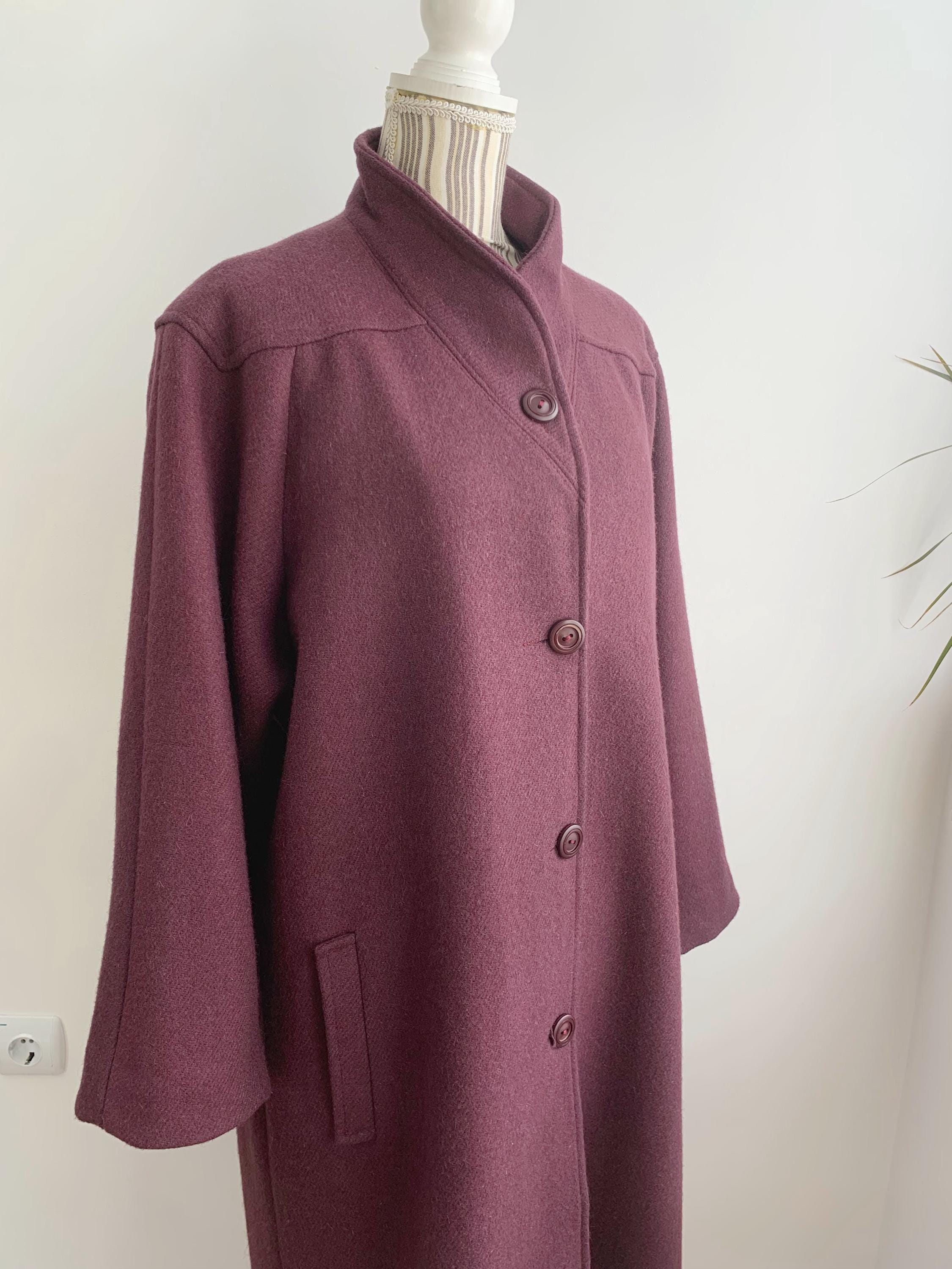 This is s beautiful vintage 80s eggplant purple classic wool coat with midi length, loose oversized fit and A line silhouette. This beautiful warm winter coat was made in France. The size marked is 48, it fits like size XL.