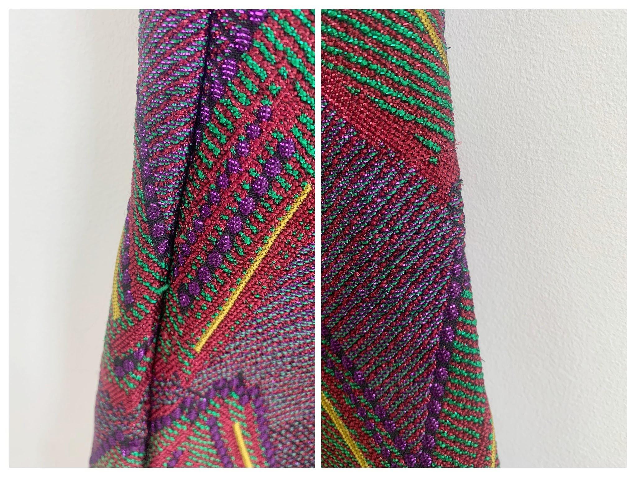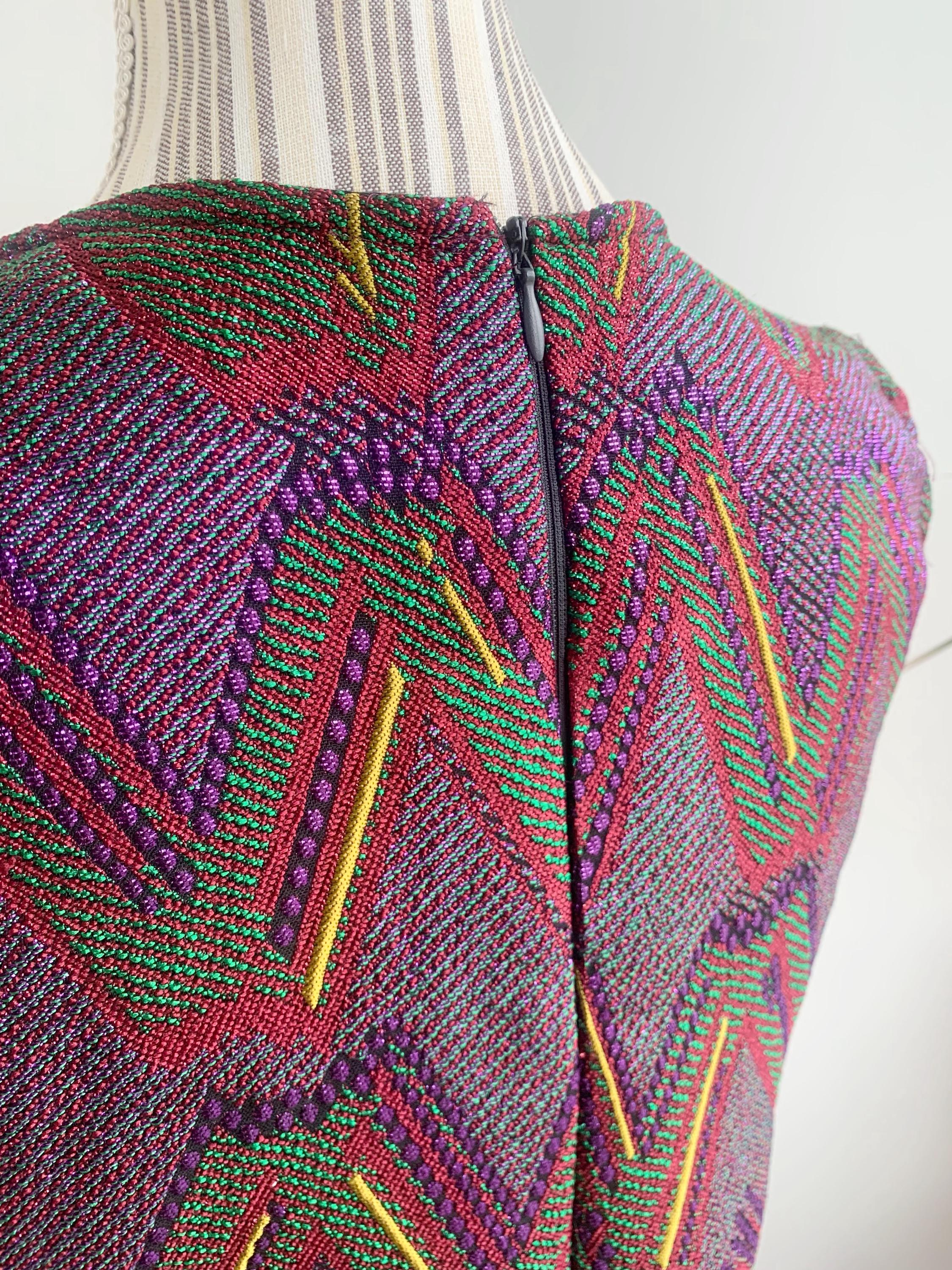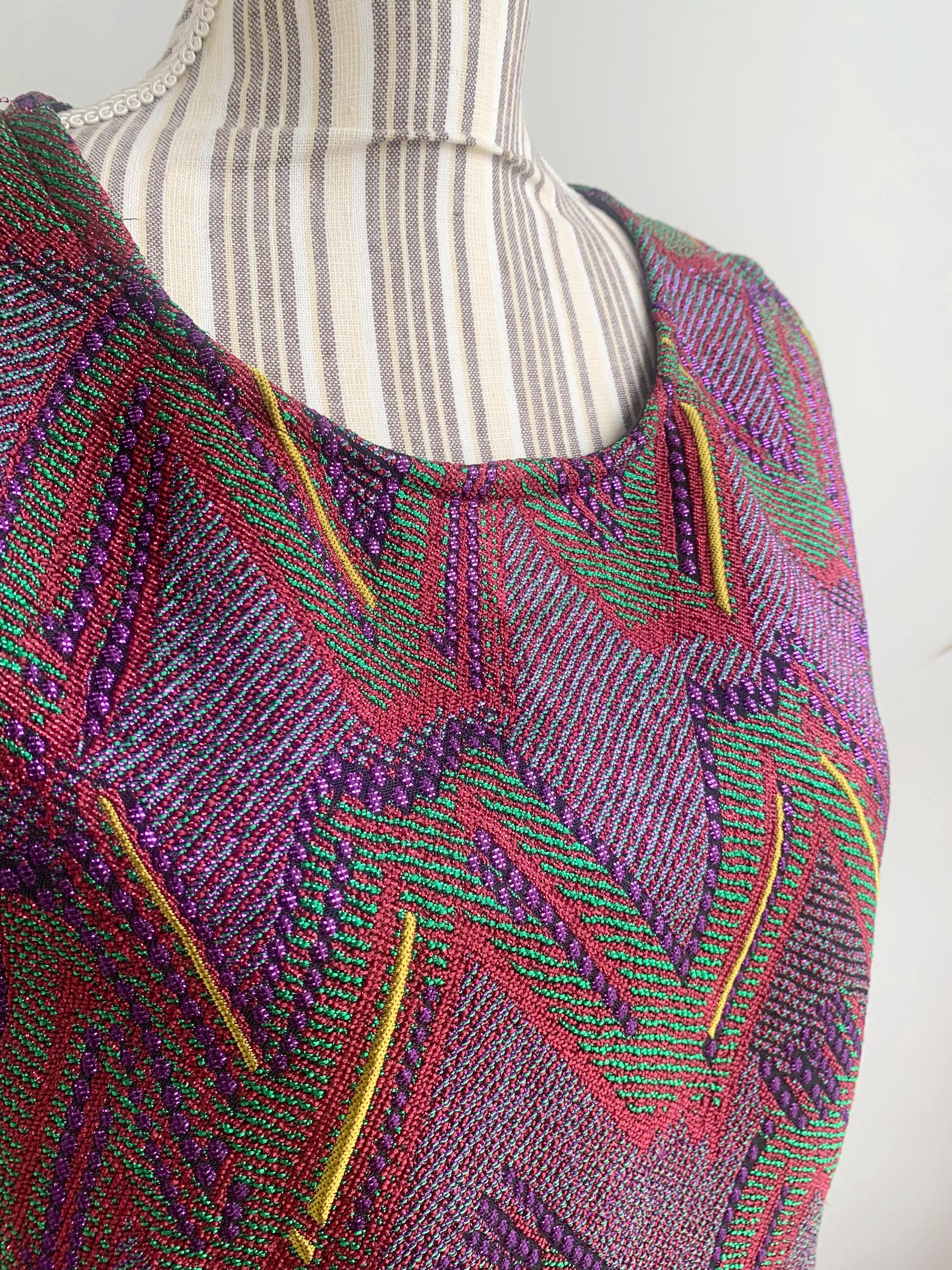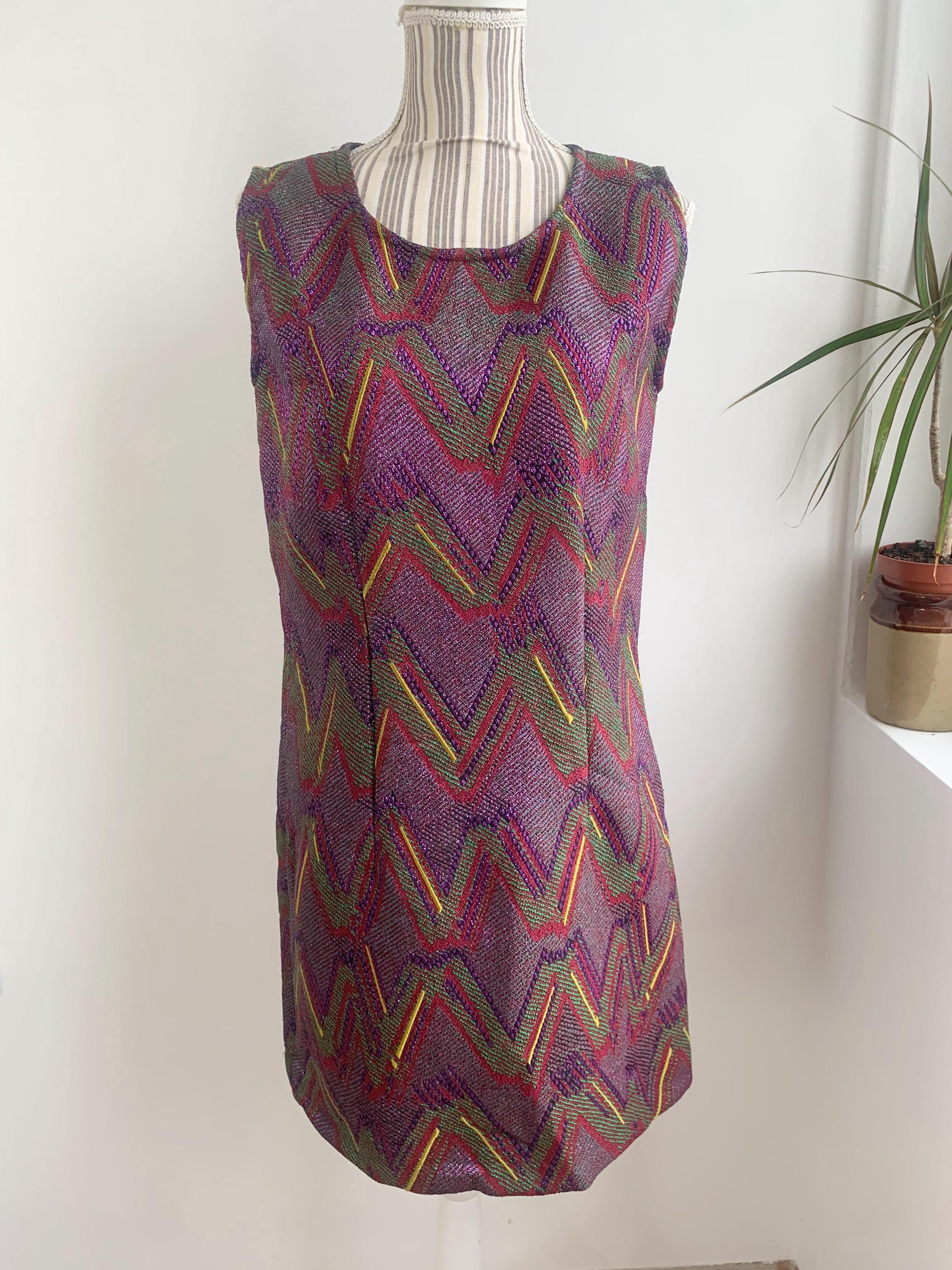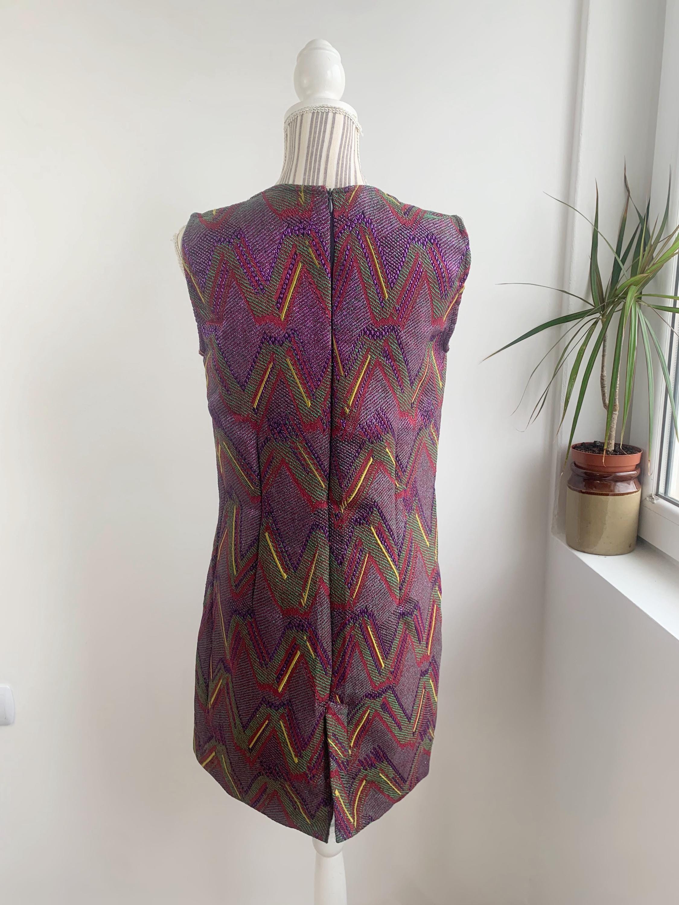 This is a vintage 80s pretty retro mod cocktail party shiny metallic dress with zip up back and no lining. It is made of colorful shiny lame fabric with no lining underneath. As this retro disco dress was handmade there is no size marked. It fits like size M/L.