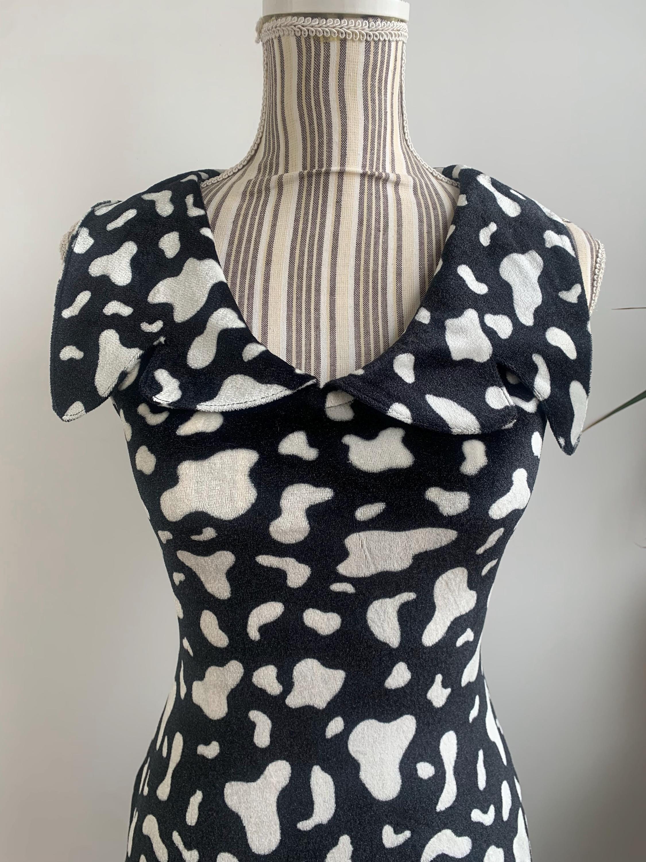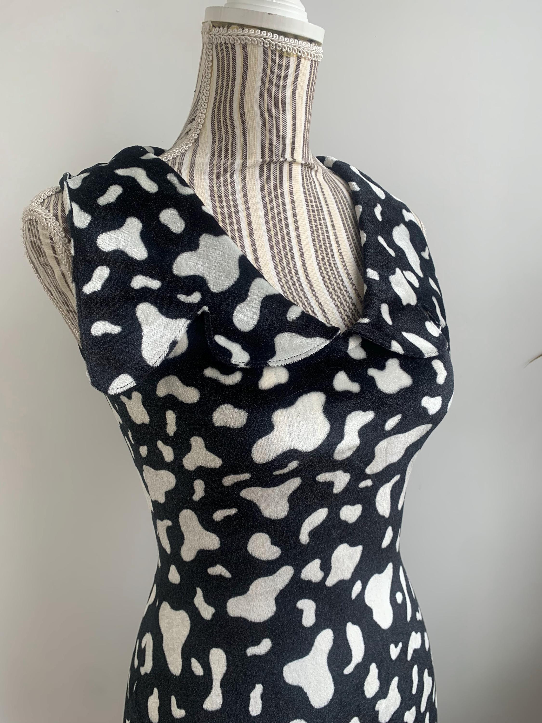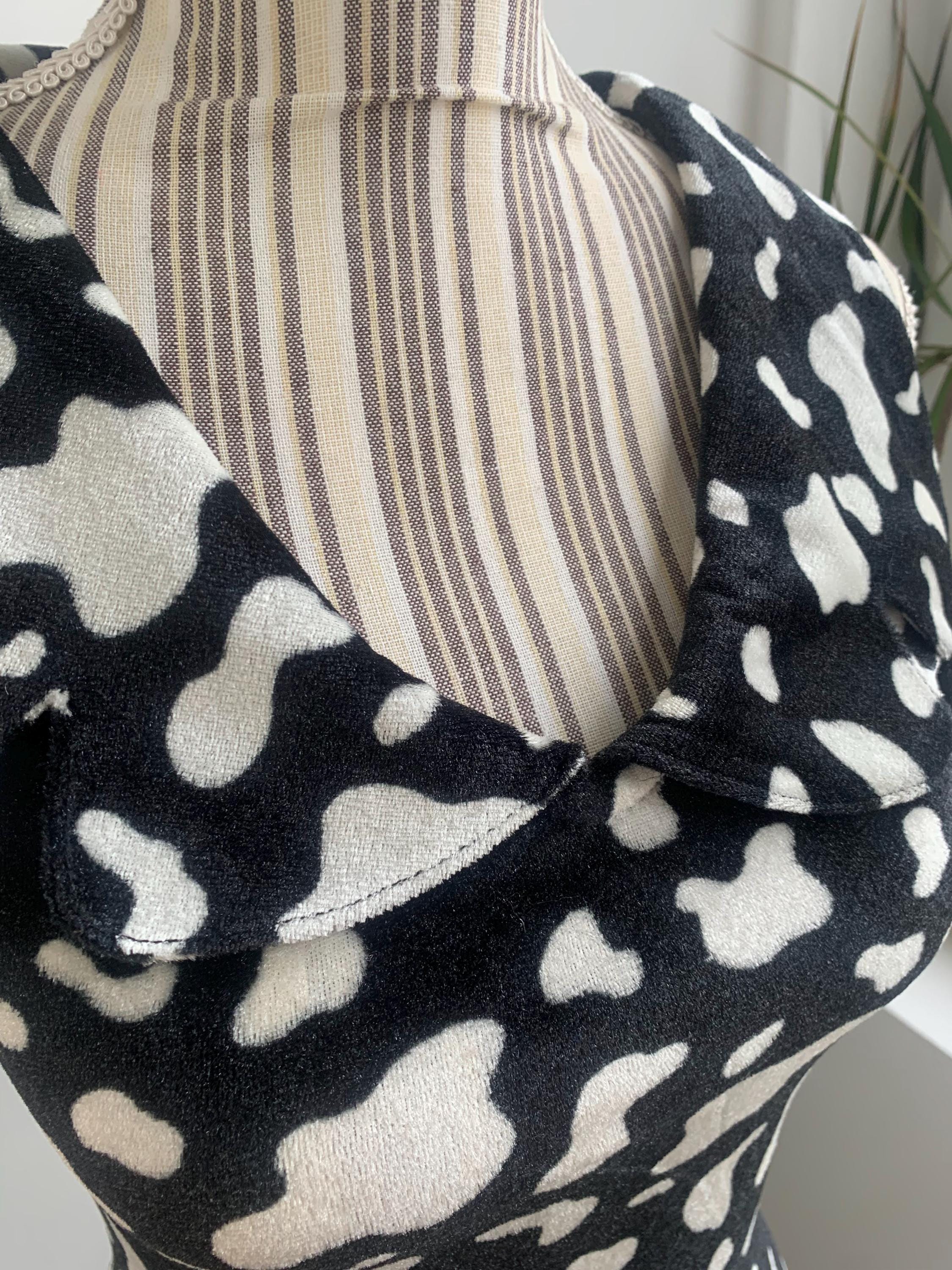 This is a beautiful black and white abstract print short stretchy fitted bodycon dress with lovely retro style collar. This pullover mini dress is made of soft and stretchy plush velvet fabric. This retro style bodycon dress has no closure, it is a pullover dress. This stretchy mini dress was handmade, there is no tag or label. It fits like size XS. Please check the measurements below.