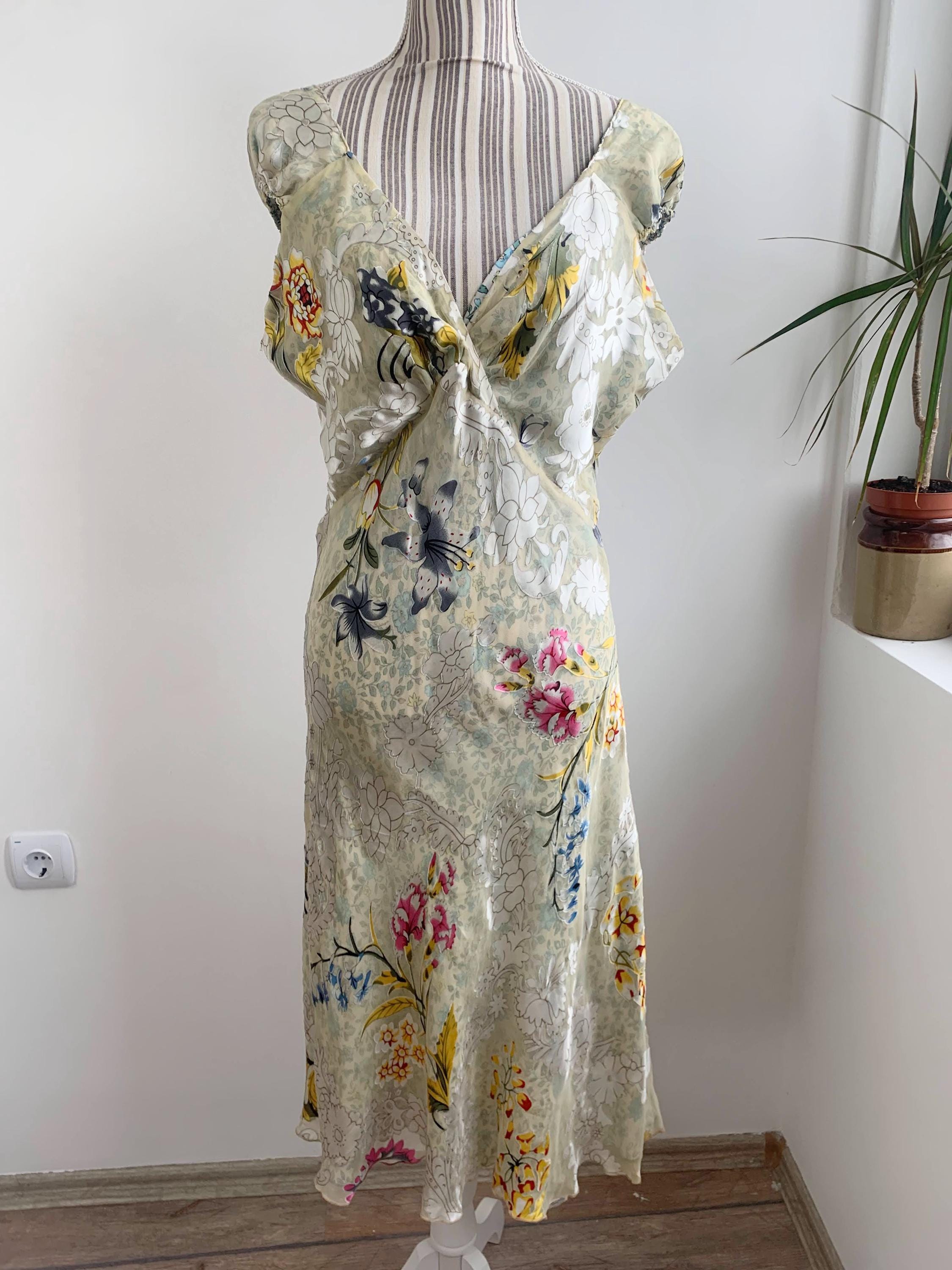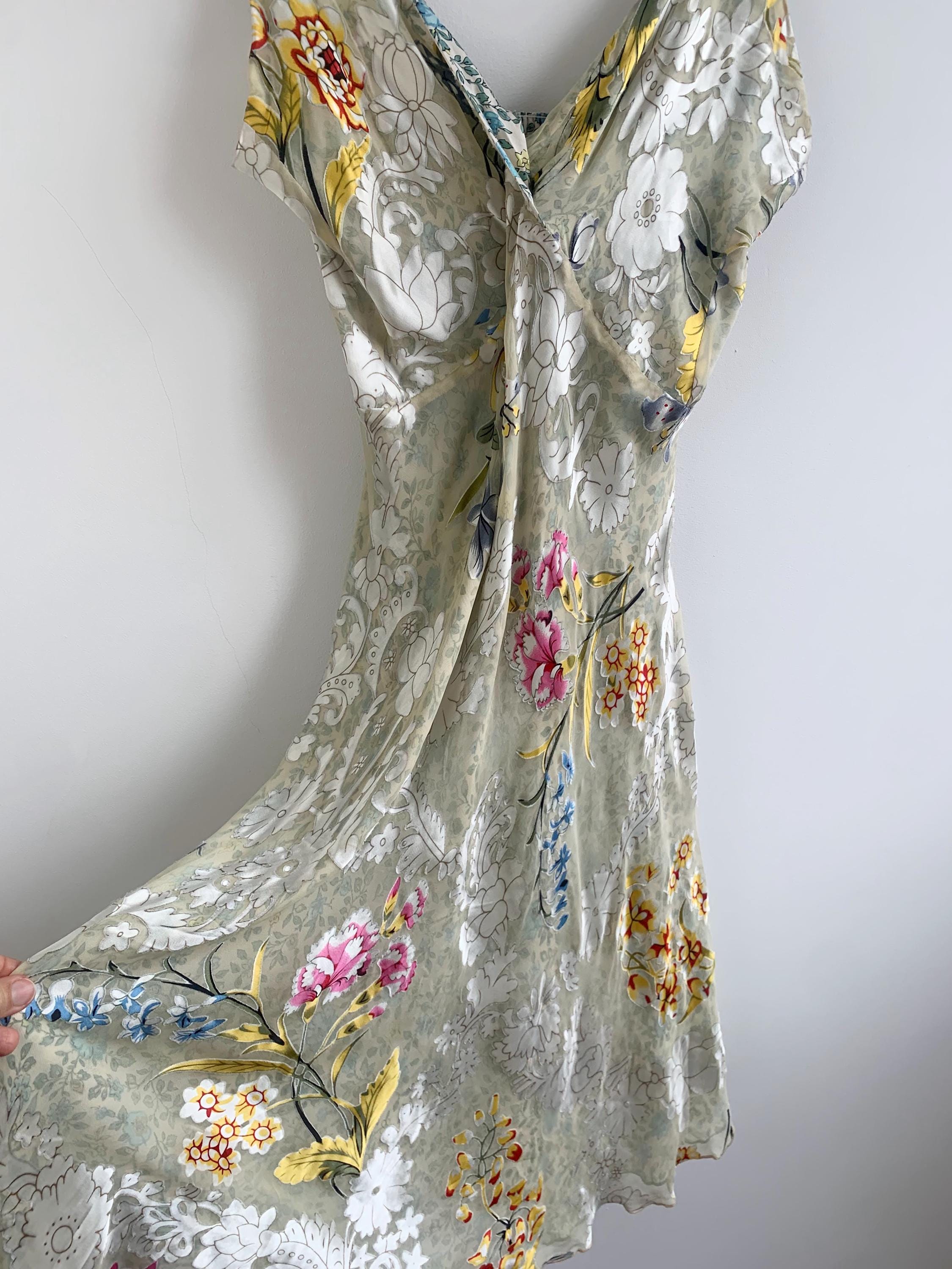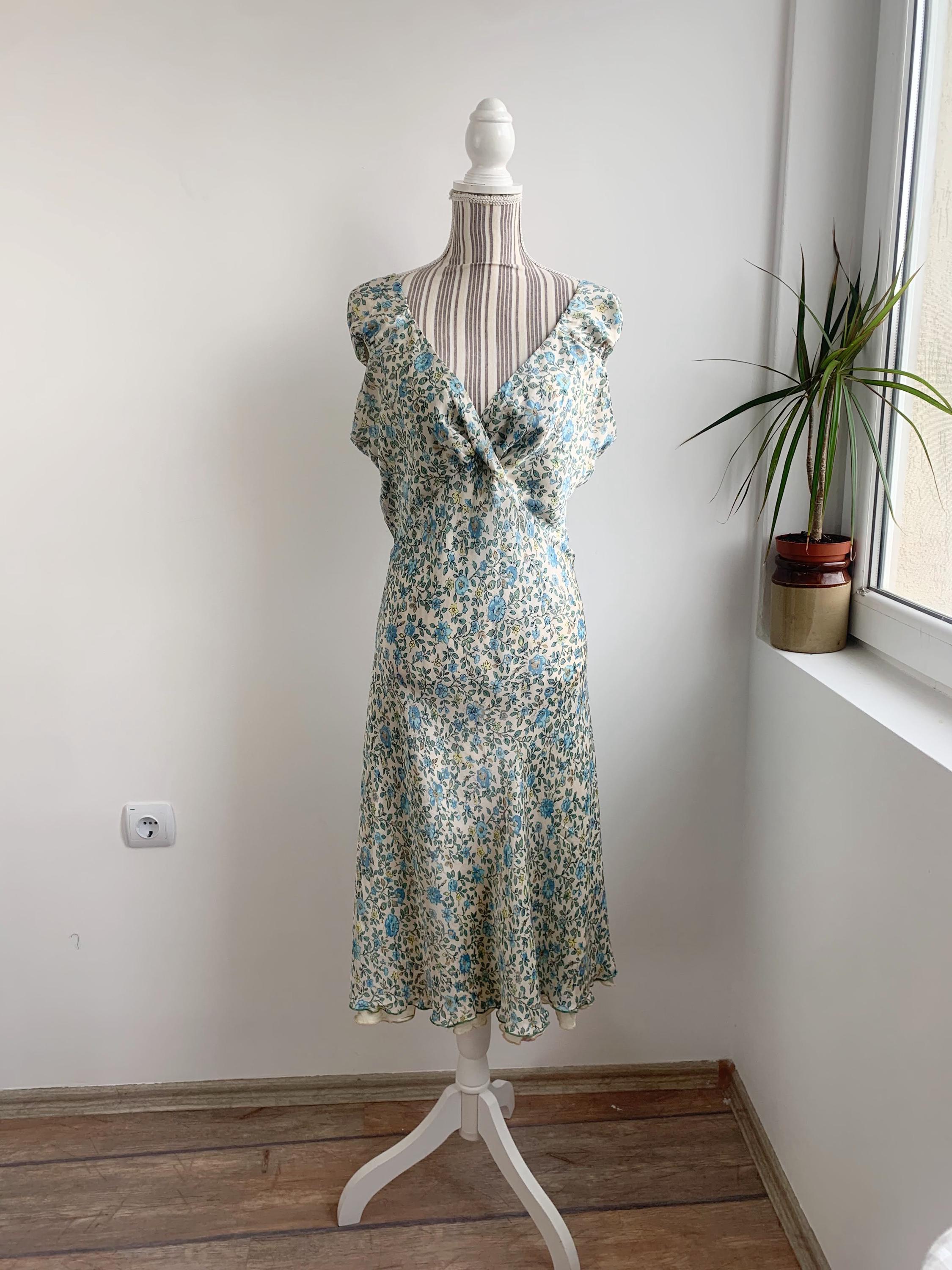 This is a beautiful vintage Y2K double sided silk dress by Tone Barker. This luxury versatile silk dress has v neck and elastic back with flared midi skirt. One side is sprinkled with small blue flowers, the other side is in delicate pastel toned jacquard floral print. The size marked is XL. Please check the measurements below