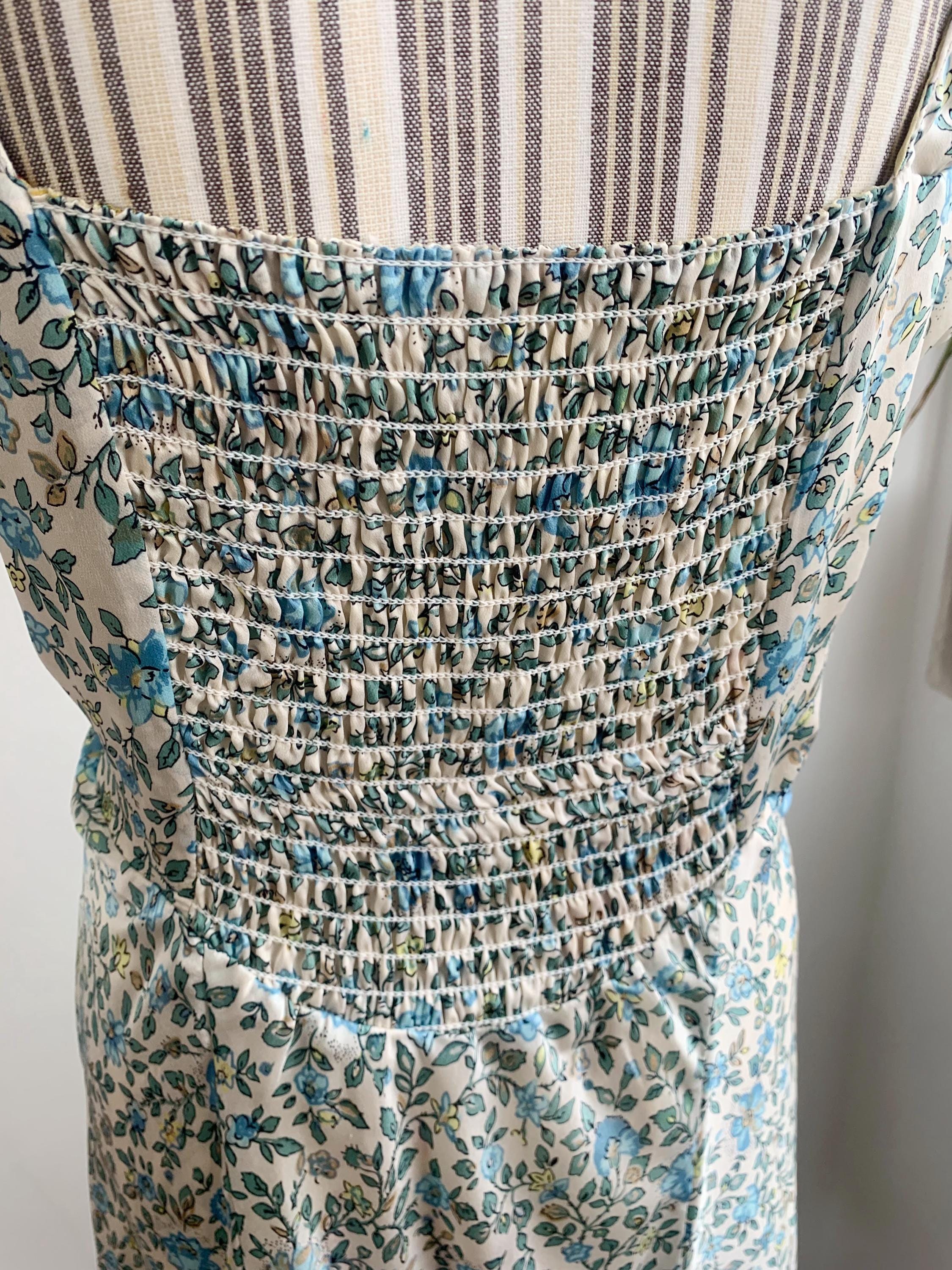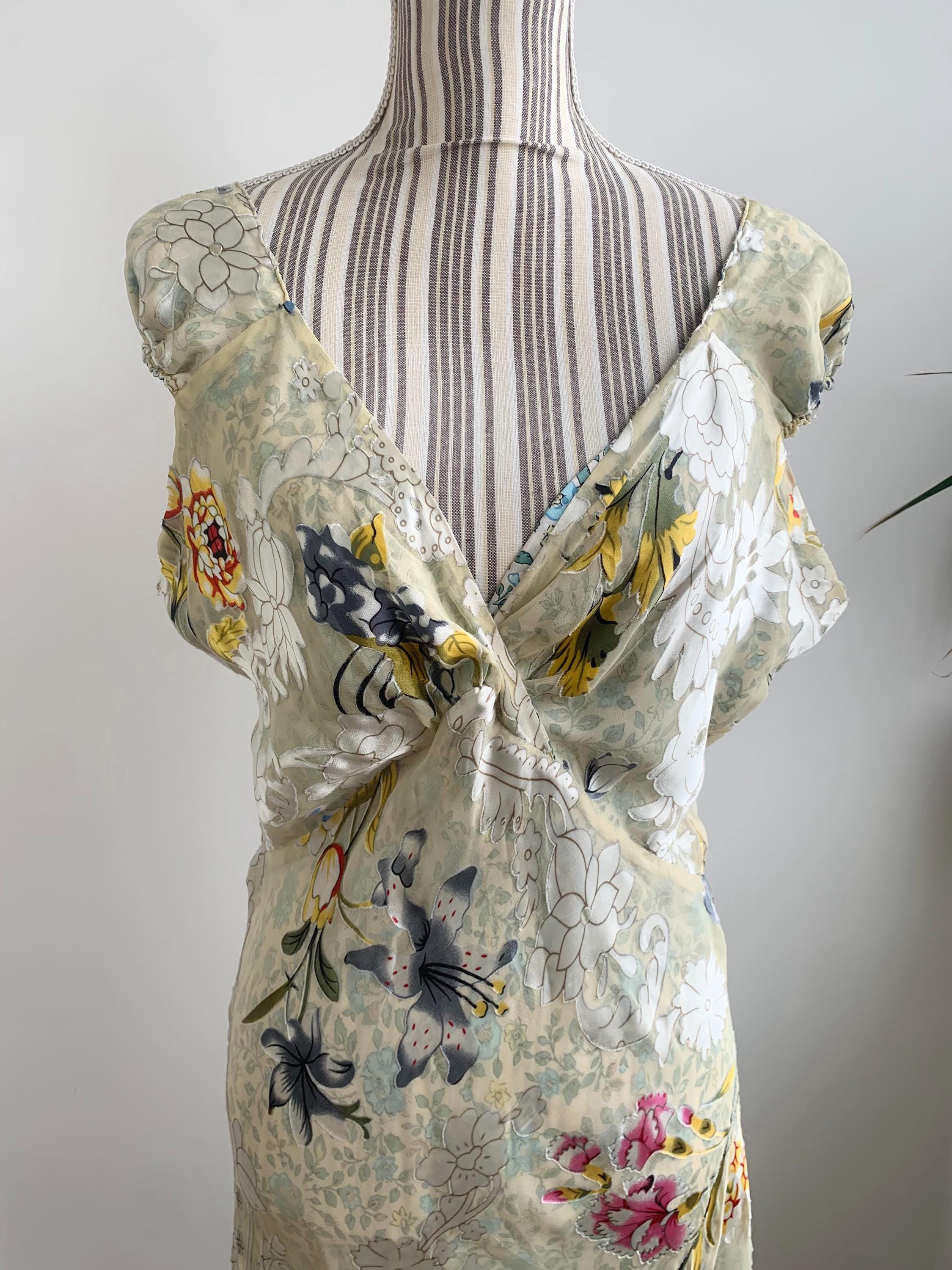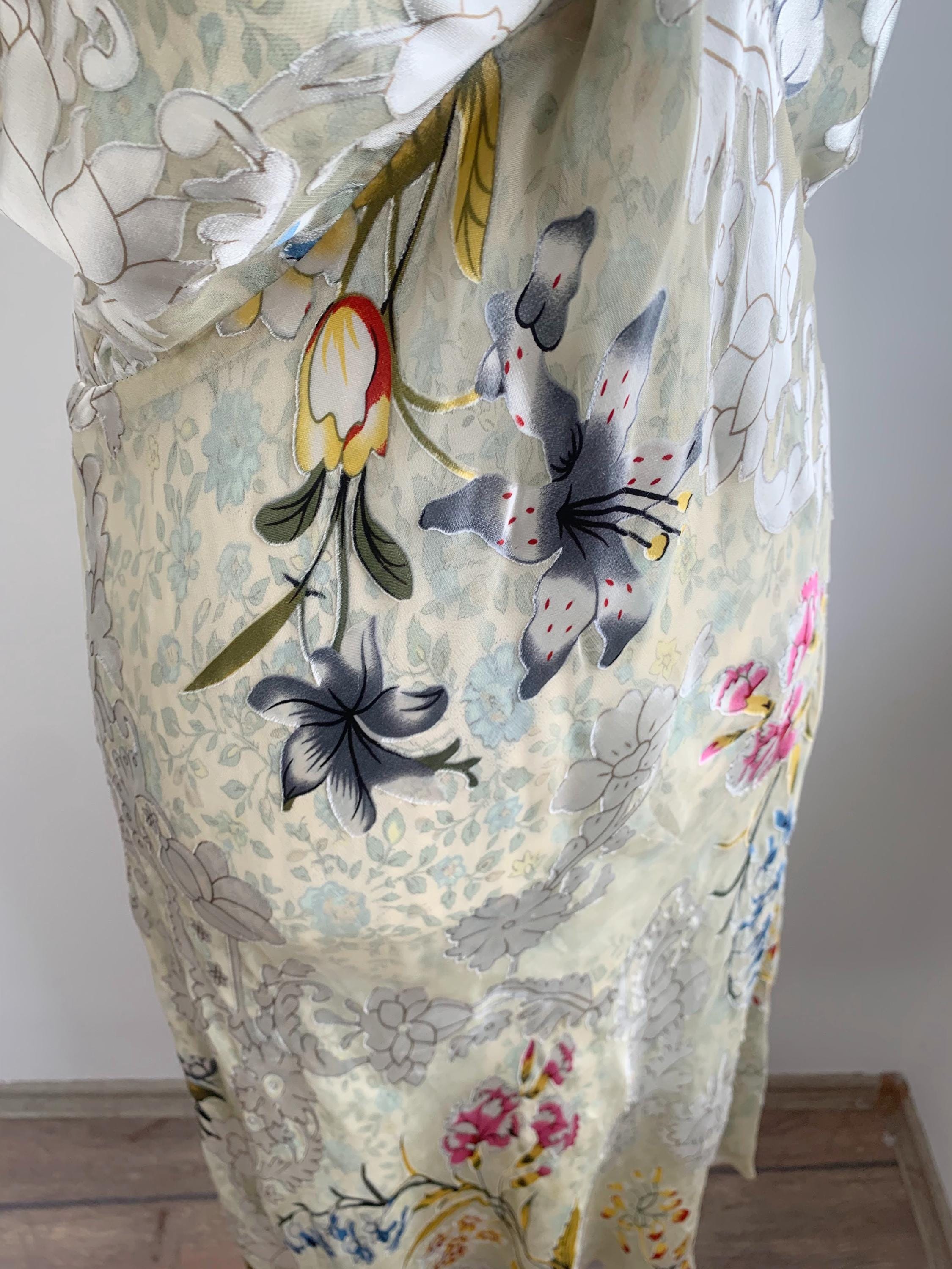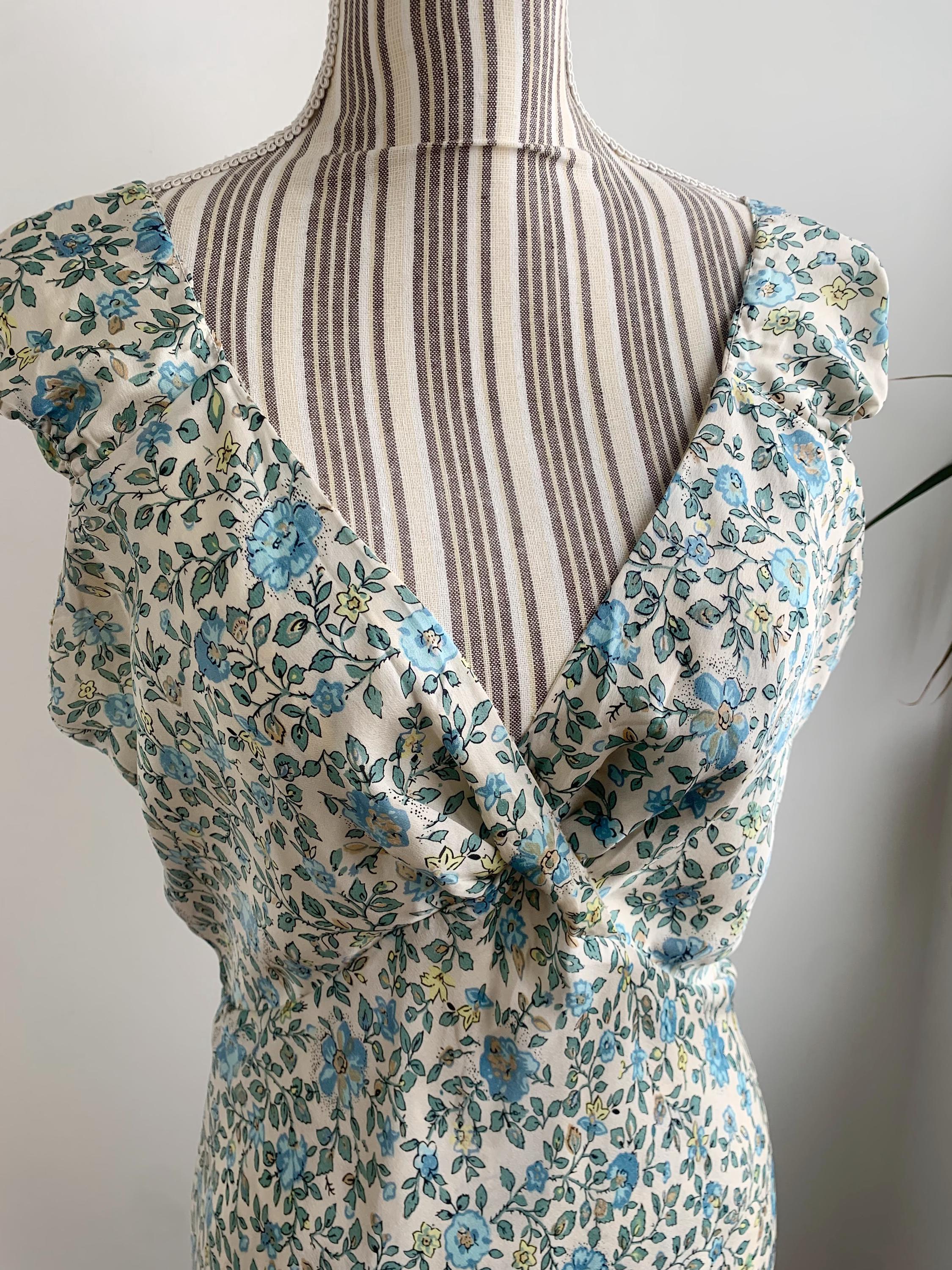 This is a beautiful vintage Y2K double sided silk dress by Tone Barker. This luxury versatile silk dress has v neck and elastic back with flared midi skirt. One side is sprinkled with small blue flowers, the other side is in delicate pastel toned jacquard floral print. The size marked is XL. Please check the measurements below