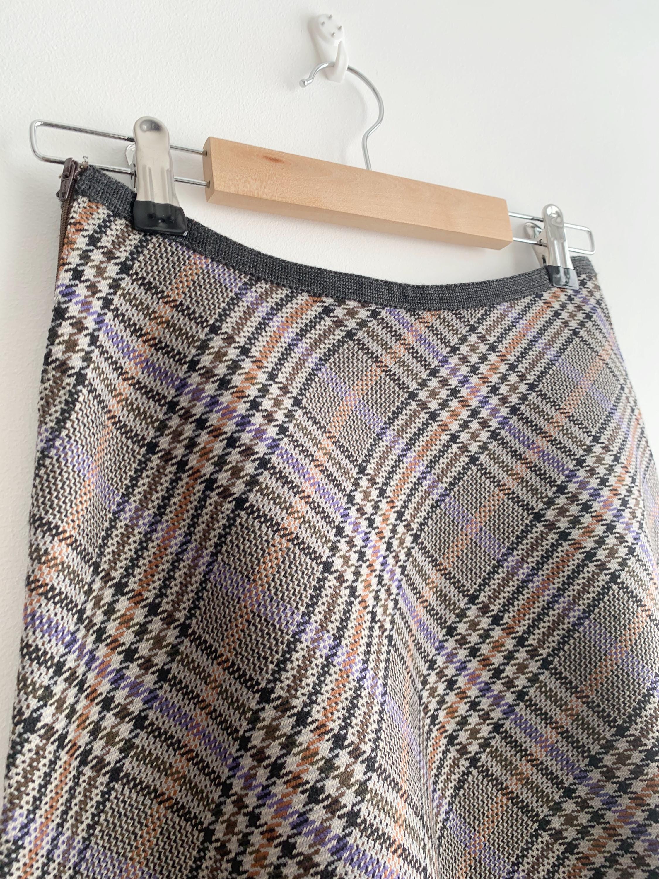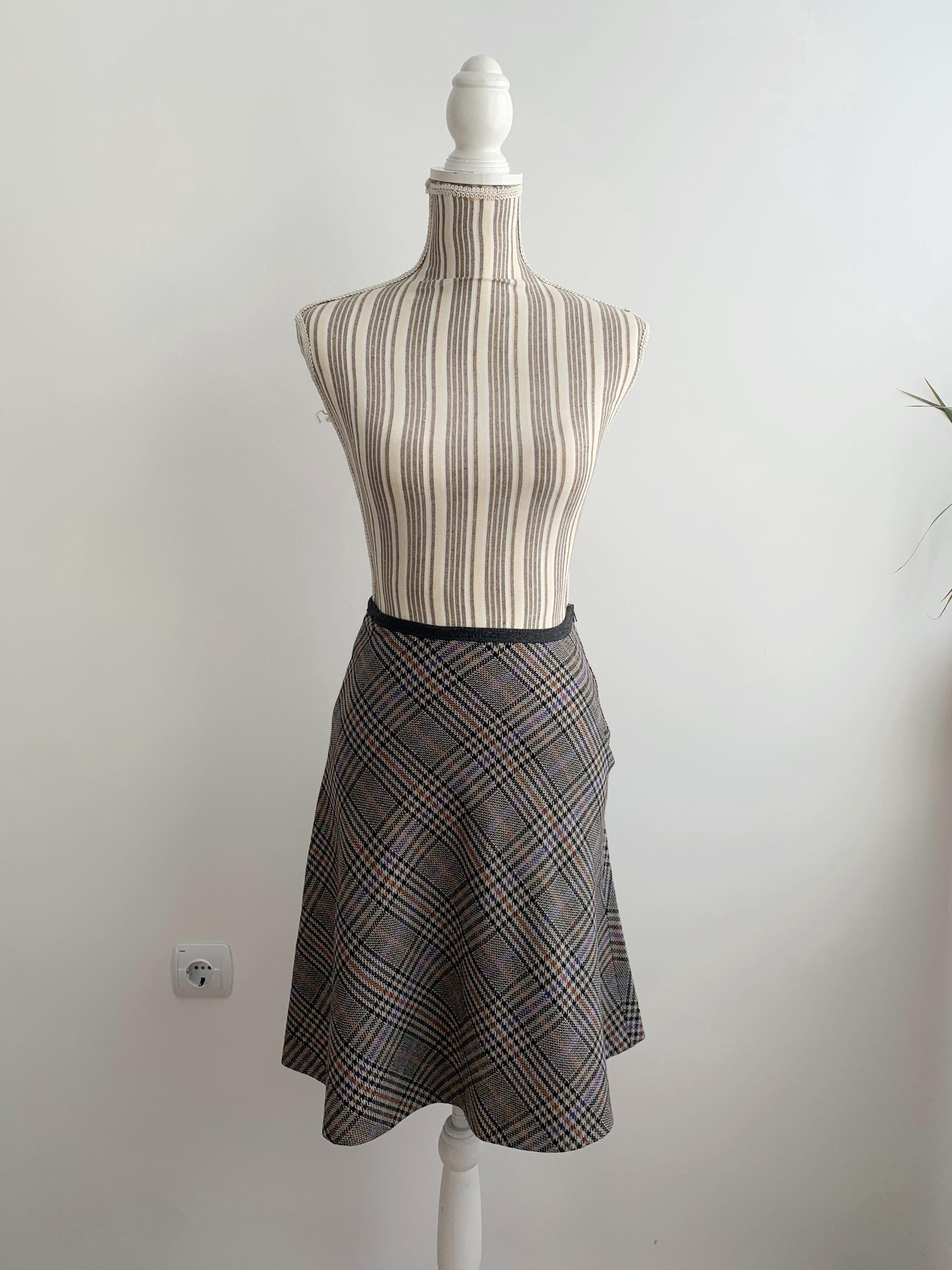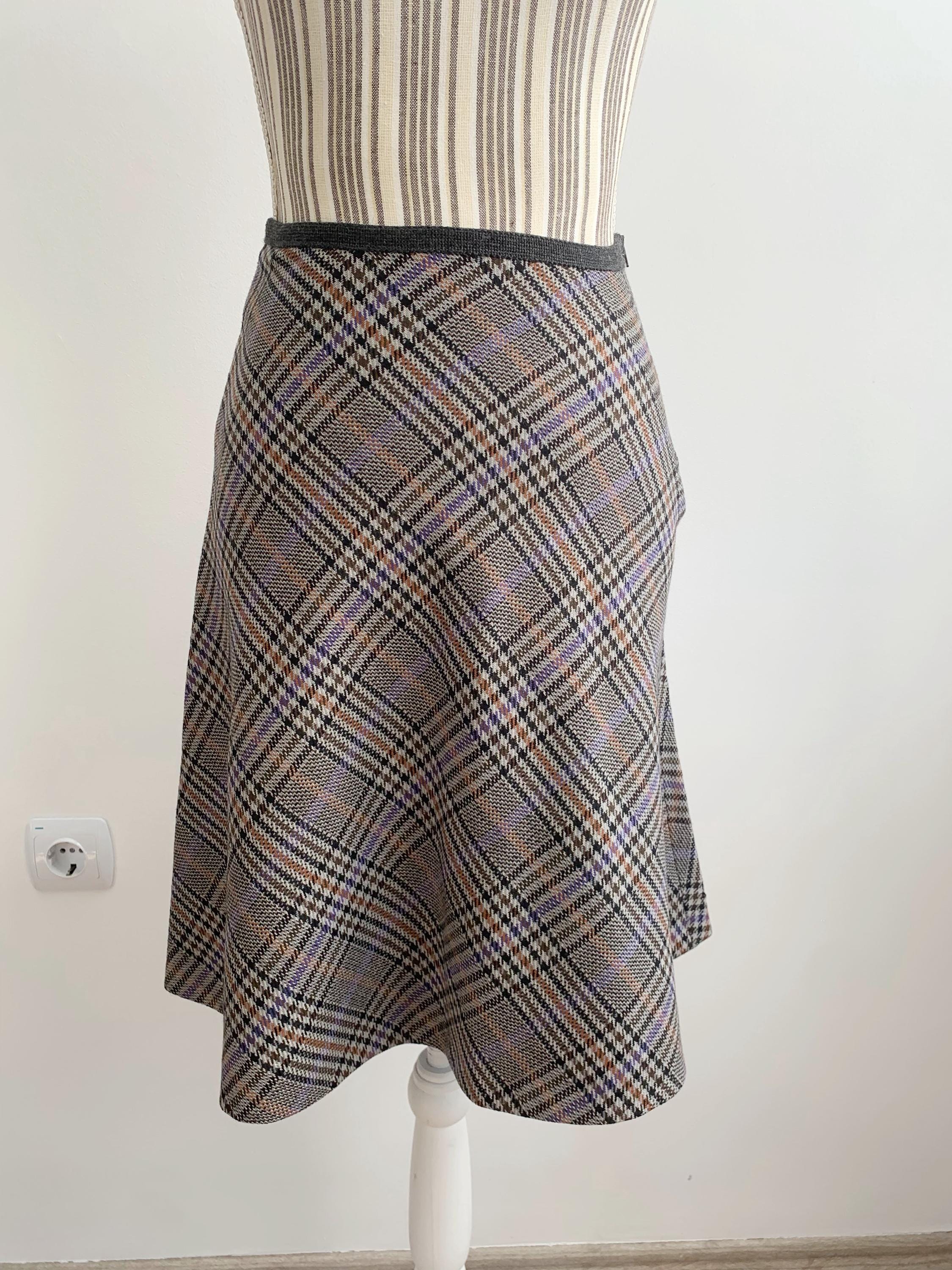This is a vintage handmade plaid wool half circle skirt from the 70s. This plaid tartan wool skirt has not lining underneath. It is made of soft warm and cozy wool fabric with beautiful houndstooth checkered print. This half circle swing skirt has knitted waitband and side zip closure. There is no tag or label, it fits like size XS. Please check the measurements below.
