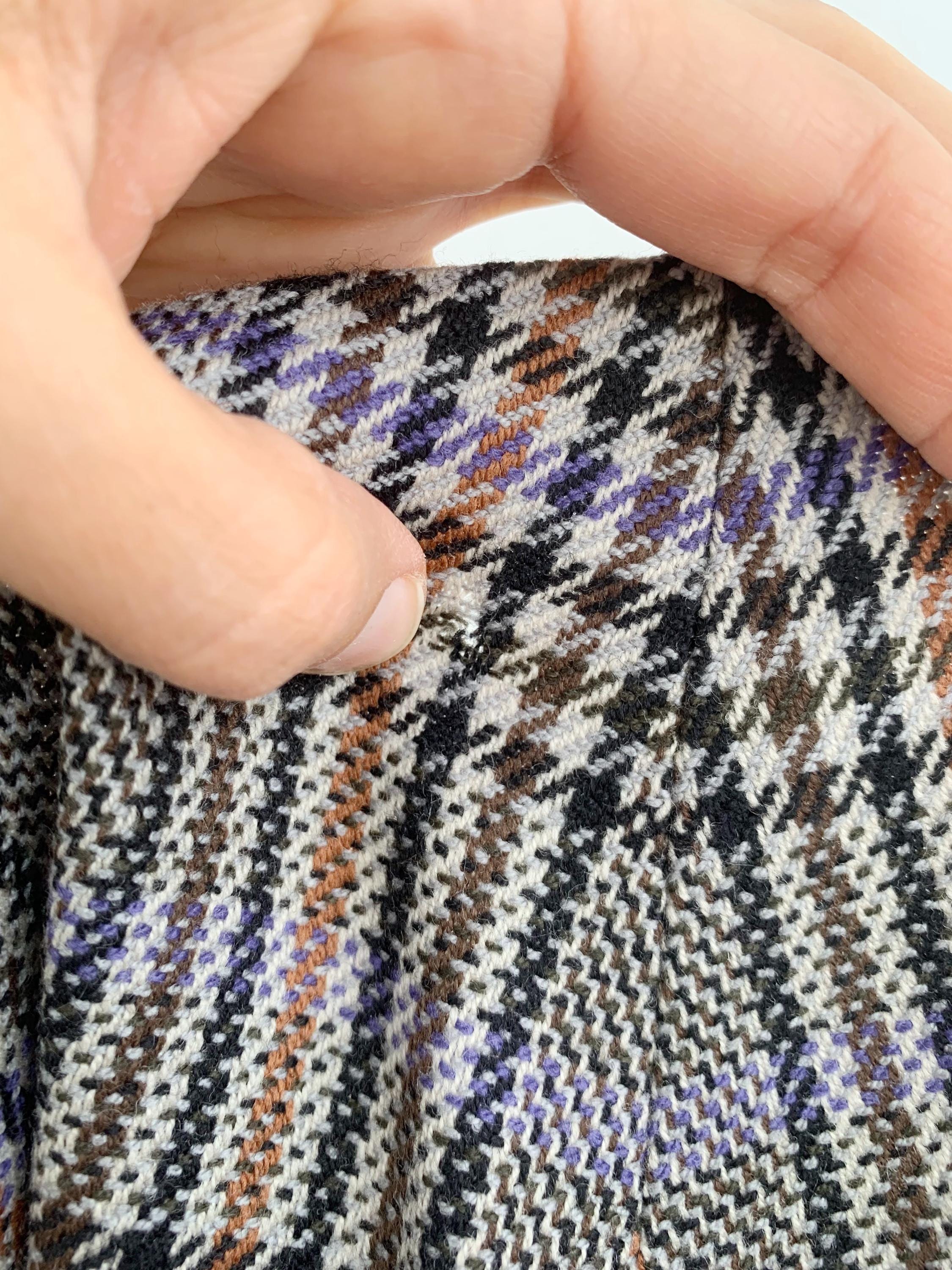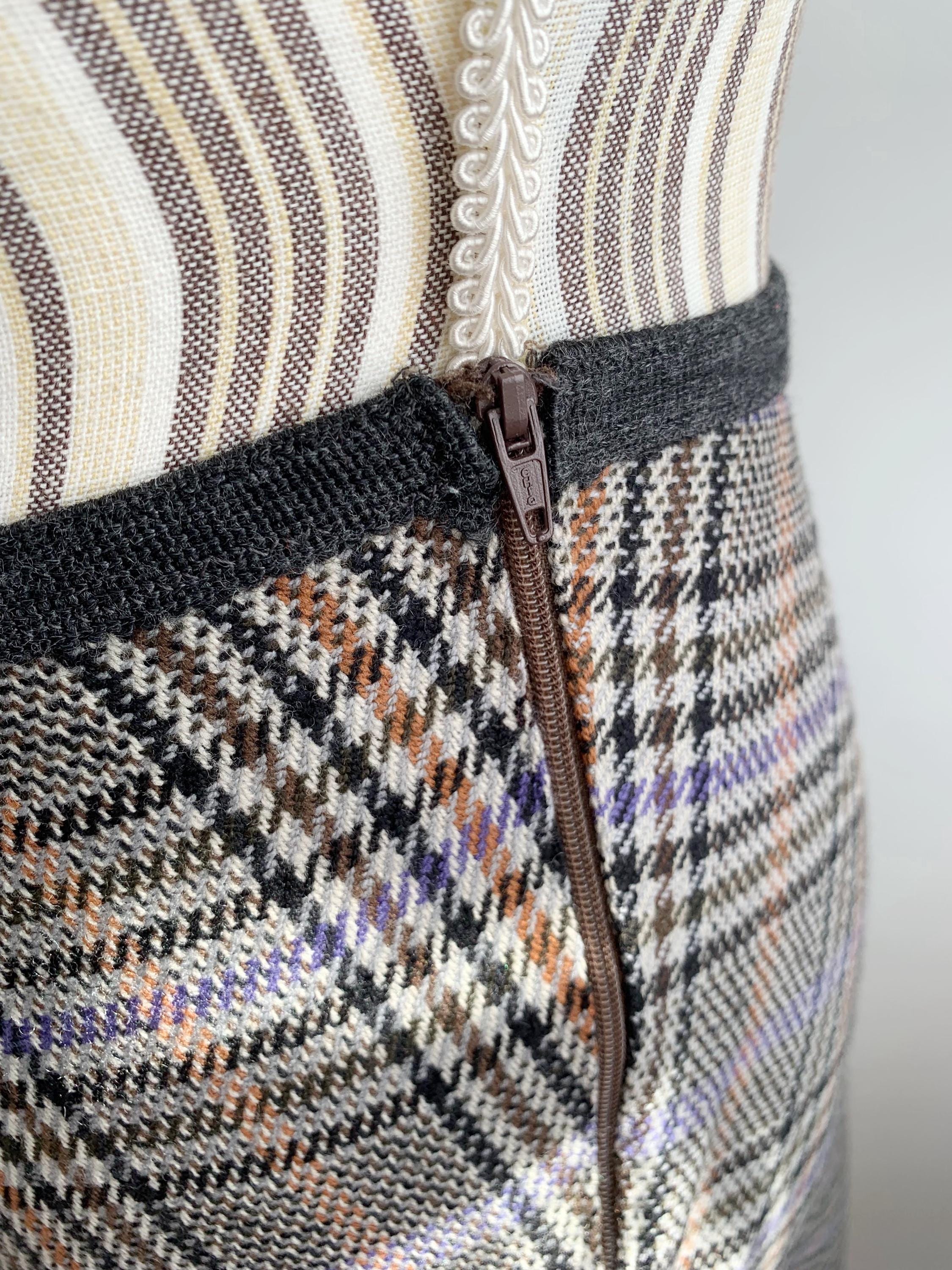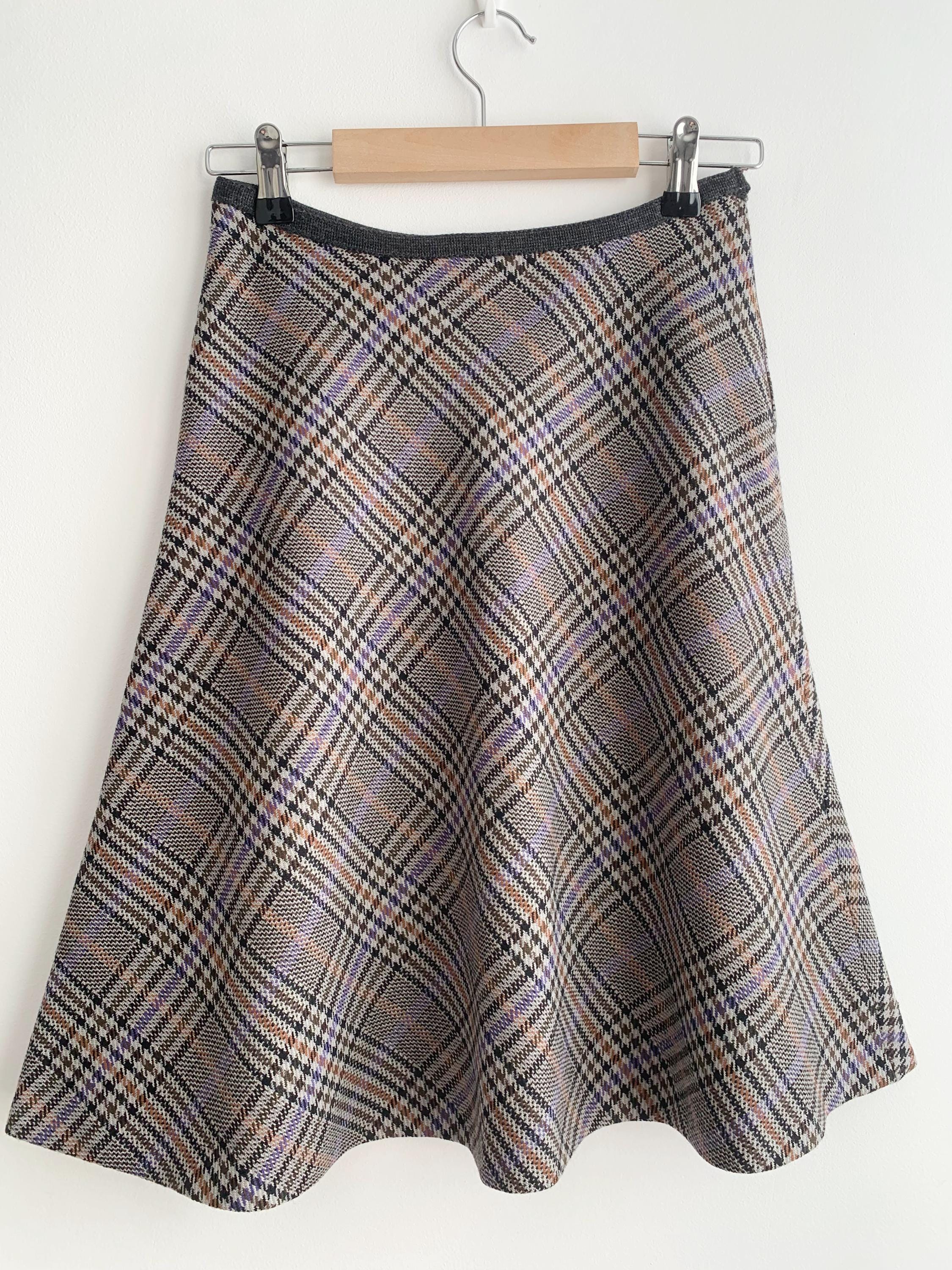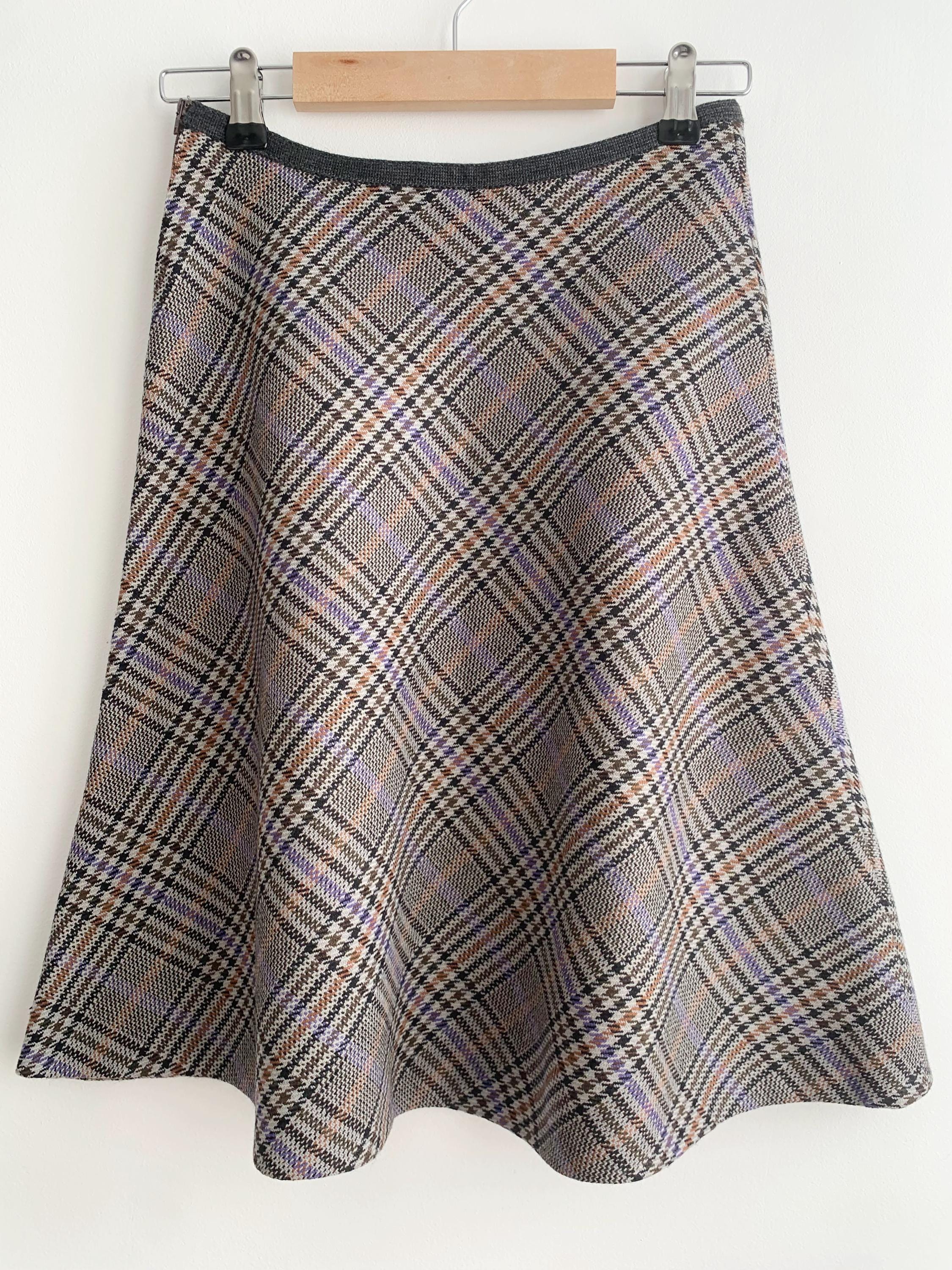 This is a vintage handmade plaid wool half circle skirt from the 70s. This plaid tartan wool skirt has not lining underneath. It is made of soft warm and cozy wool fabric with beautiful houndstooth checkered print. This half circle swing skirt has knitted waitband and side zip closure. There is no tag or label, it fits like size XS. Please check the measurements below.