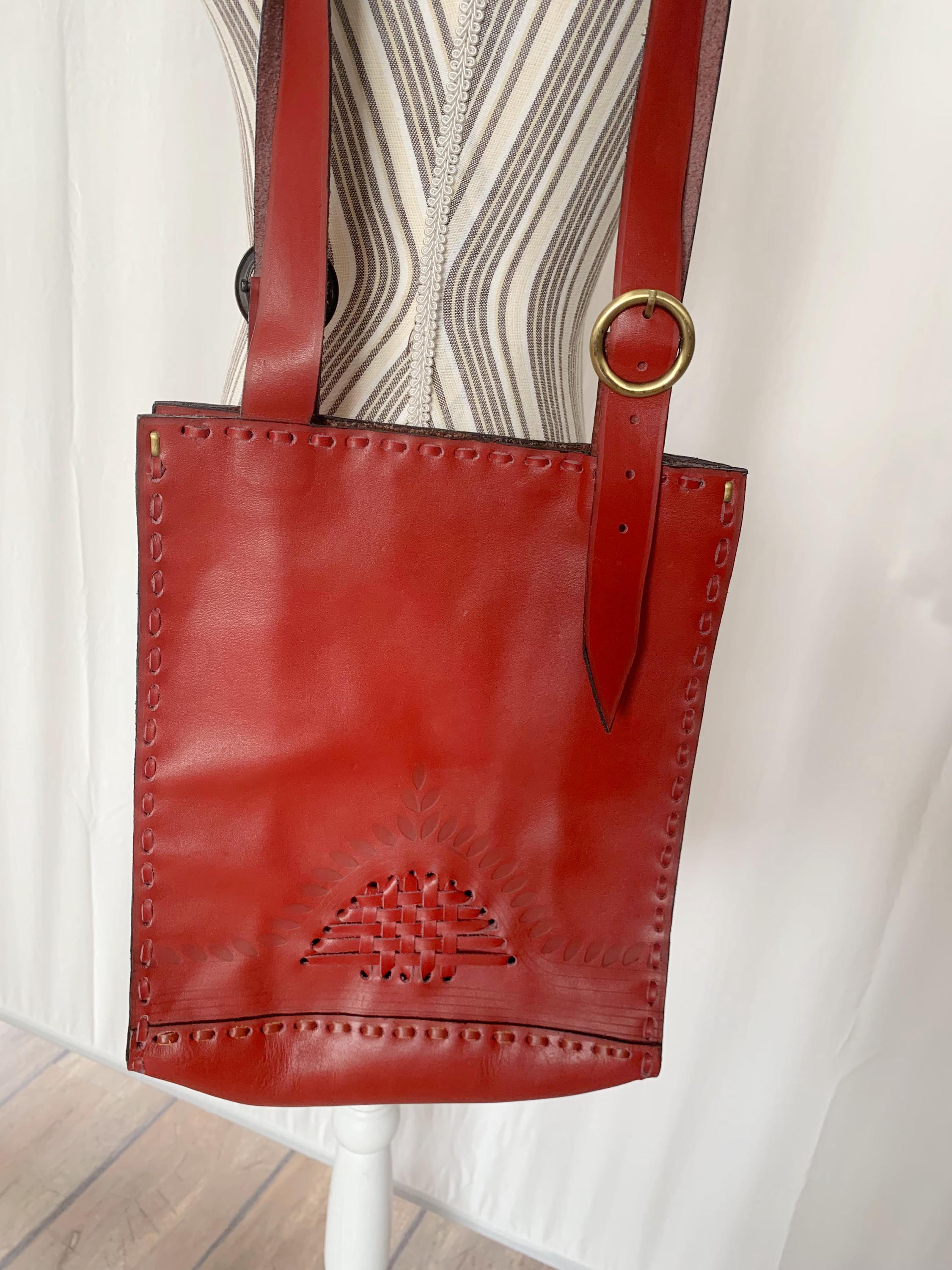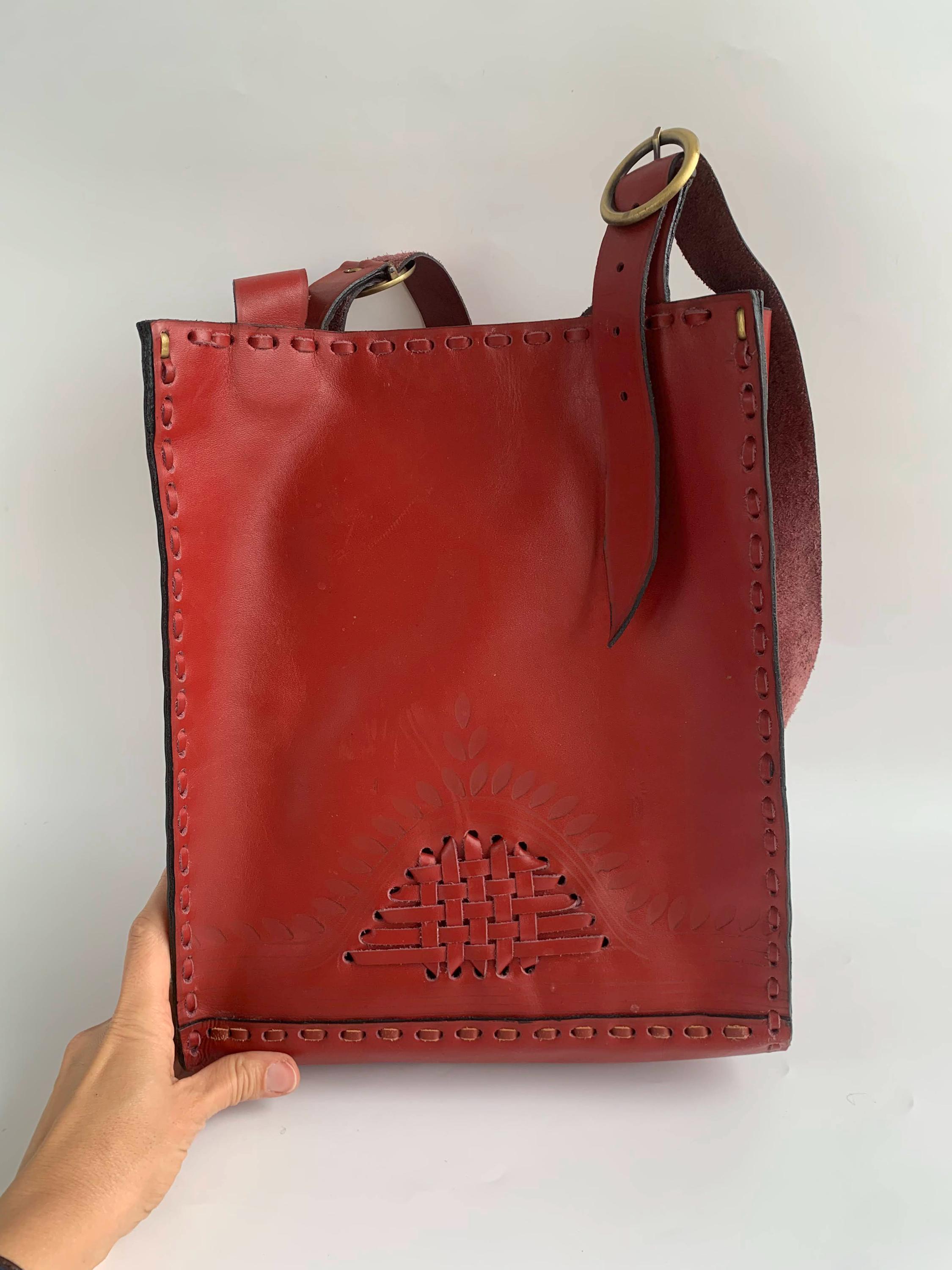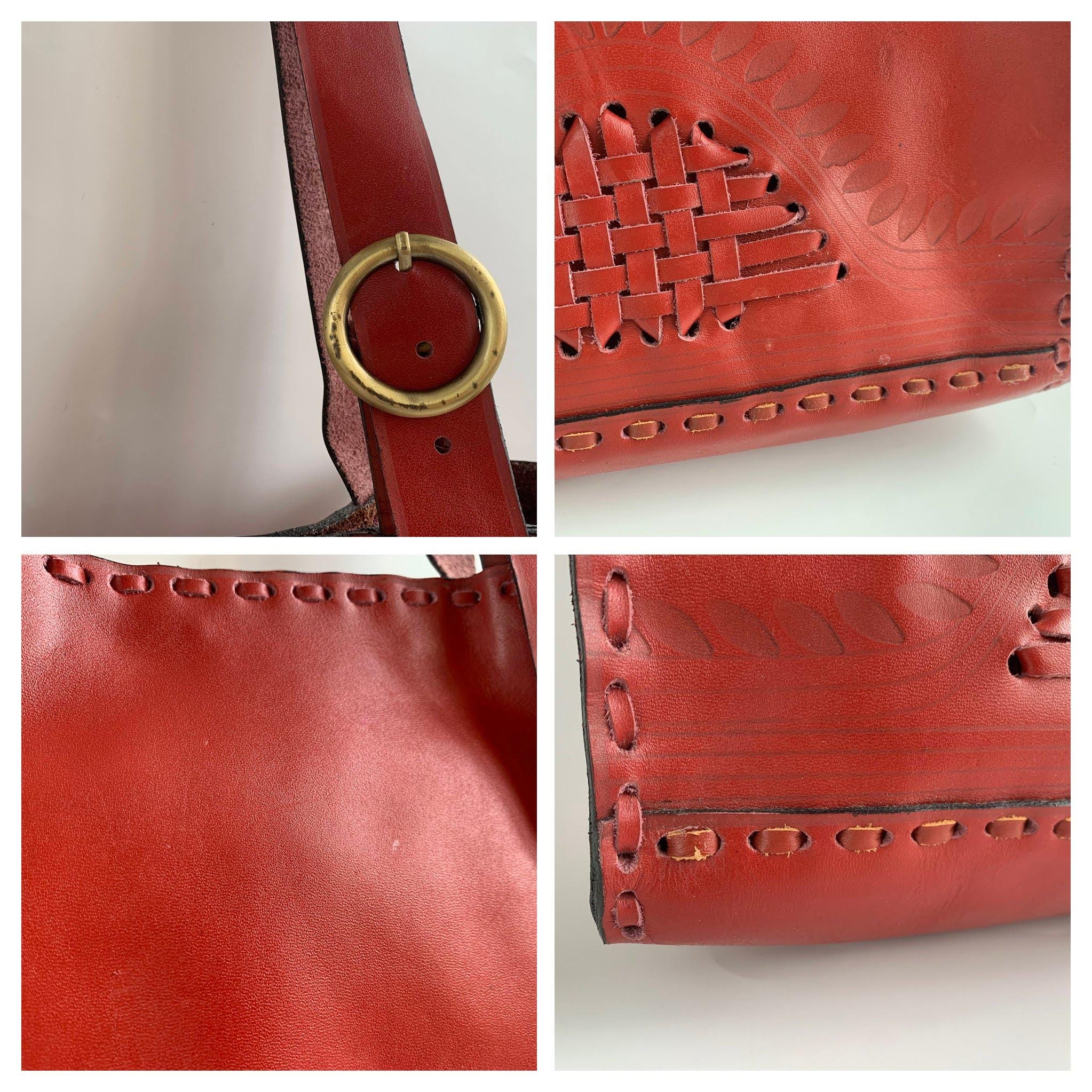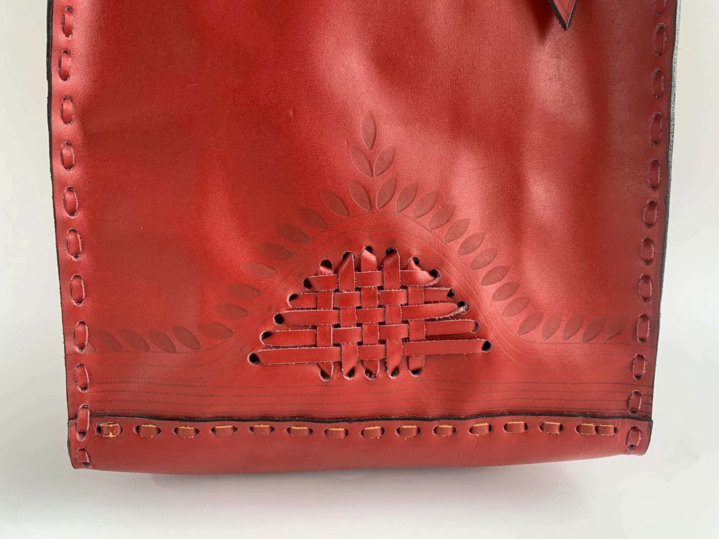 Pretty festival purse made of tooled leather in brick red color with adjustable shoulder straps with buckles, open top with magnetic closure. There is no lining, you can feel the suede leather inside.