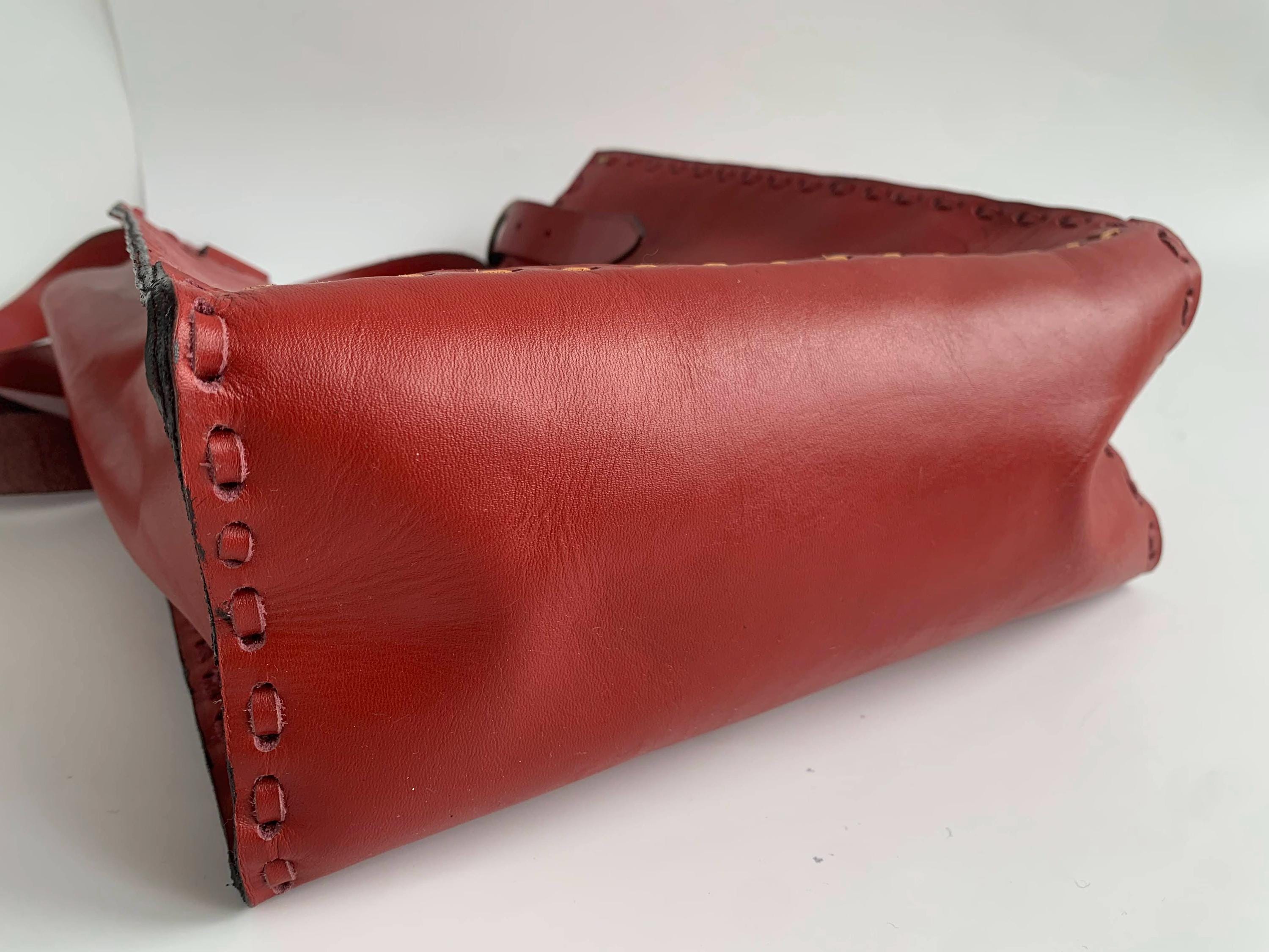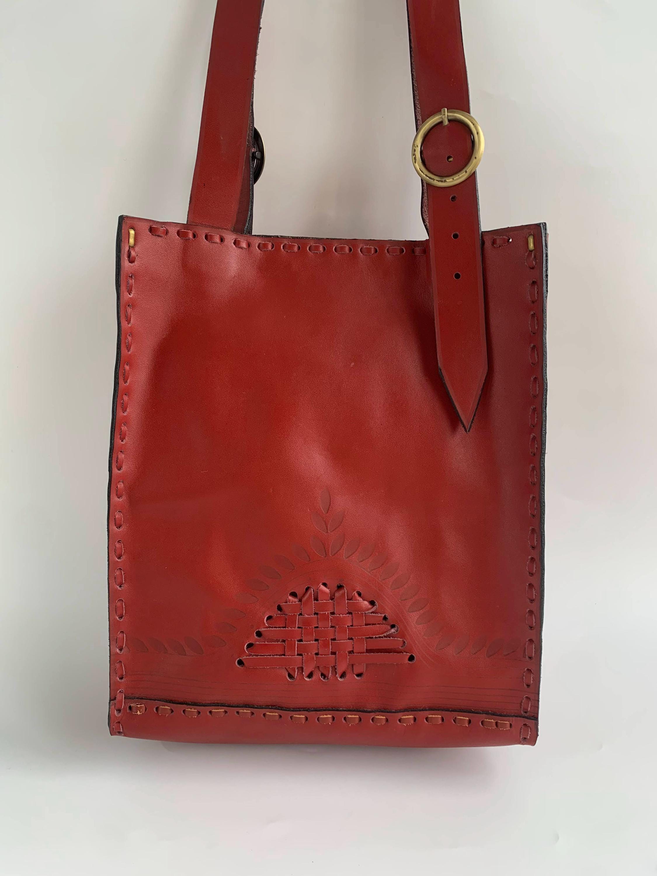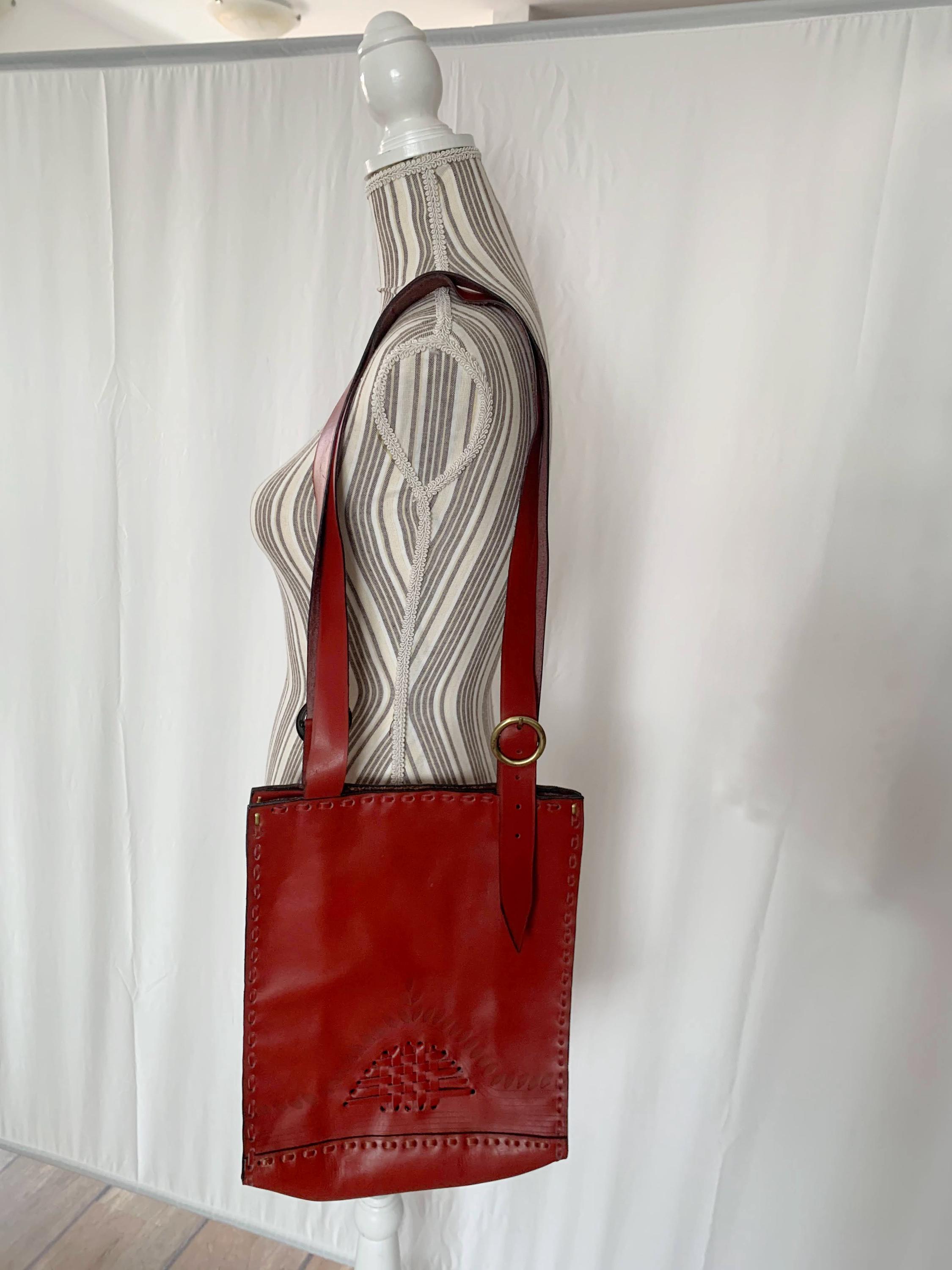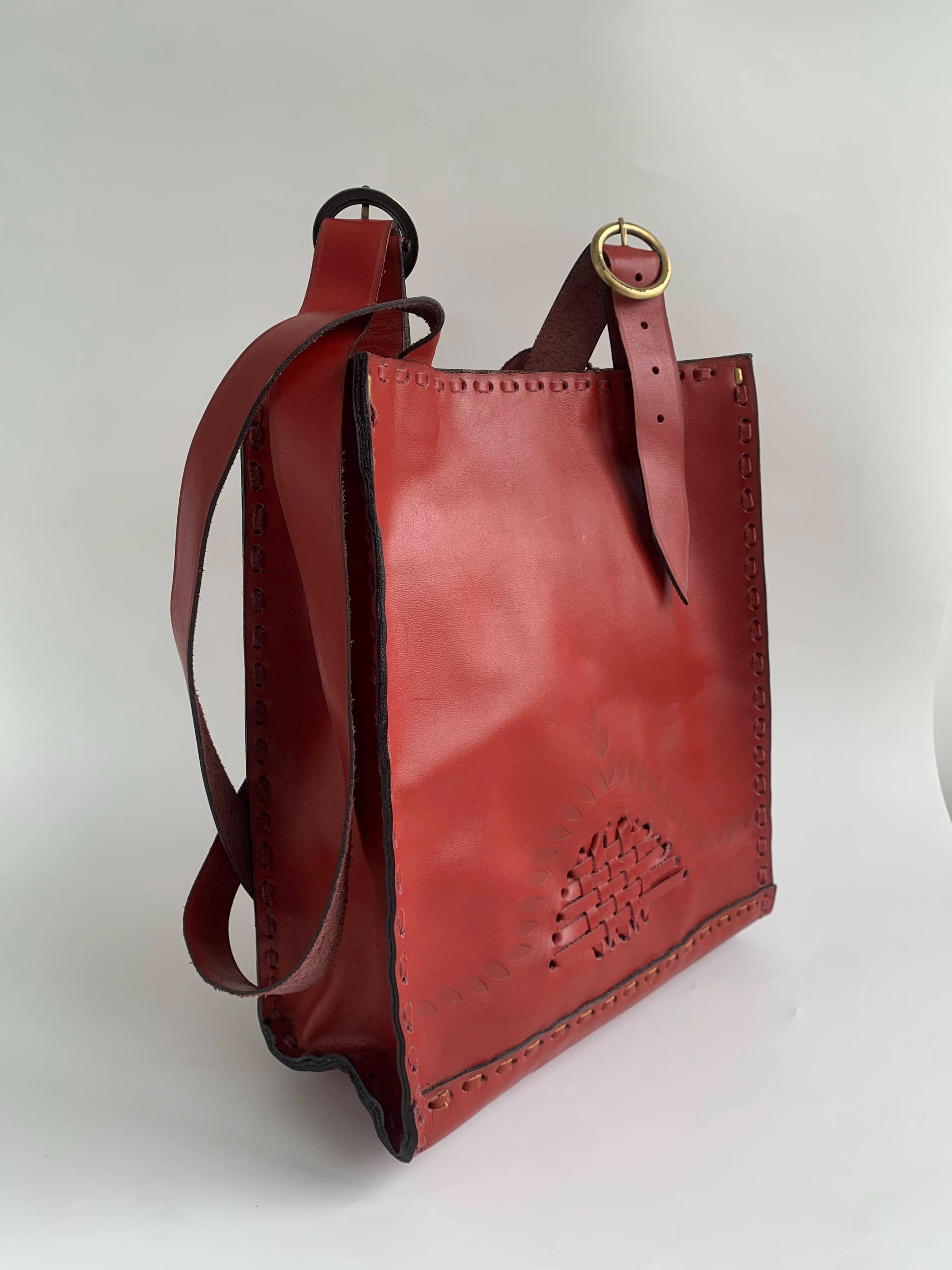 Pretty festival purse made of tooled leather in brick red color with adjustable shoulder straps with buckles, open top with magnetic closure. There is no lining, you can feel the suede leather inside.