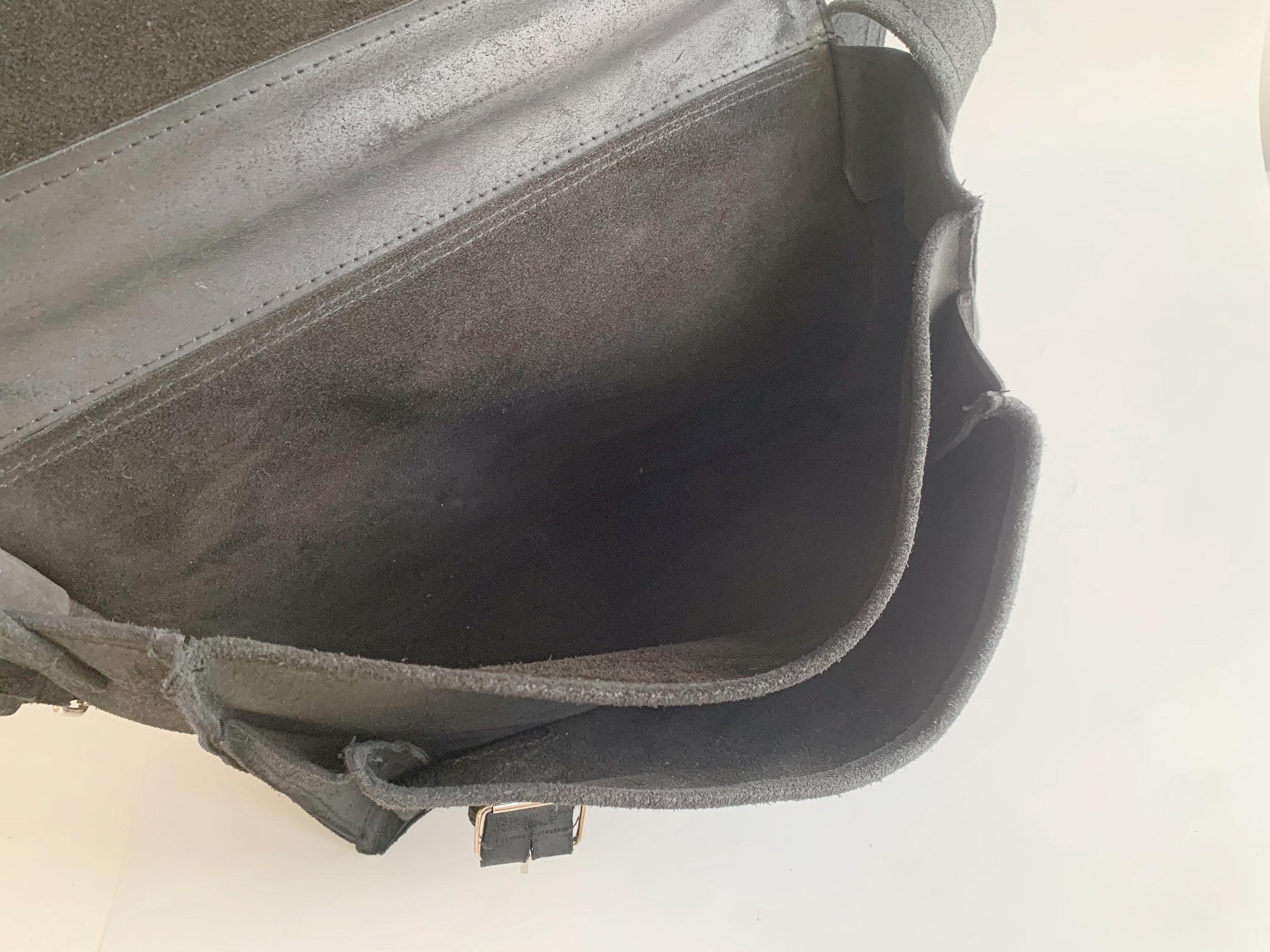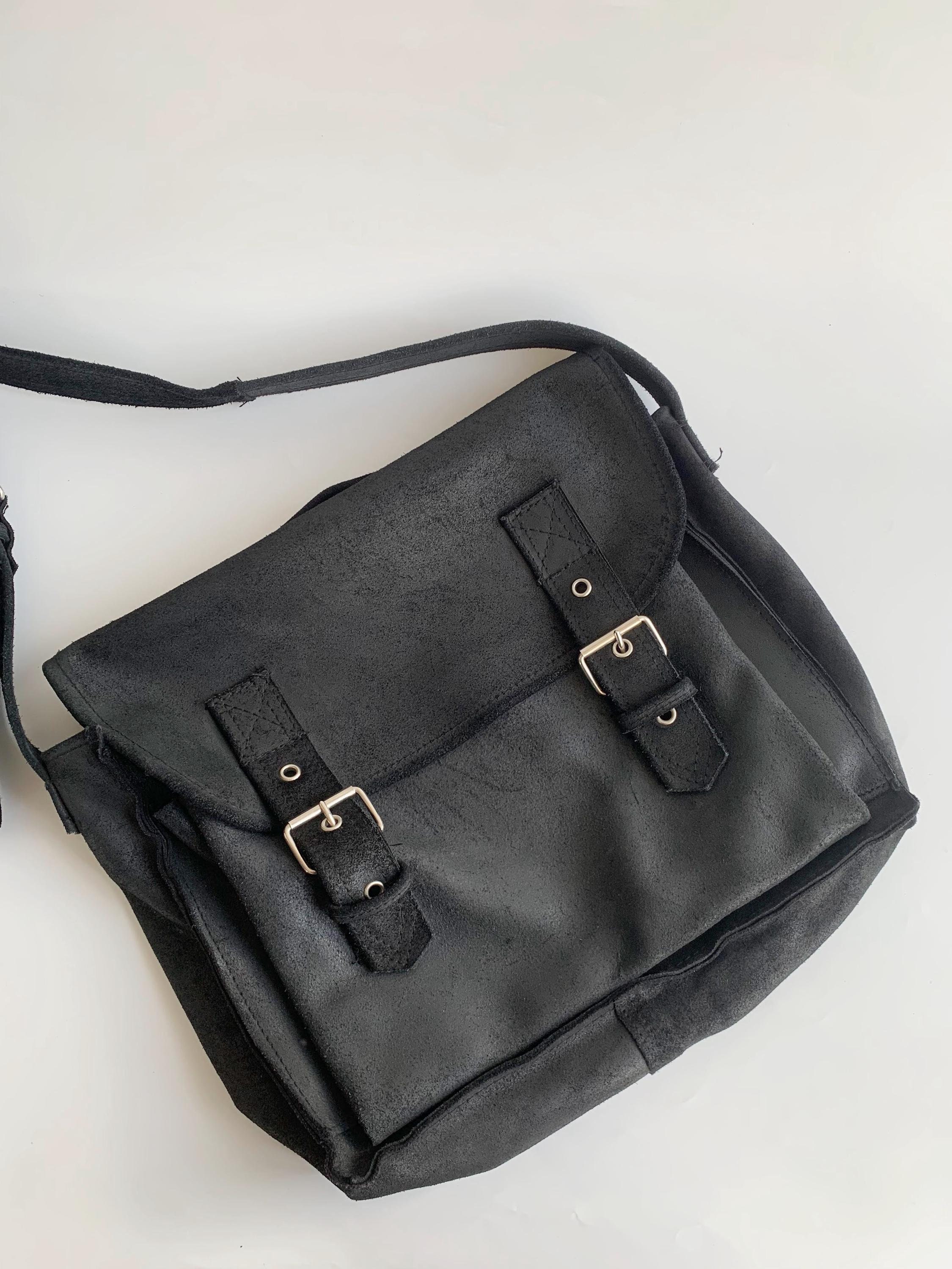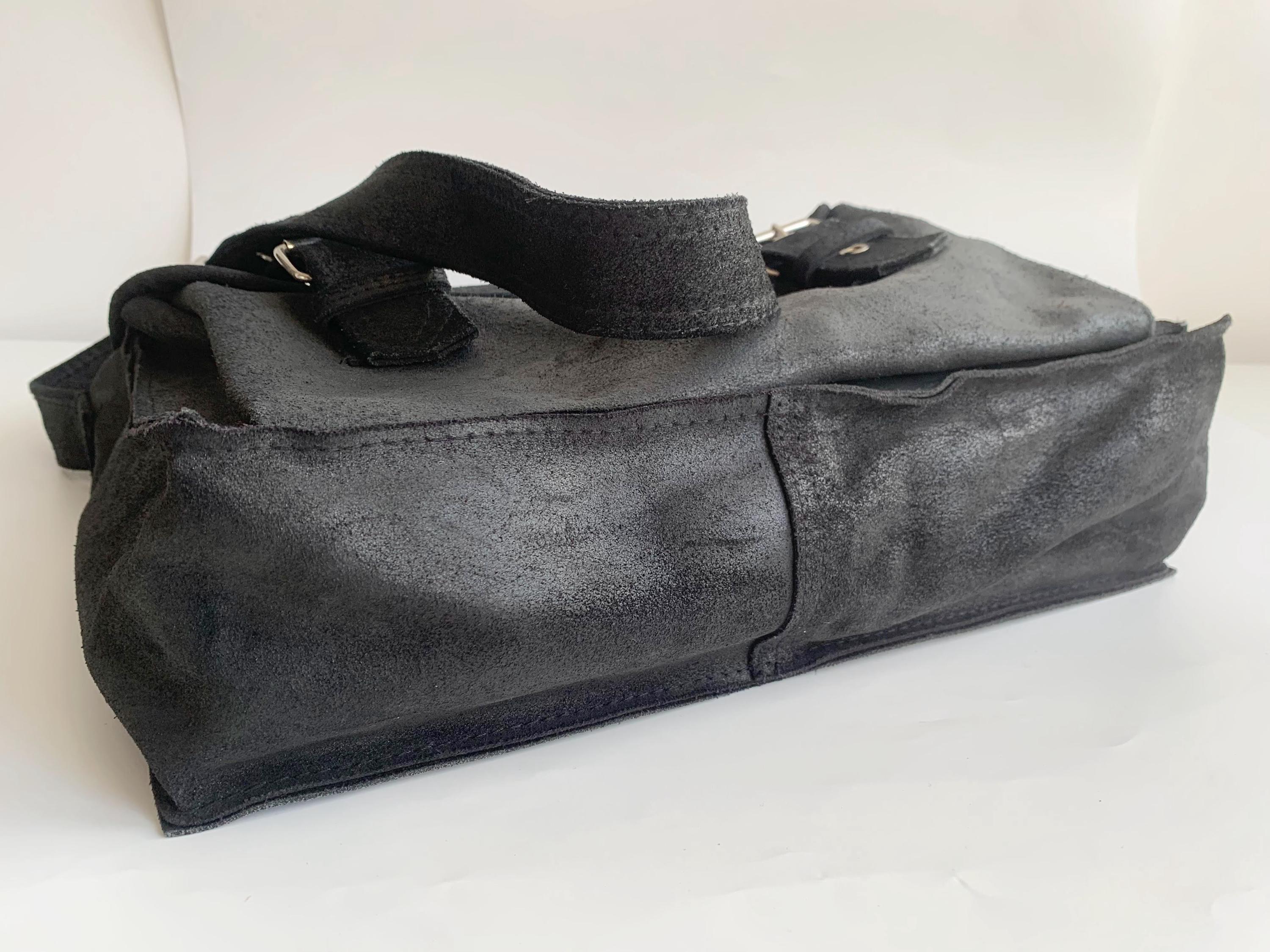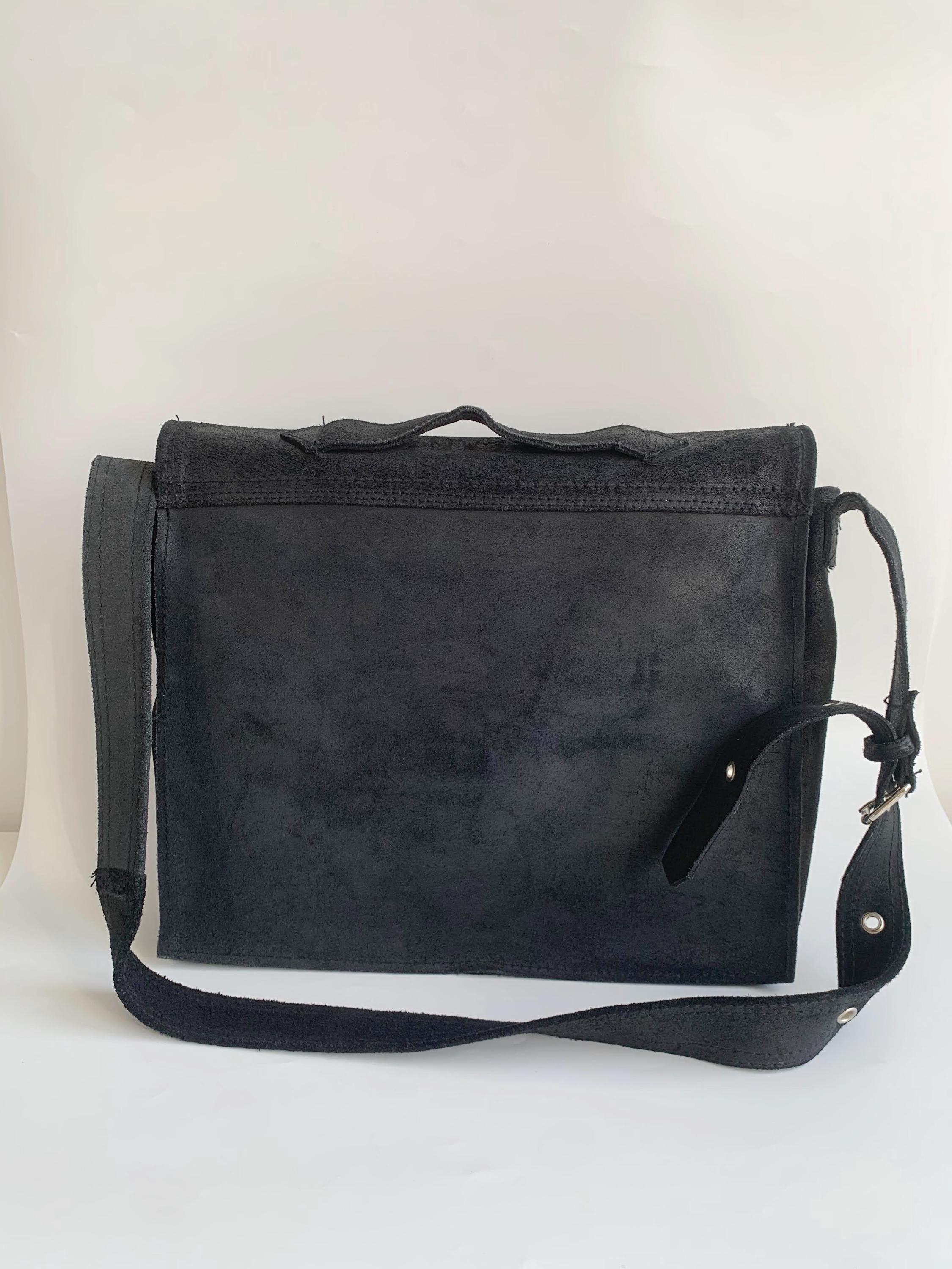 This is a pretty soft black suede leather top handle purse. This vintage 90s oversized handbag has top handle and adjustable shoulder strap. It is made of heavy sturdy soft suede leather. It is perfect for work or school. This black suede leather satchel will be a classic addition to your wardrobe. It is just the right size to fit in everything you need for a busy day out at work, it fits size A4 files comfortably. This large leather messenger bag has one compartment and one pocket at the front.