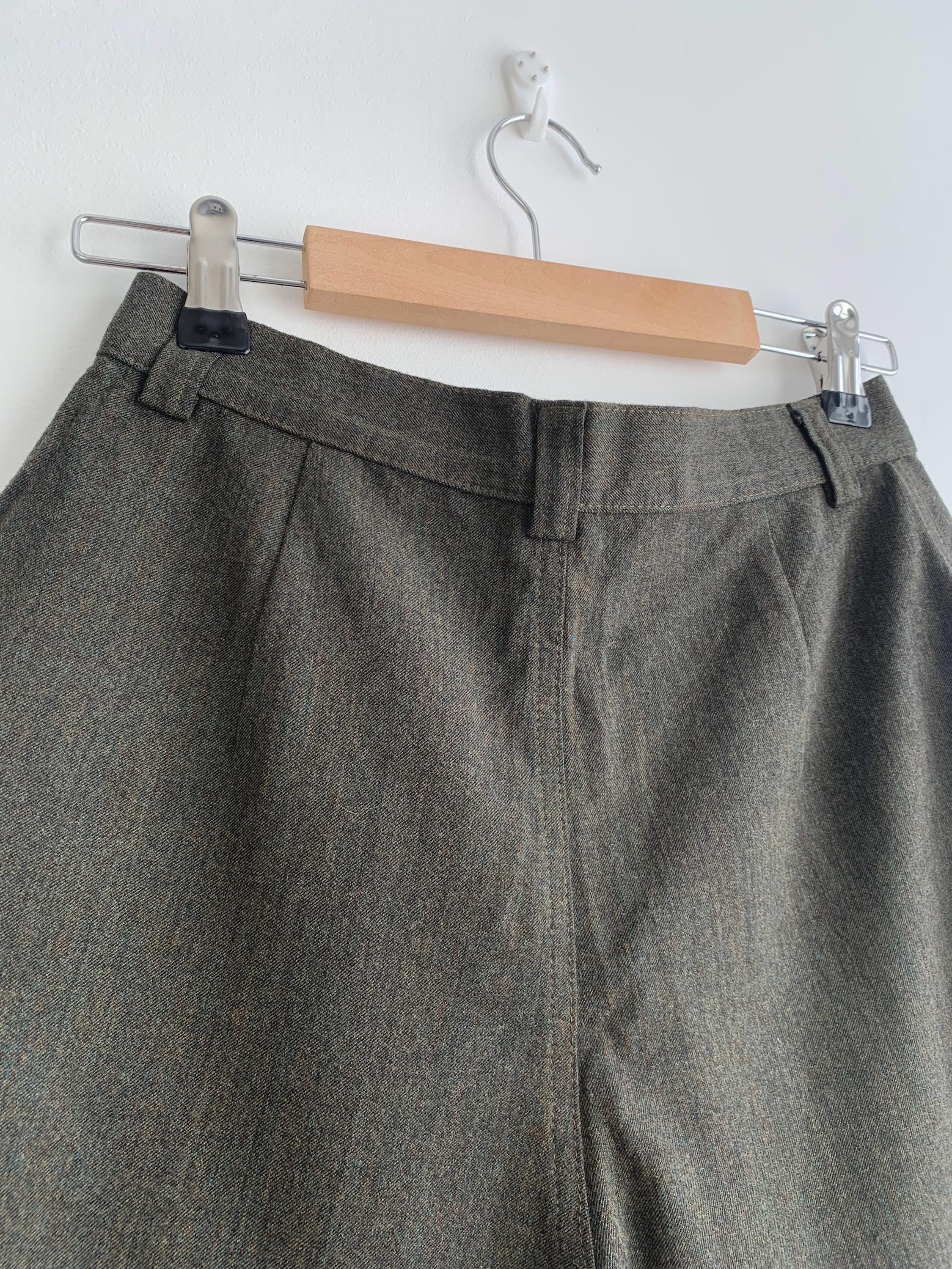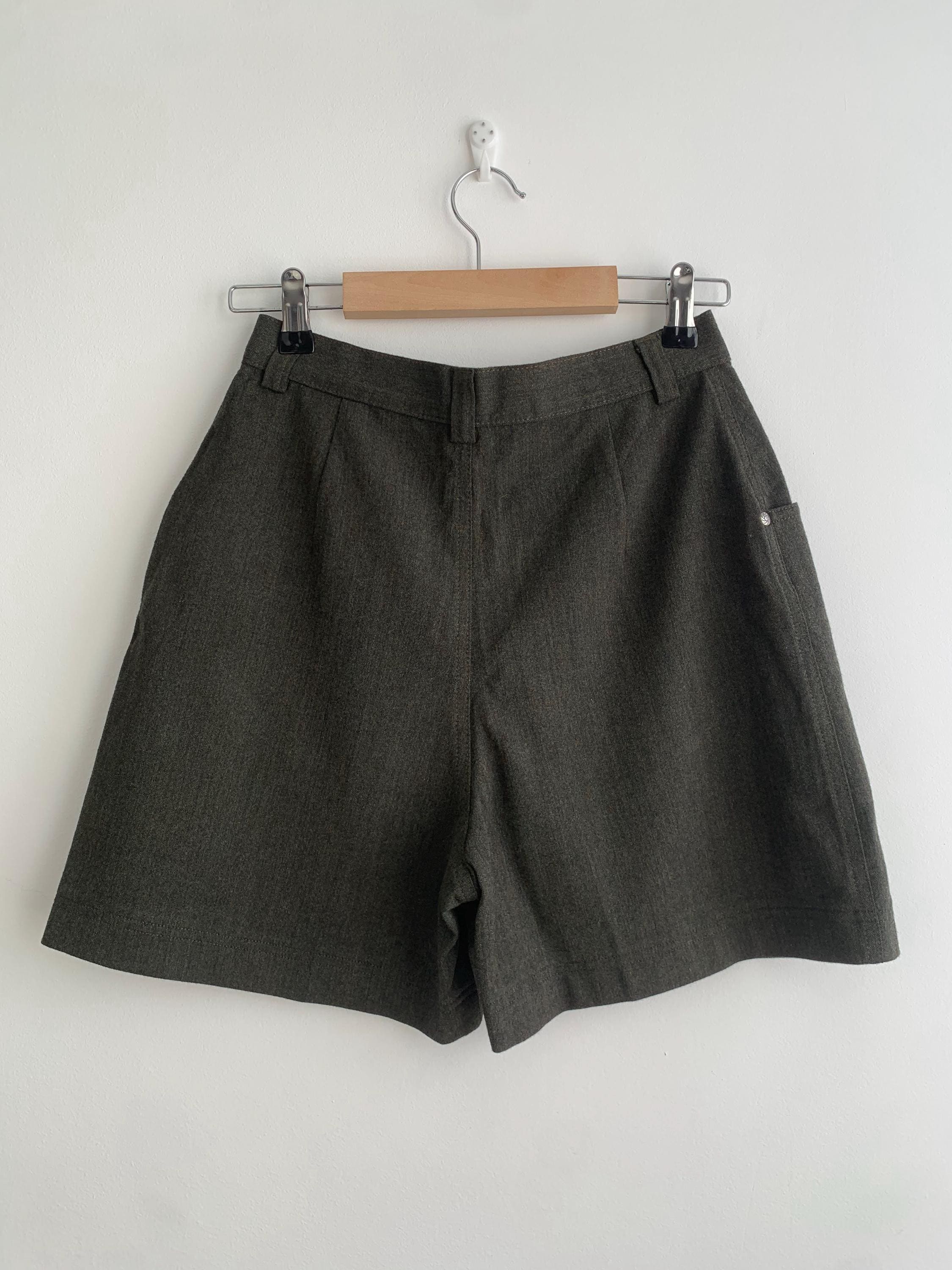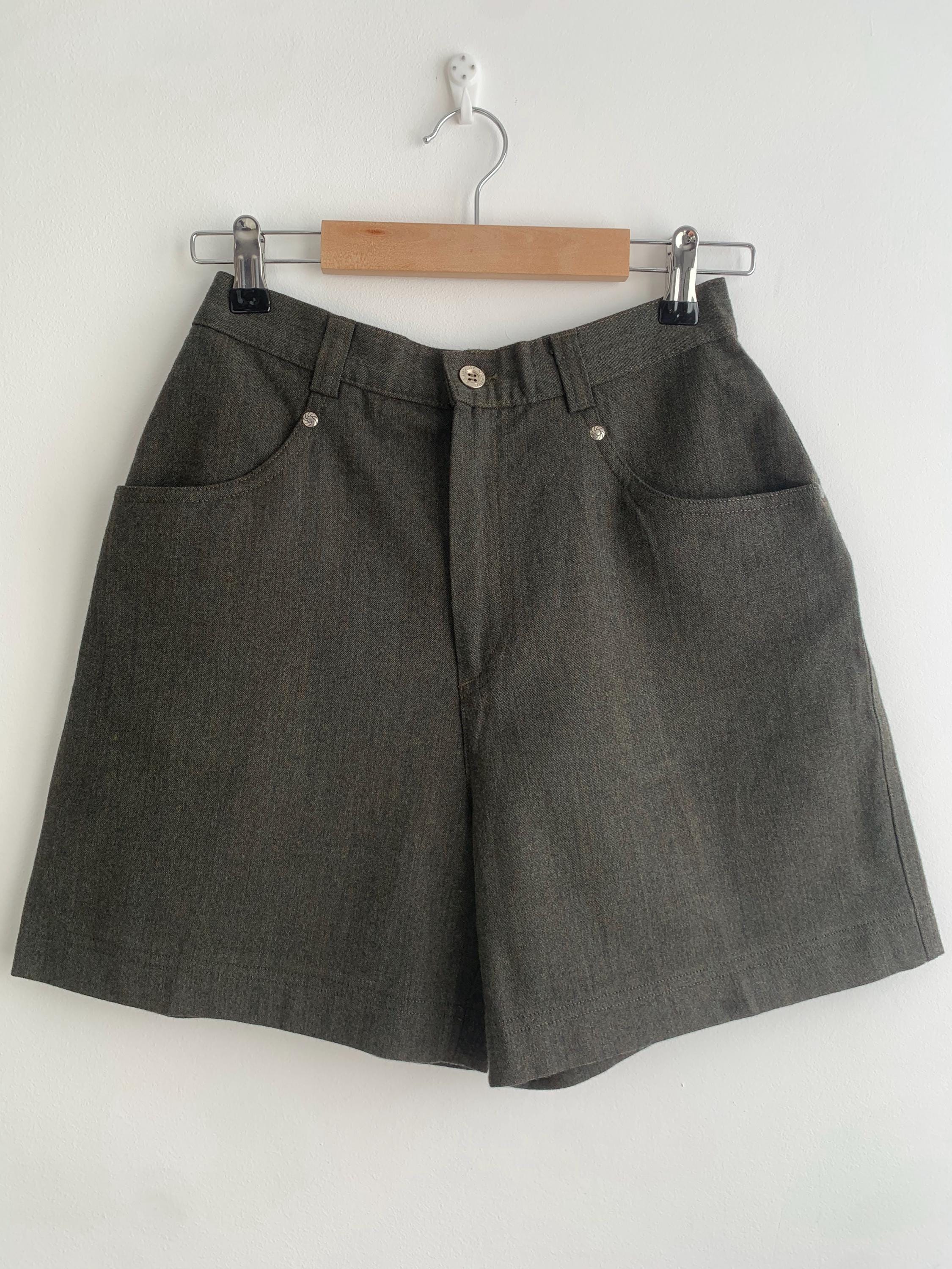 Stylish vintage wool shorts for women, made of thin wool fabric in olive green color. These classic dress shorts have front zipper and button closure with two front pockets. They are unlined. The size marked on the label is 38, they fit like size XS. Please check the measurements below.