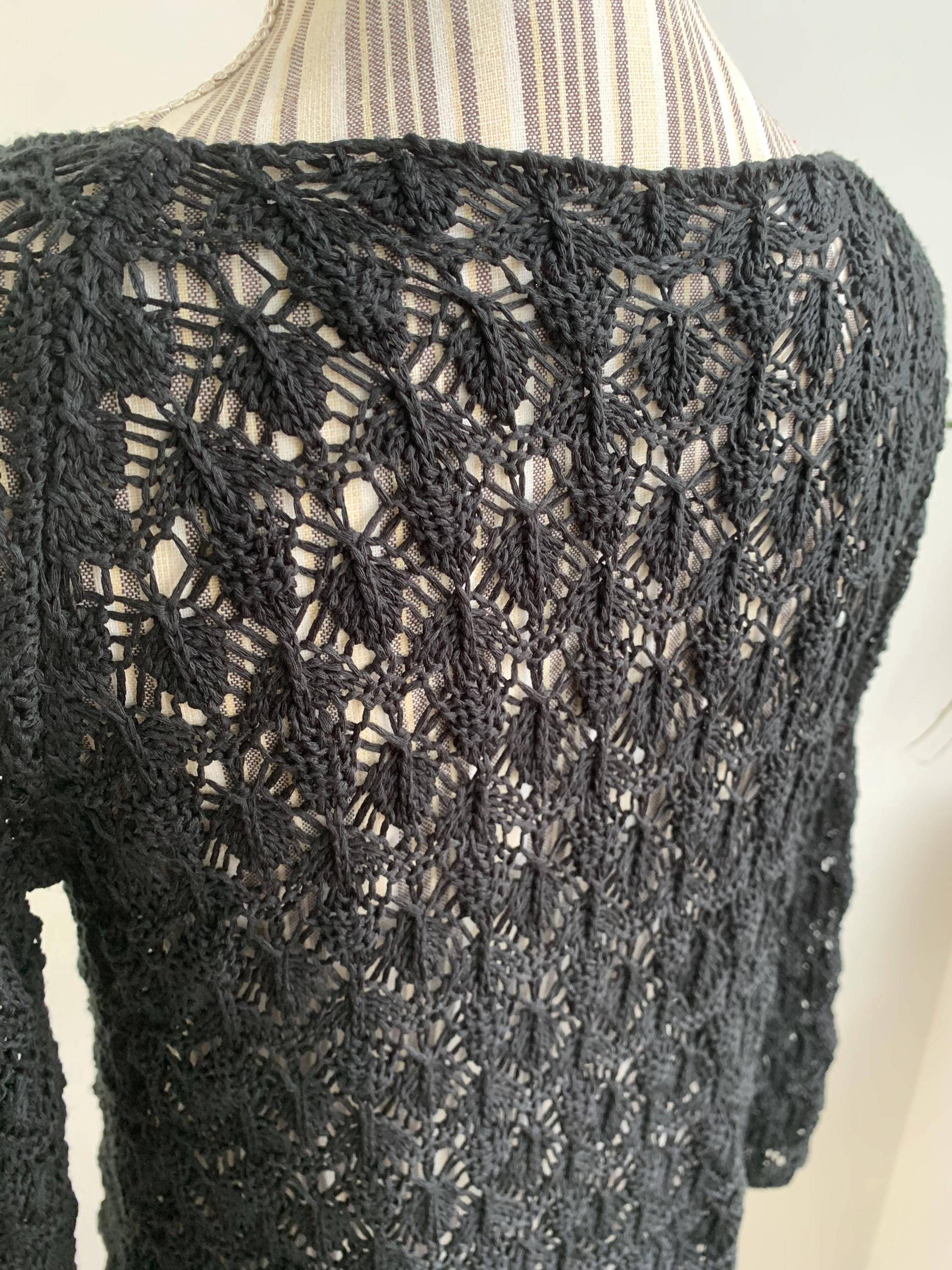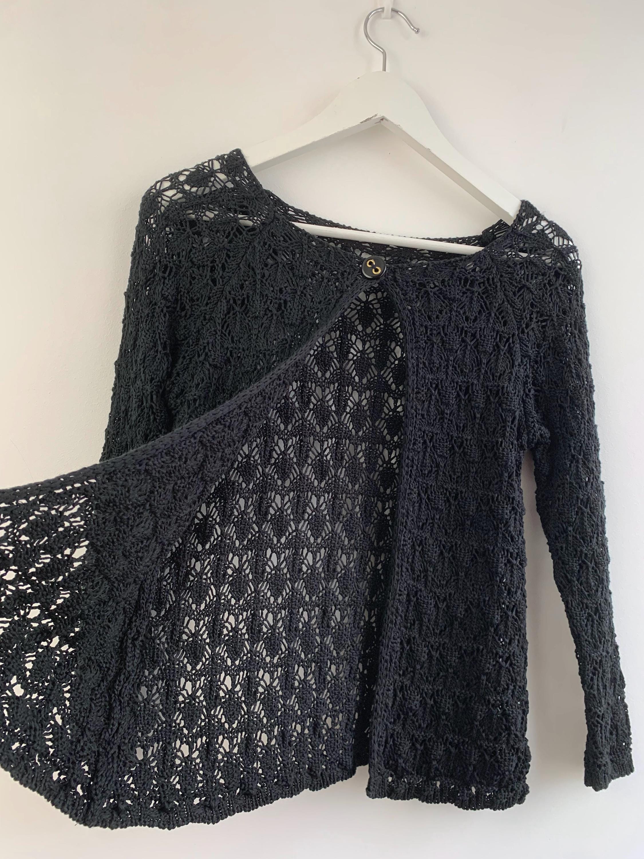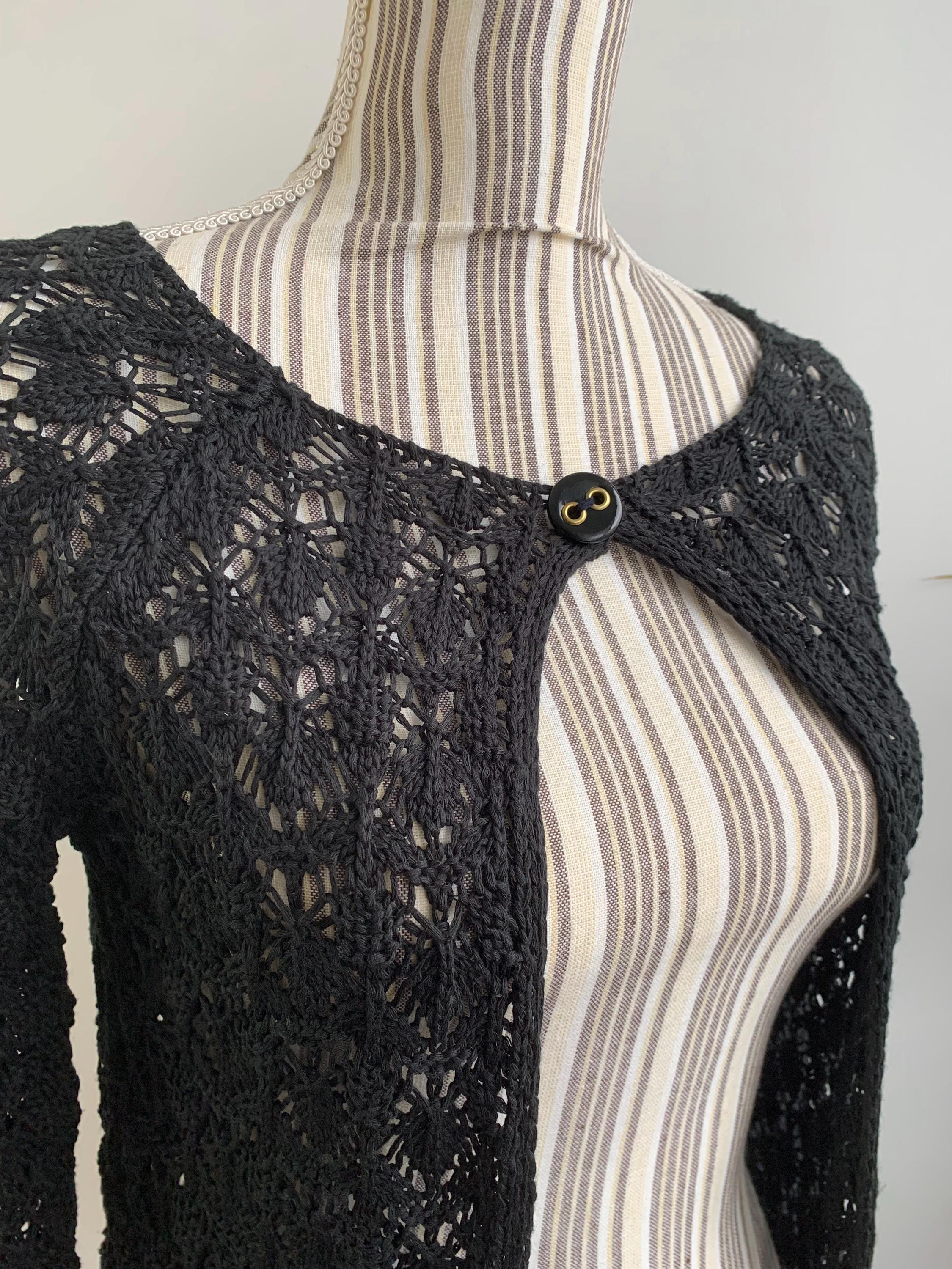 Check out this gorgeous vintage black openwork cardigan with single button closure and long sleeves. This sheer mesh cardigan has a lace fishnet pattern, perfect for layering for the spring/ fall season. Adorable vintage gift for her. You can wear this openwork cardigan both ways - with the button at the front or at the back.
