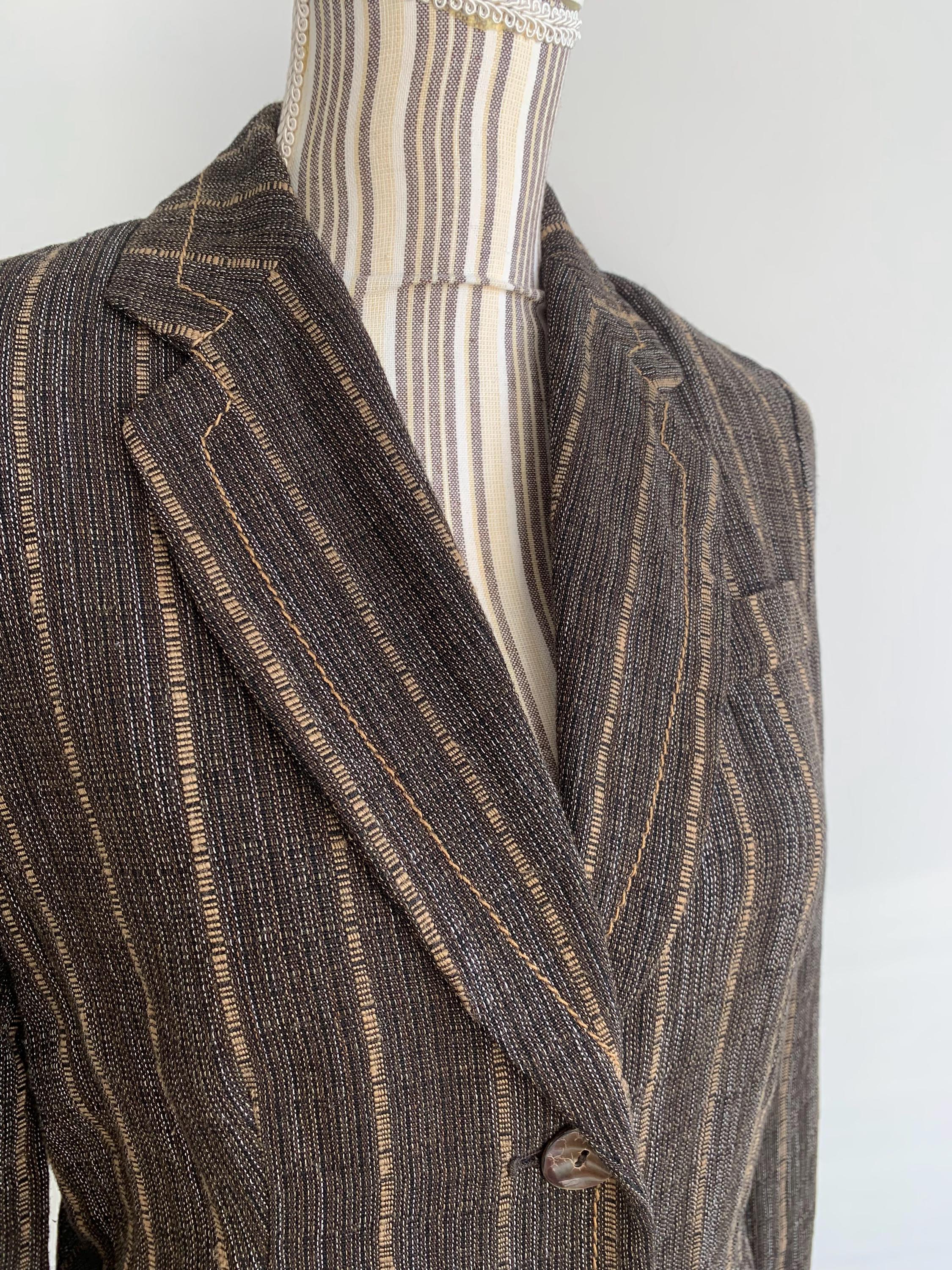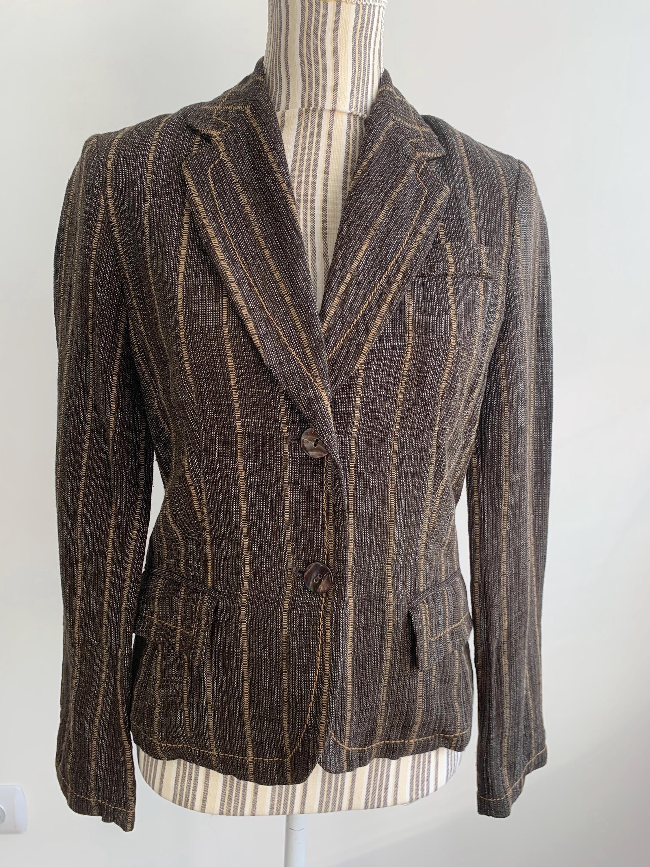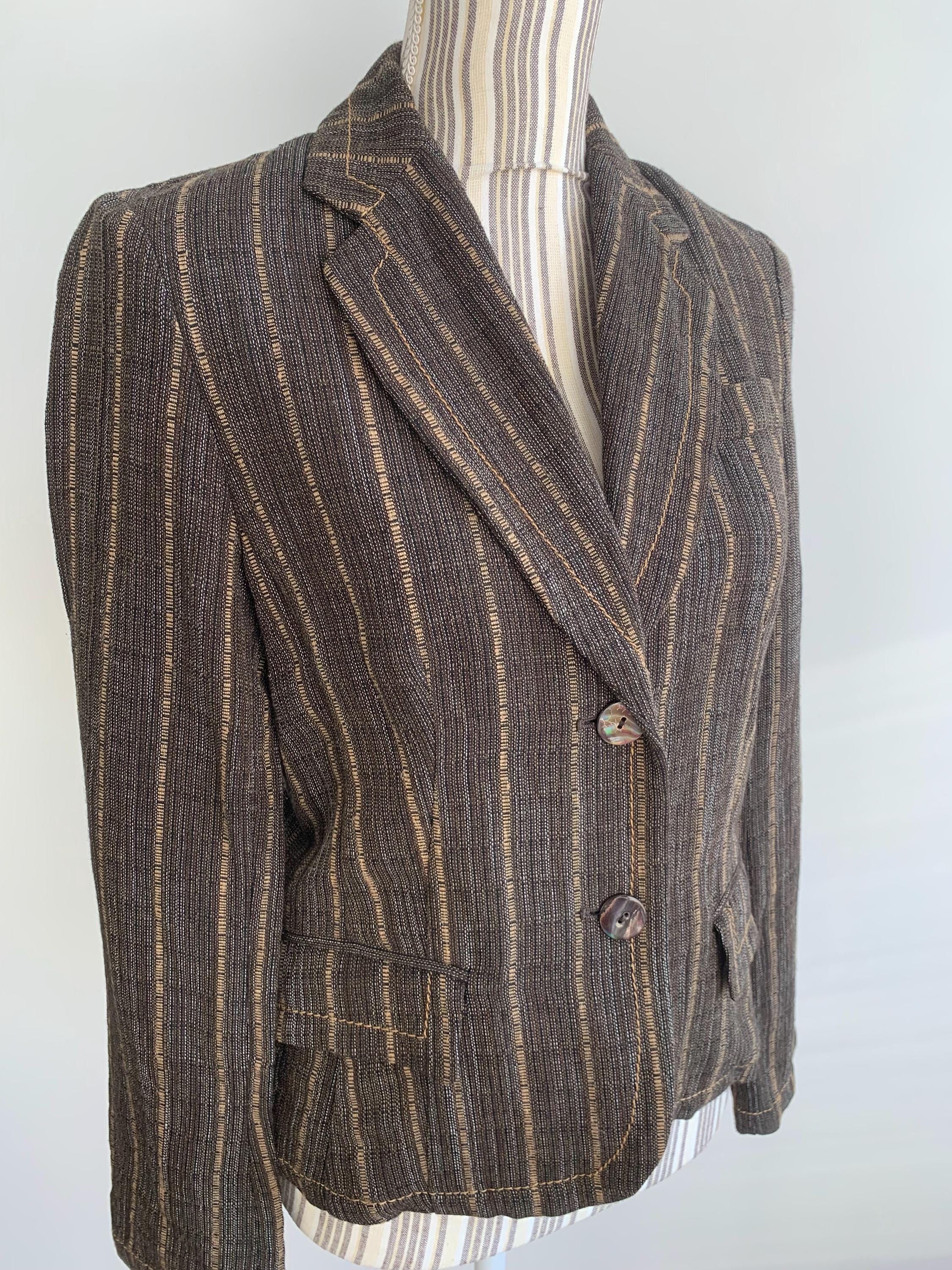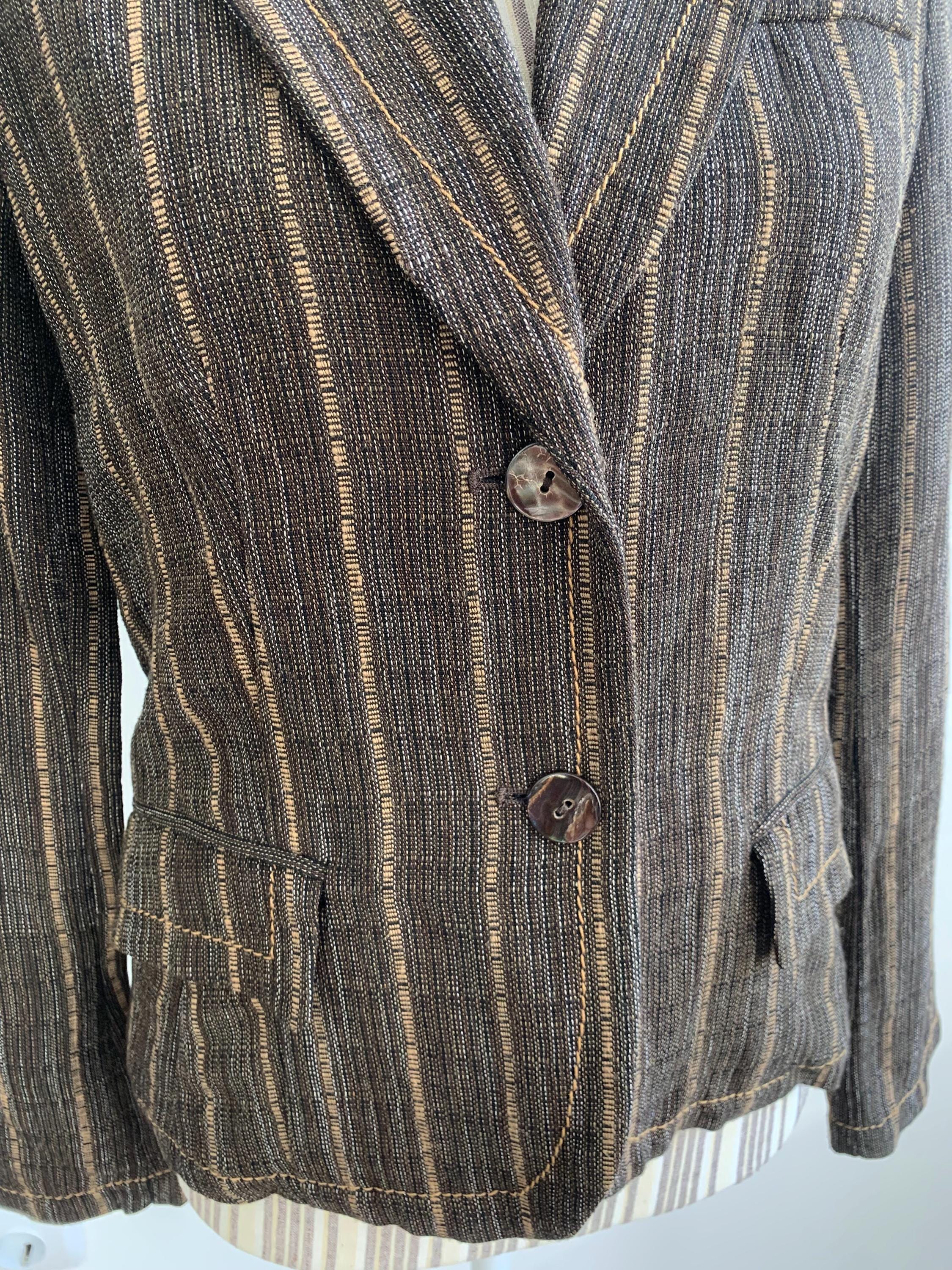 Keep it cozy and chic with this vintage 90s linen blend blazer jacket for women. This buttoned collared blazer has a slim fit silhouette and button front closure with two pockets. This casual classic linen blazer is made of unlined linen blend fabric in taupe brown with vertical stripes in camel color. The size marked is DK 34, D 34, GB 8, F 38, I 38, it fits like size S. Please check the measurements below.
