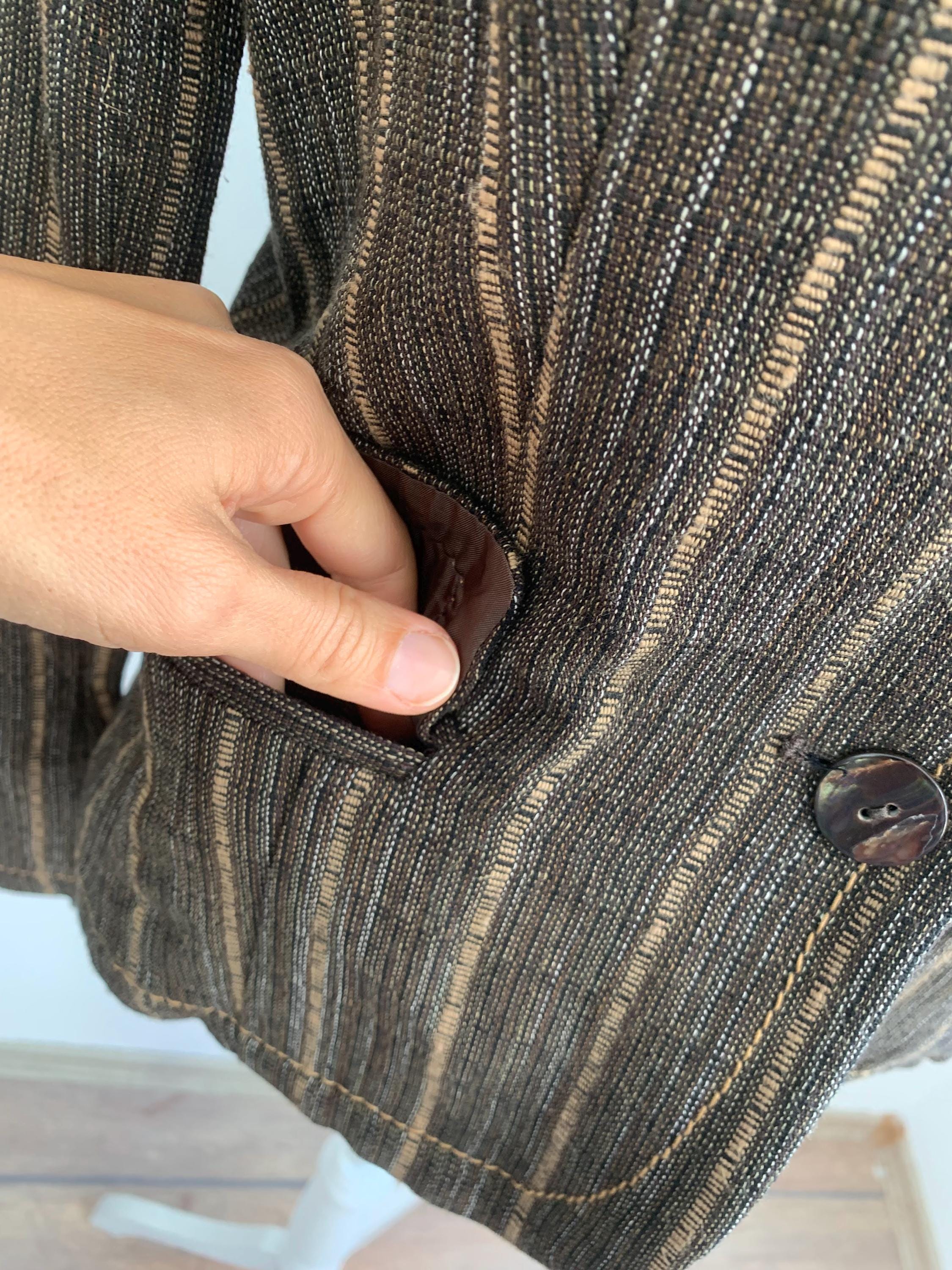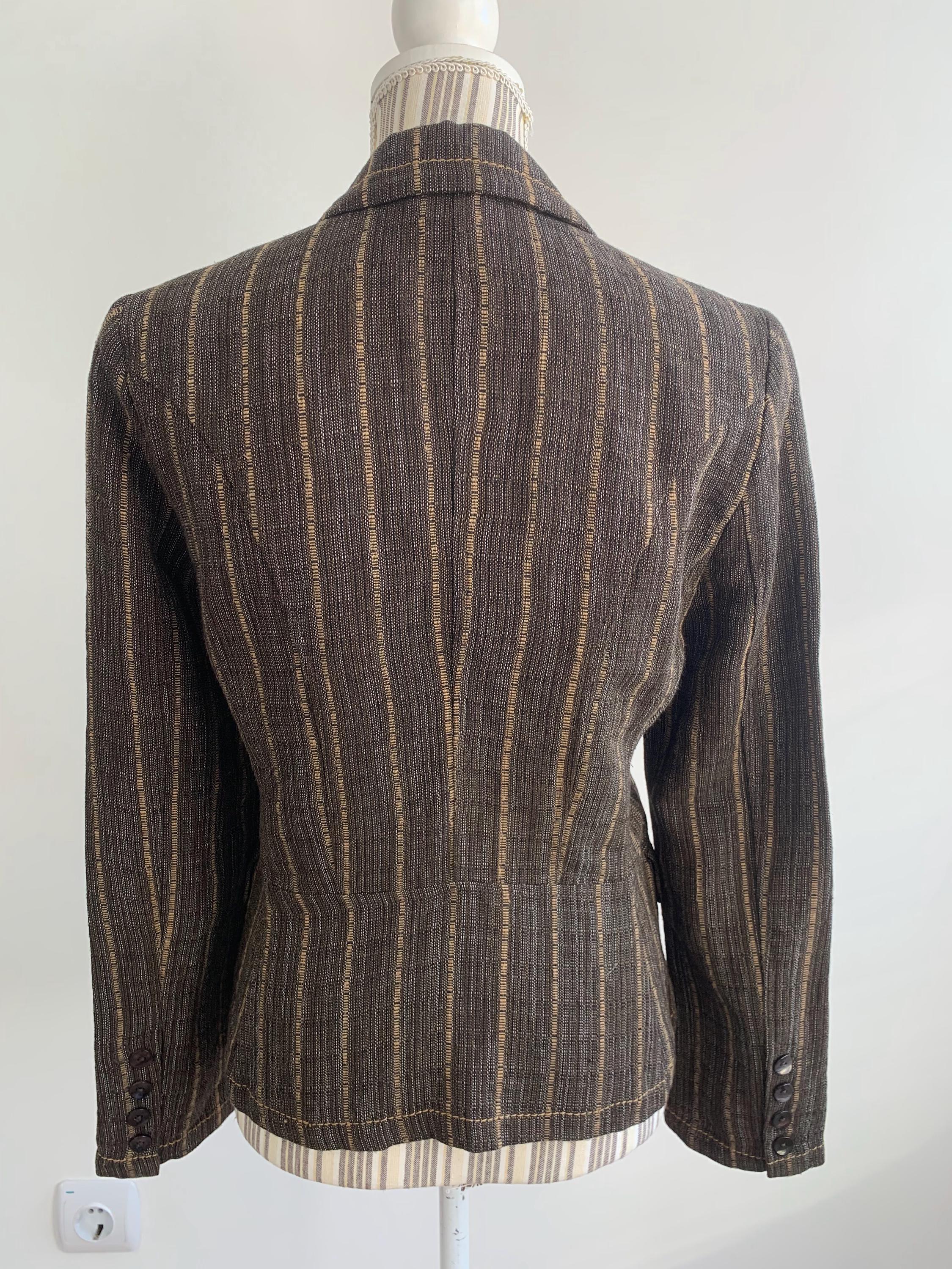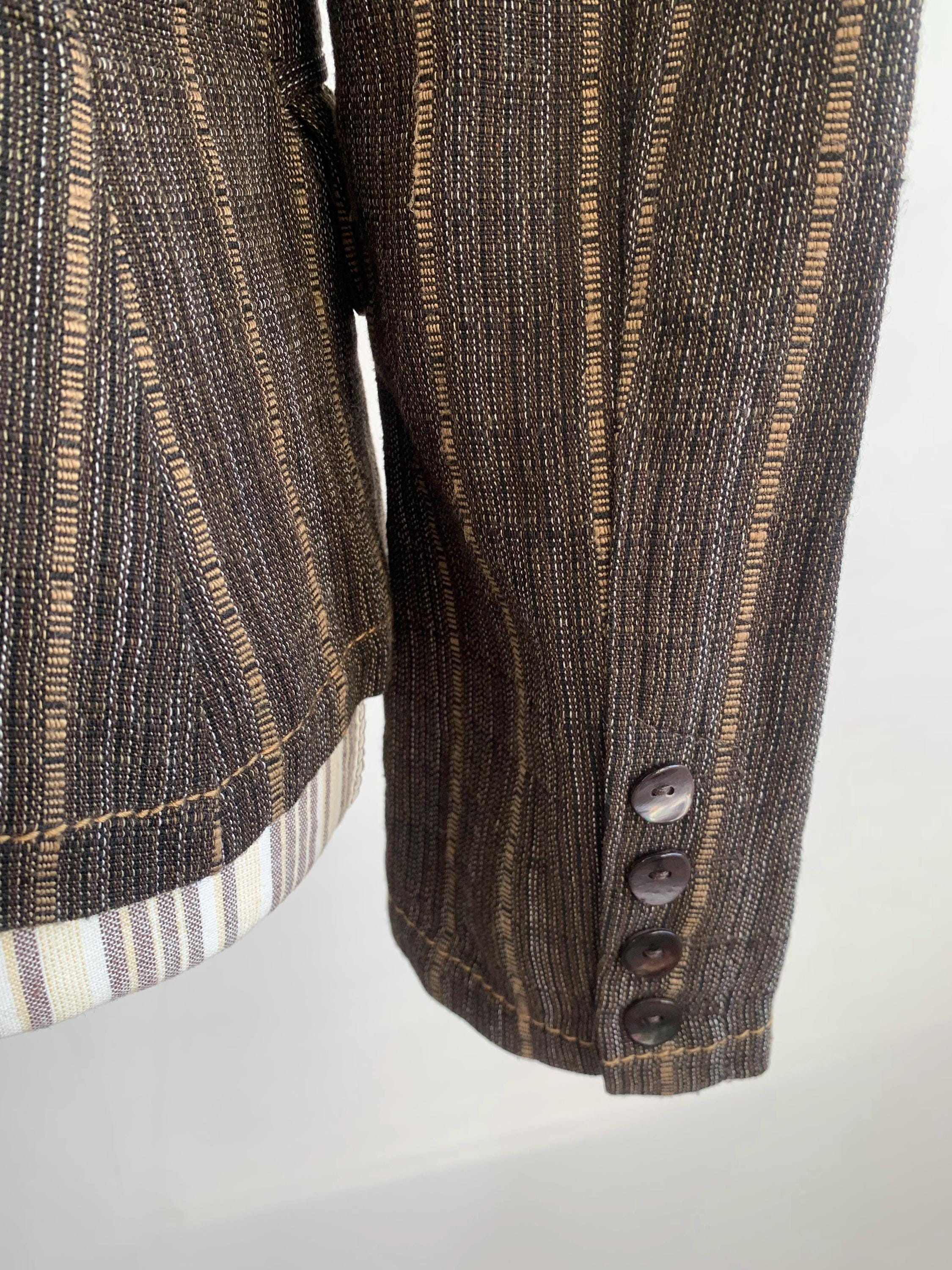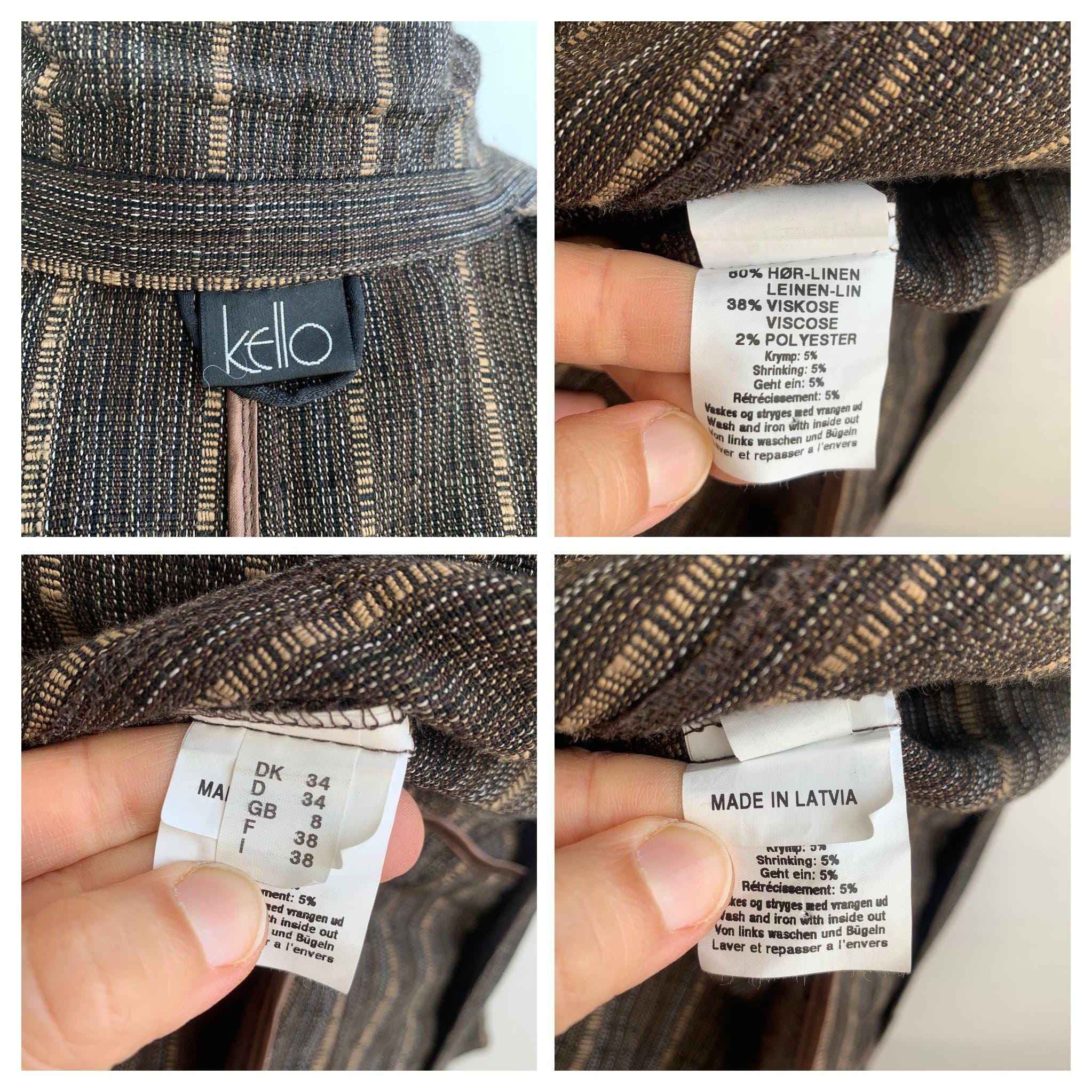 Keep it cozy and chic with this vintage 90s linen blend blazer jacket for women. This buttoned collared blazer has a slim fit silhouette and button front closure with two pockets. This casual classic linen blazer is made of unlined linen blend fabric in taupe brown with vertical stripes in camel color. The size marked is DK 34, D 34, GB 8, F 38, I 38, it fits like size S. Please check the measurements below.