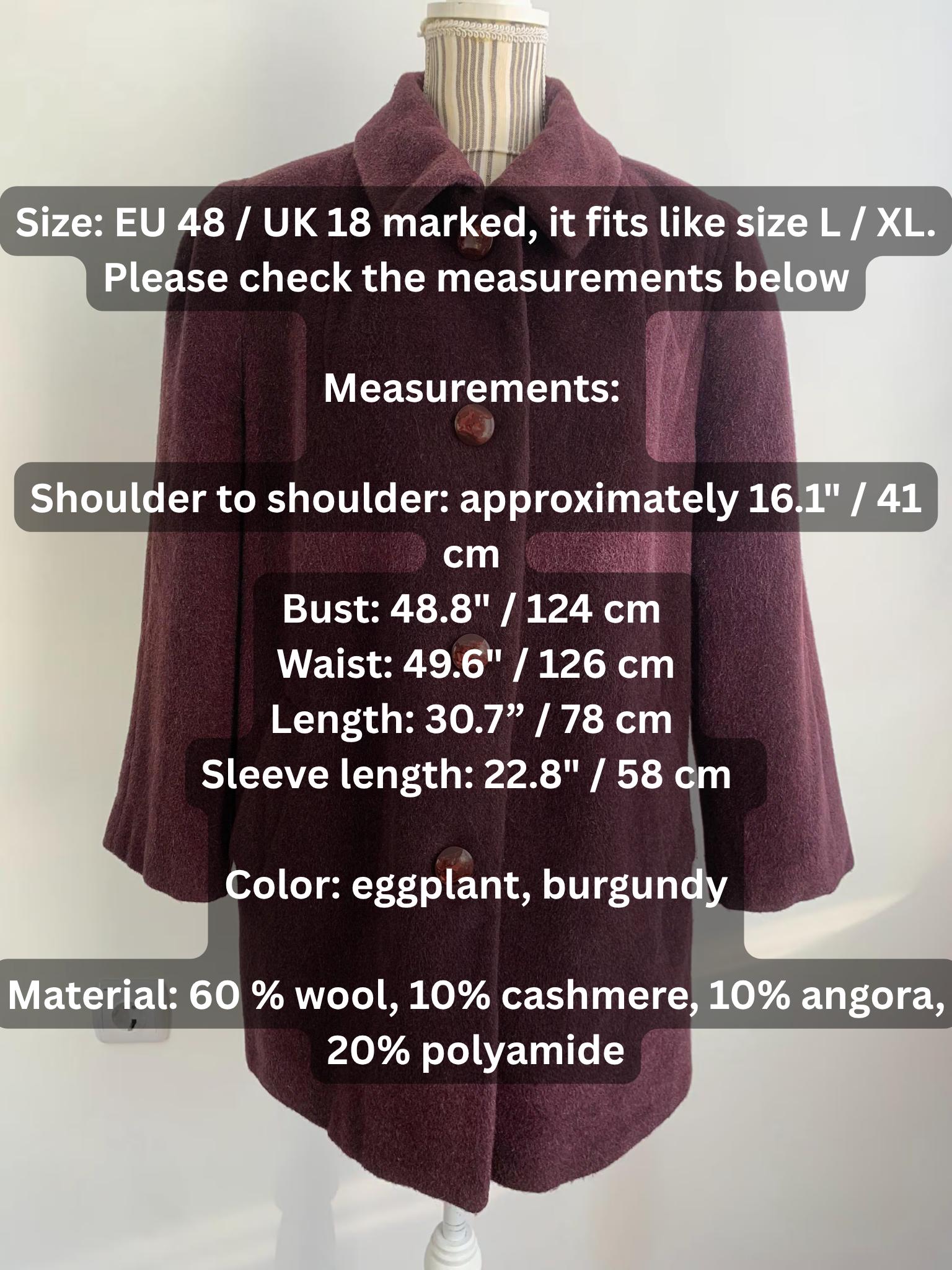 This luxurious vintage Kalfe wool coat is a rare find, crafted in Spain from a premium blend of 60% wool, 10% cashmere, and 10% angora for incredible softness and warmth. Featuring a rich eggplant burgundy hue and a relaxed, oversized silhouette, this mid-length overcoat is a sophisticated staple for a high-end minimalist or retro-inspired winter wardrobe.