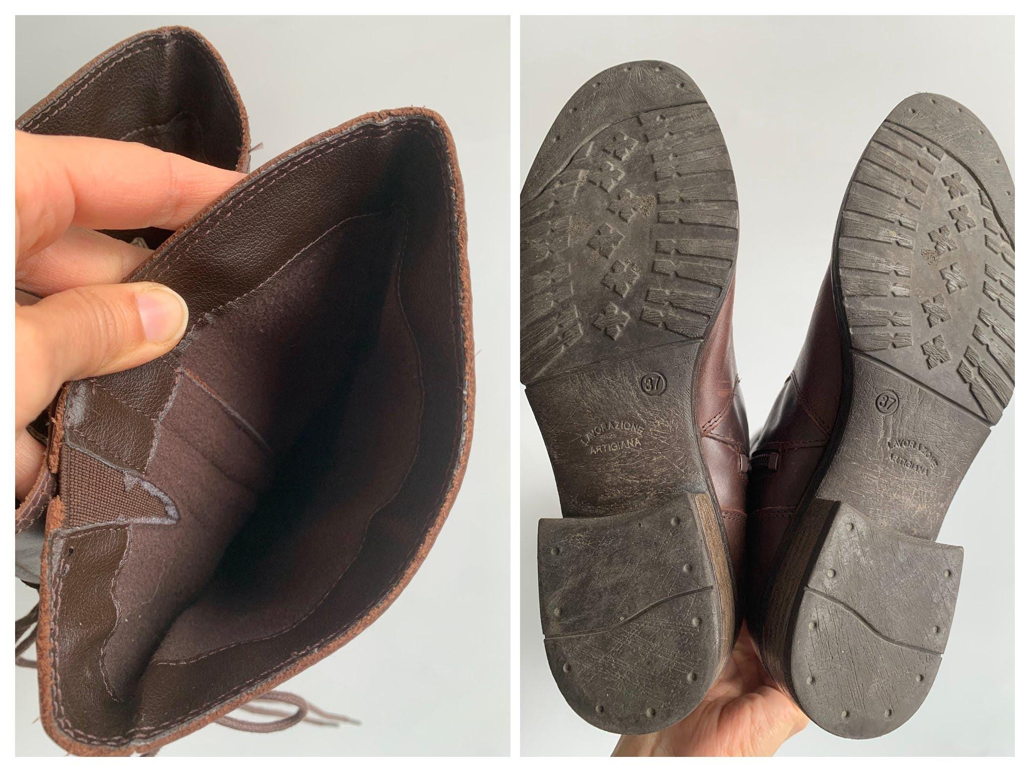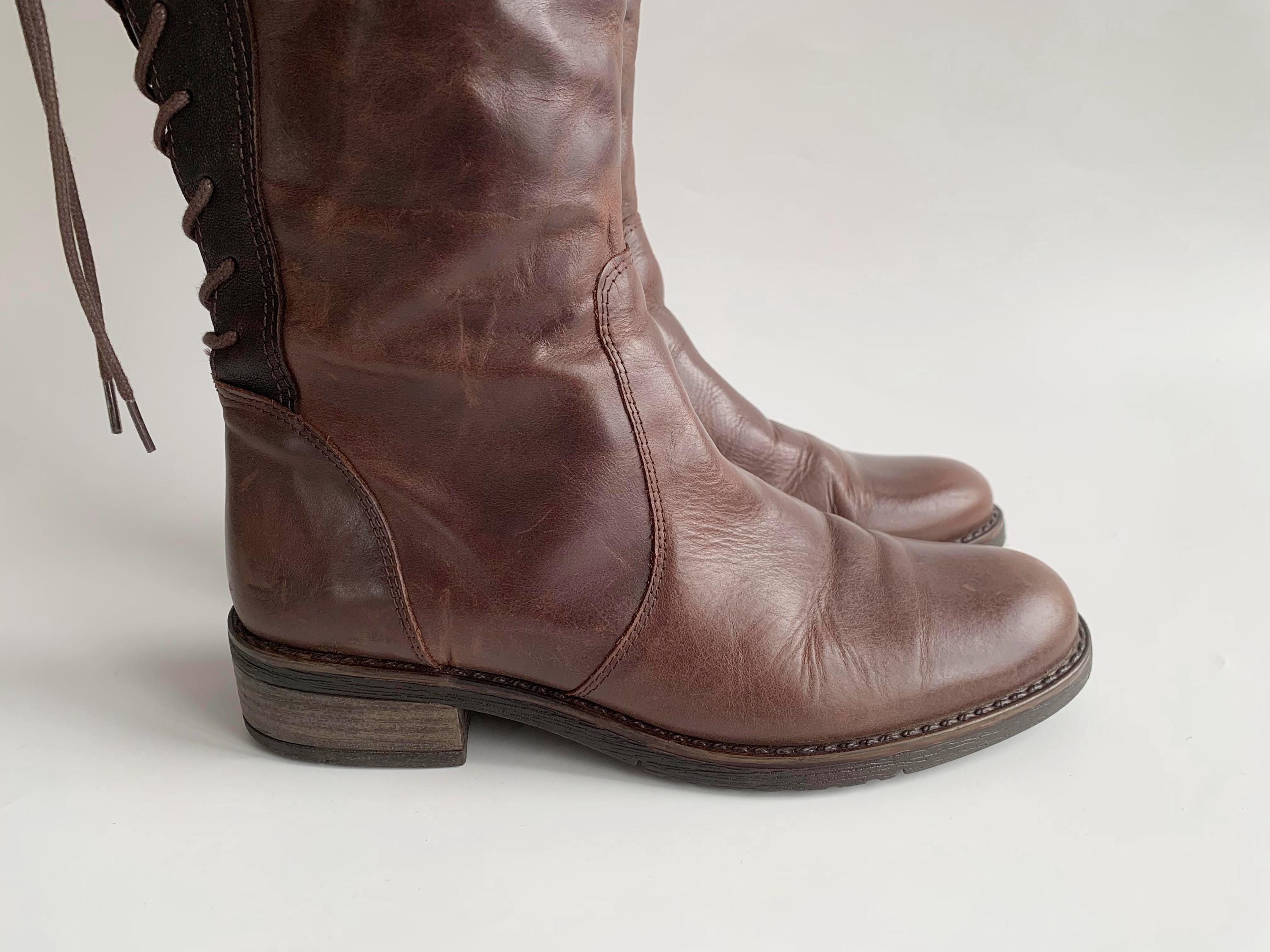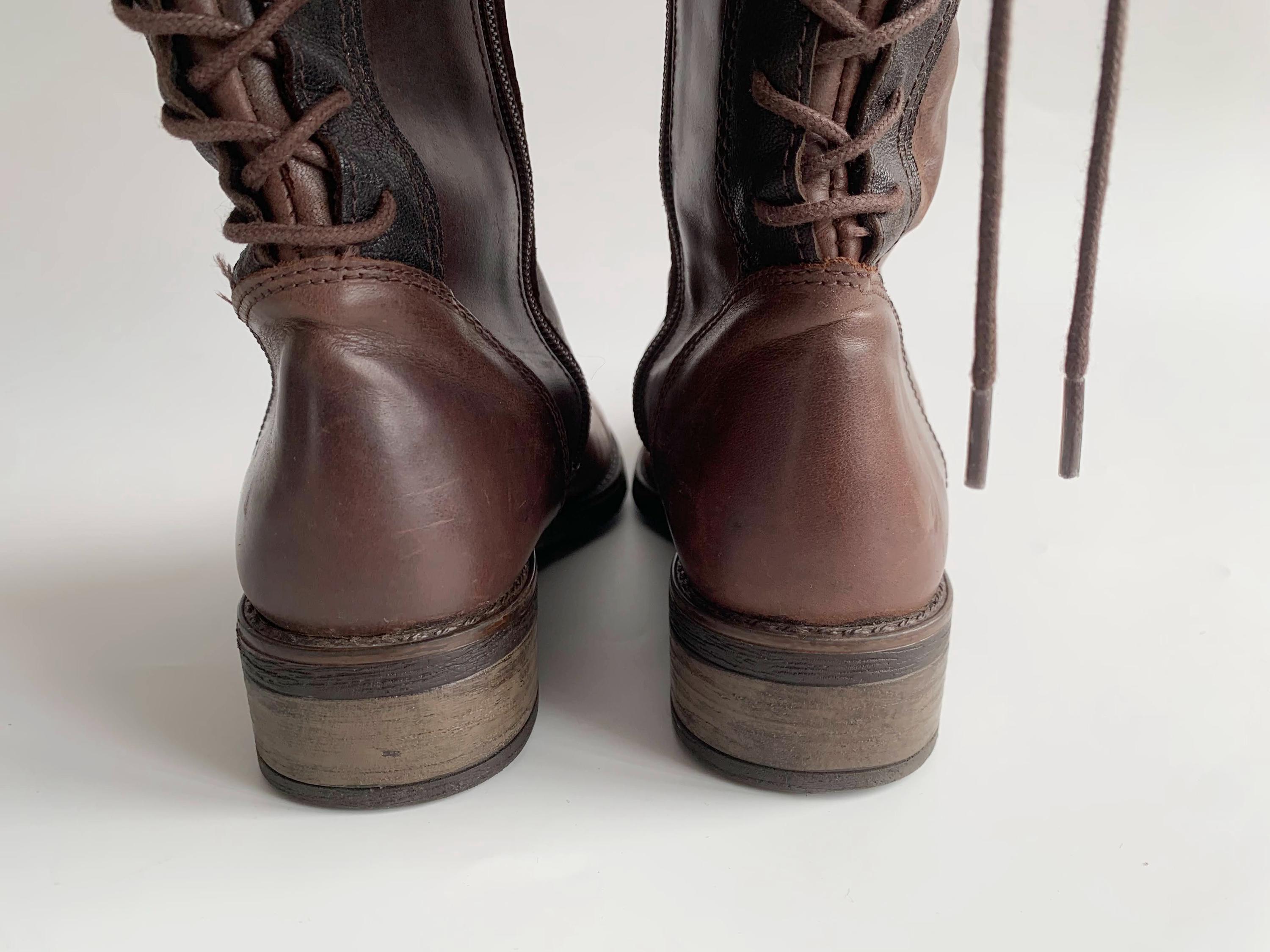 These are vintage 90s western style brown leather boots for women with low sacked heels, zip up closure and lace up back. These low riding boots are made of genuine leather which has a heavily distressed look due to the wear. The leather shows multiple scratches all over the leather surface. The size marked on these autumn booths is EUR 37, which fits like UK 4.5, US 6.5. These worn leather boots for women are quite comfortable to wear with the non slip rubber soles and felted lining. These western style boots have a leather lining. Perfect distressed all weather boots.