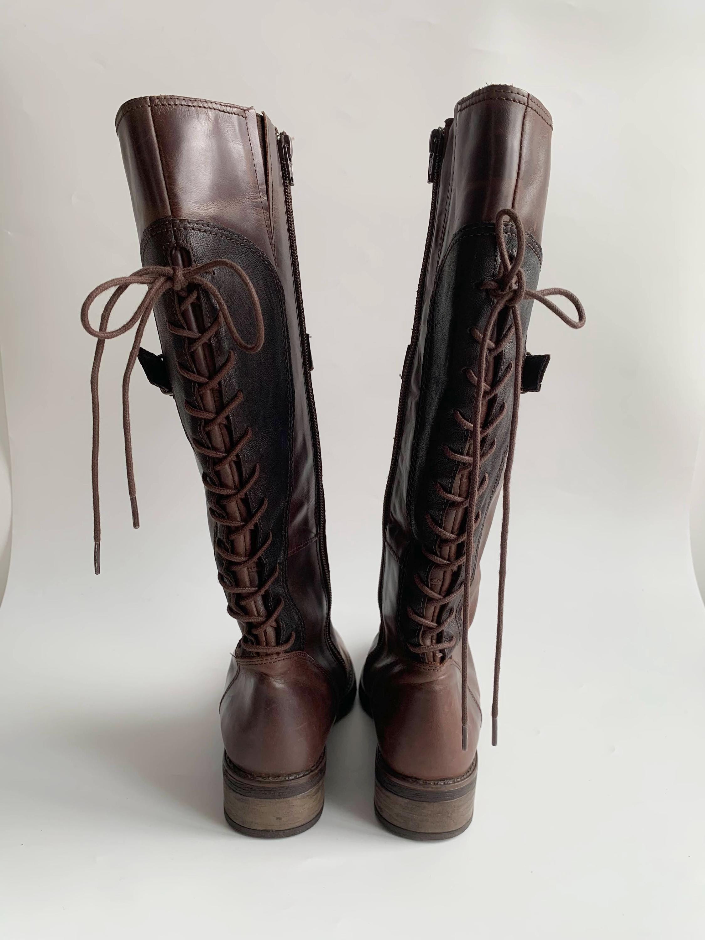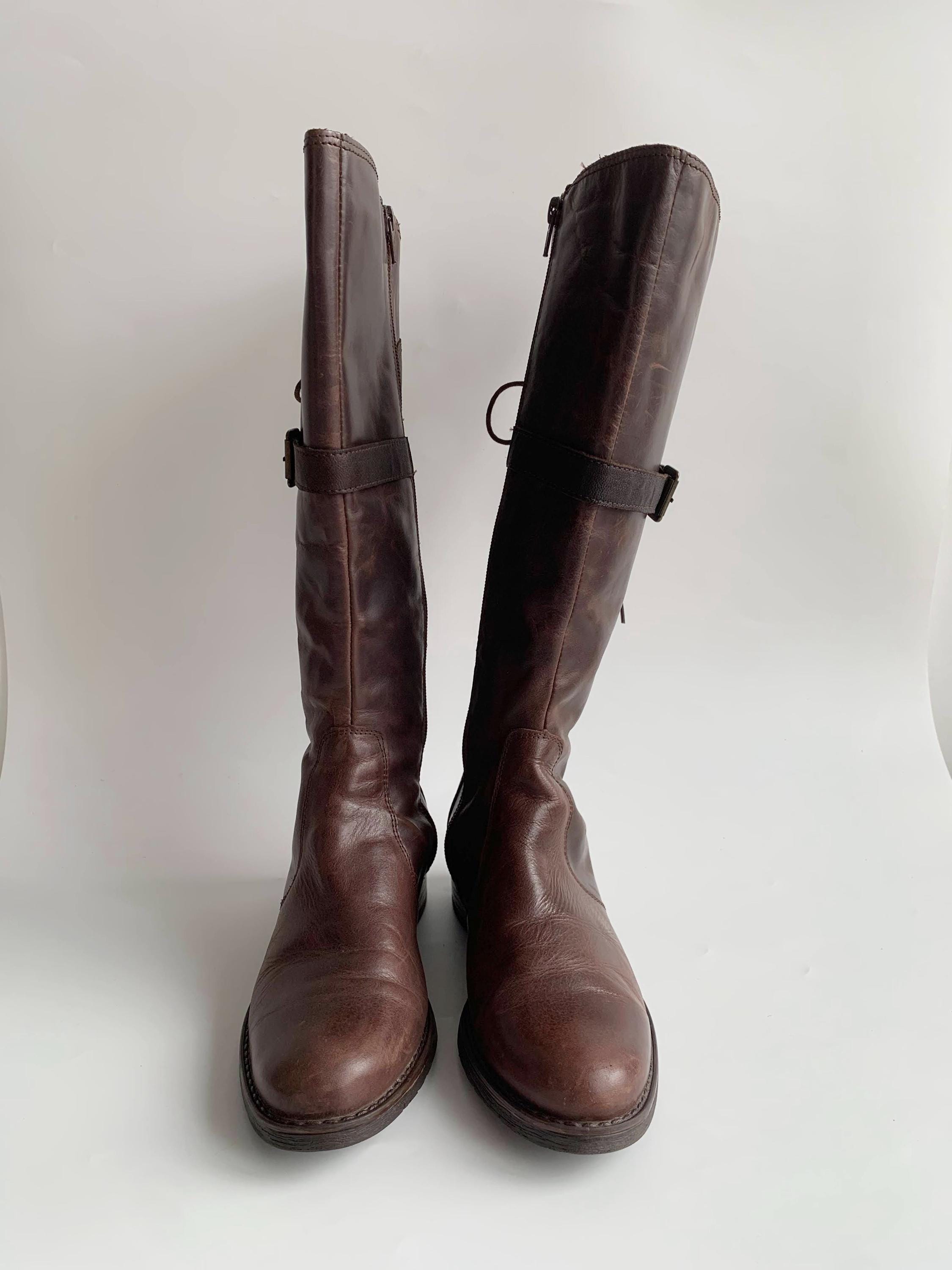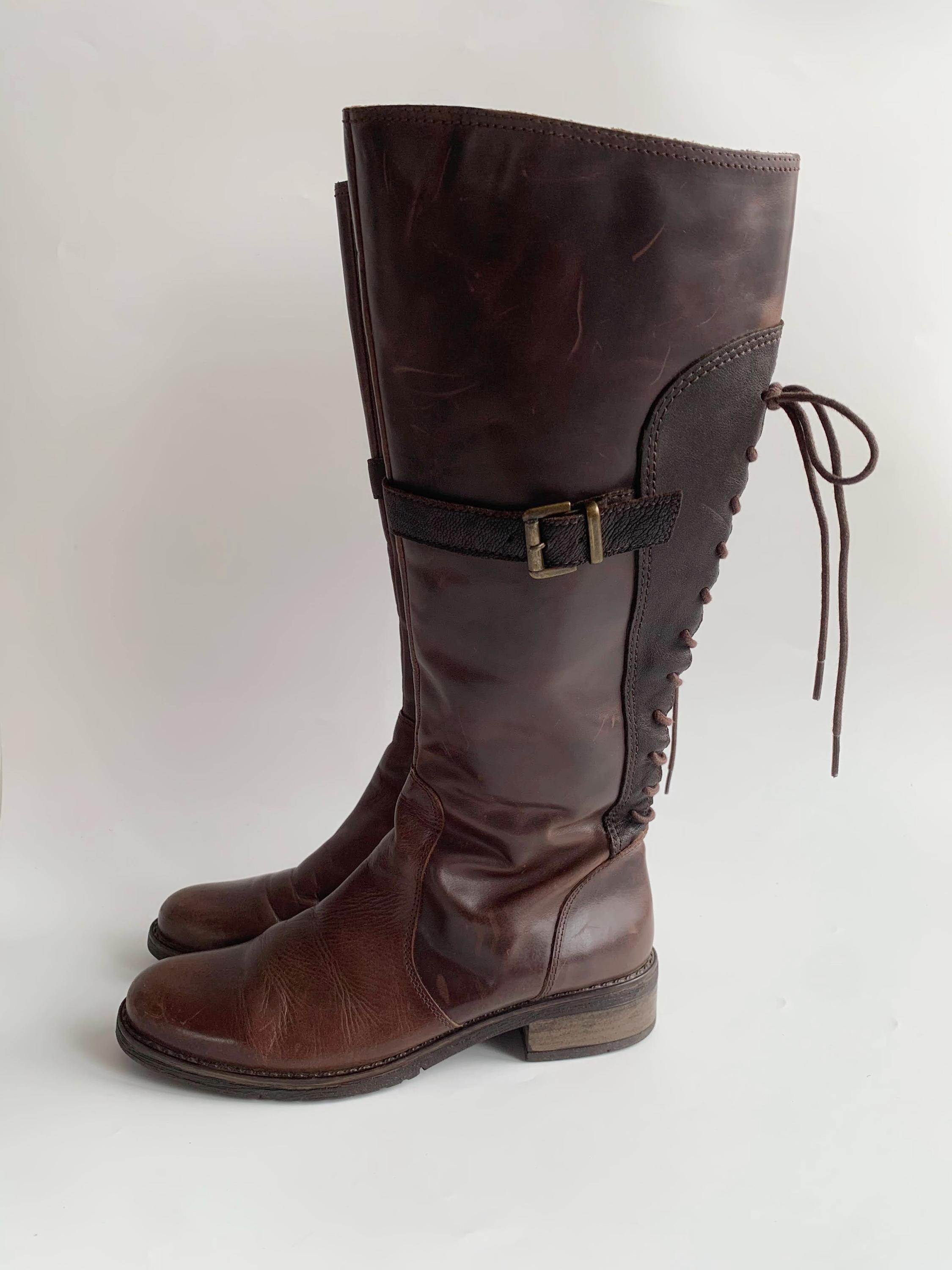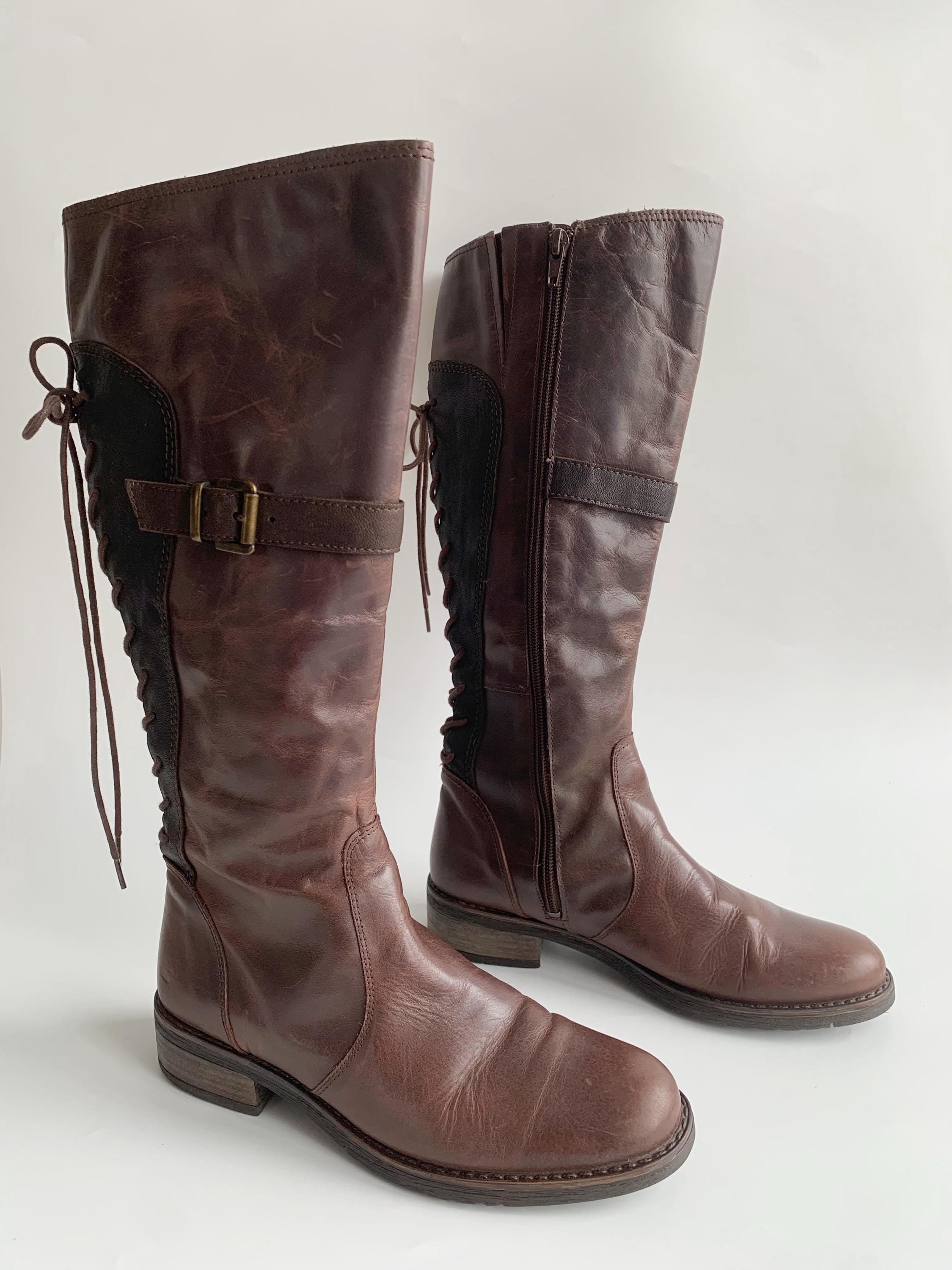 These are vintage 90s western style brown leather boots for women with low sacked heels, zip up closure and lace up back. These low riding boots are made of genuine leather which has a heavily distressed look due to the wear. The leather shows multiple scratches all over the leather surface. The size marked on these autumn booths is EUR 37, which fits like UK 4.5, US 6.5. These worn leather boots for women are quite comfortable to wear with the non slip rubber soles and felted lining. These western style boots have a leather lining. Perfect distressed all weather boots.