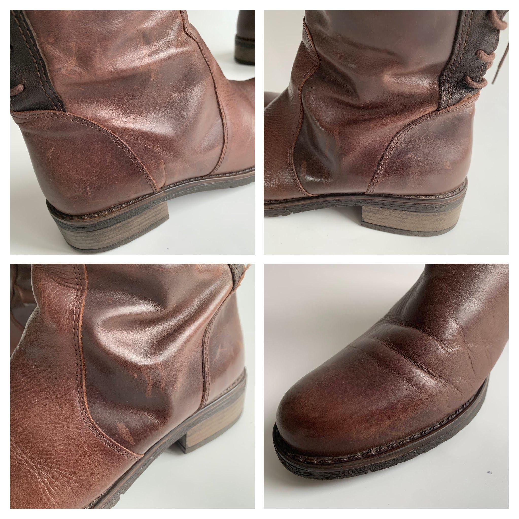 Condition: These low heel boots were well worn and they have a heavily distressed look. There are scratches and marks all over the leather surface.