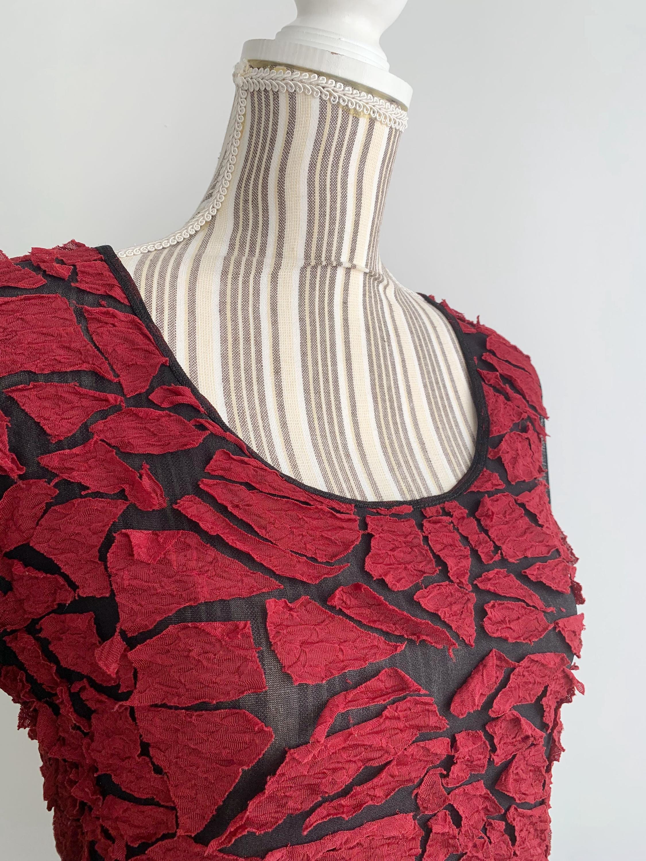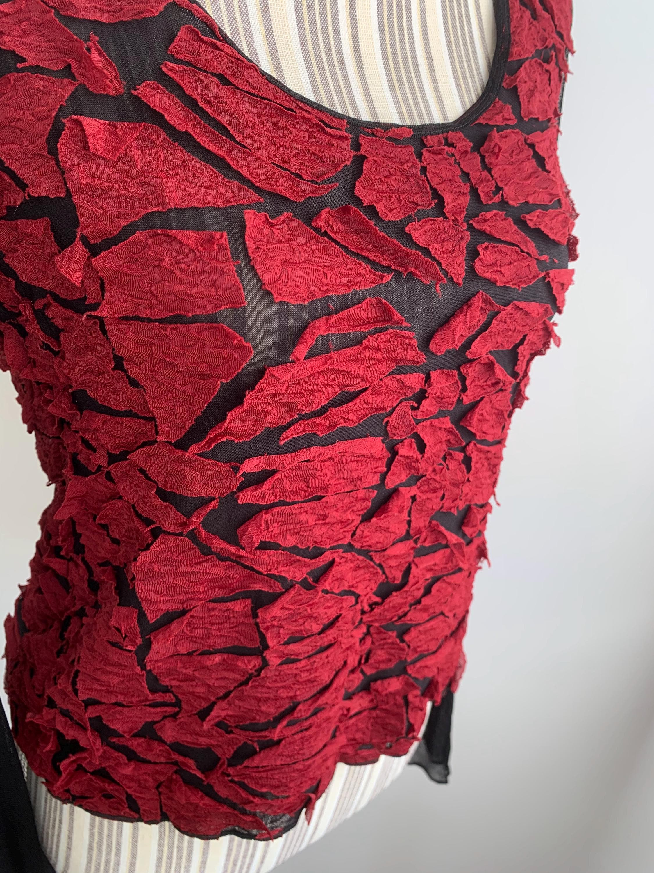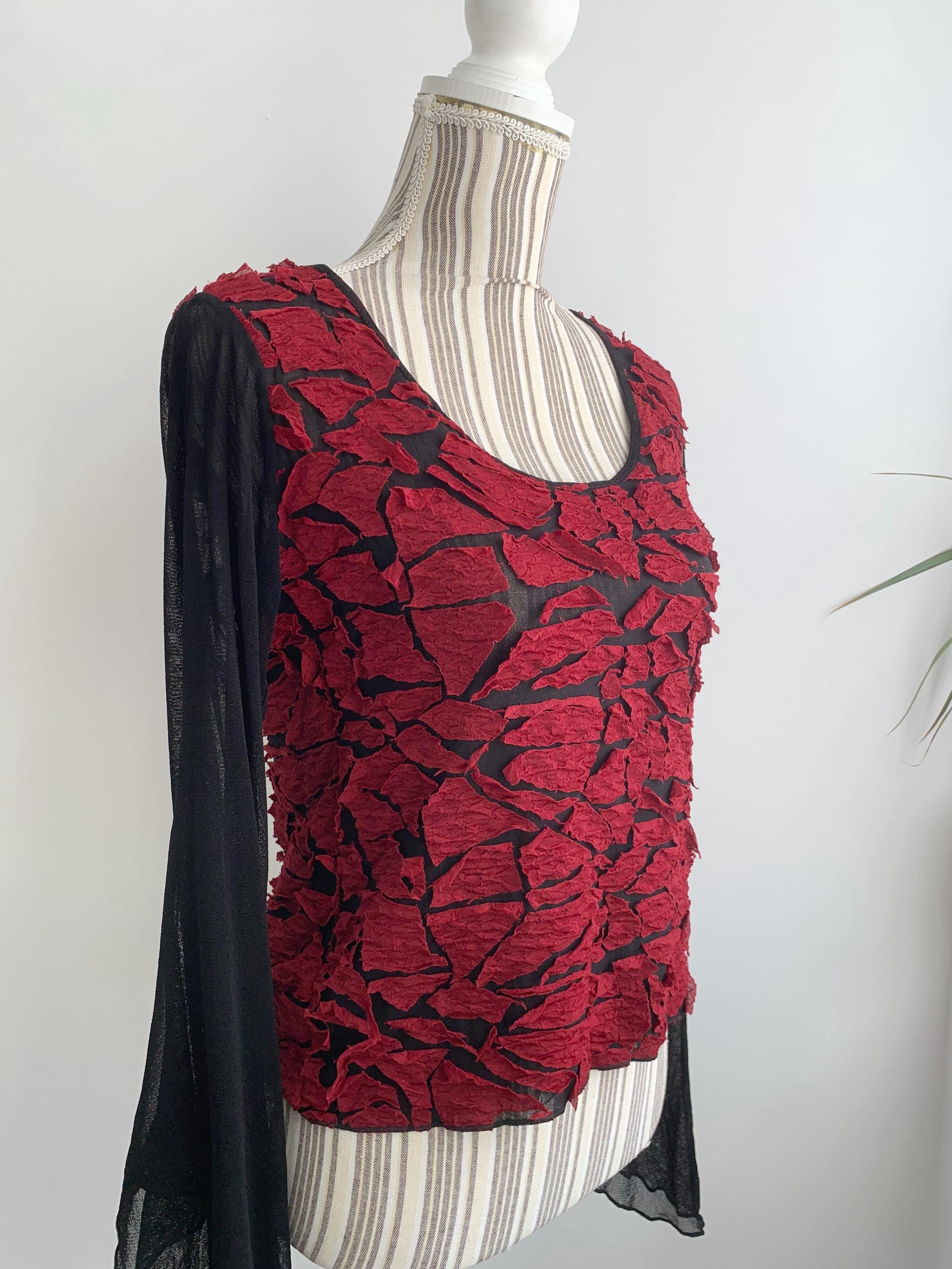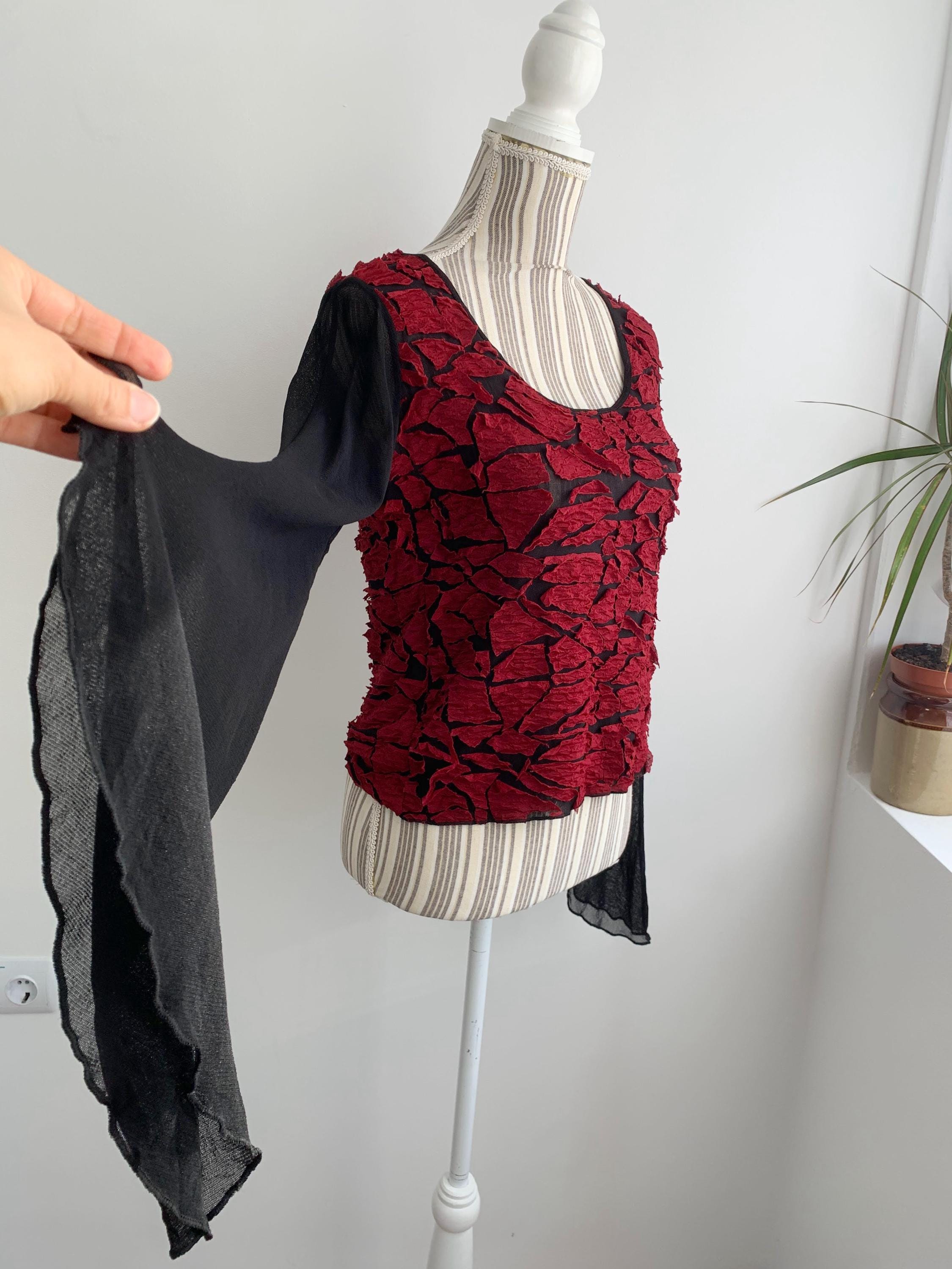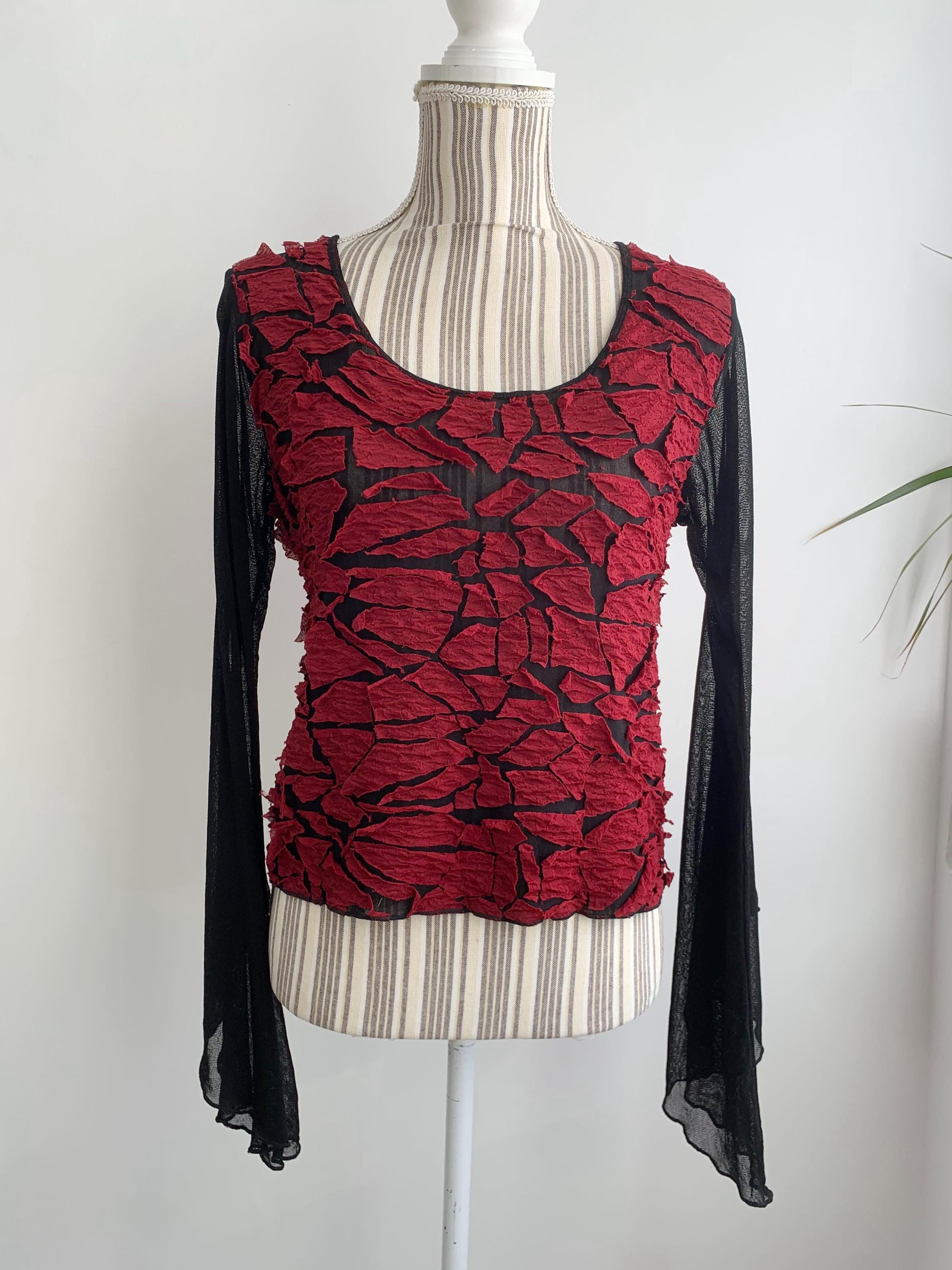 This is a lovely vintage 00s sheer black top for women made of mesh tulle fabric with burgundy red applique decoration. It is made of lightweight stretchy polyester/rayon blend fabric. This grunge blouse has lovely long flare sleeves. The size marked is XL, however it would best fit size M to L. It has a good bit of stretch. Beautiful vintage blouse that will add some feminine look to your closet.
