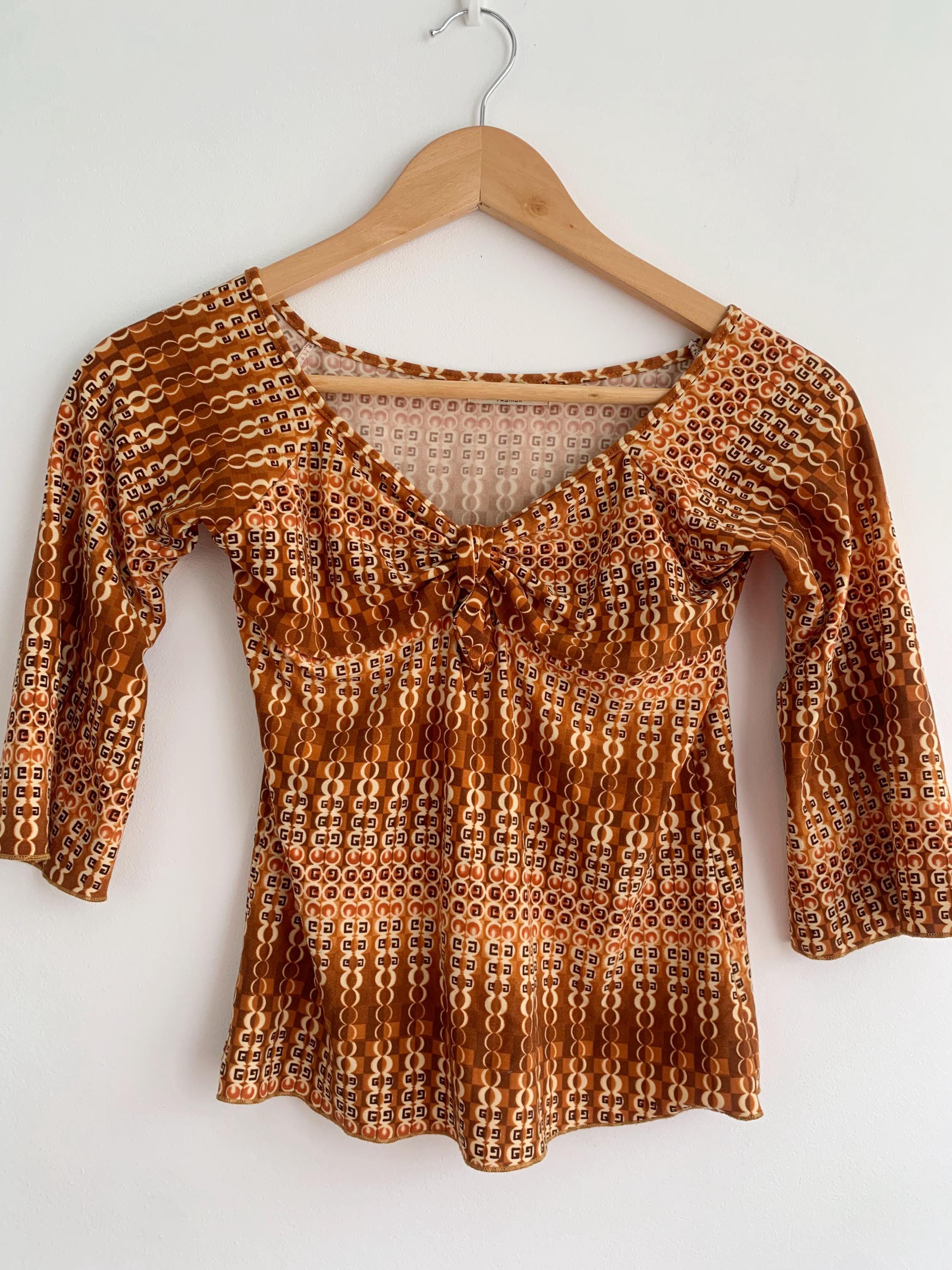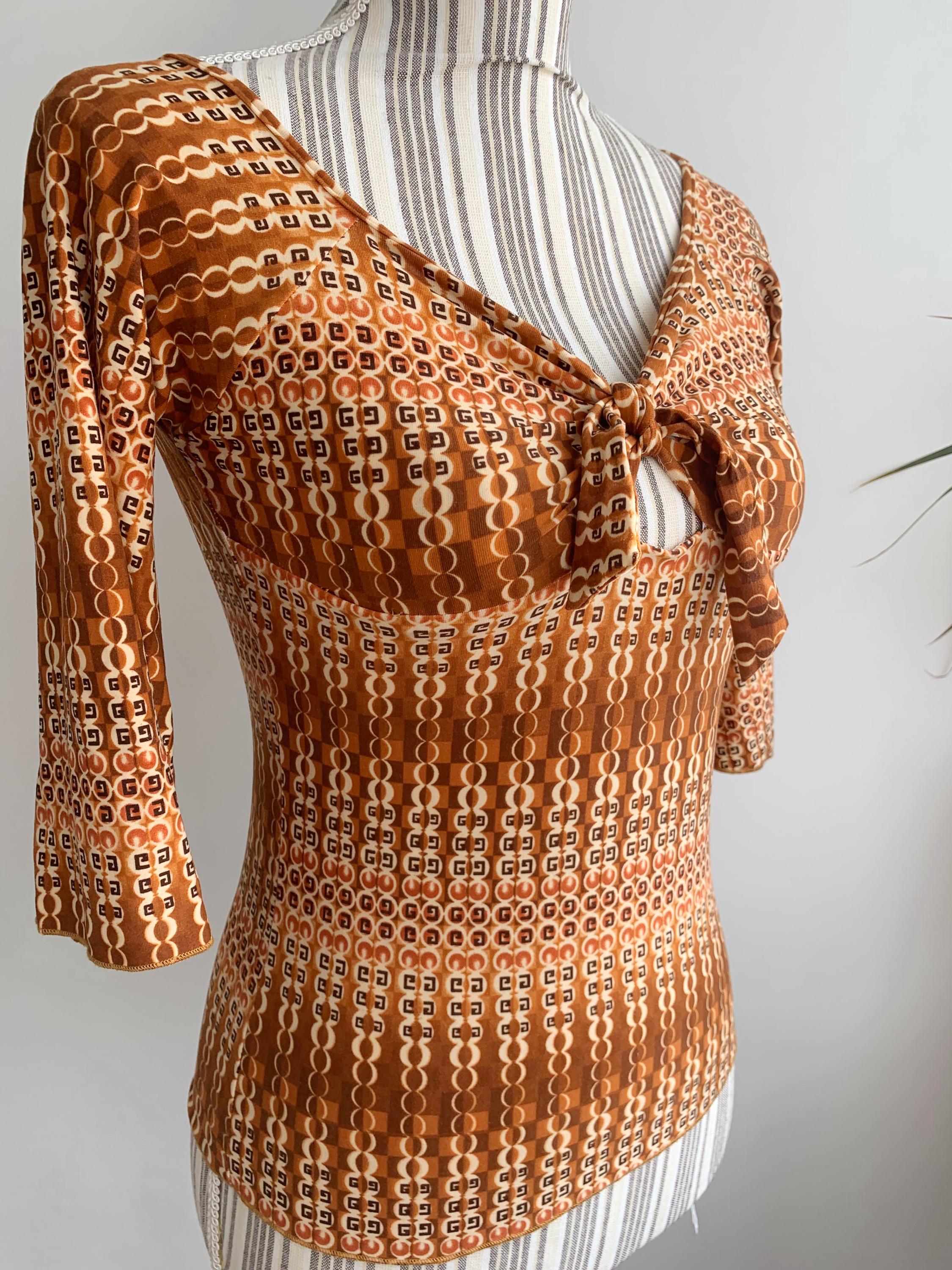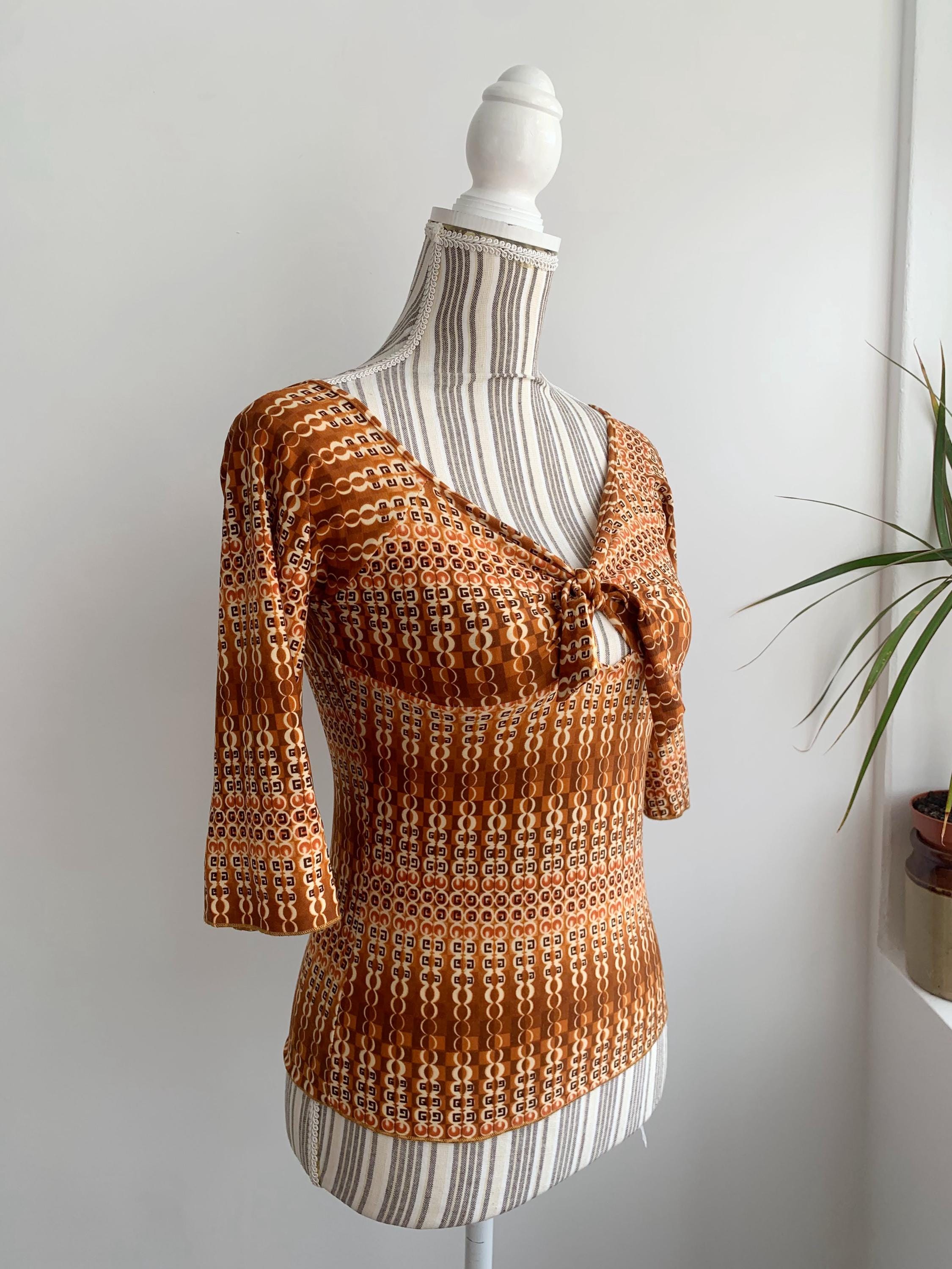 This is a lovely vintage 90s grunge blouse for women in beige orange brown color with funky 70s style novelty print. It is made of stretchy polyamide or polyester fabric which beautifully embraces your body (there is no materials label). This elastic half sleeve top will shape your curves. This novelty print stretchy skin tight top has sexy V neck with bow tie at the bust and hollowed out opening. It fits like size XXS / XS. It has quite a bit of stretch. Please check the measurements below.