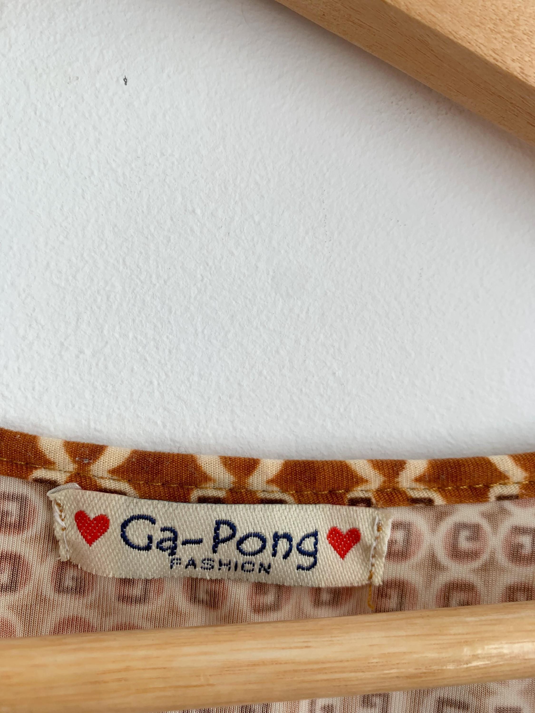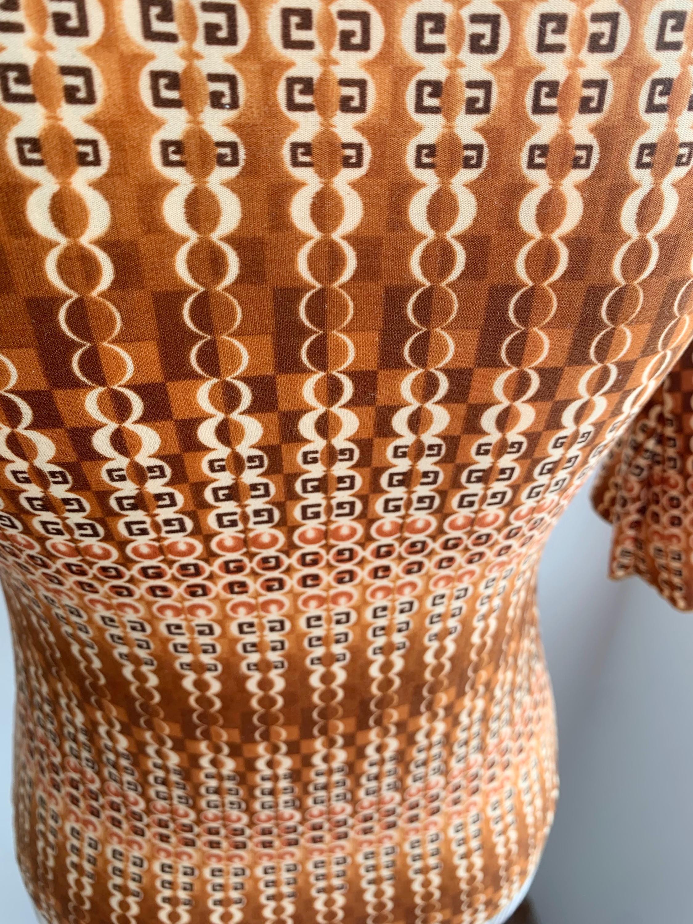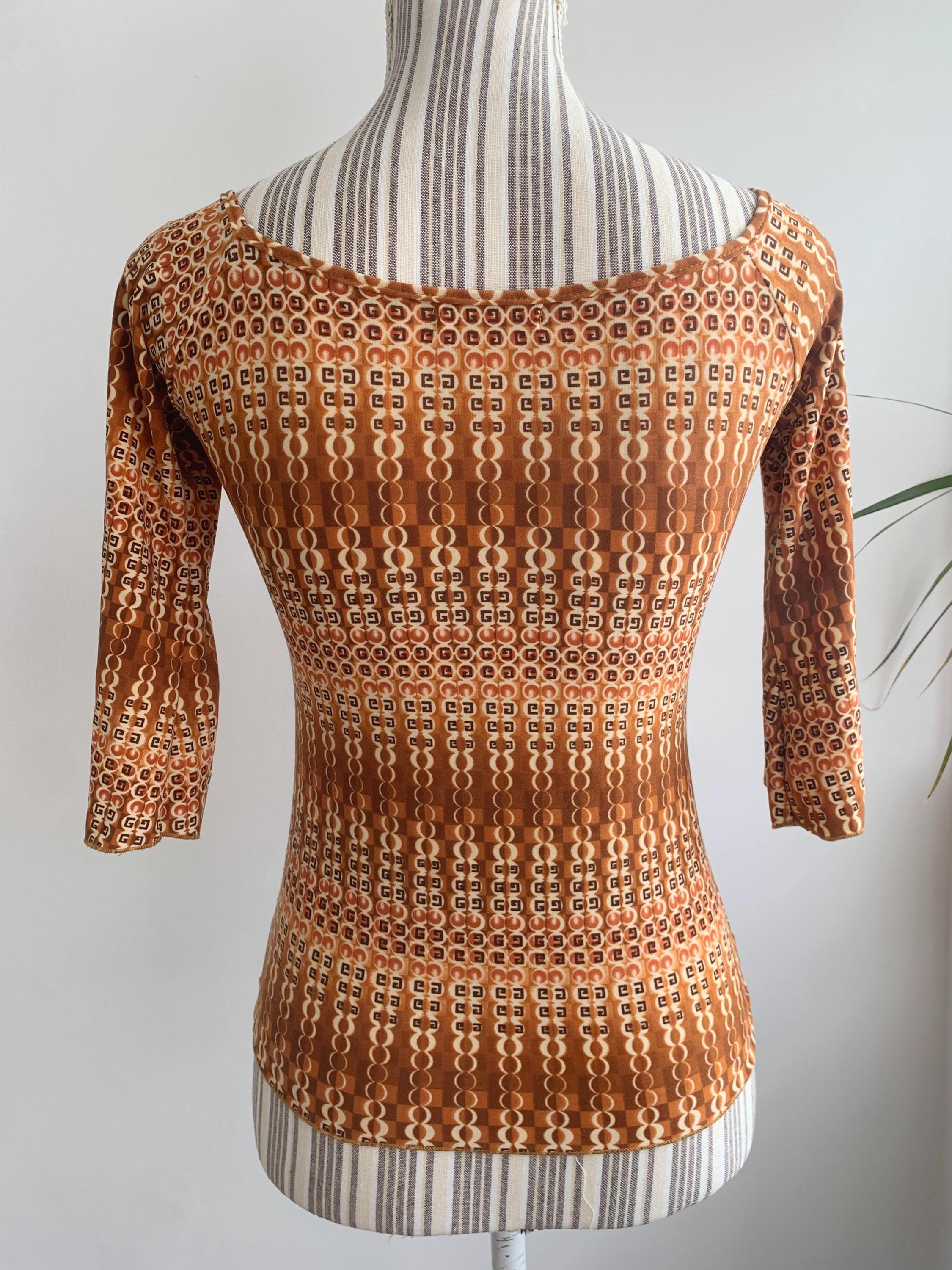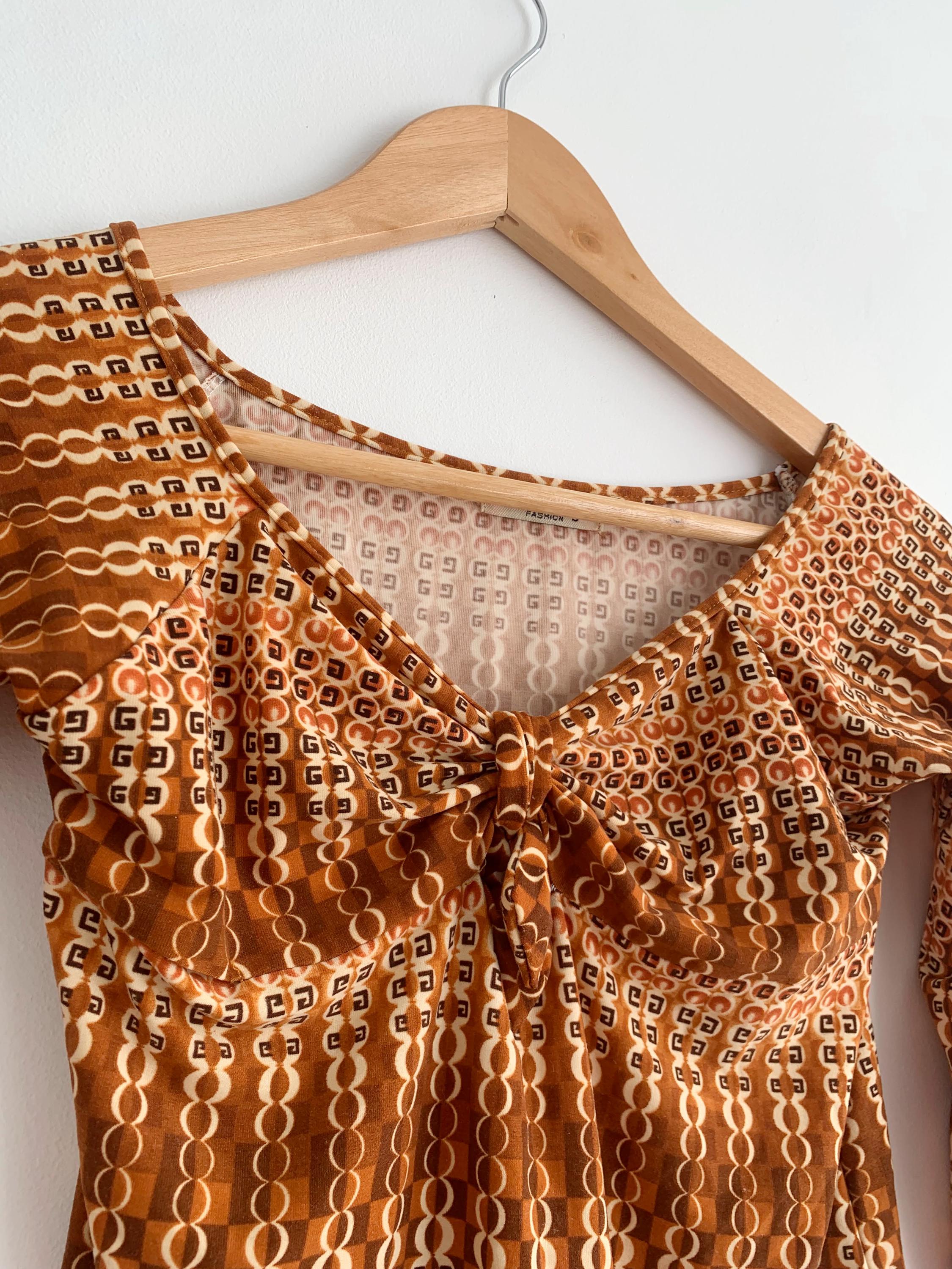 This is a lovely vintage 90s grunge blouse for women in beige orange brown color with funky 70s style novelty print. It is made of stretchy polyamide or polyester fabric which beautifully embraces your body (there is no materials label). This elastic half sleeve top will shape your curves. This novelty print stretchy skin tight top has sexy V neck with bow tie at the bust and hollowed out opening. It fits like size XXS / XS. It has quite a bit of stretch. Please check the measurements below.