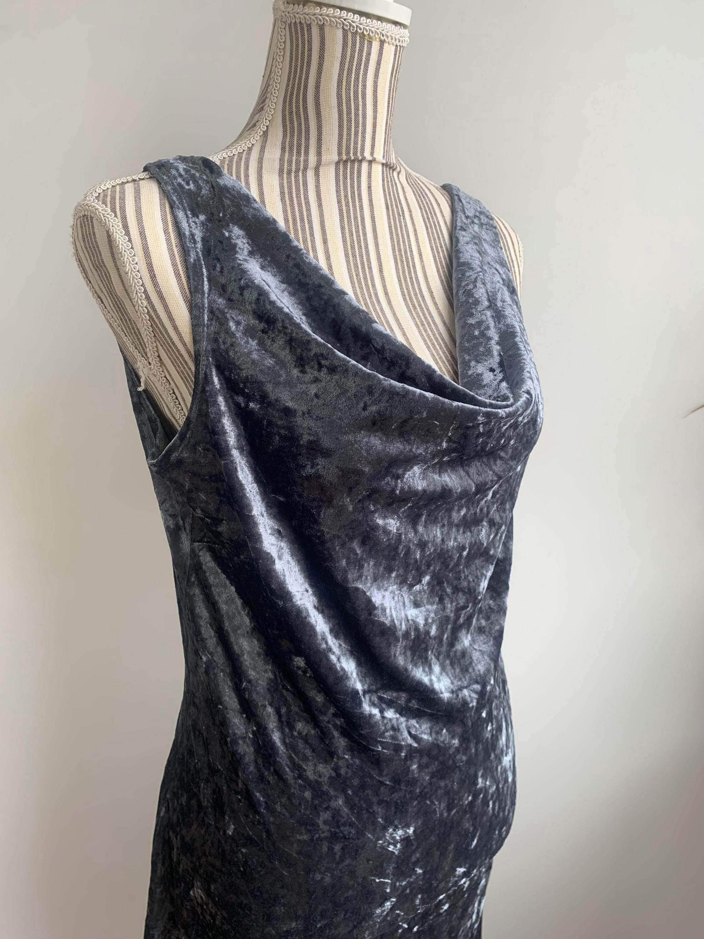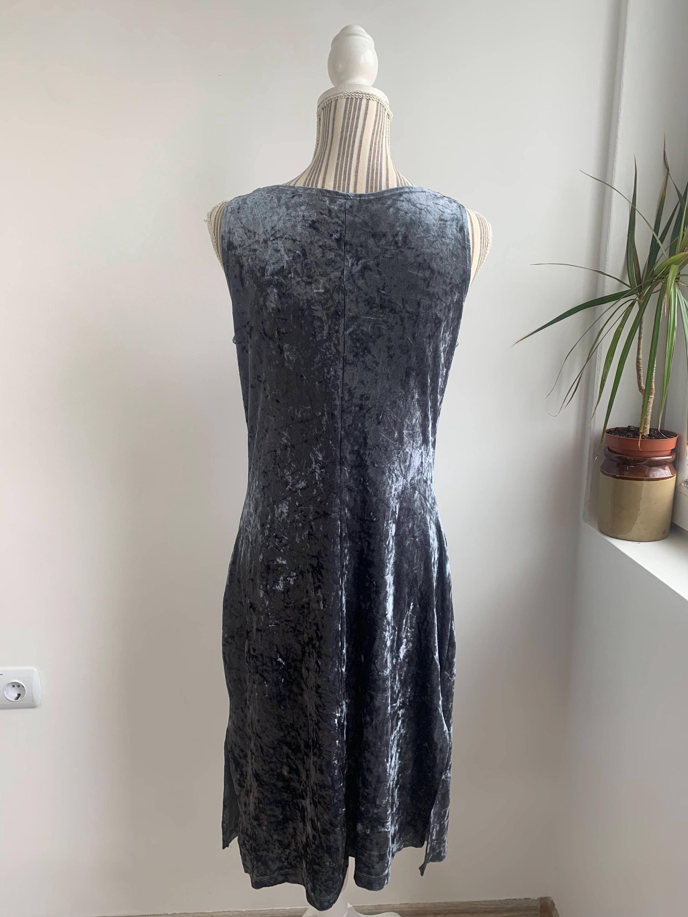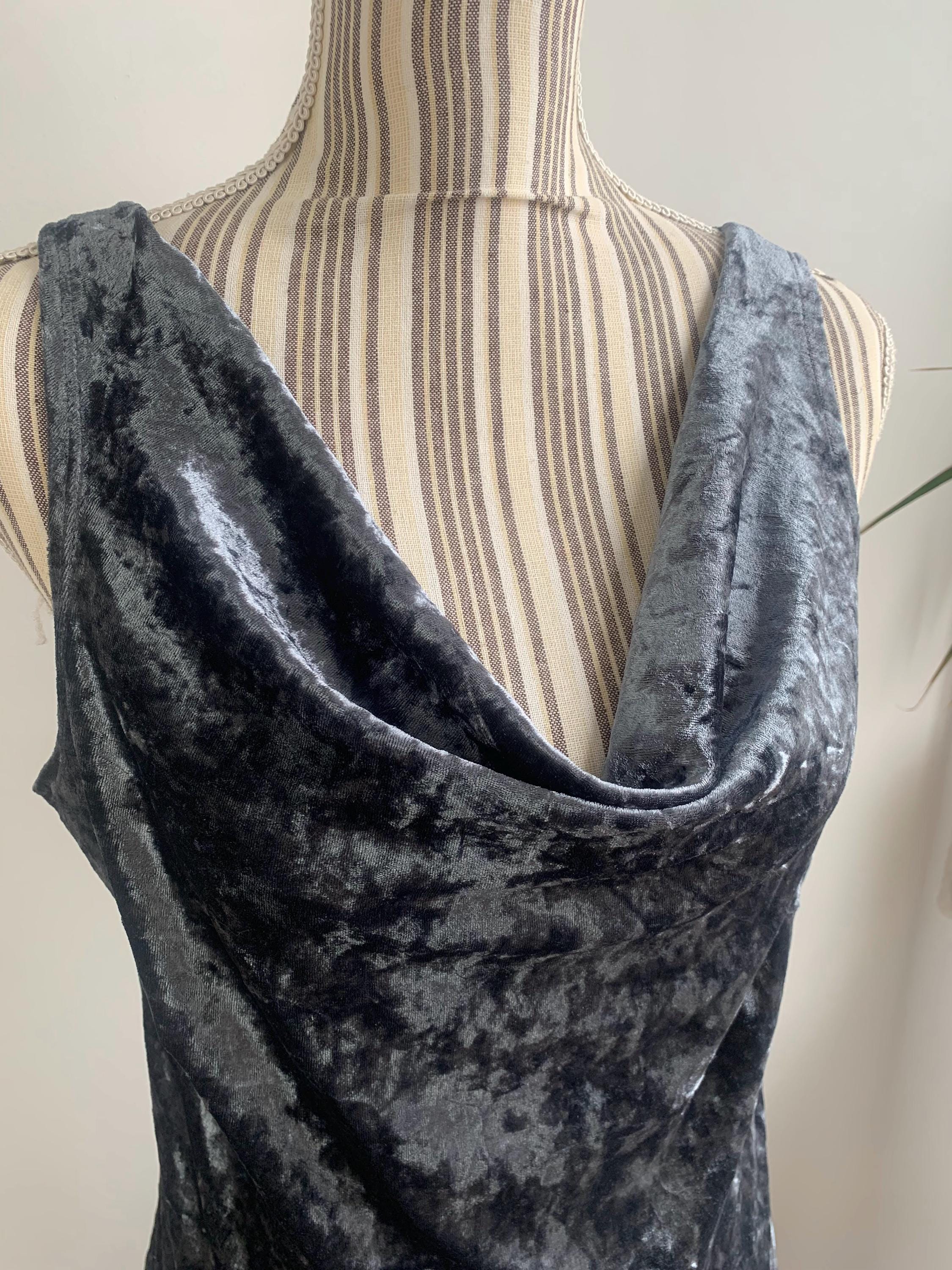 This is a beautiful silver grey crushed velvet sleeveless stretchy cocktail party dress with midi length around the knee, plunge neck and side slit. This elegant evening gown is made of crushed velvet fabric (93% polyester, 7% spandex). The label has faded and the size can not be read, it fits like women's size M/L. Please check the measurements below.