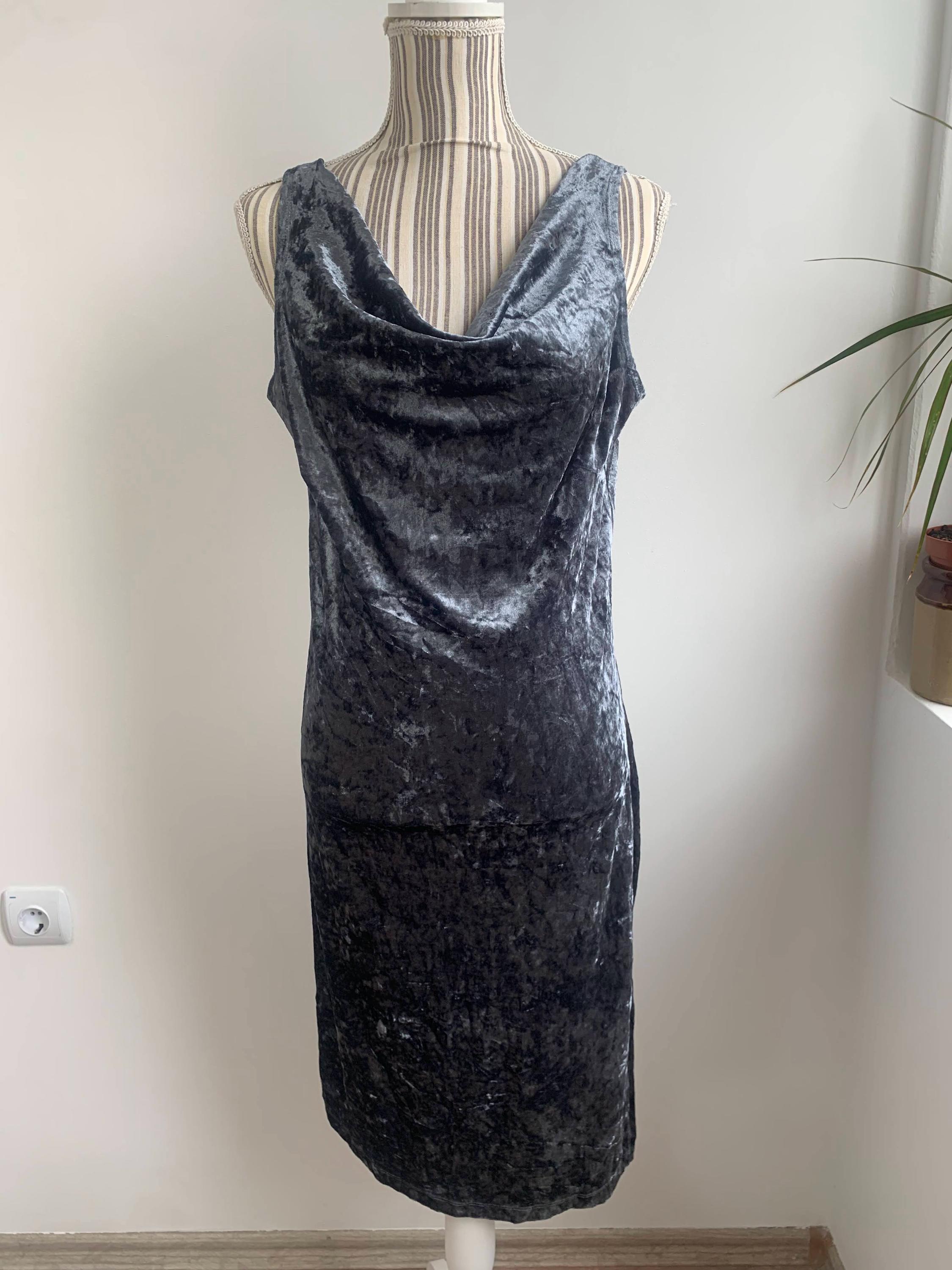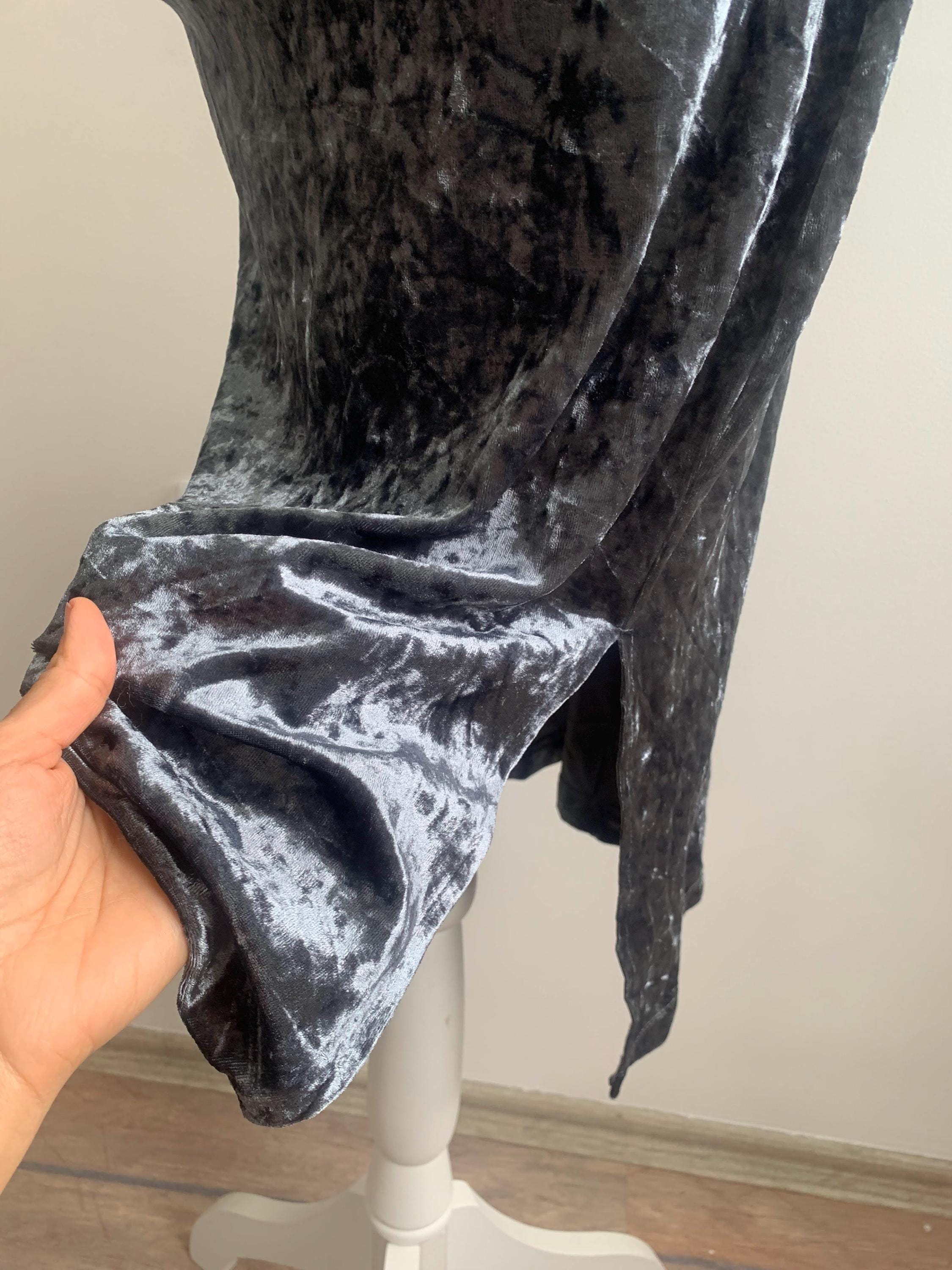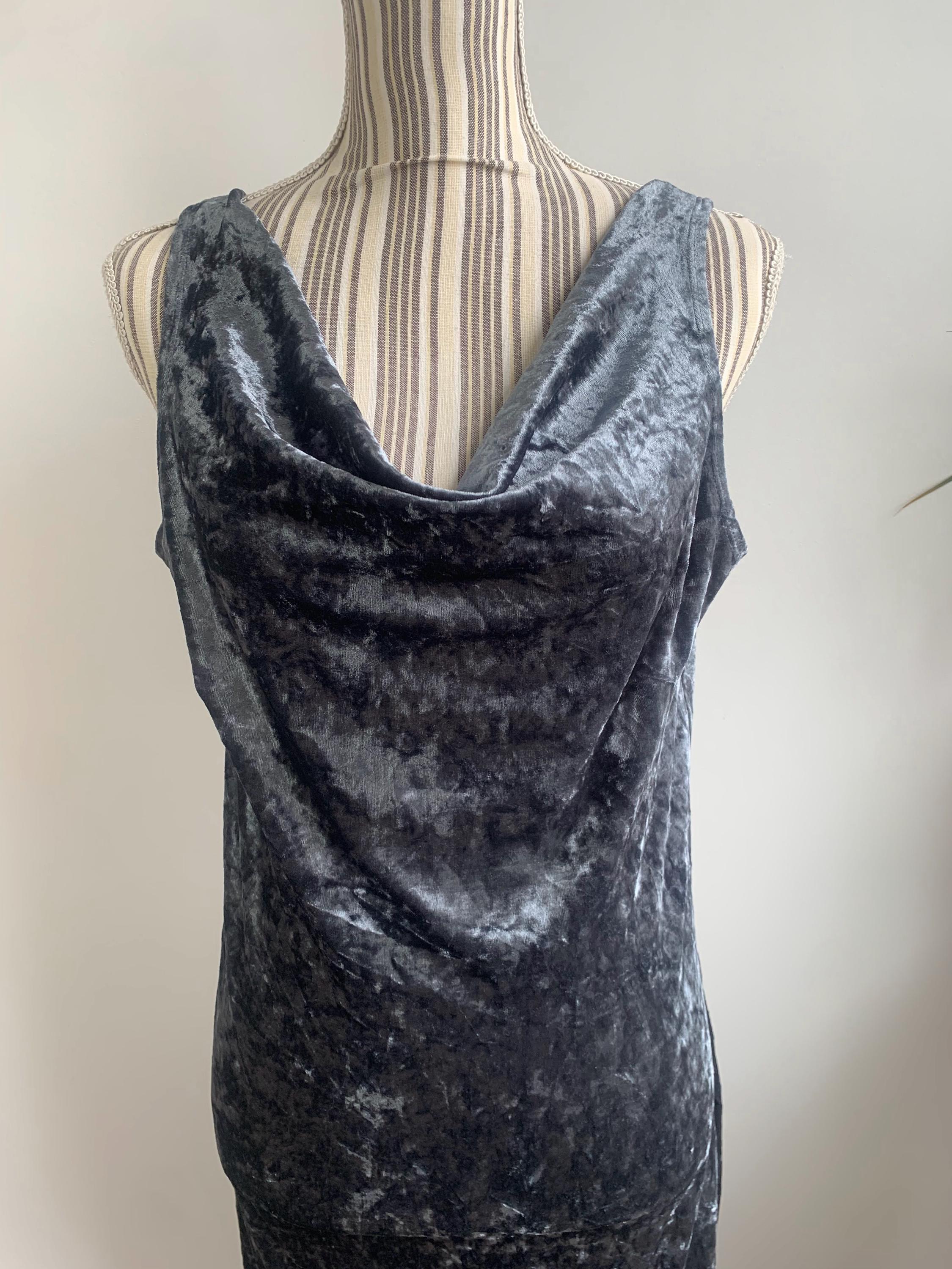 This is a beautiful silver grey crushed velvet sleeveless stretchy cocktail party dress with midi length around the knee, plunge neck and side slit. This elegant evening gown is made of crushed velvet fabric (93% polyester, 7% spandex). The label has faded and the size can not be read, it fits like women's size M/L. Please check the measurements below.