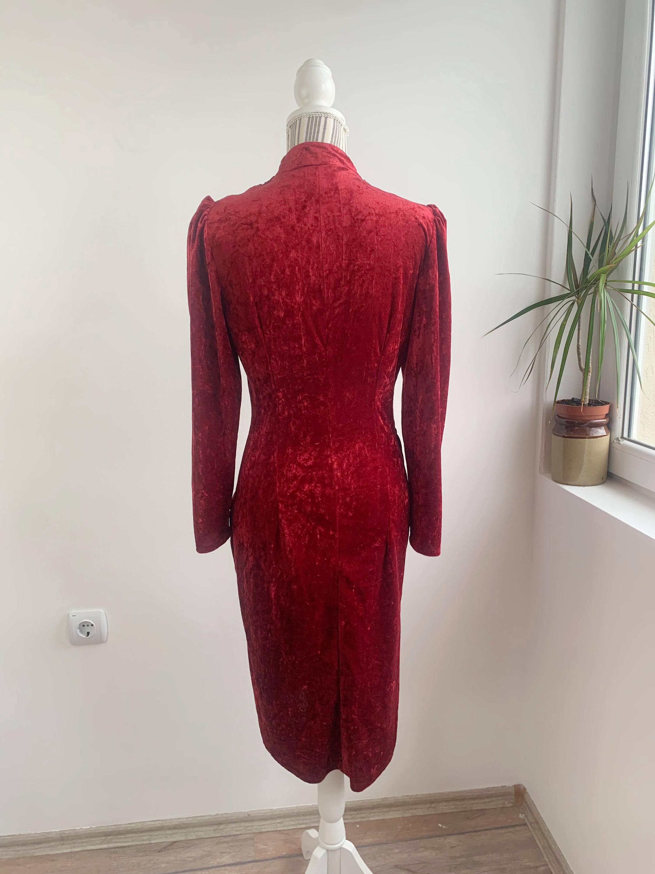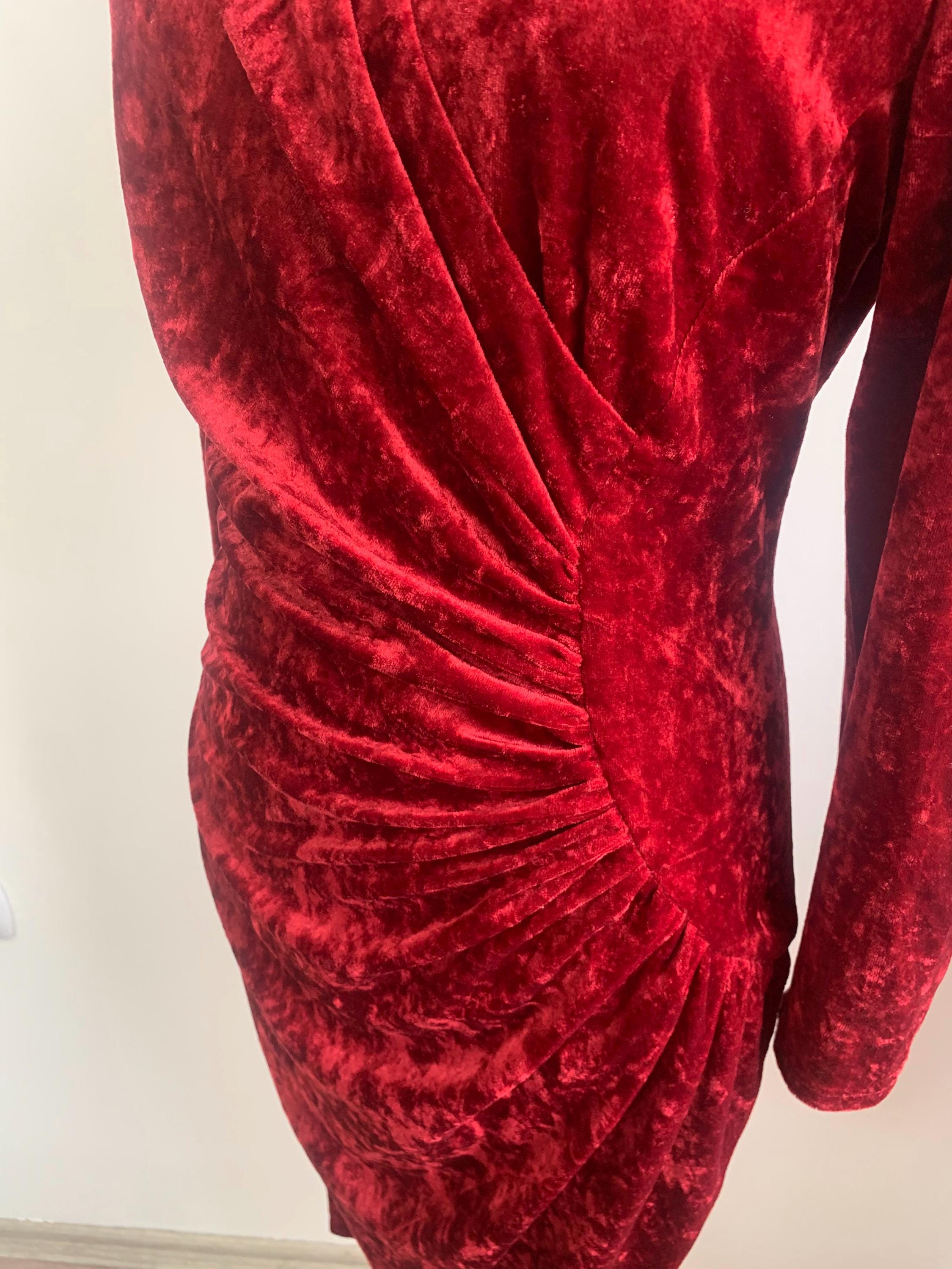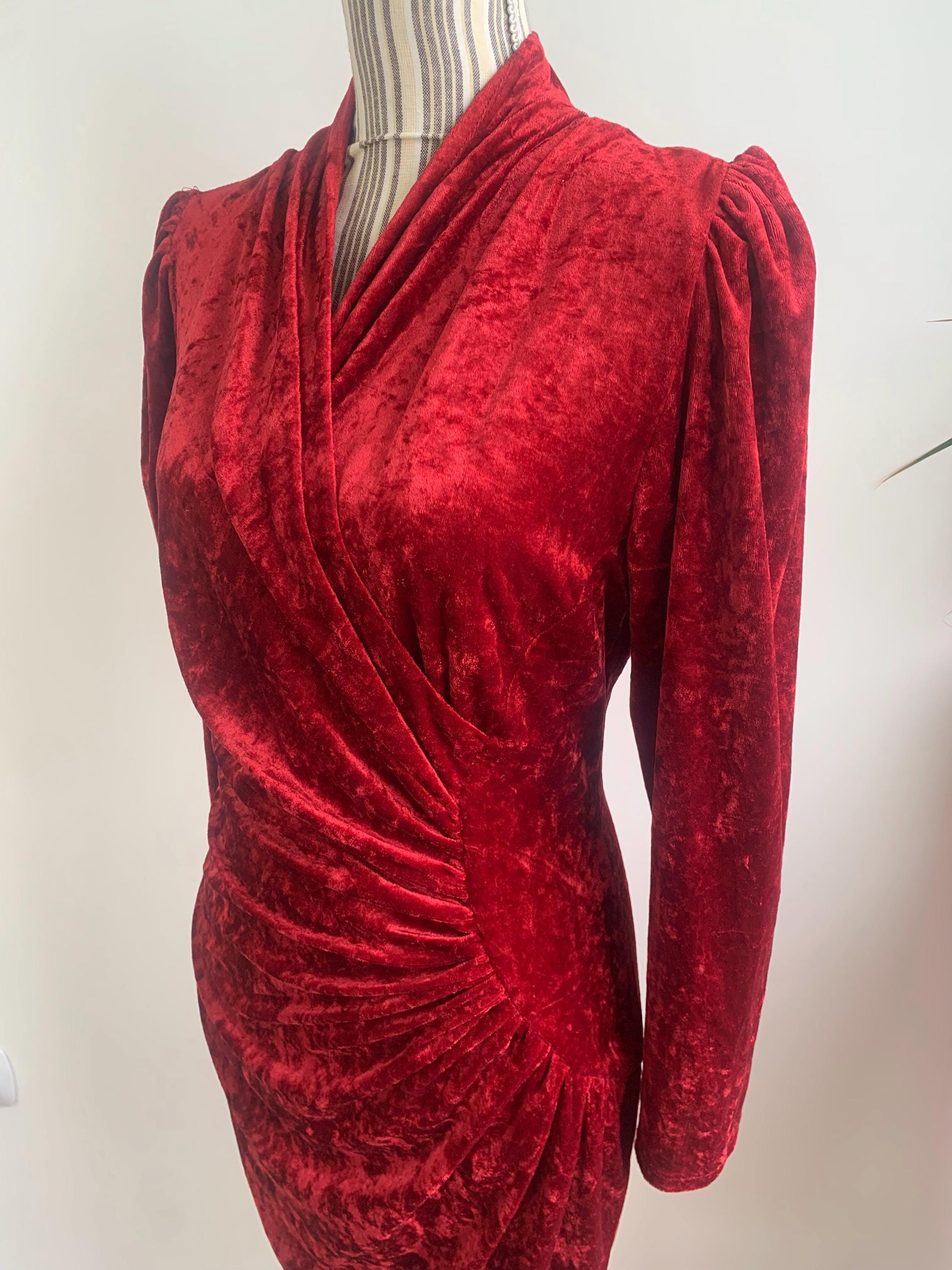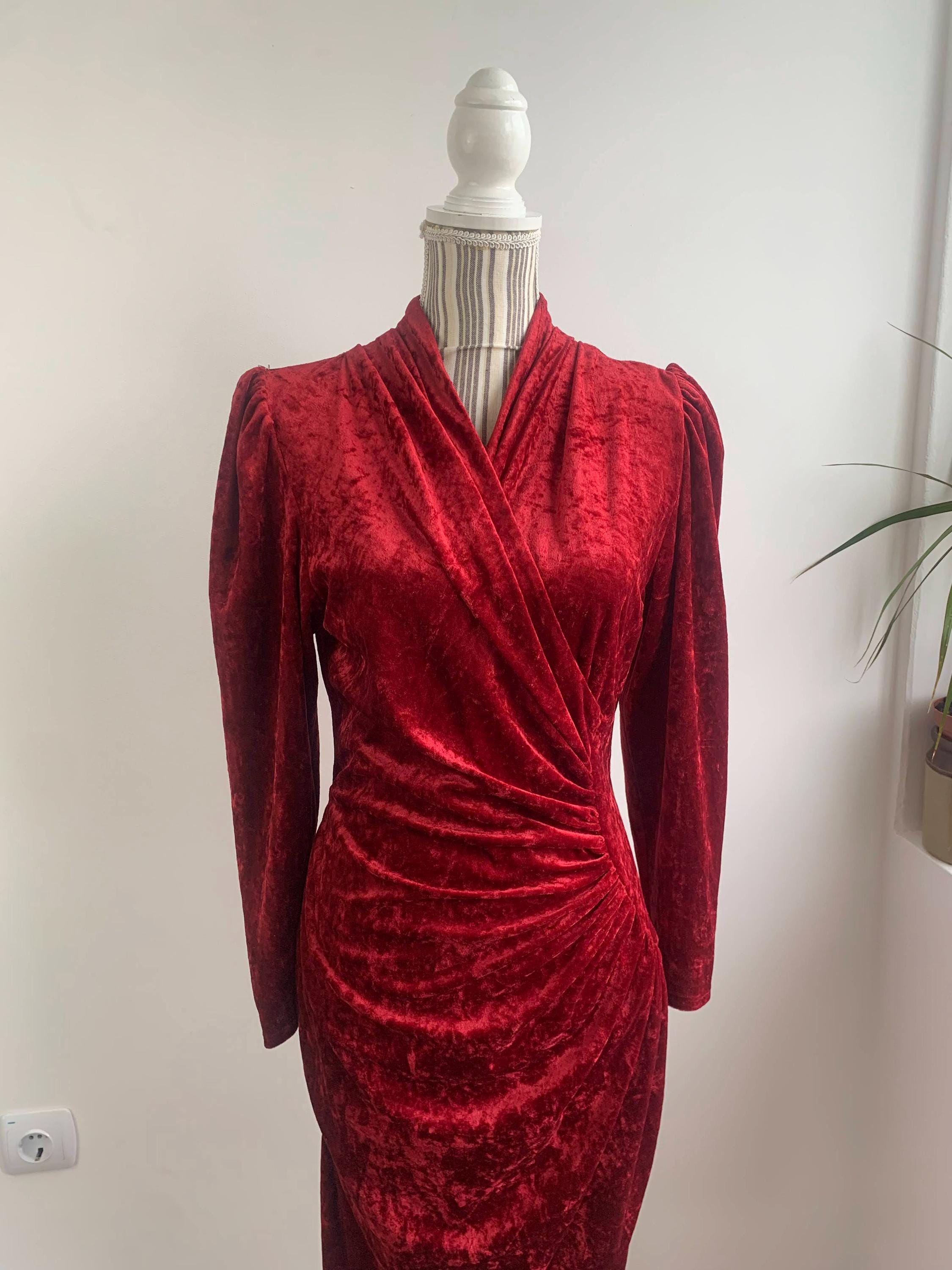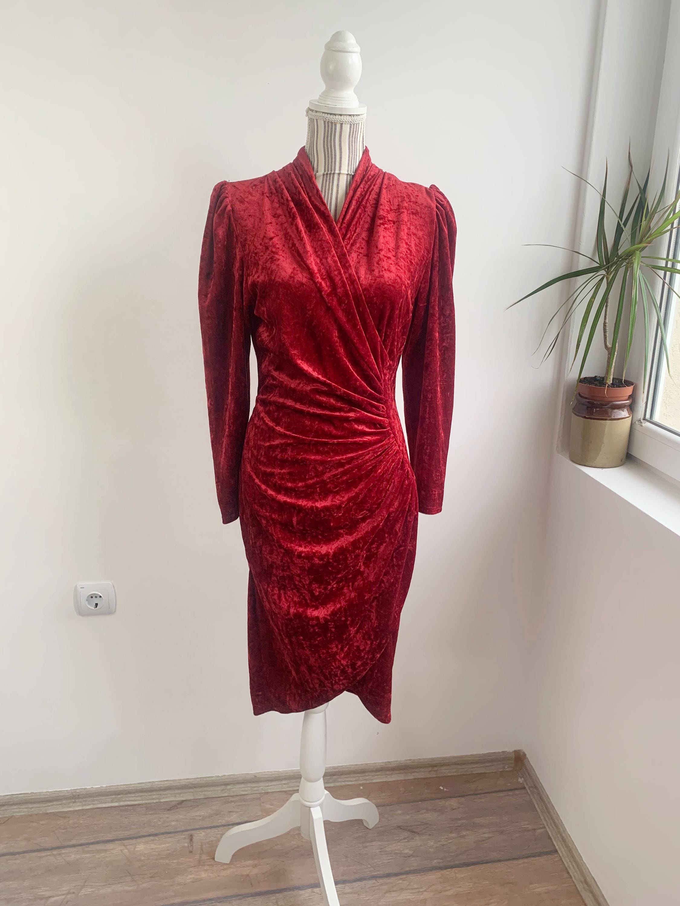 This is a beautiful vintage 80s red pullover crushed velvet long sleeve stretchy cocktail party dress with midi length around the knee, V neck and side pleated wrap top. This elegant evening gown is made of crushed velvet fabric (100% polyester). The size marked is 38, it fits like size XS/S. Please check the measurements below.