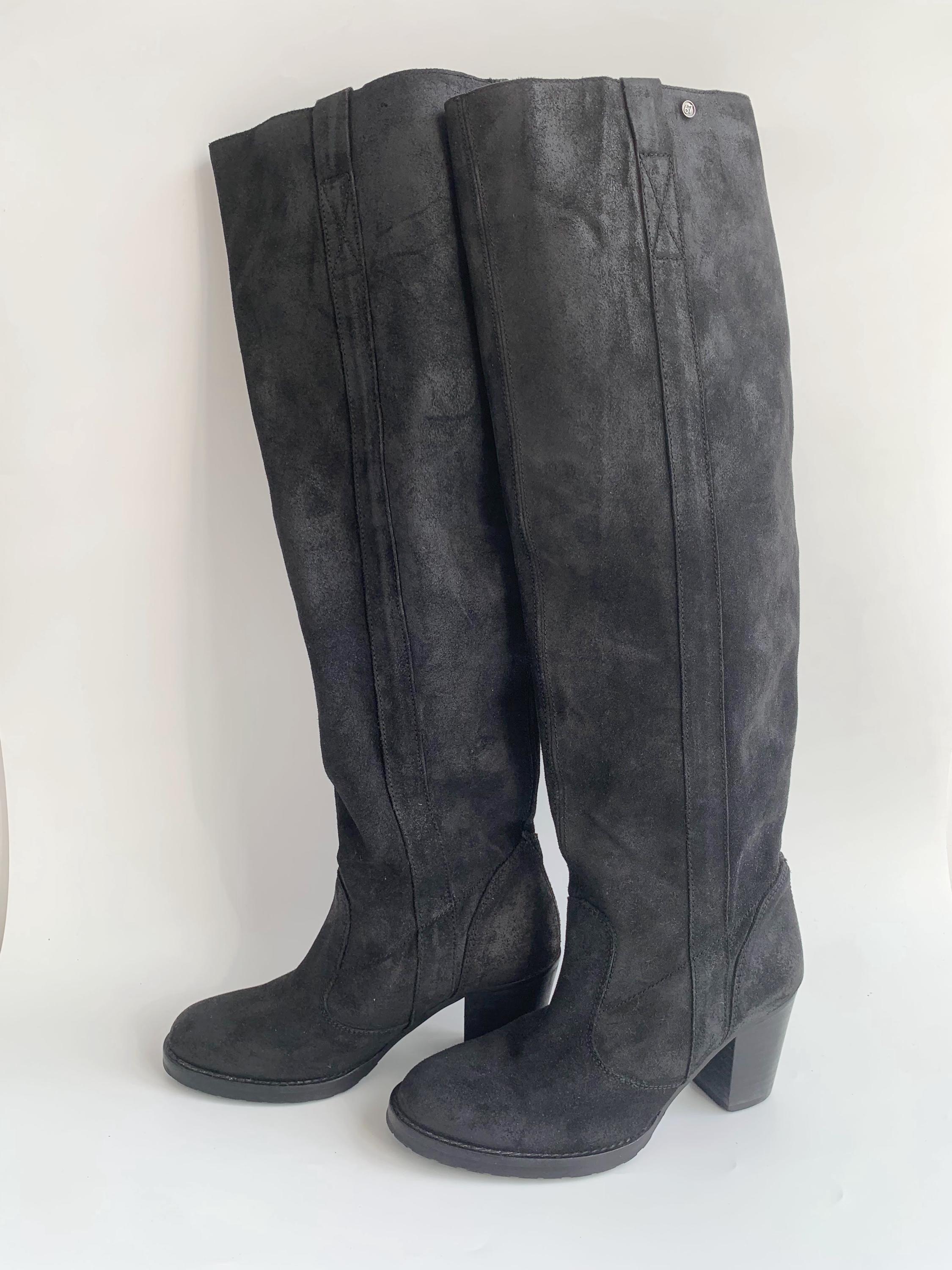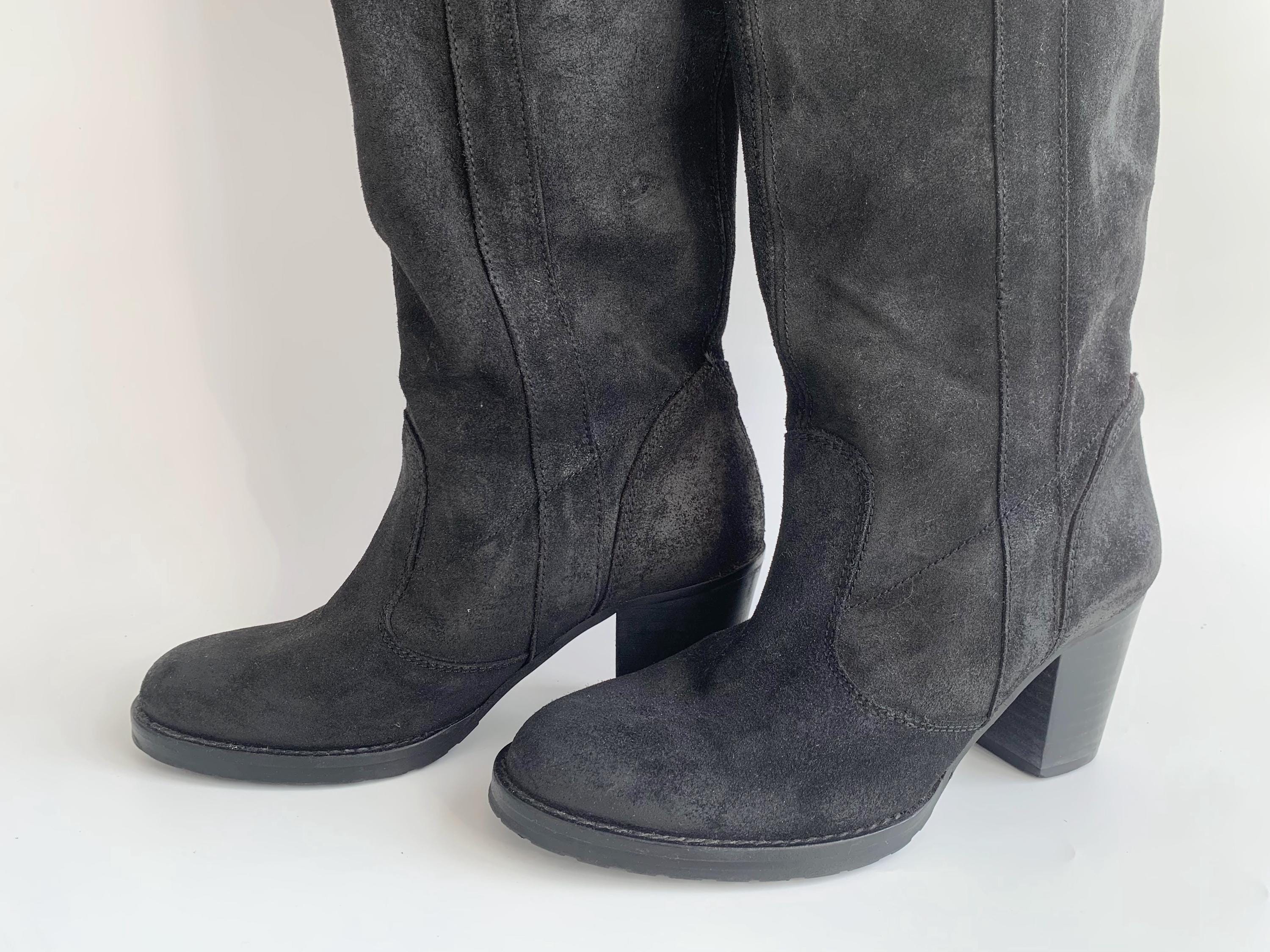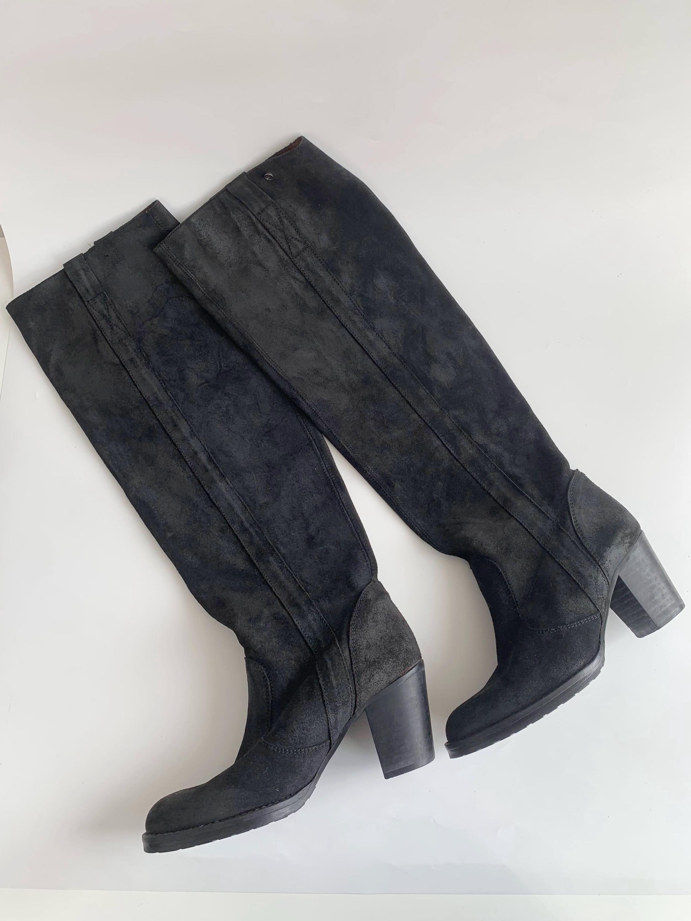 These are vintage black leather slouchy boots with thick high heels. These super sexy over the knee boots are made of genuine suede leather in black color which has a distressed look due to the wear. There are some scratches and marks on the suede leather surface, giving it an aged look. These thigh high boots are slip on, if you pull them up they are above at the knee. The interior is suede leather. The size marked on these high heel tight high boots is EUR 37. They fit like UK 4.5, US 6.5. Please check the measurements below.