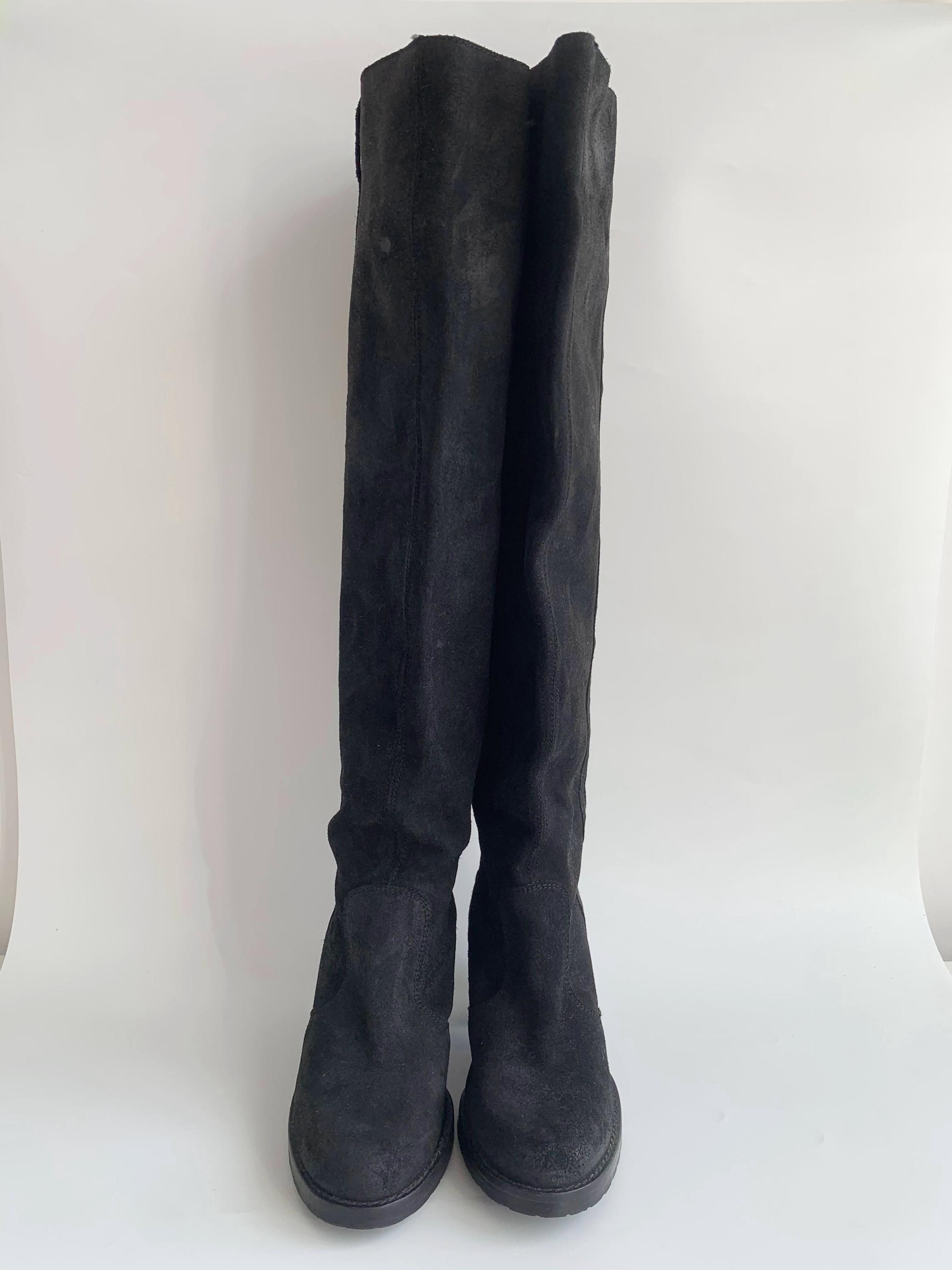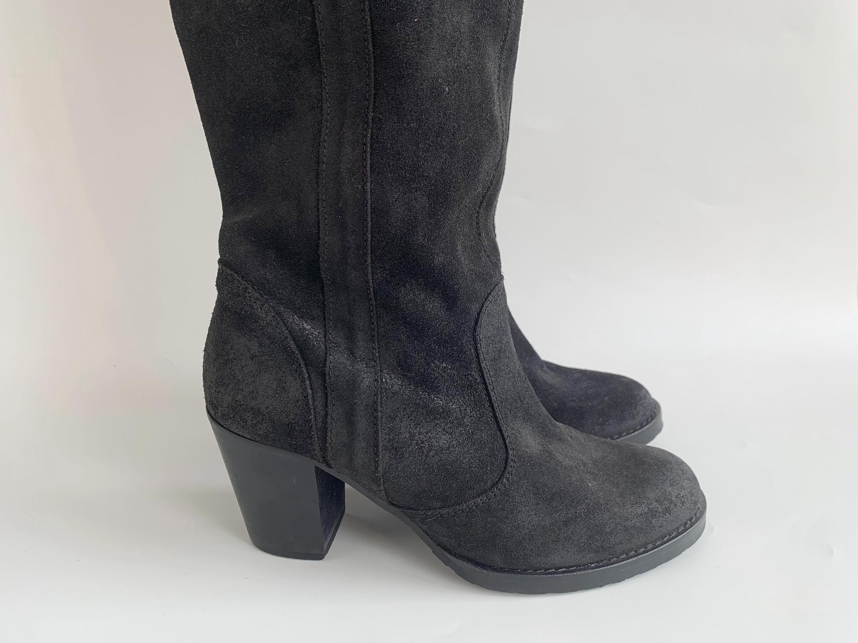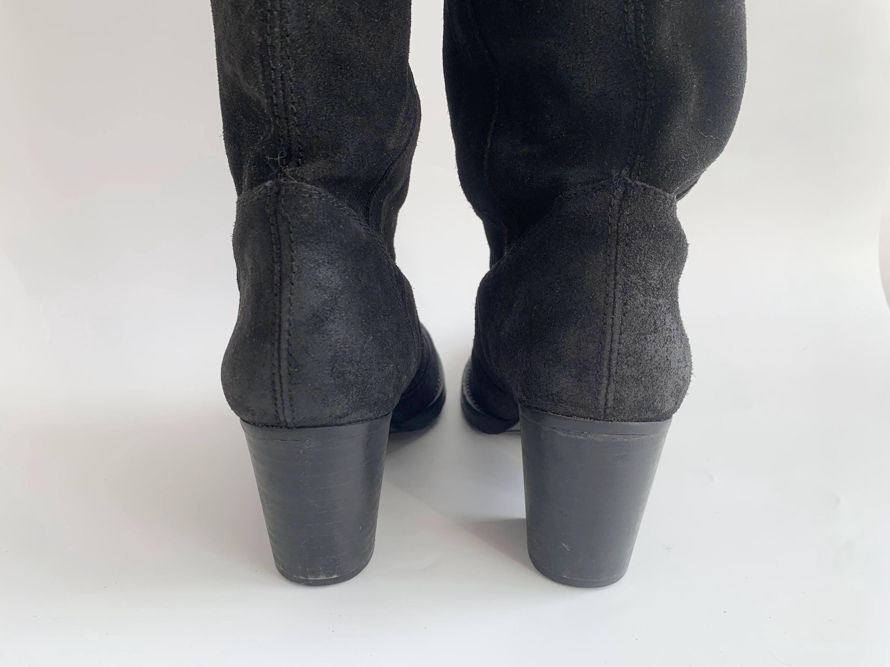 Condition: These heeled tight high boots show some scratches and marks on the suede leather surface
