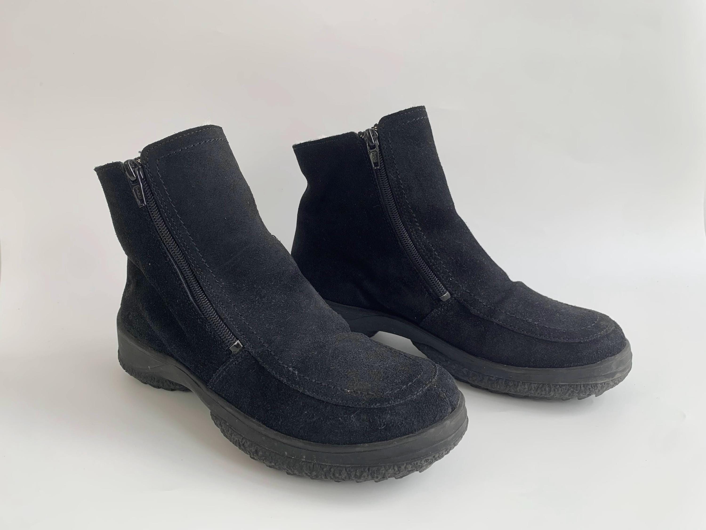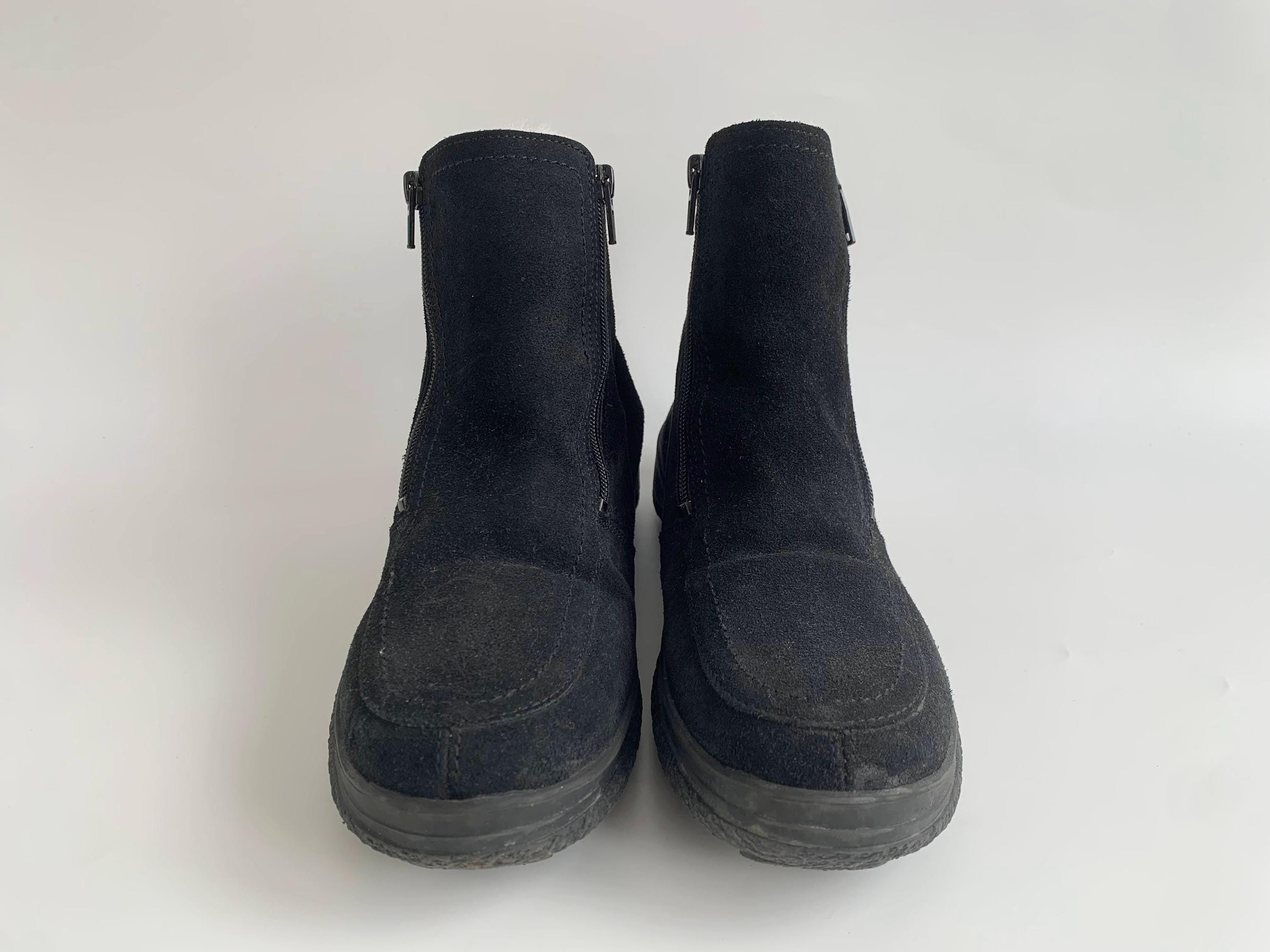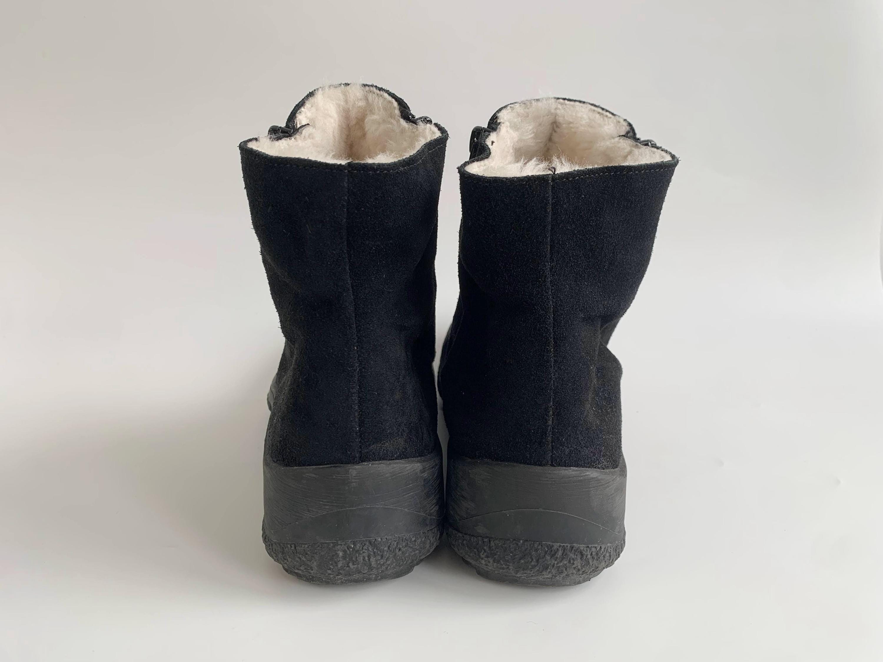 These are vintage 90s black suede leather boots for women with low comfortable rubber non slip sole and warm shearling lining. These chunky leather boots are made of real suede leather in black color. They have double side zippers so you can easily put them on and take then off. These suede leather snow boots have warm wool lining so they will keep your feet warm in the cold days. These ankle boots are size EUR 38, they fit like UK 5, US 7 1/2. Please check the measurements below.