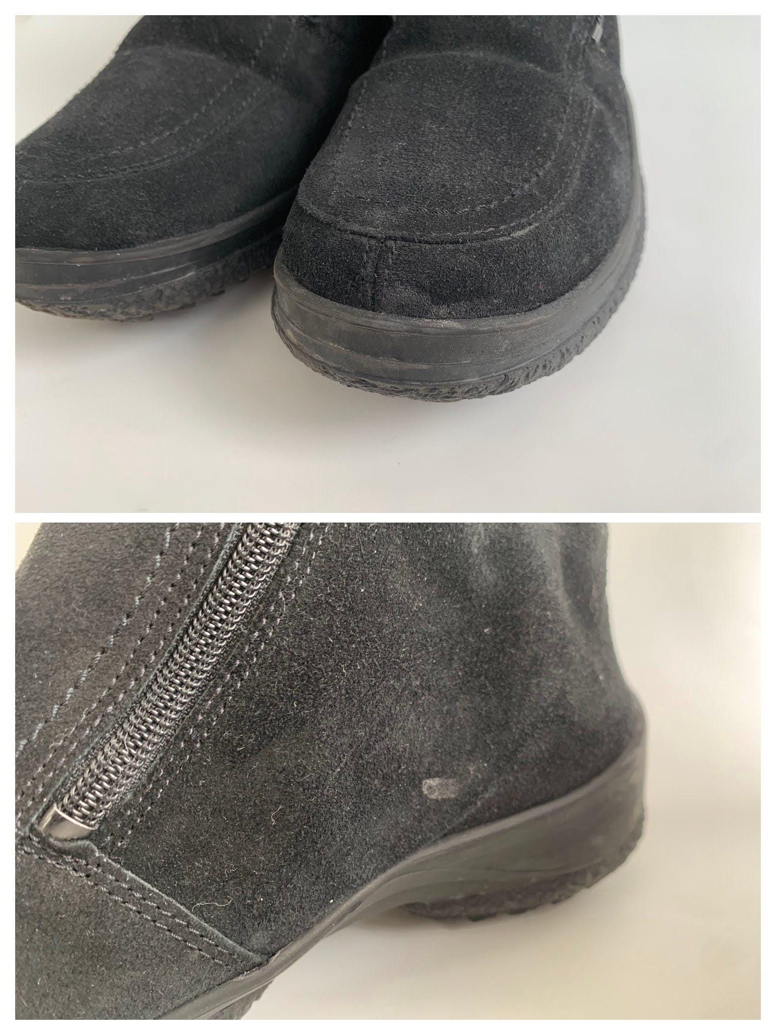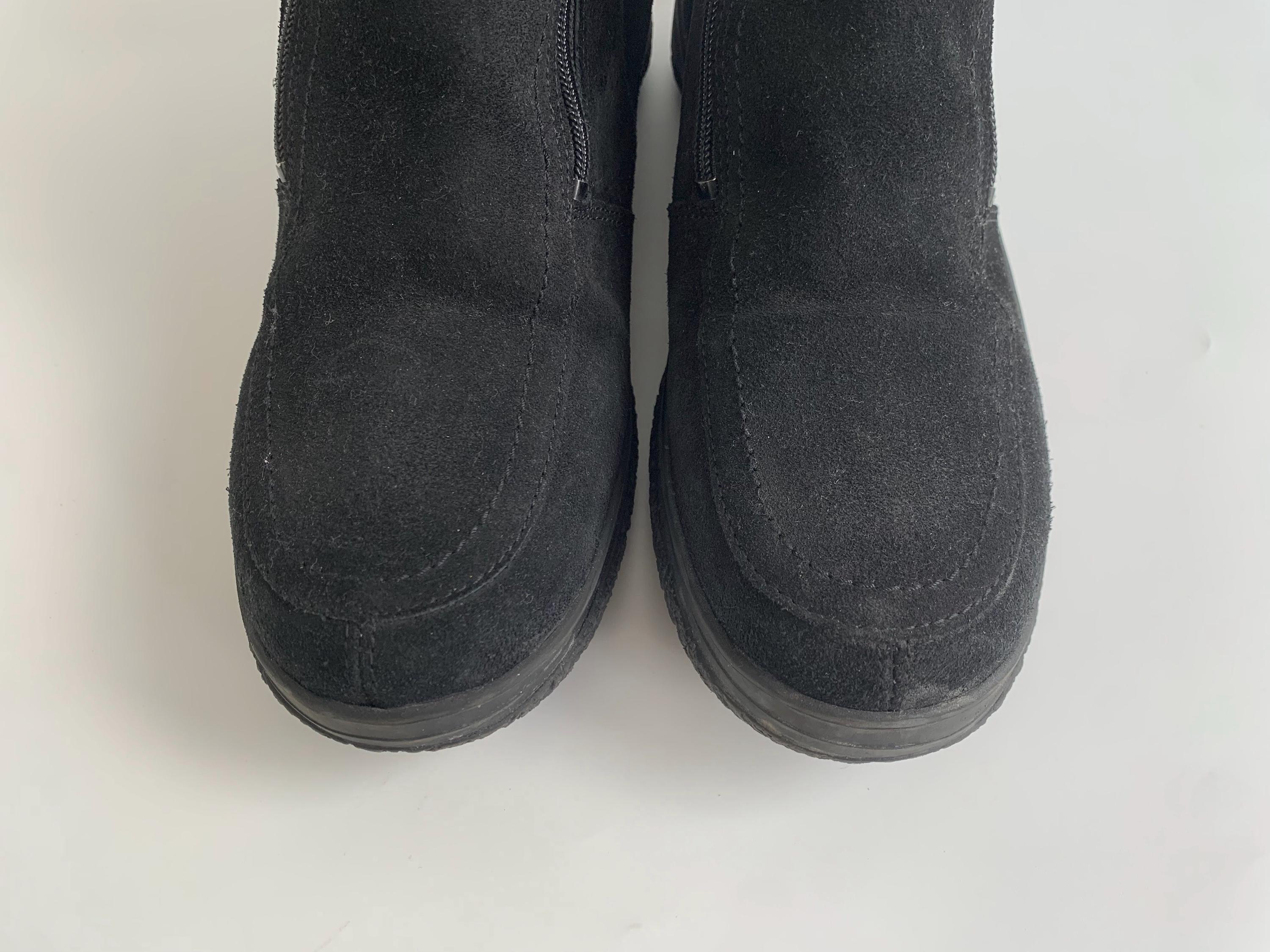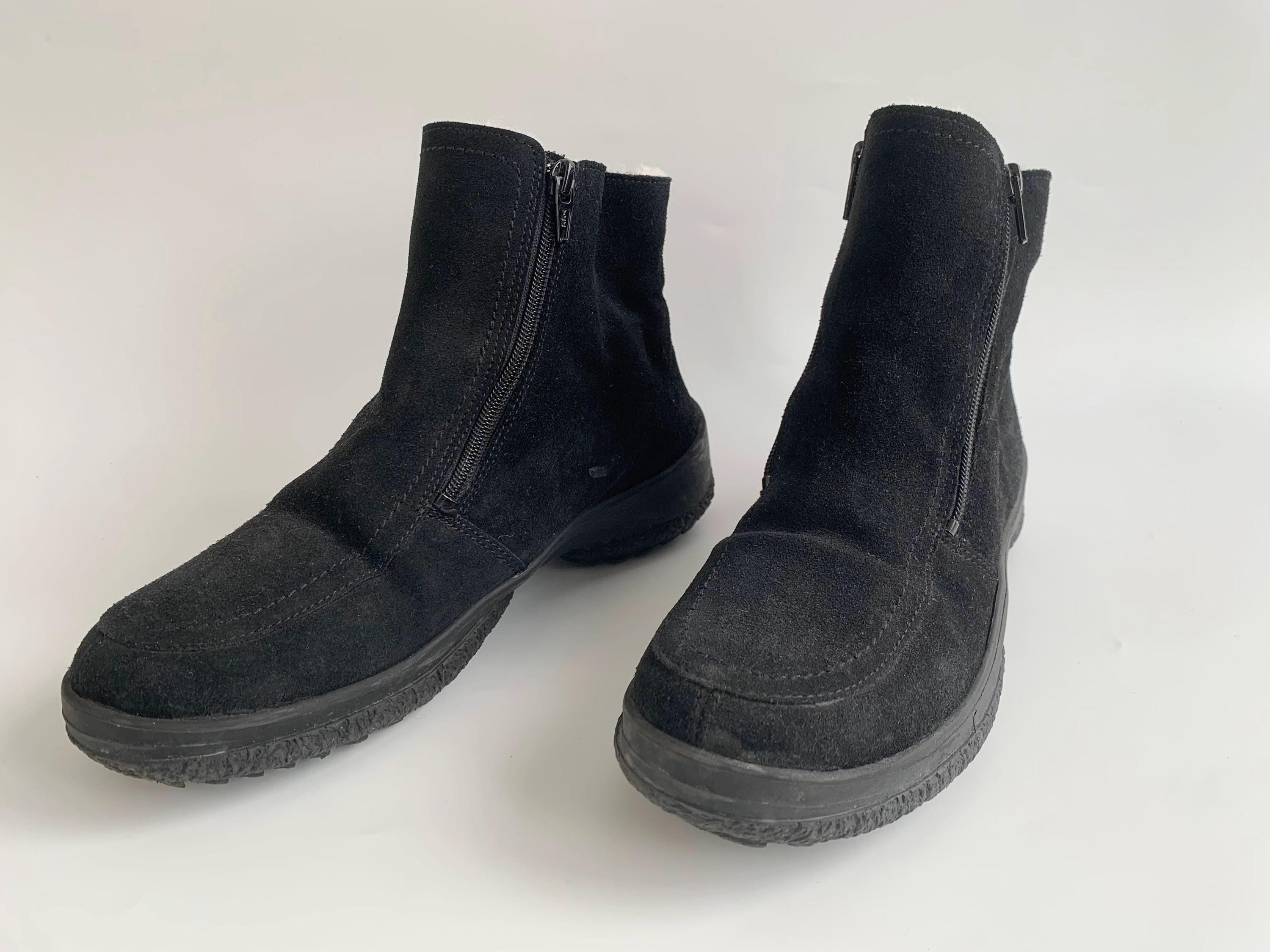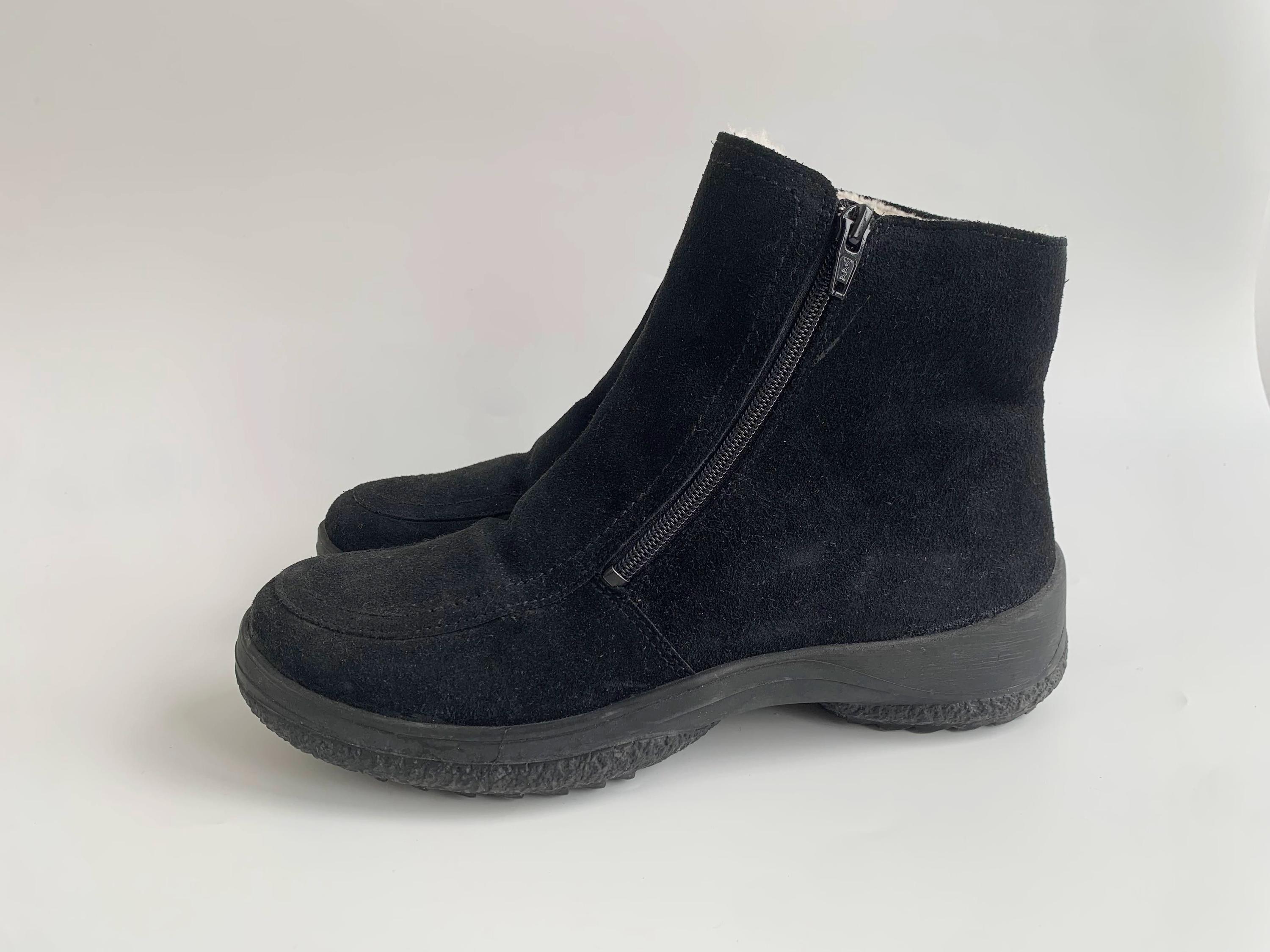 These are vintage 90s black suede leather boots for women with low comfortable rubber non slip sole and warm shearling lining. These chunky leather boots are made of real suede leather in black color. They have double side zippers so you can easily put them on and take then off. These suede leather snow boots have warm wool lining so they will keep your feet warm in the cold days. These ankle boots are size EUR 38, they fit like UK 5, US 7 1/2. Please check the measurements below.