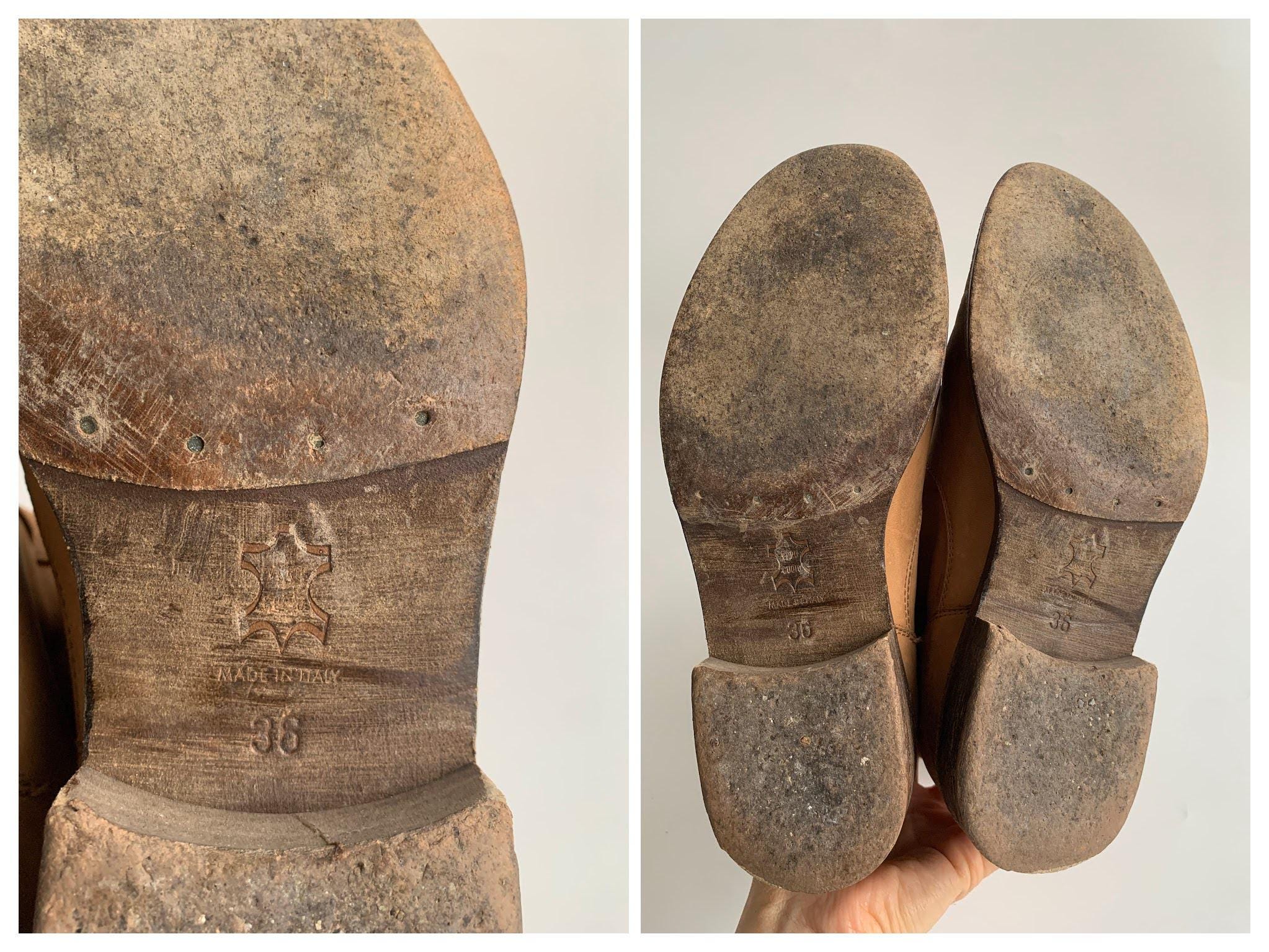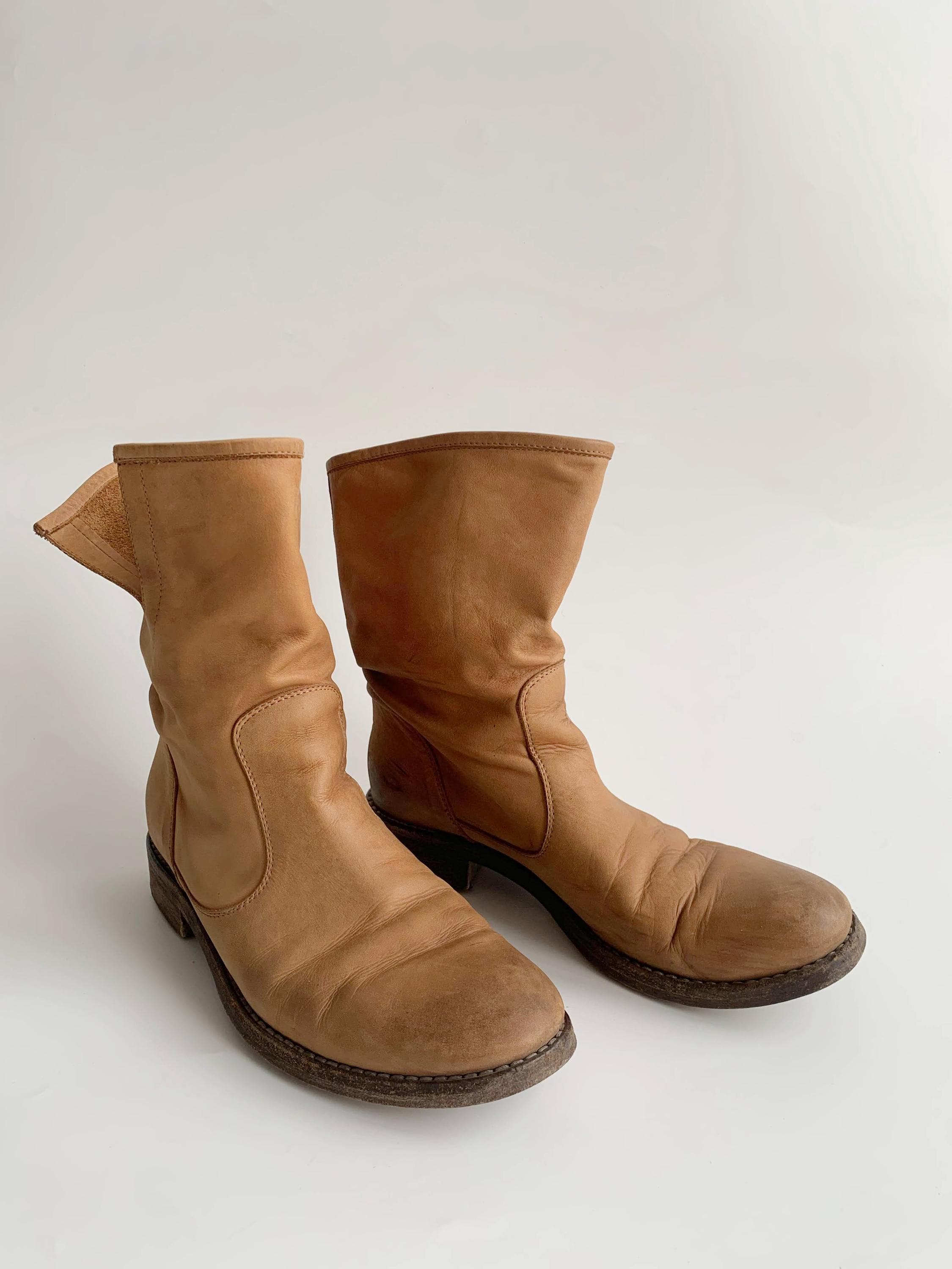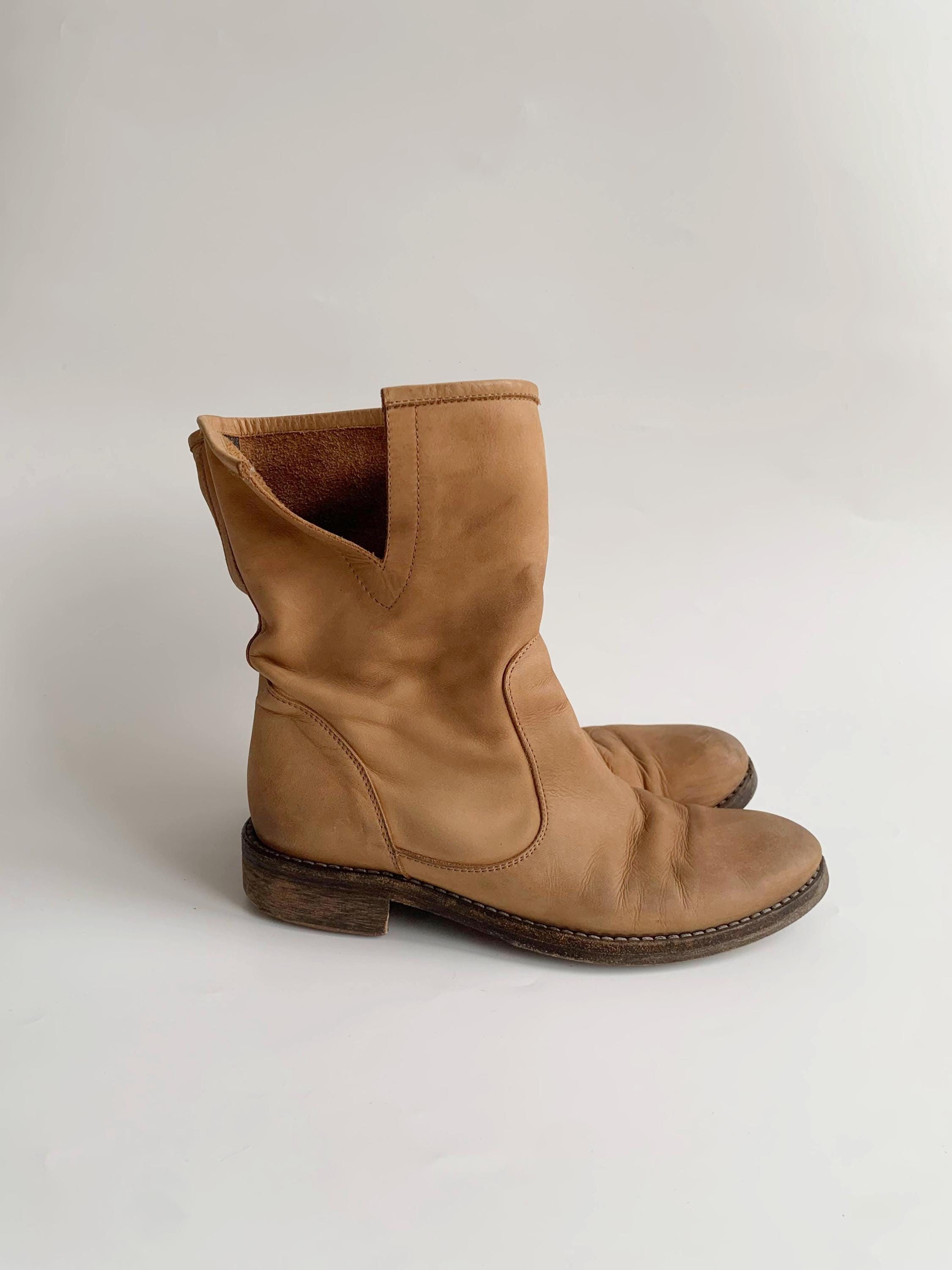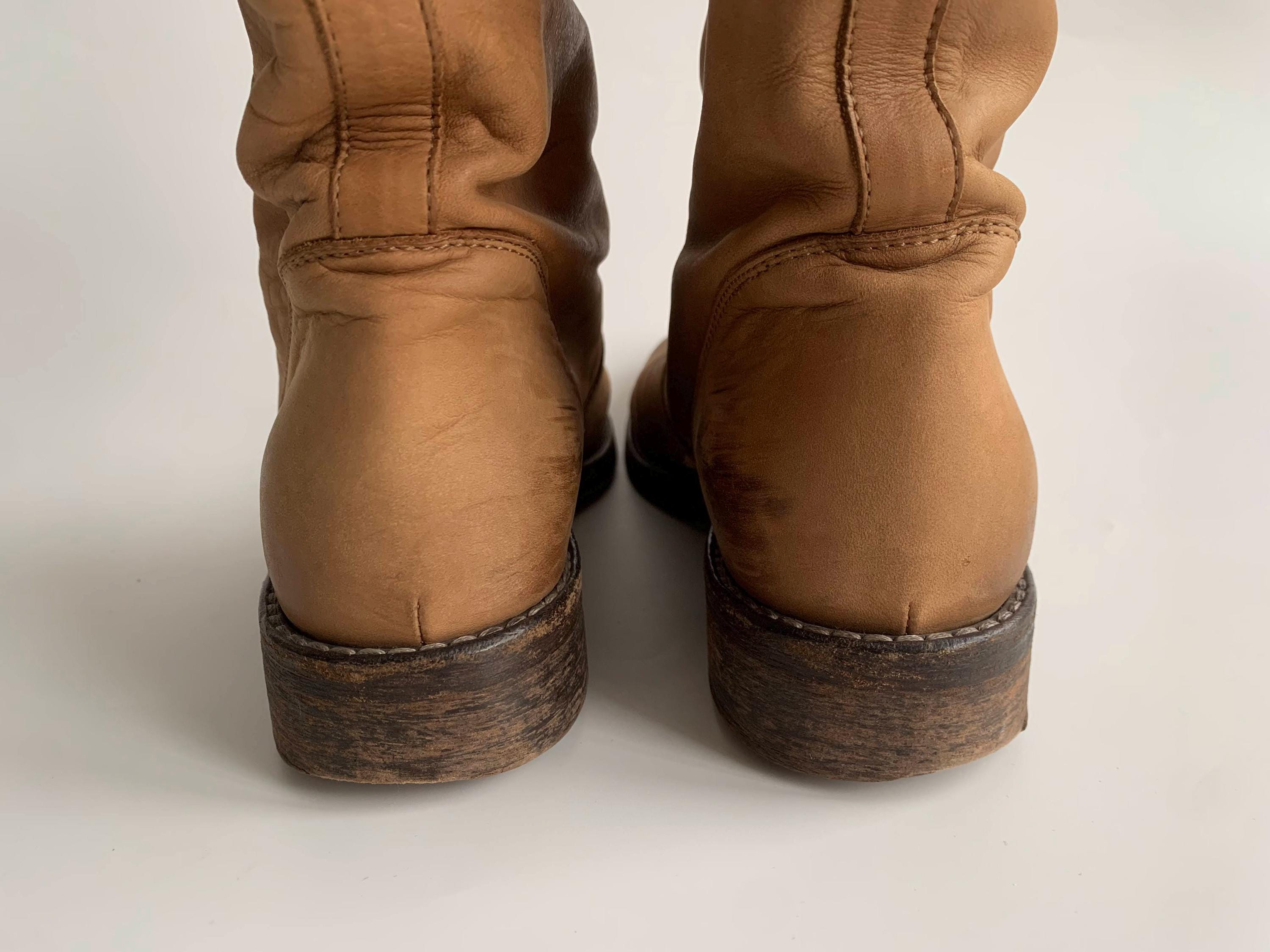 These are vintage low heel camel brown heavily distressed real leather ankle boots for women with real leather outer sole and no lining. These western bohemian flat leather boots are made of genuine suede leather which has an aged look. These casual southwestern low boots are size EUR 36 women's shoe size, they fit like size UK 3, US 5.5.