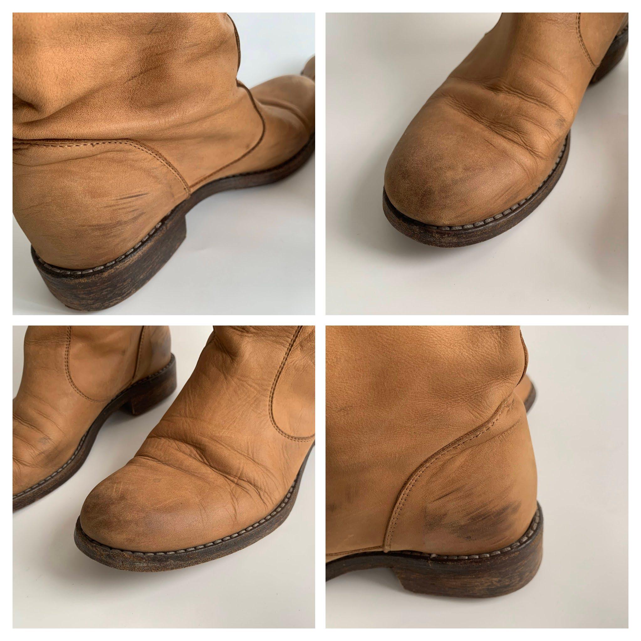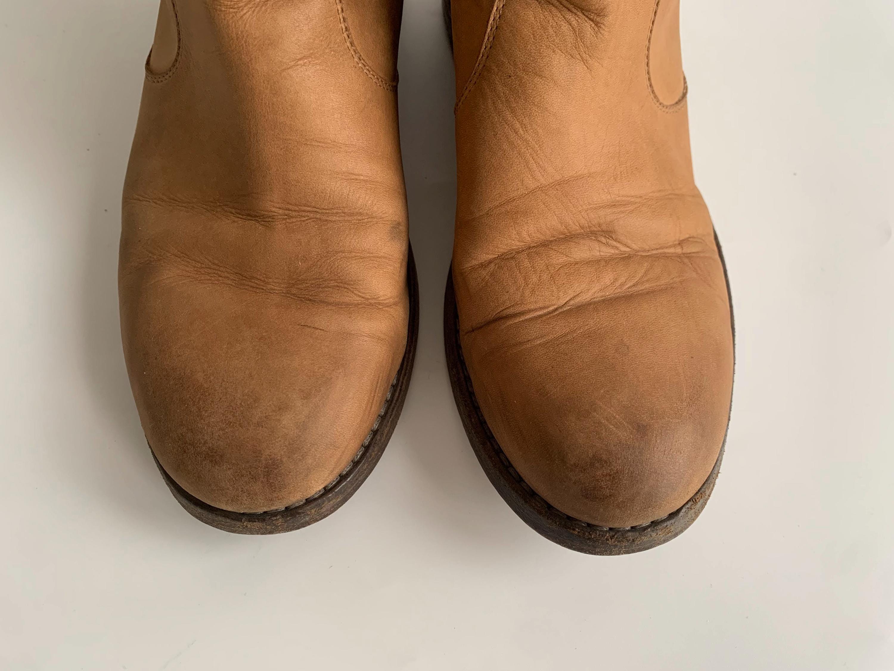 Condition: These camel brown leather boots were pre-loved and they have a heavily distressed look with plenty of signs of wear. There are marks and scratches all over the leather surface , some darkening at the heels and the toes