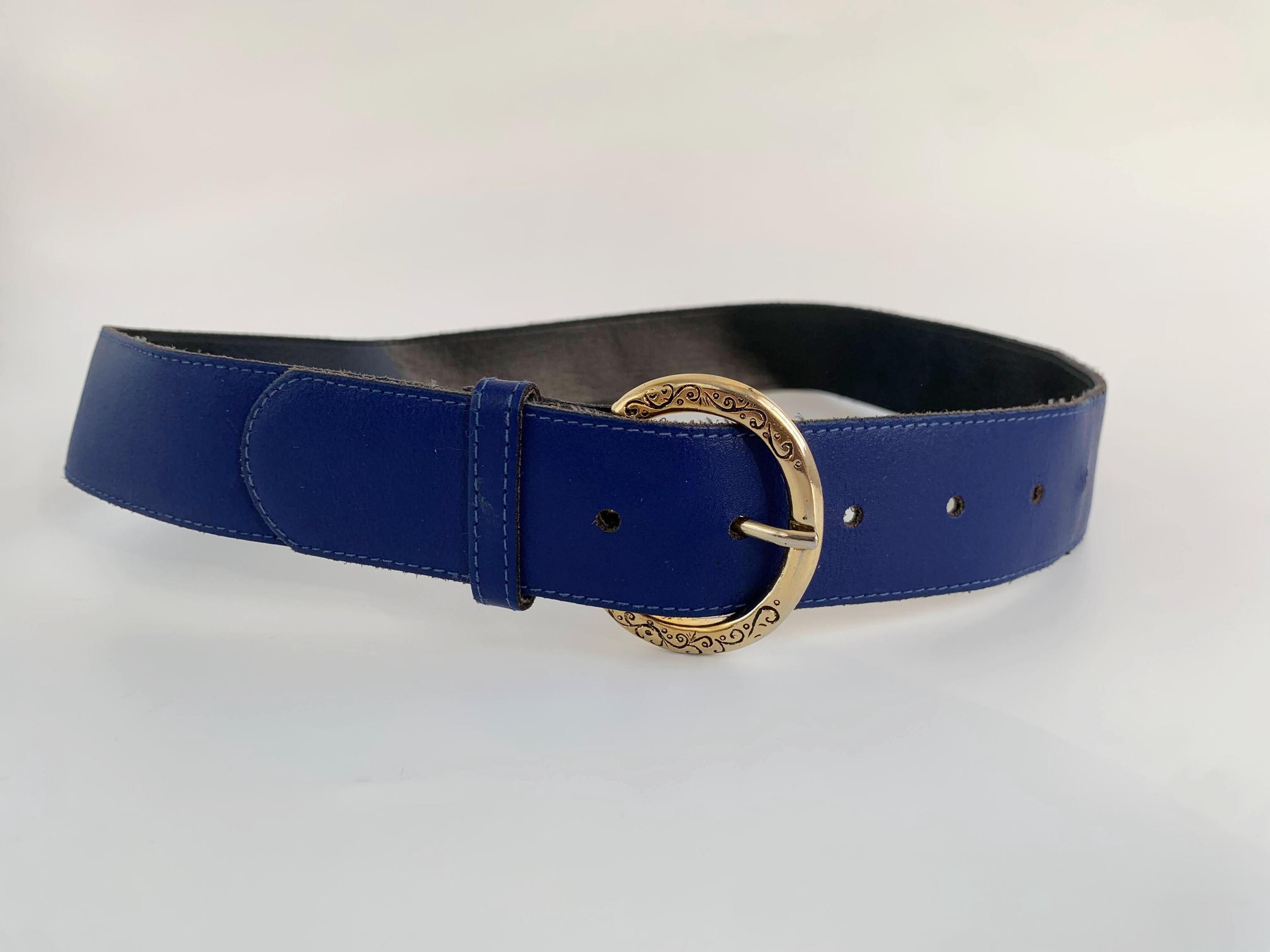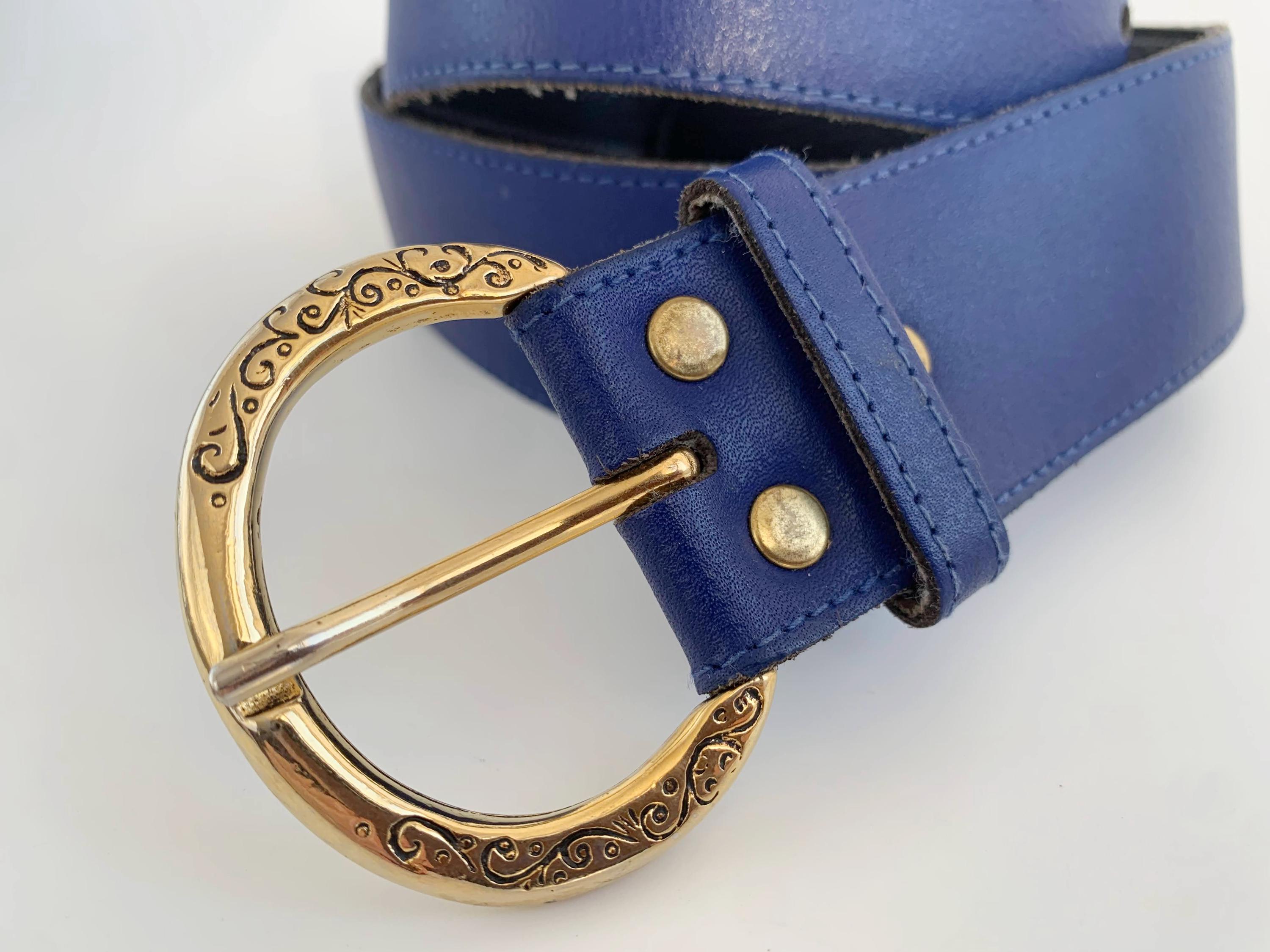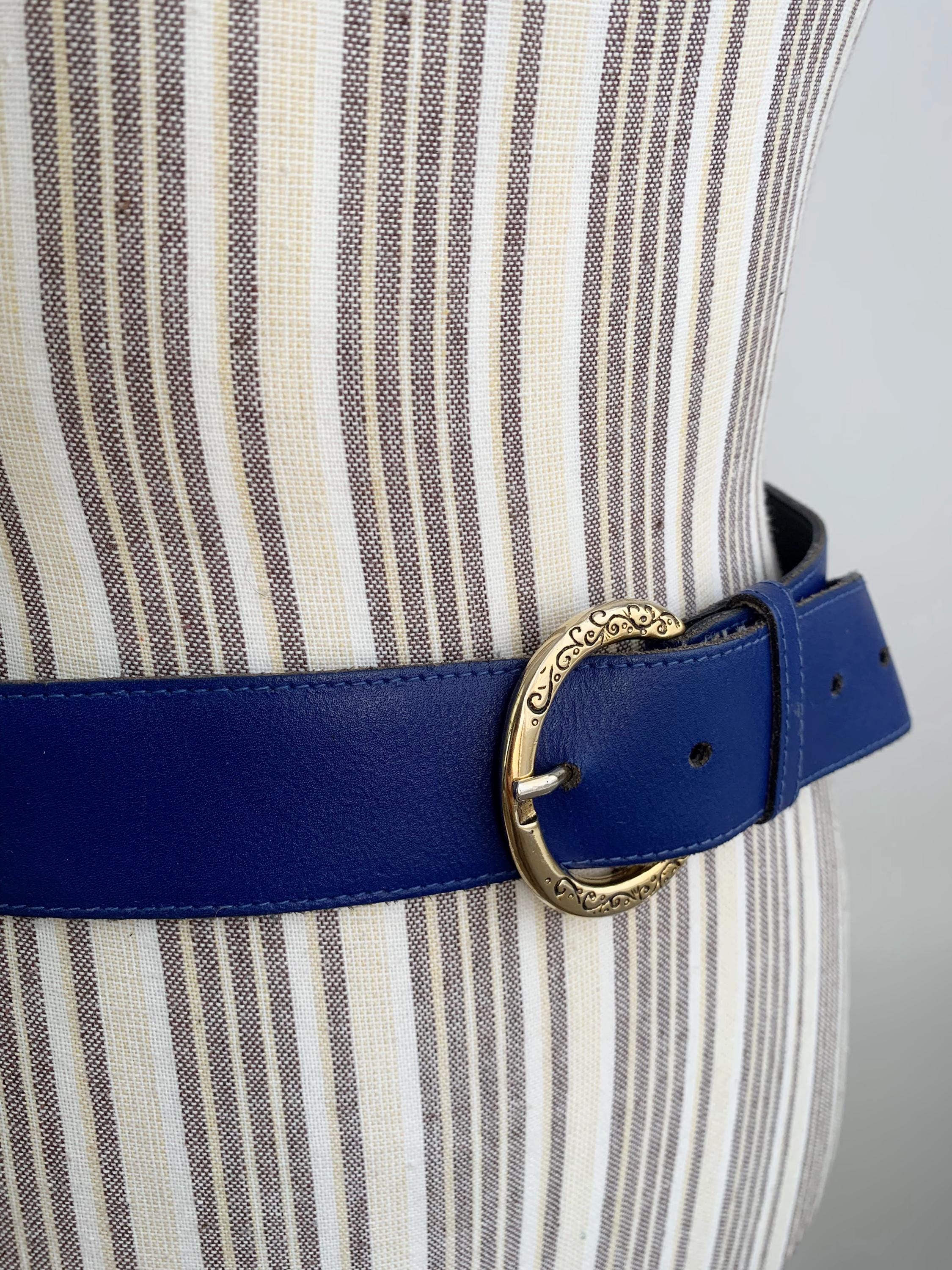 Condition: This cobalt blue leather belt is in beautiful vintage condition with minor signs of wear - a few tiny scratches on the gold tone buckle