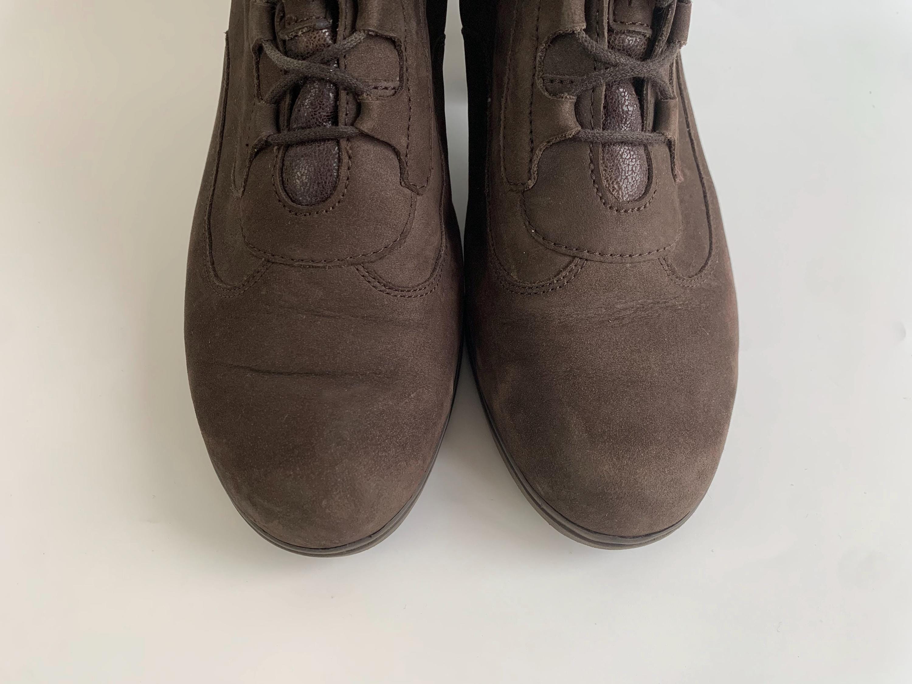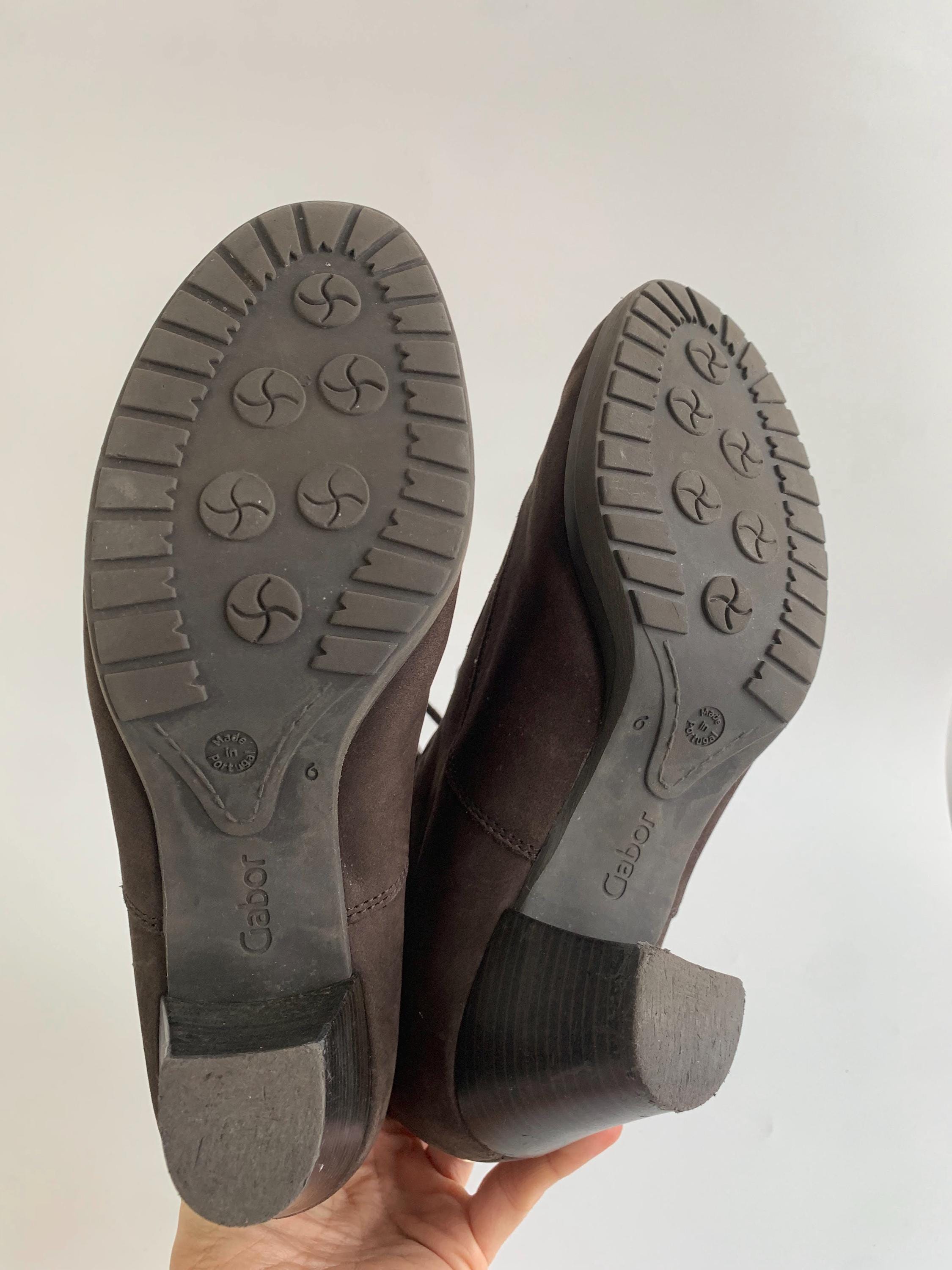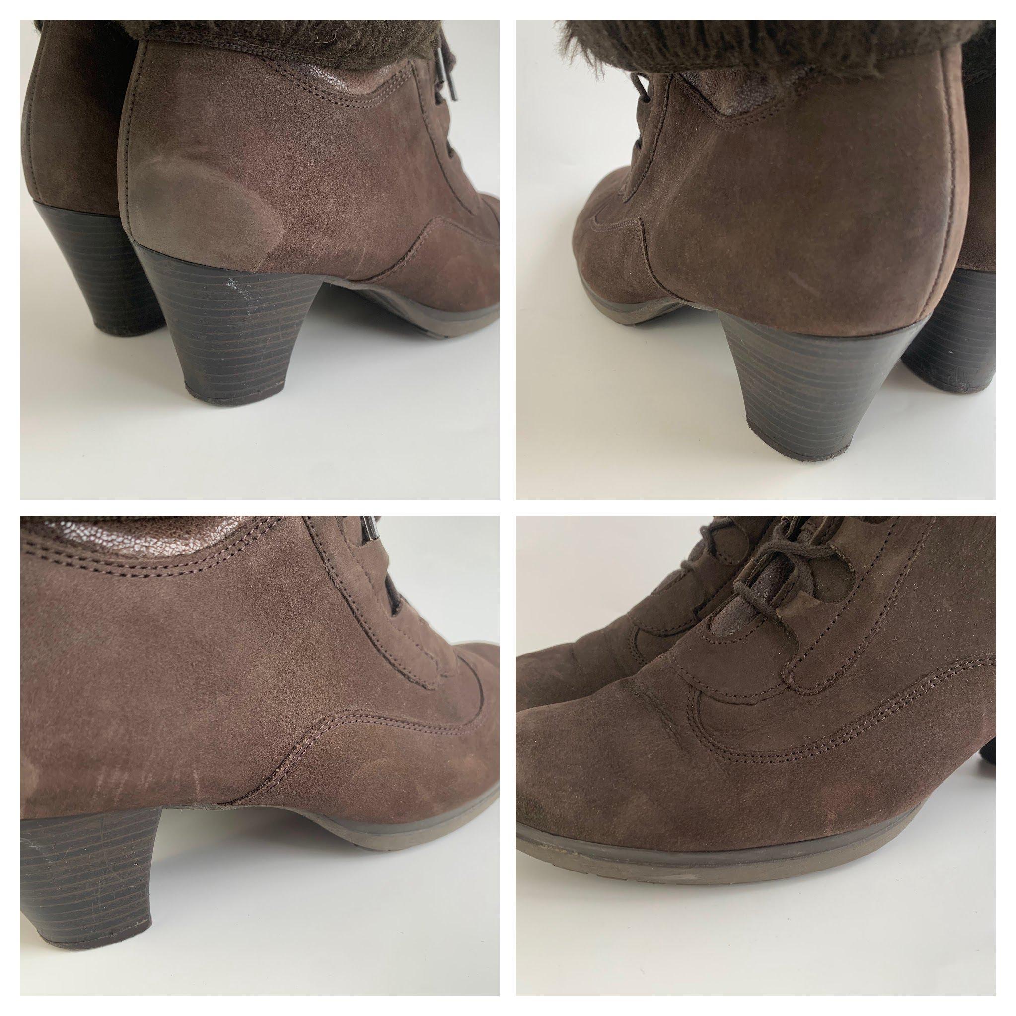 These are vintage 90s brown suede leather lace up oxford boots for women by Gabor, size UK 6, which corresponds to US 8, EUR 39. These brown suede oxford booties are made of genuine suede leather, warm wool lined interior and rubber non slip outer soles. These kitten heel ankle shoes are perfect for the fall winter season. These lace up boots are super comfortable.