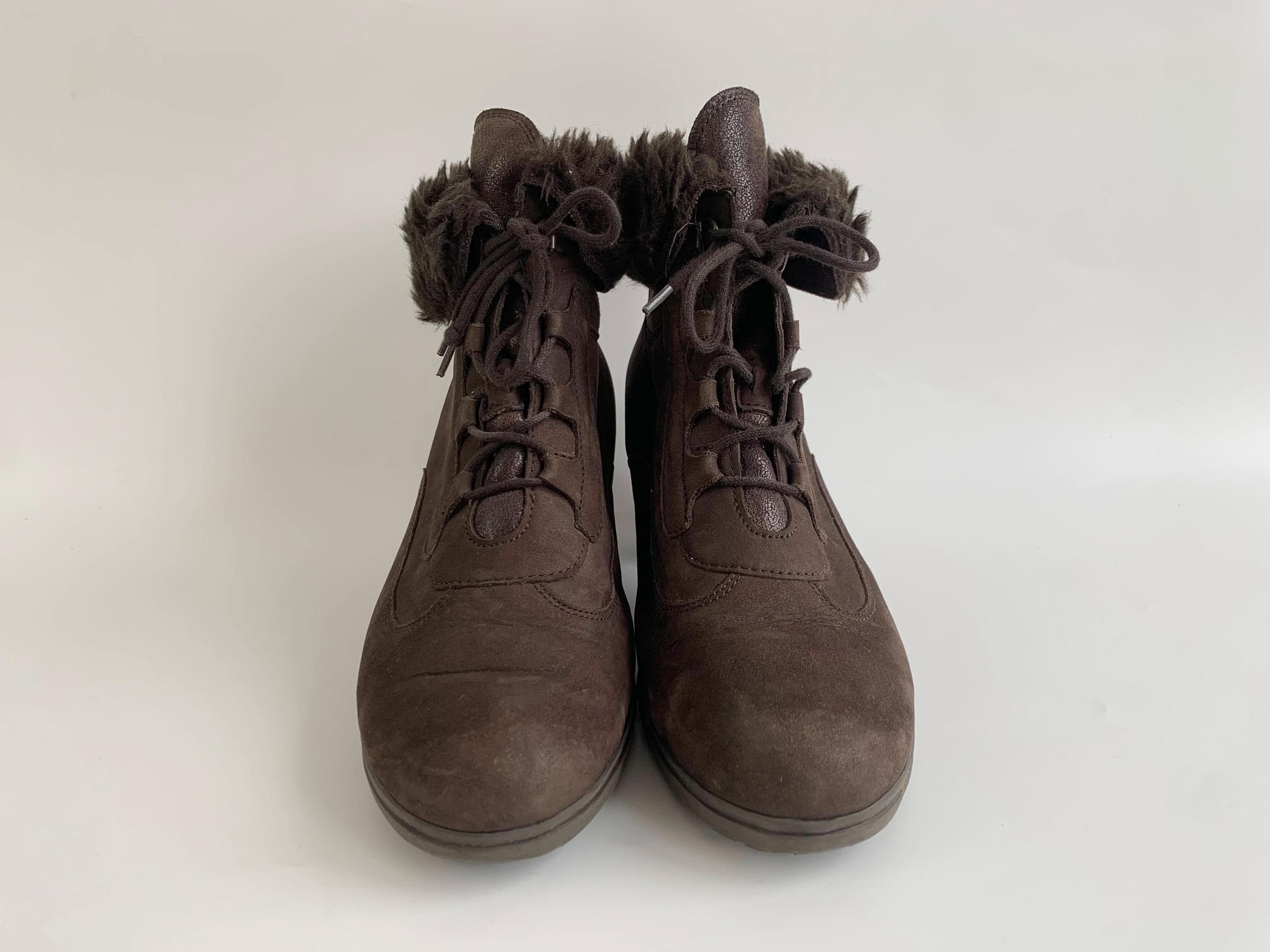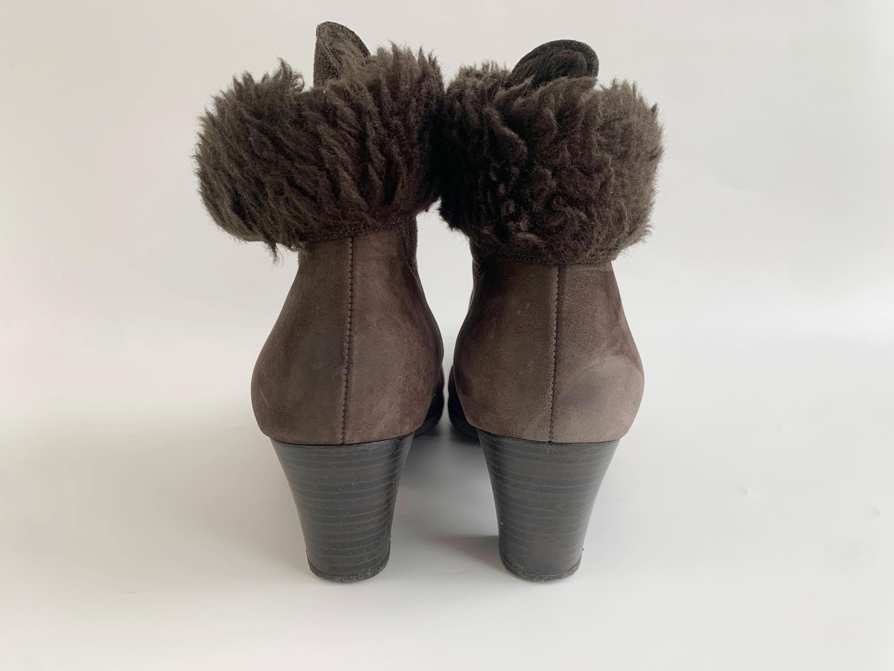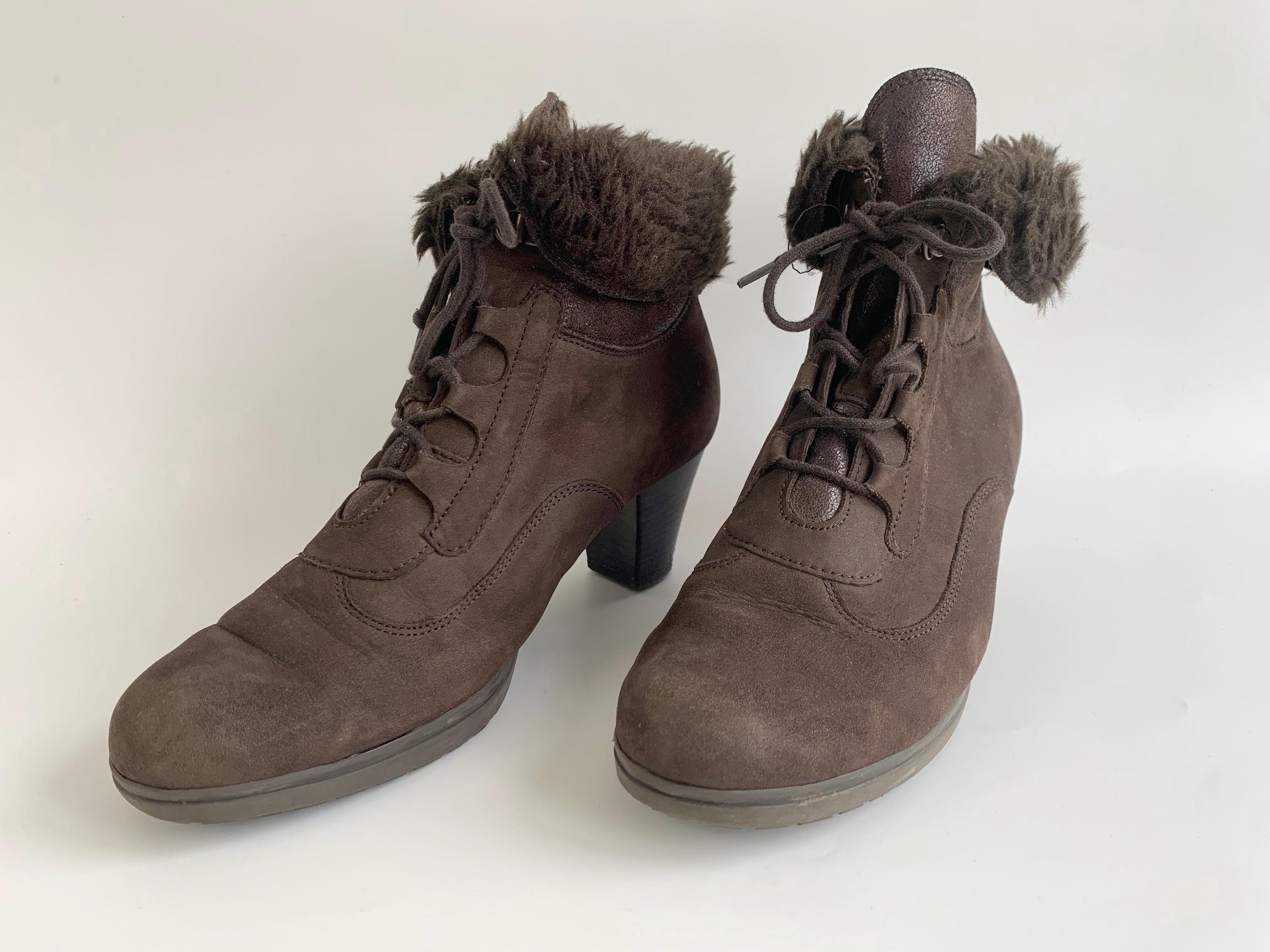 These are vintage 90s brown suede leather lace up oxford boots for women by Gabor, size UK 6, which corresponds to US 8, EUR 39. These brown suede oxford booties are made of genuine suede leather, warm wool lined interior and rubber non slip outer soles. These kitten heel ankle shoes are perfect for the fall winter season. These lace up boots are super comfortable.